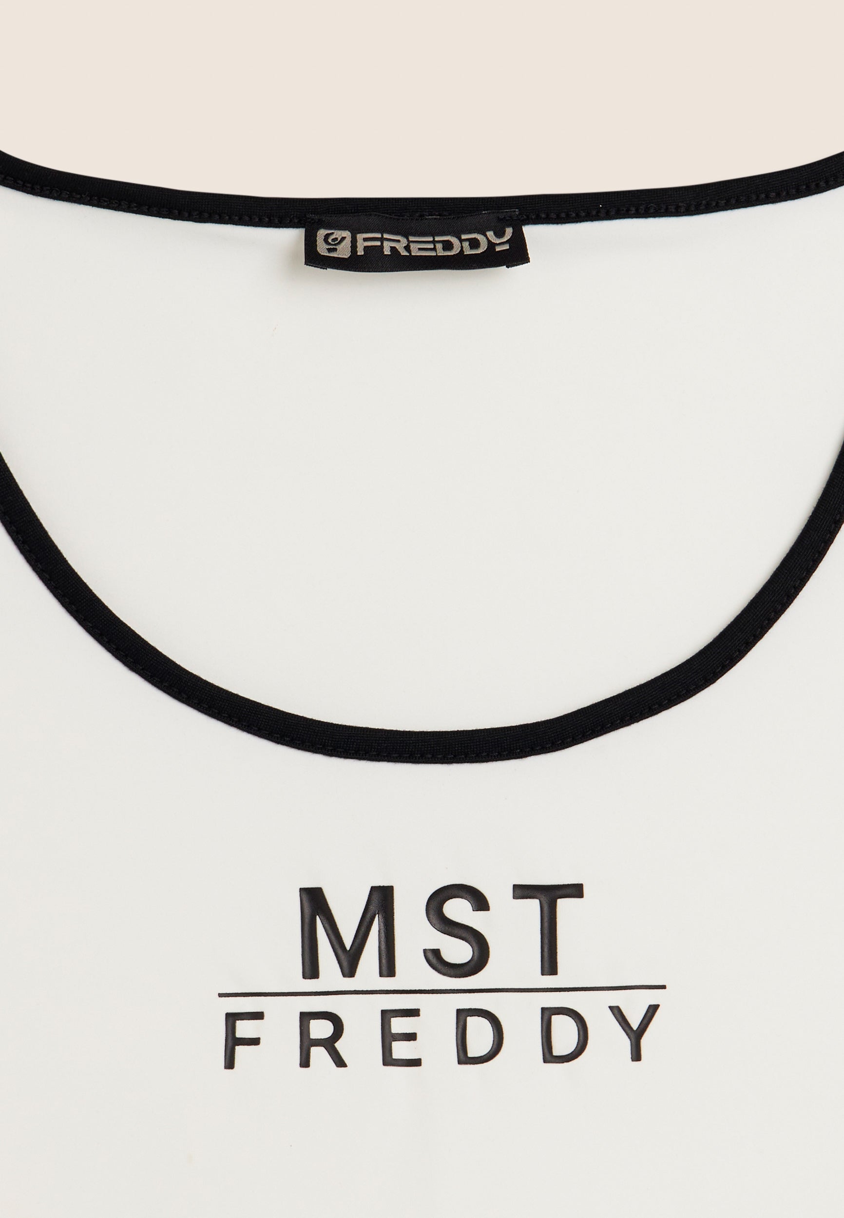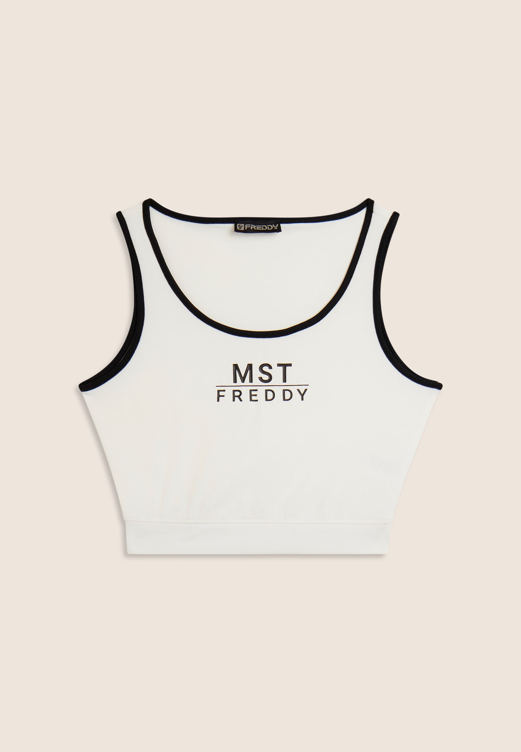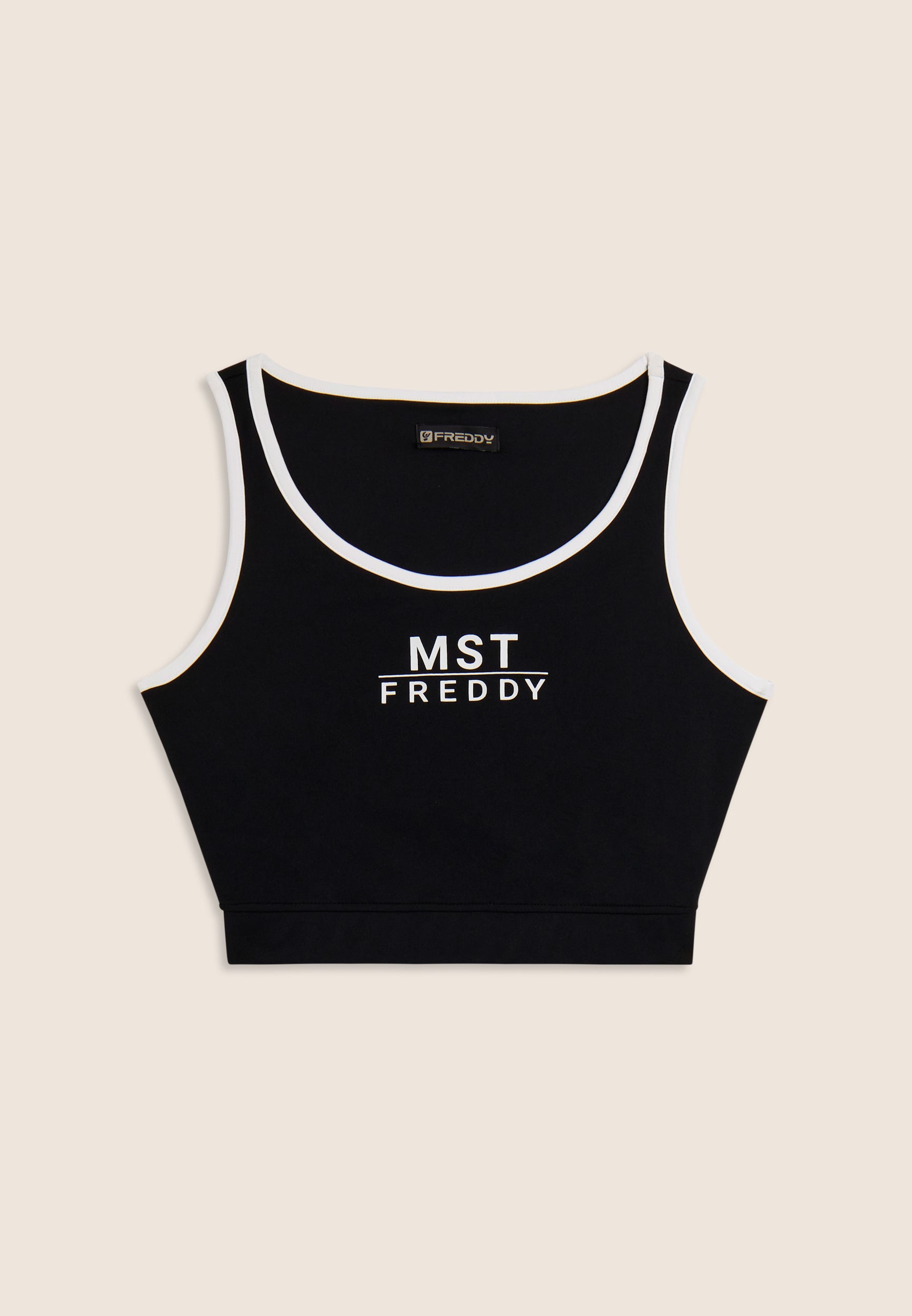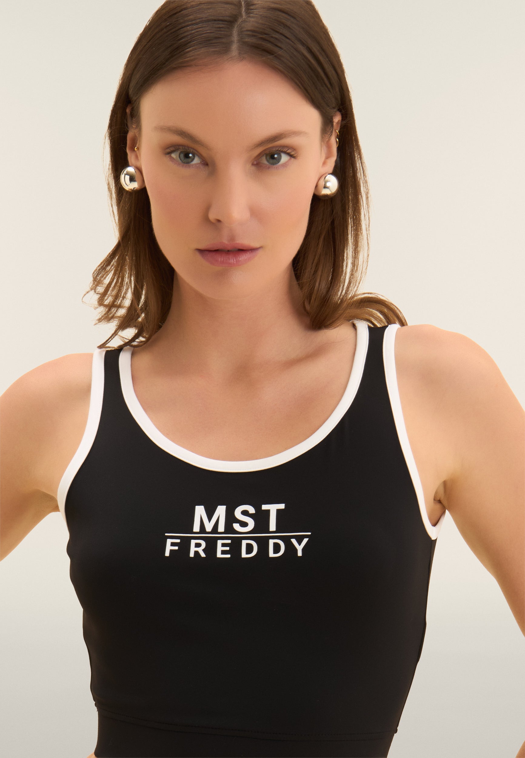 Top sportivo dal design dinamico e moderno, realizzato in nylon heavy jersey stretch, un tessuto resistente, morbido e elasticizzato che assicura comfort e libertà di movimento. La vestibilità aderente e la lunghezza cropped offrono un sostegno medio ideale per le attività sportive. Lo scollo girocollo e le spalline regular sono bordati in contrasto colore, aggiungendo un dettaglio visivo distintivo. La stampa MST FREDDY sul fronte completa il look, unendo funzionalità ed eleganza in un solo capo.