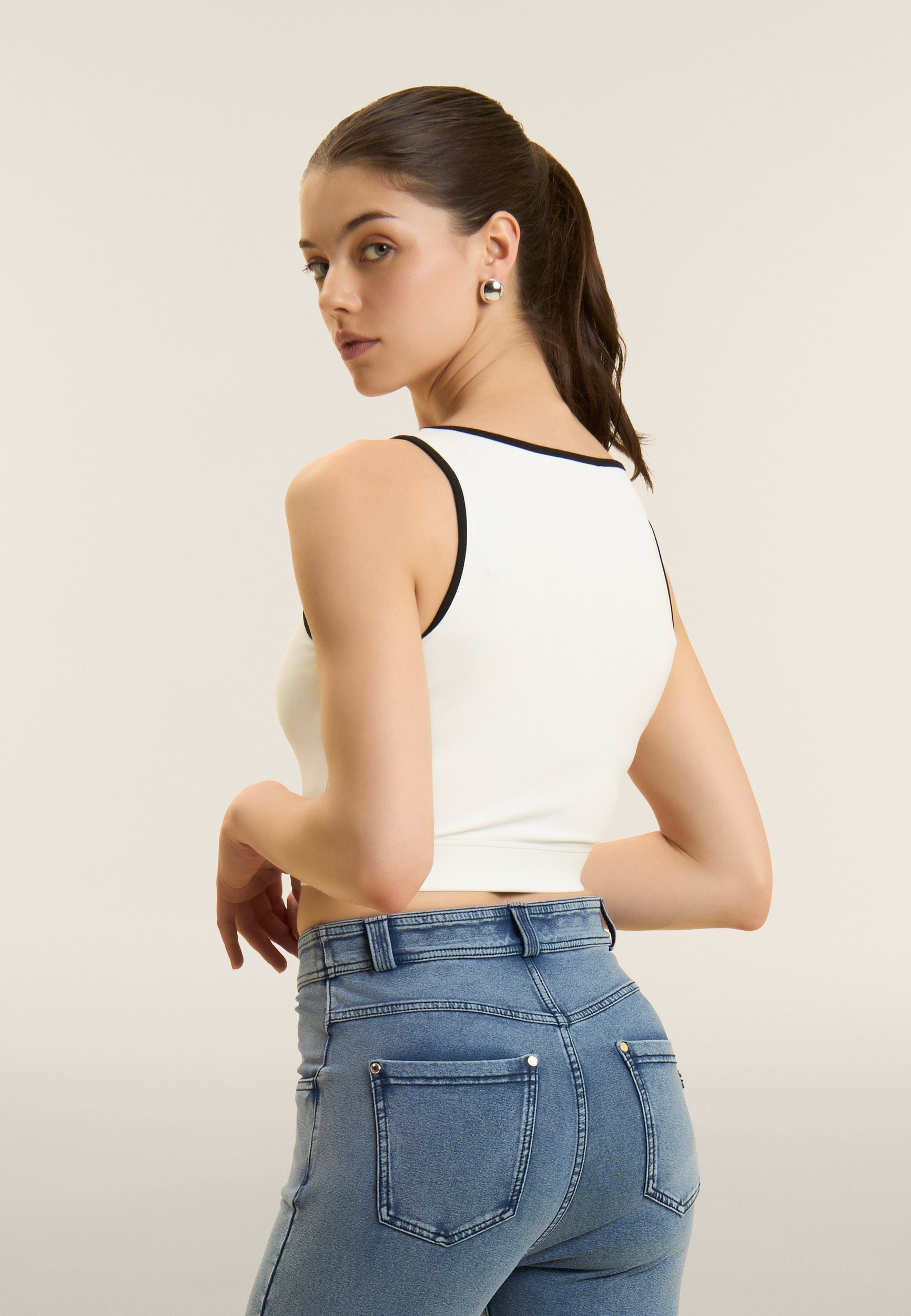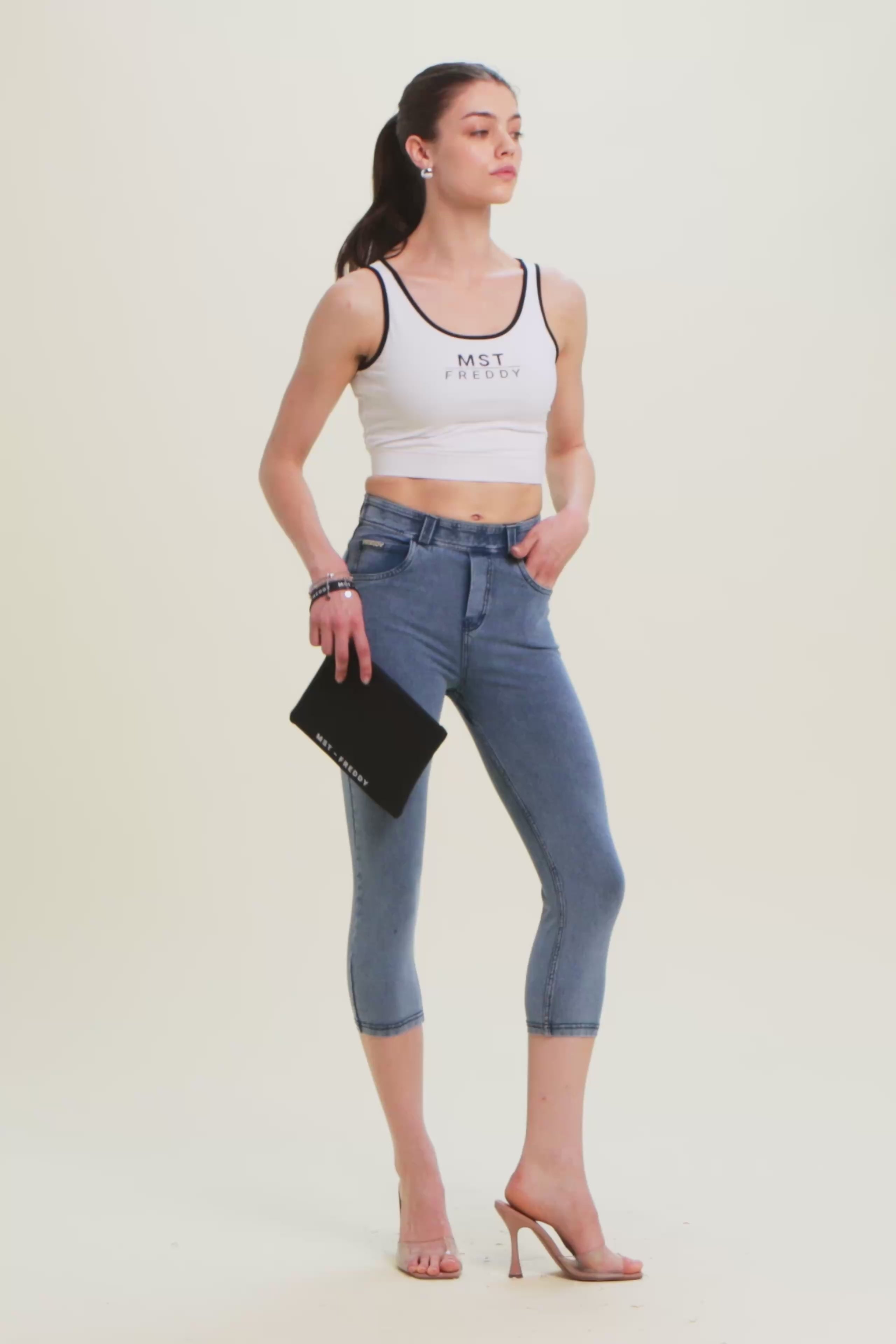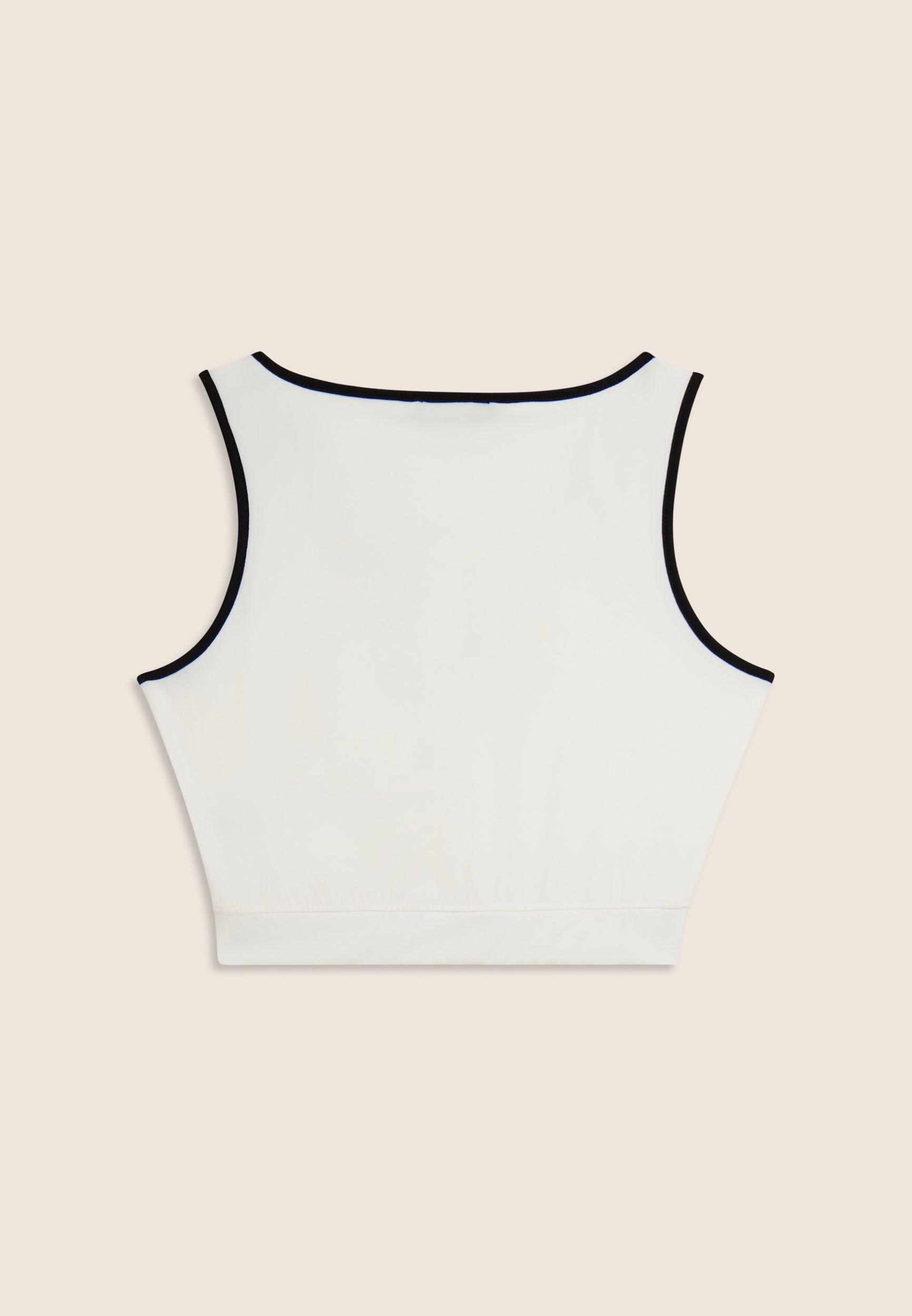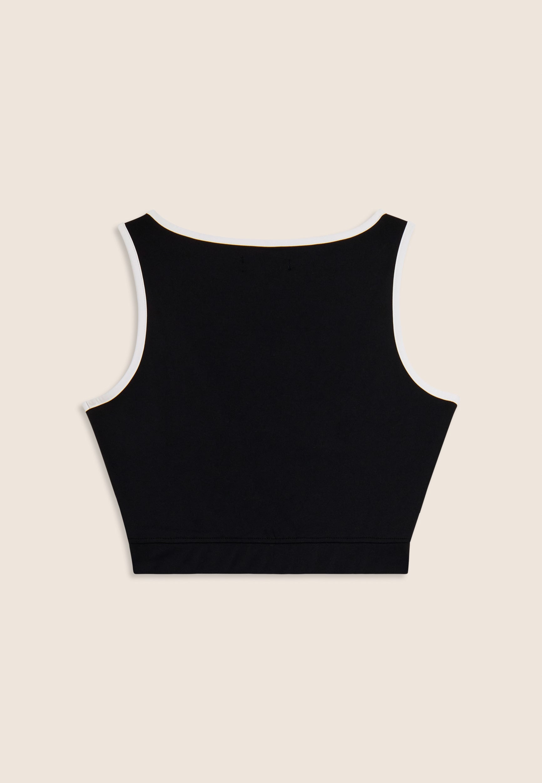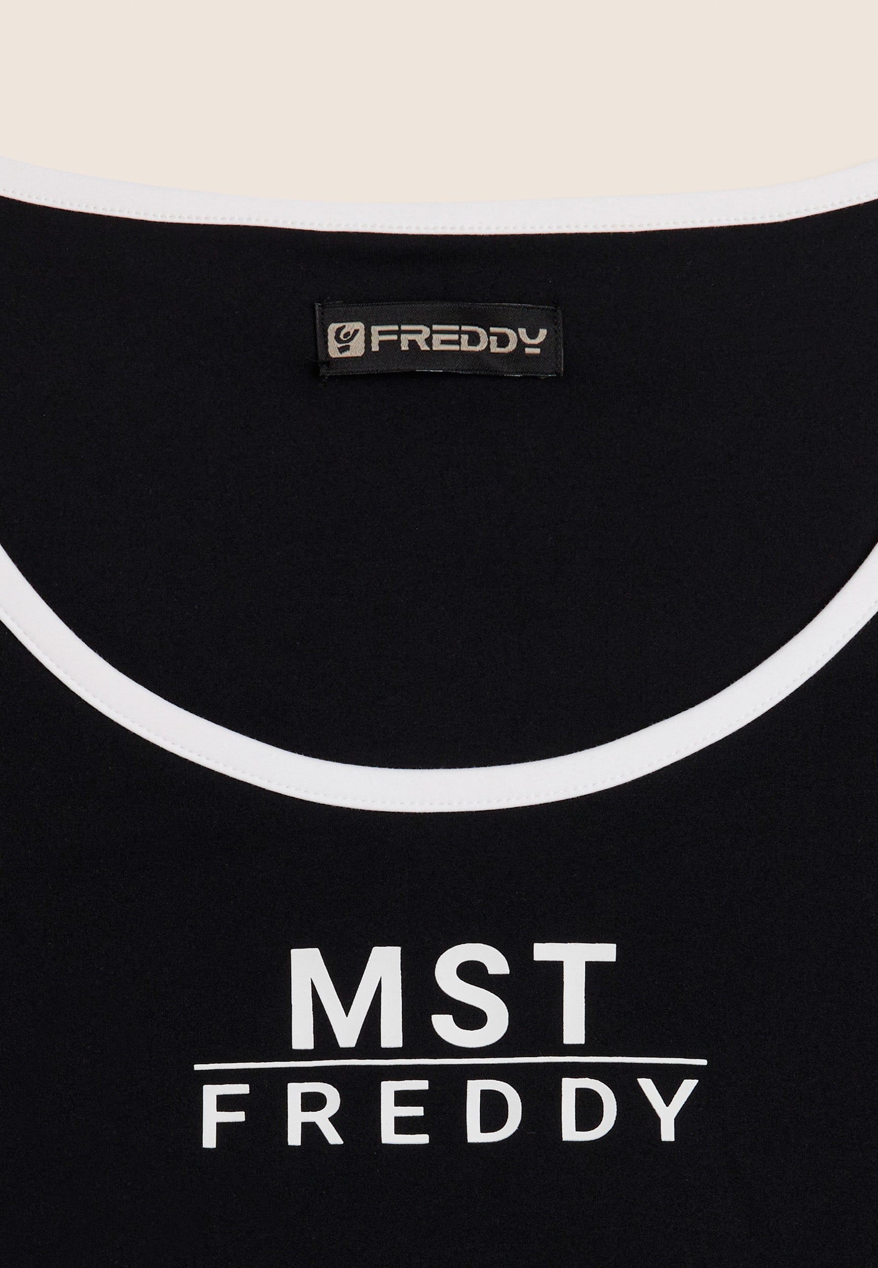 Top sportivo dal design dinamico e moderno, realizzato in nylon heavy jersey stretch, un tessuto resistente, morbido e elasticizzato che assicura comfort e libertà di movimento. La vestibilità aderente e la lunghezza cropped offrono un sostegno medio ideale per le attività sportive. Lo scollo girocollo e le spalline regular sono bordati in contrasto colore, aggiungendo un dettaglio visivo distintivo. La stampa MST FREDDY sul fronte completa il look, unendo funzionalità ed eleganza in un solo capo.