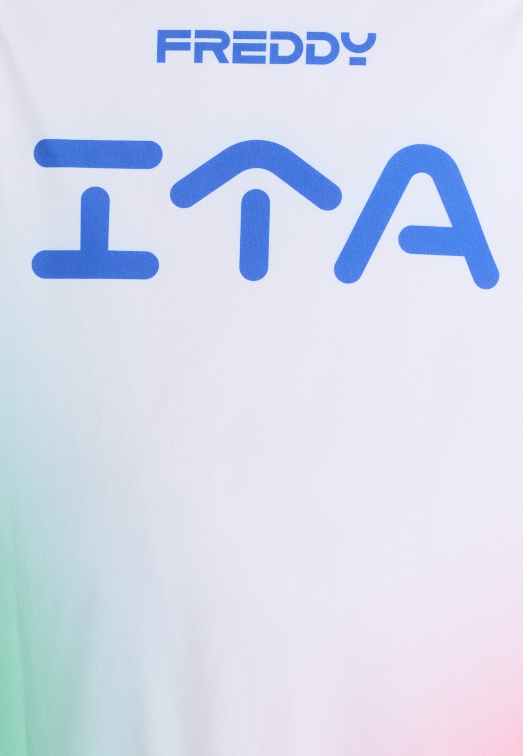 La canotta ufficiale della Nazionale Italiana di Beach Volley stagione 2025/2026 unisce design iconico e funzionalità tecnica, pensata per accompagnare i movimenti dinamici del beach volley. Realizzata in interlock semiopaco, garantisce una buona elasticità meccanica, leggerezza e massima traspirabilità anche durante l’attività intensa. Il materiale è ad asciugatura rapida, ideale per il gioco all’aperto e sotto il sole. Il taglio regular con retro a vogatore assicura ampia libertà di movimento. Le sfumature grafiche, ispirate all’energia del beach volley, scorrono sul tessuto come un gesto in movimento. Completano il design la stampa ITA sul fronte e i loghi FREDDY e FIPAV.