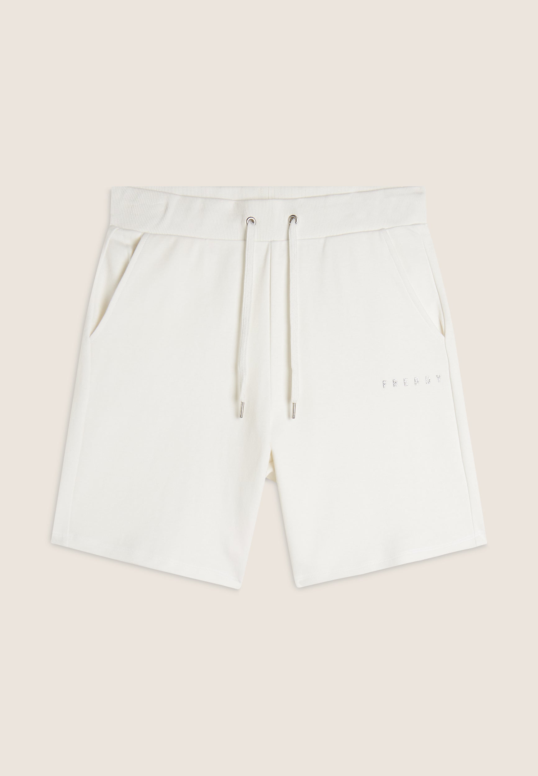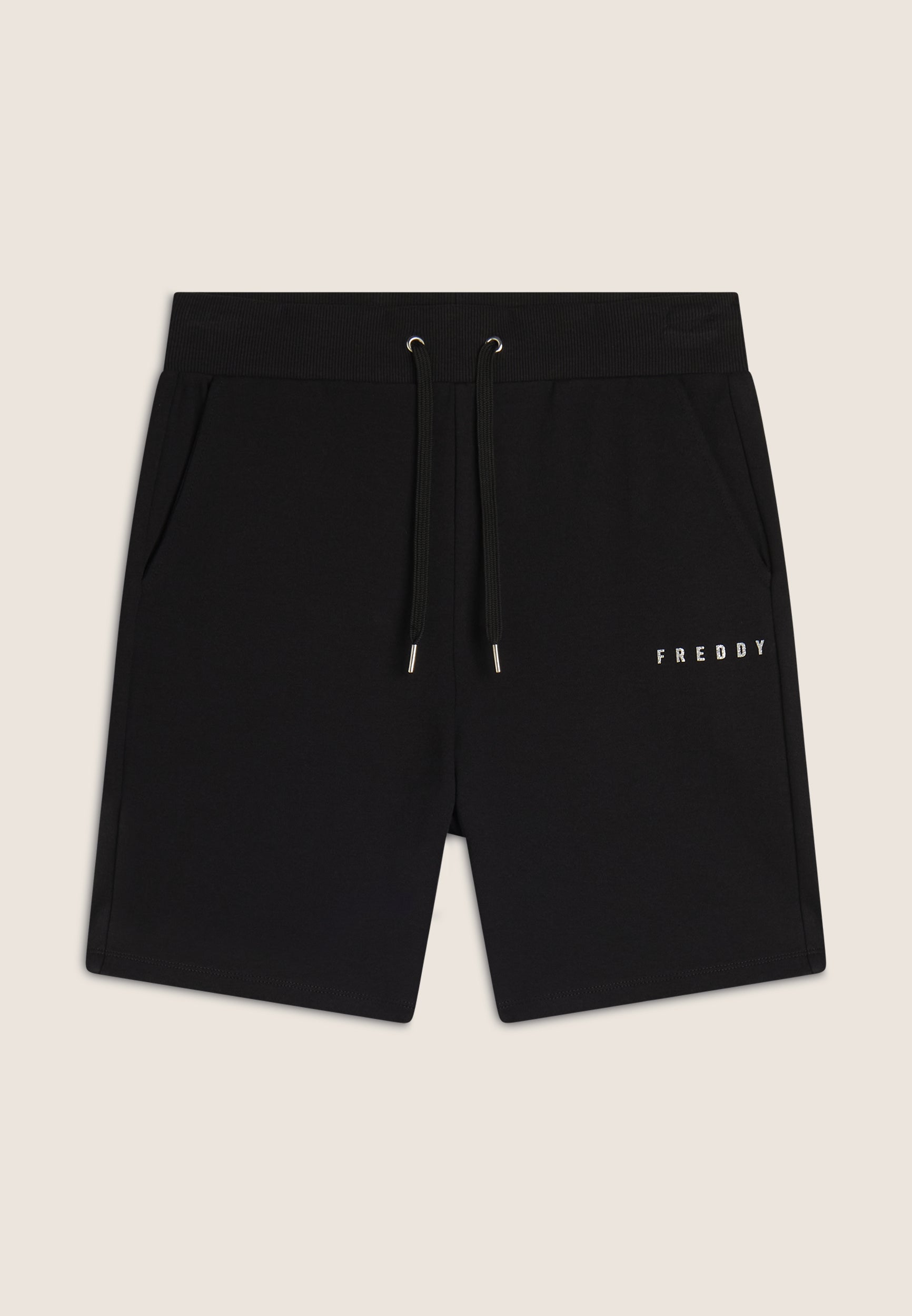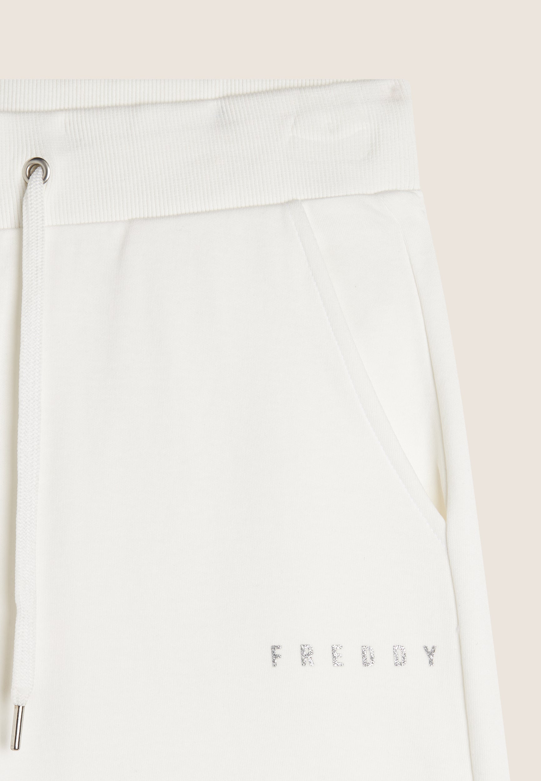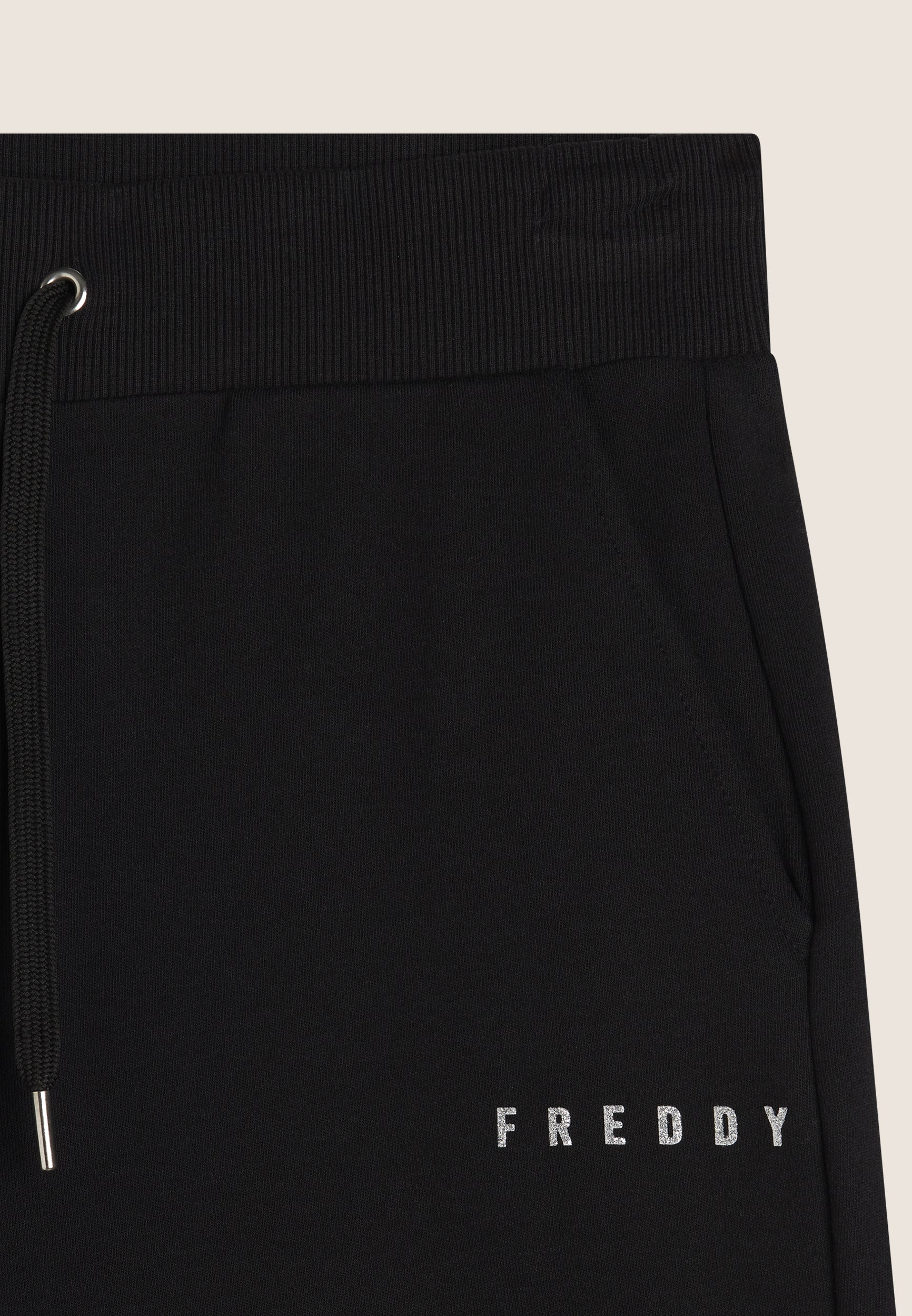 Pantaloni corti in tessuto interlock con vestibilità regular fit, perfetti per il tempo libero o l’attività fisica. Dotati di vita regular in costina con coulisse e gamba dritta di lunghezza bermuda, garantiscono praticità e comfort. Il piccolo logo FREDDY in glitter argentato sul fianco sinistro conferisce un dettaglio elegante. Presentano tasche anteriori interne per maggiore funzionalità.