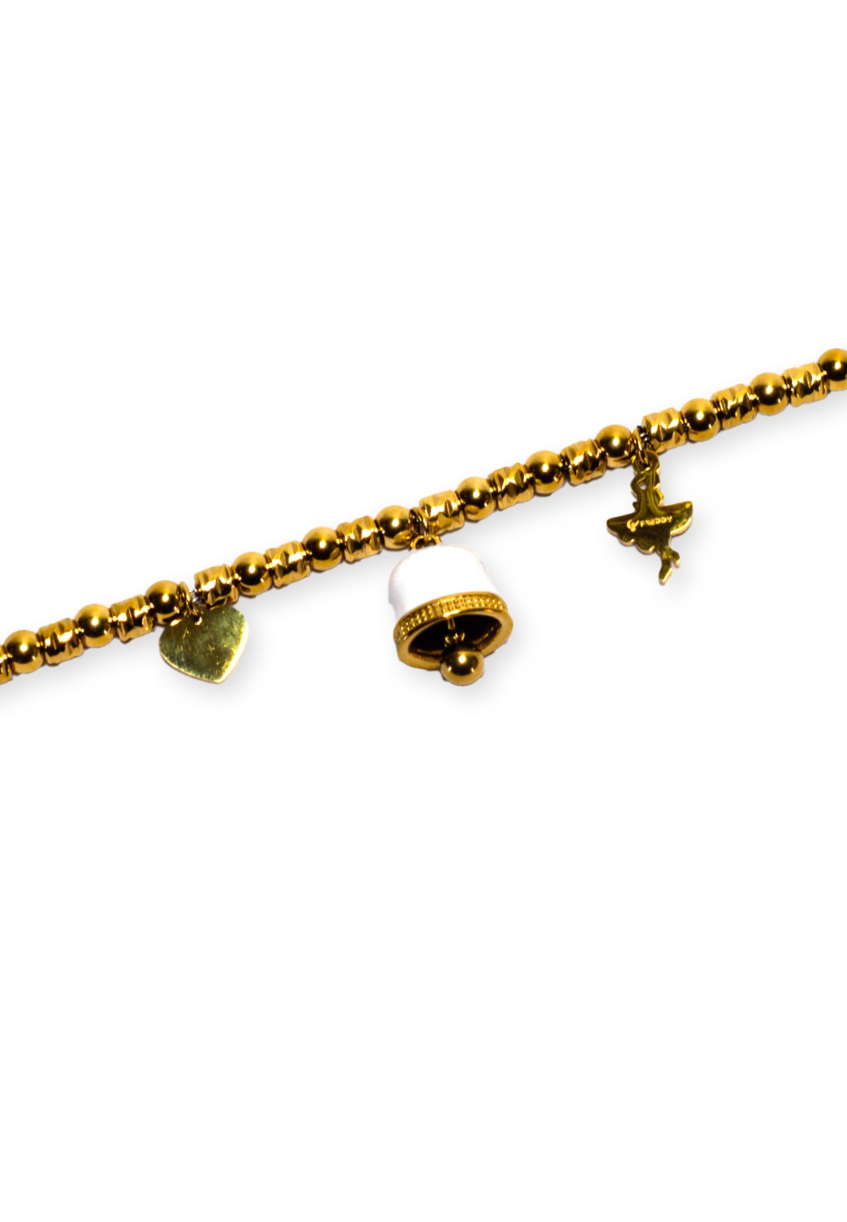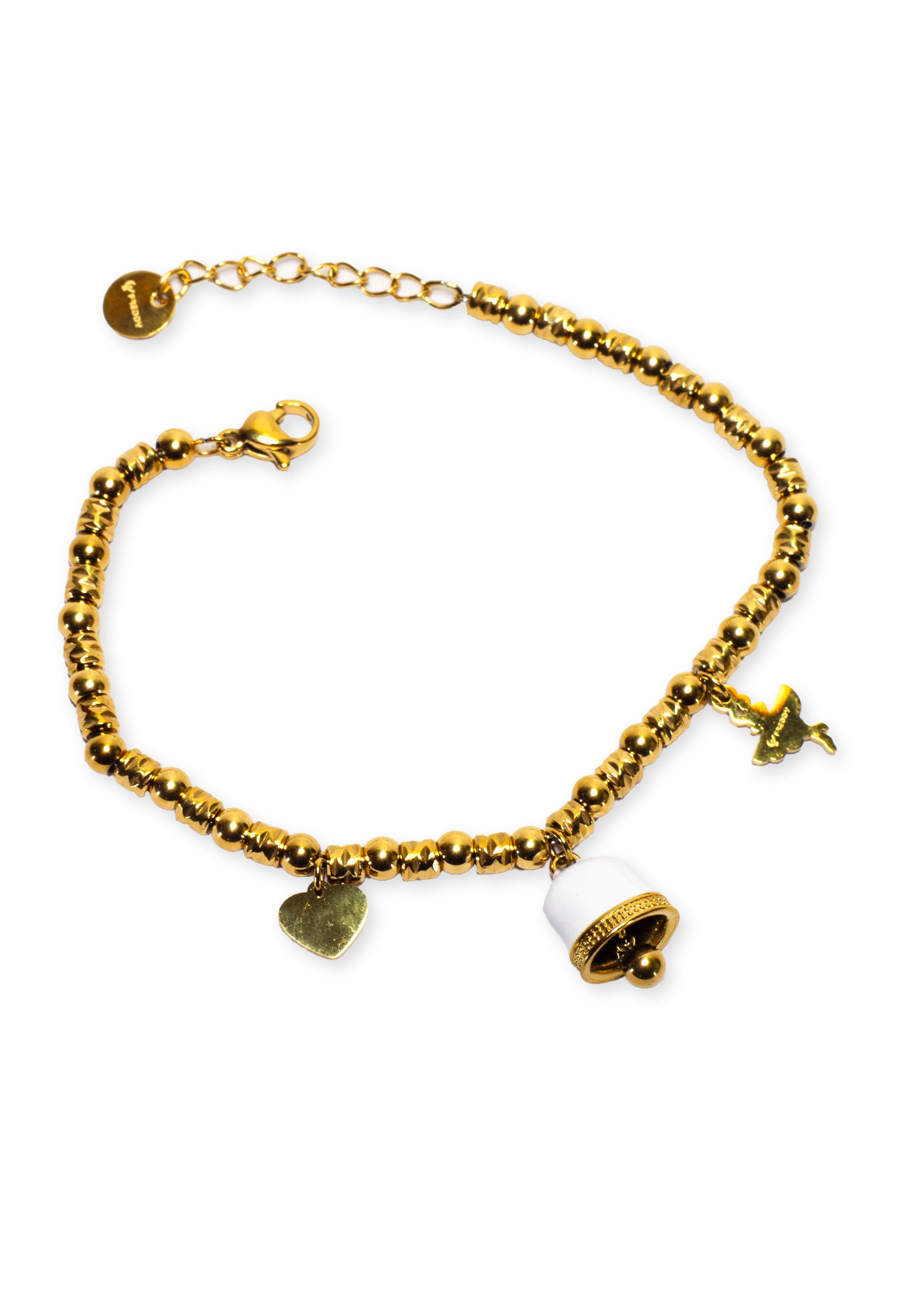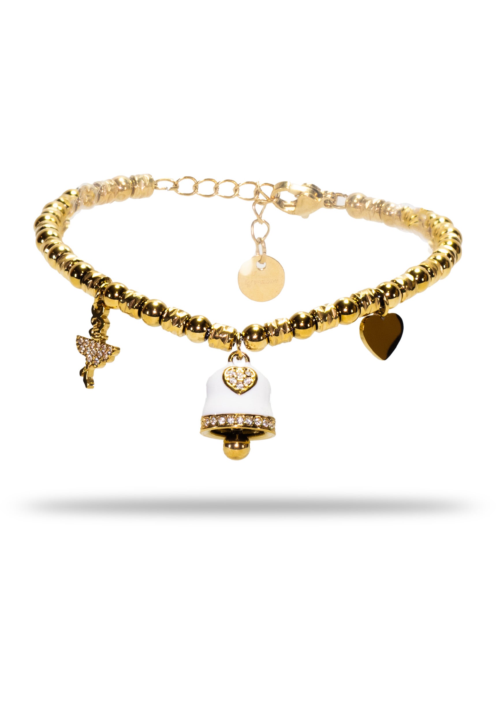Porta un tocco di allegria e femminilità ai tuoi look con questo bracciale charm. La catena alterna sfere lisce ed elementi sfaccettati per un effetto luminoso e vivace, arricchita da tre ciondoli: una campanella smaltata bianca impreziosita da strass, un angelo scintillante e un cuore minimal. Realizzato in acciaio gold 316L ipoallergenico, è completato da una chiusura a moschettone e catenella regolabile. Un accessorio perfetto per esprimere il proprio stile con leggerezza e originalità.