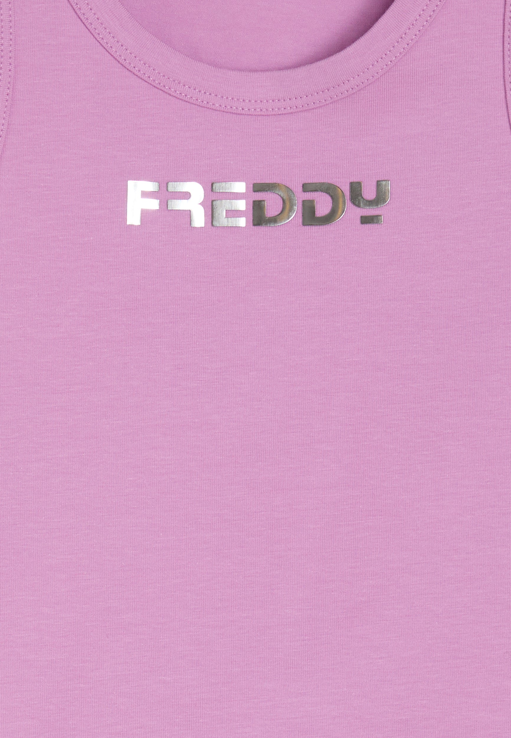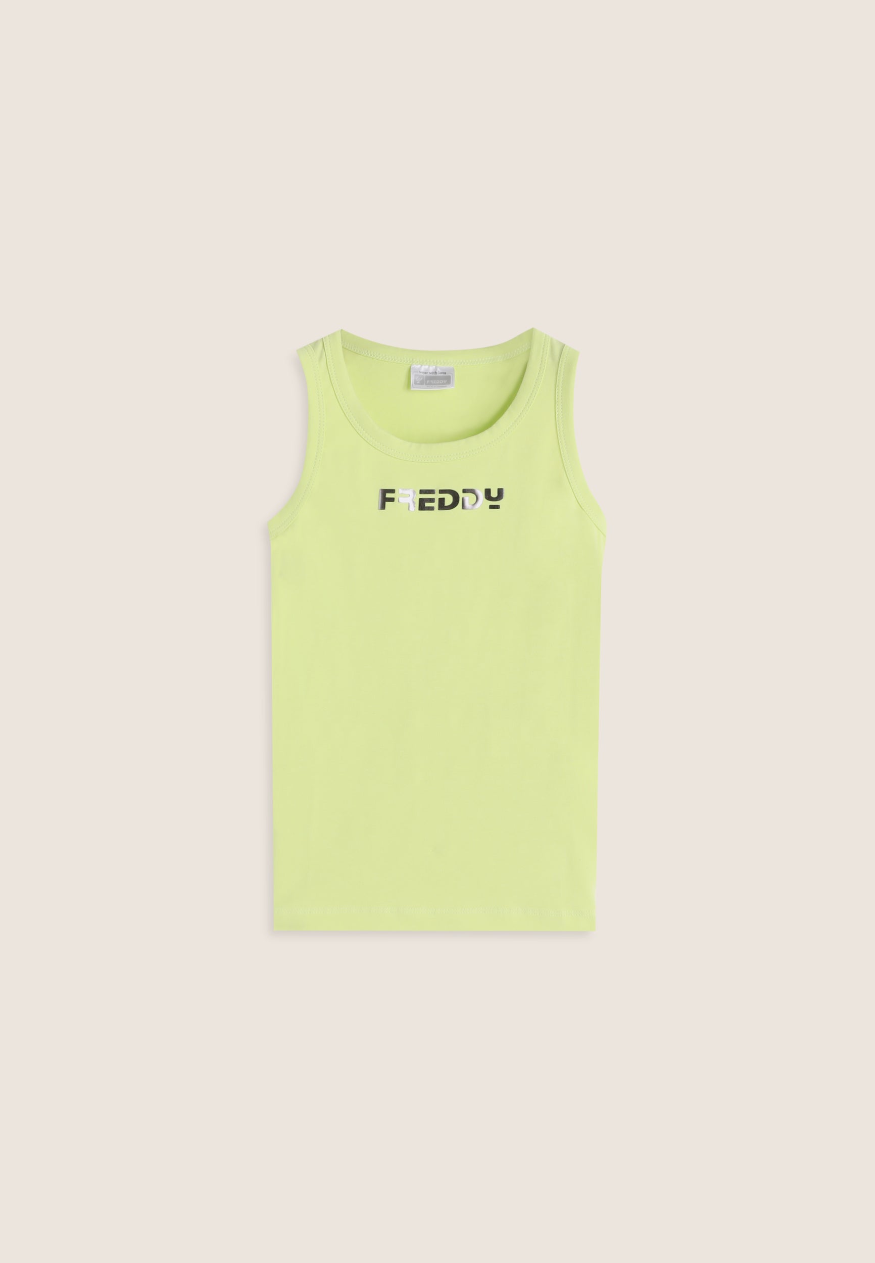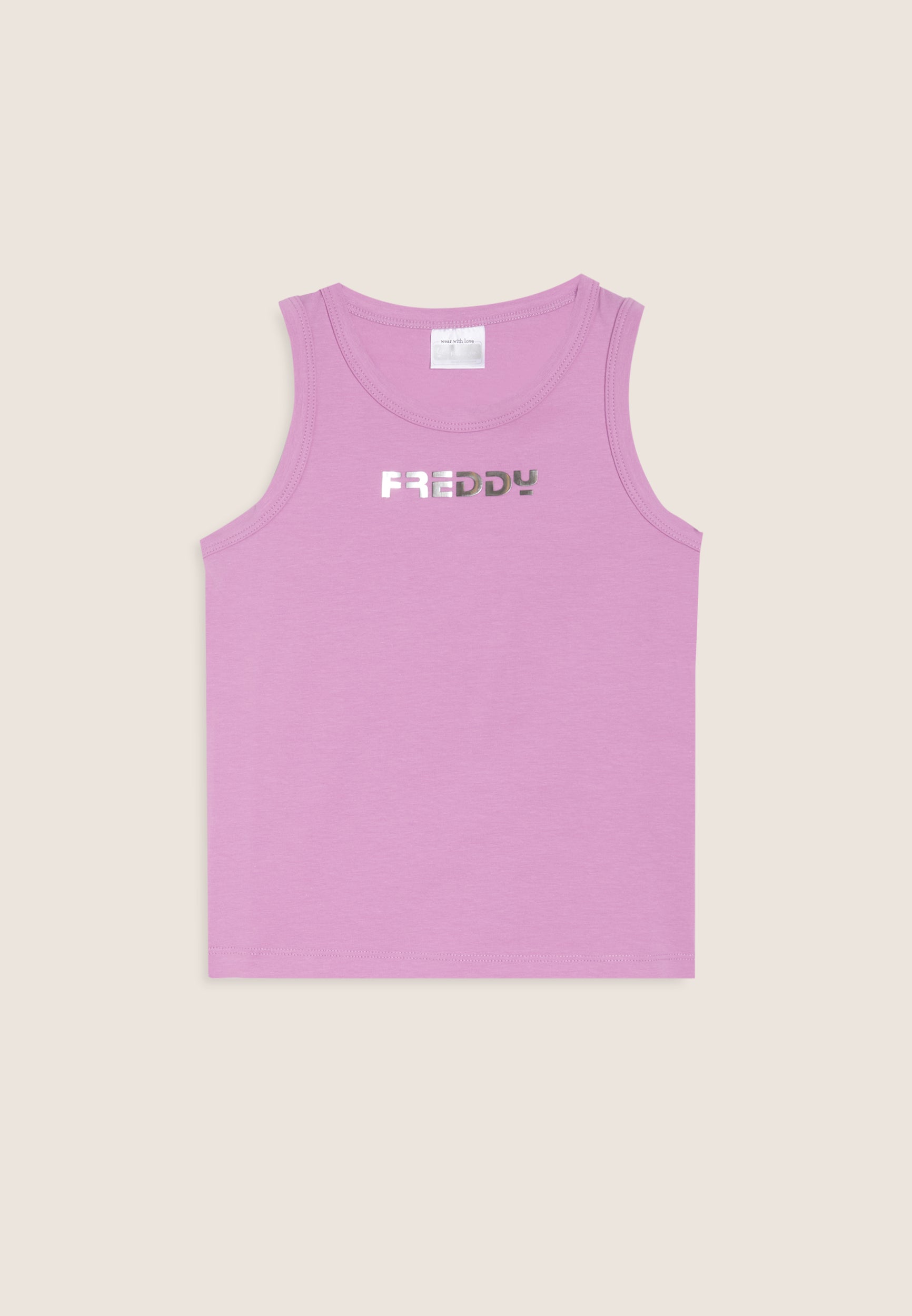 Questa canotta da bambina in cotone elasticizzato è un capo essenziale, perfetto per il tempo libero e le giornate più calde. Il fit regolare, lo scollo girocollo, le spalline ampie e il fondo dritto garantiscono comfort e libertà di movimento. A impreziosire il design minimal, il logo FREDDY stampato in argento appena sotto lo scollo, per un tocco luminoso e discreto che completa il look con stile.