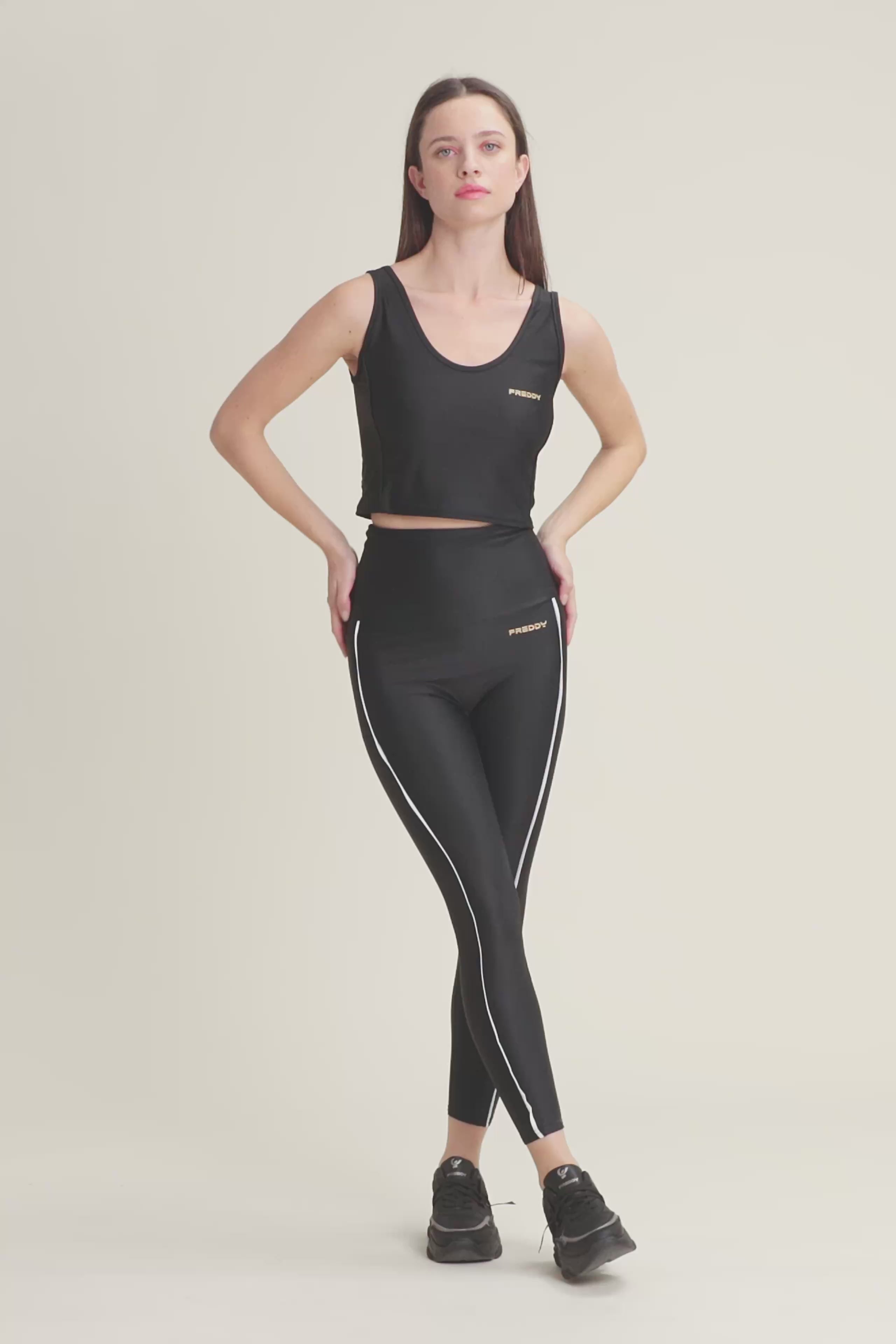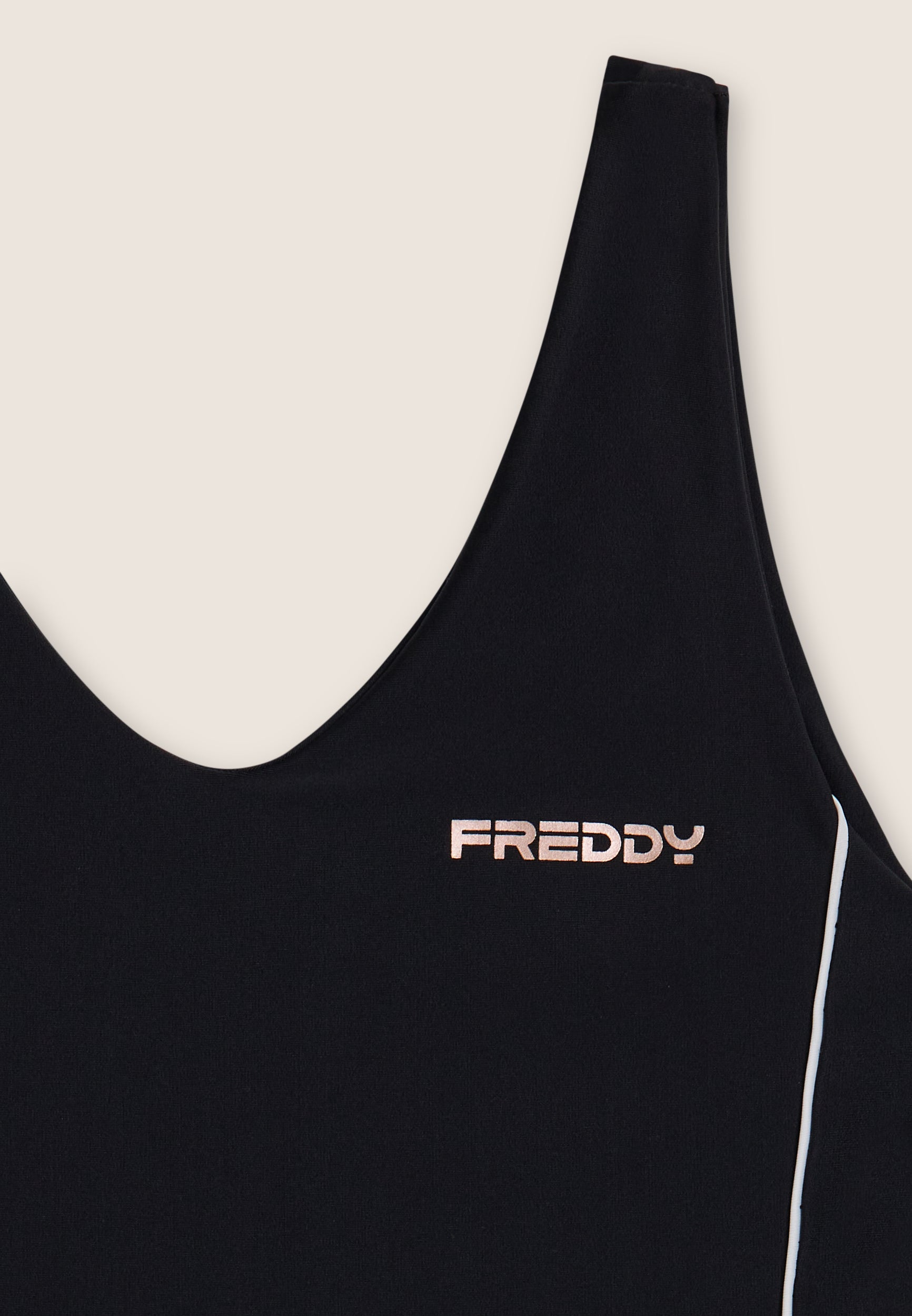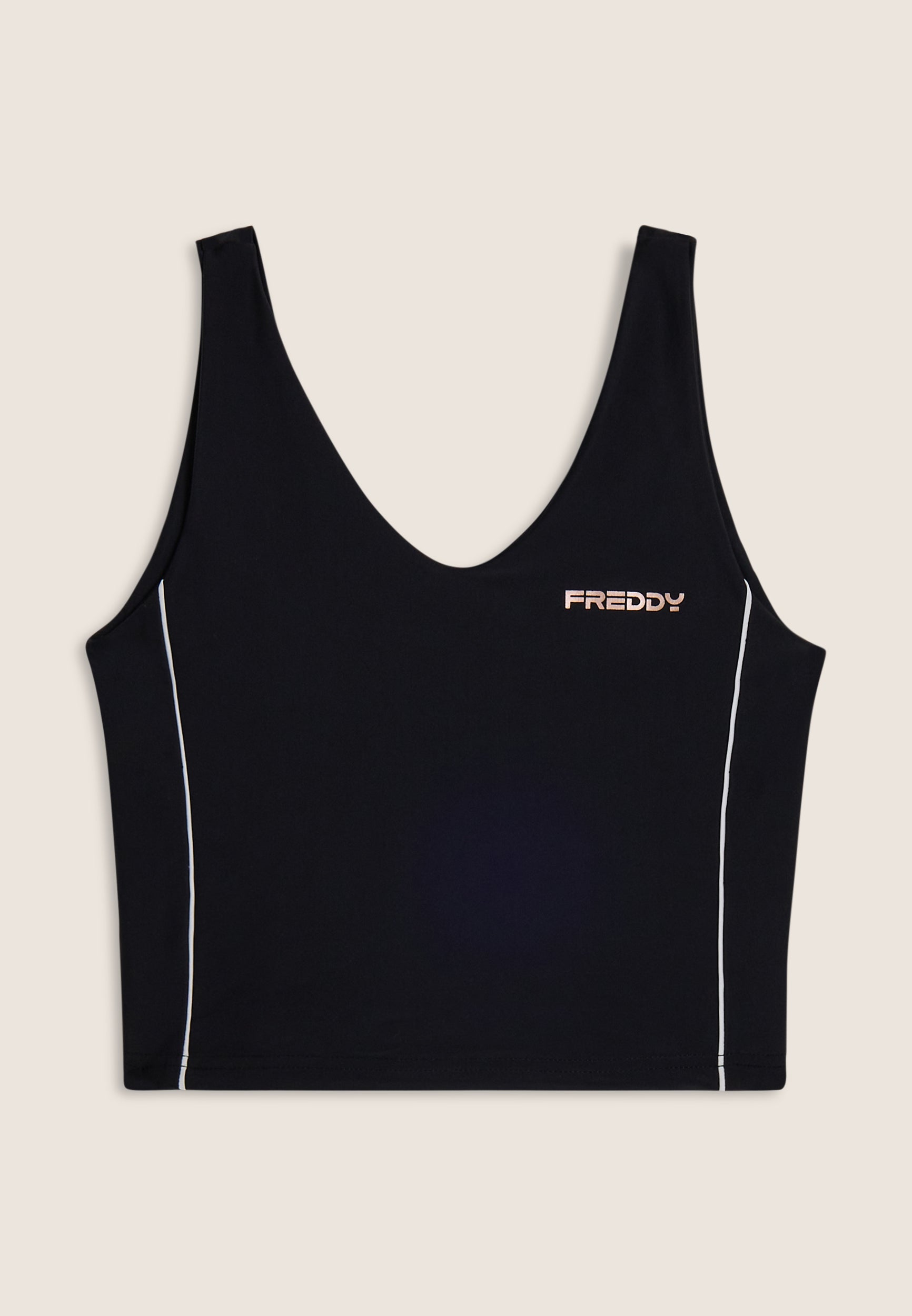 Ideale per le sessioni di training intense, questa canotta cropped ha uno scollo ampio sia davanti che dietro e spalline regular per una vestibilità sicura. Il tessuto jersey nylon è leggero e traspirante, mentre I profili bianchi a contrasto e il logo FREDDY stampato sul fronte completano il design con dettagli grafici ben definiti.