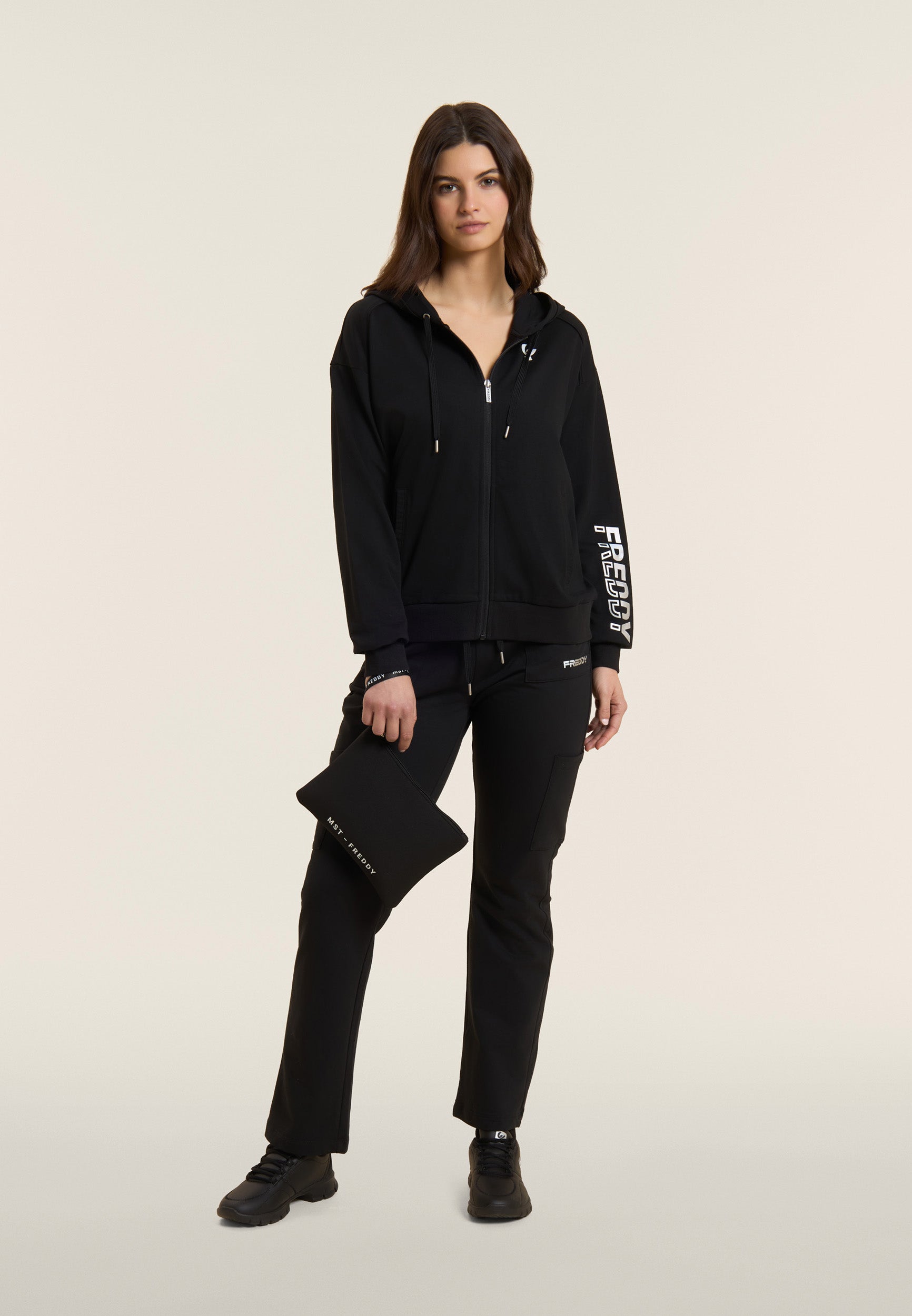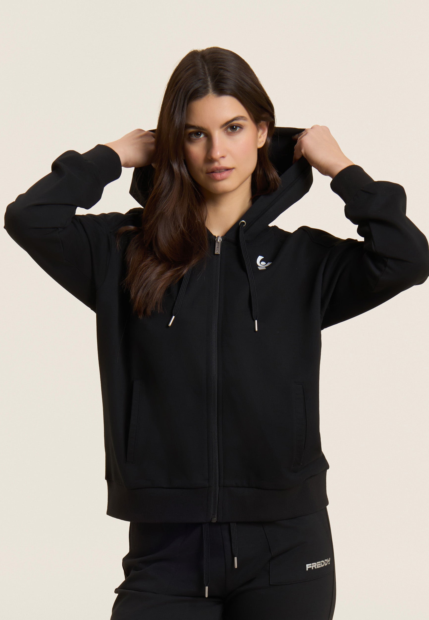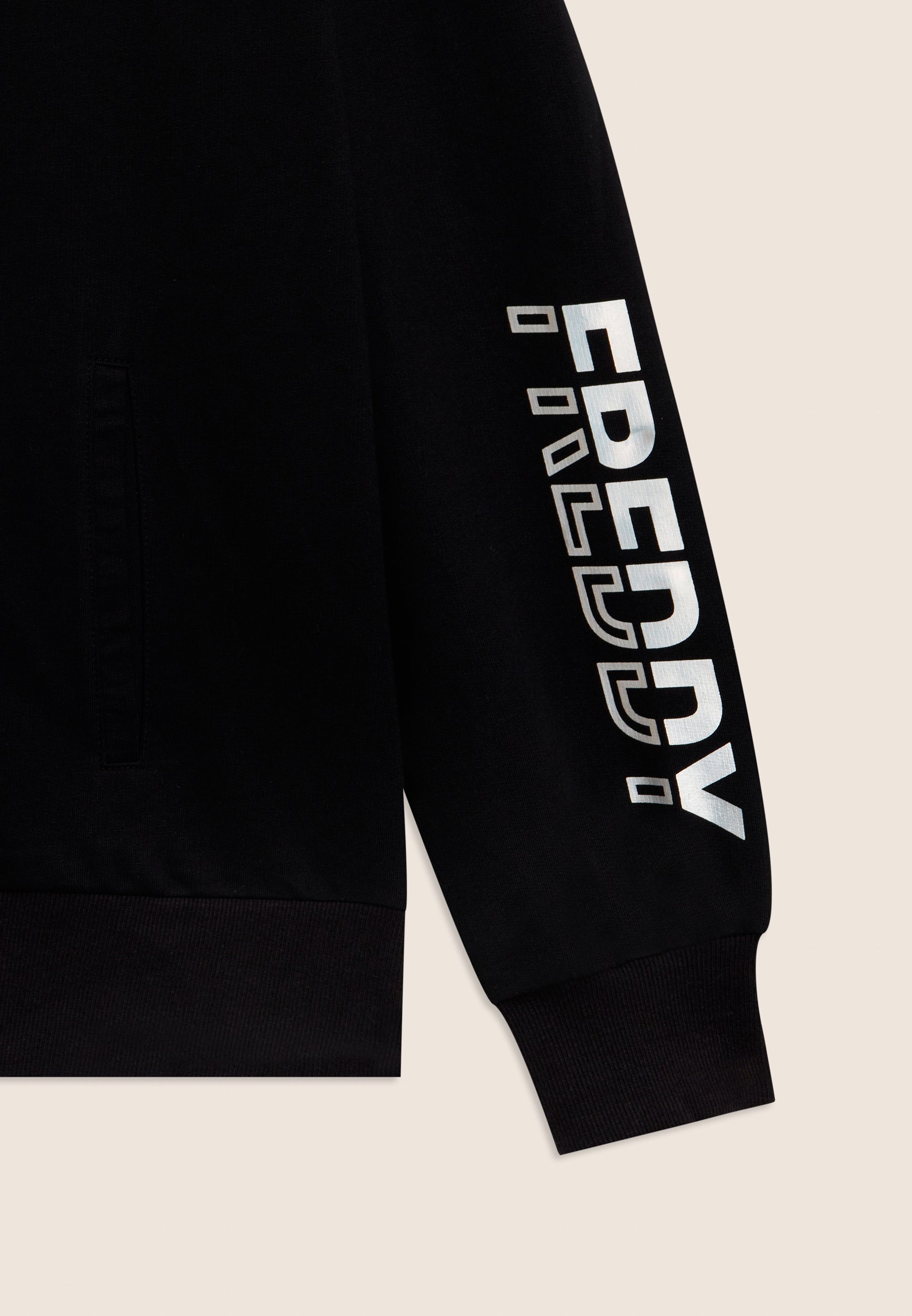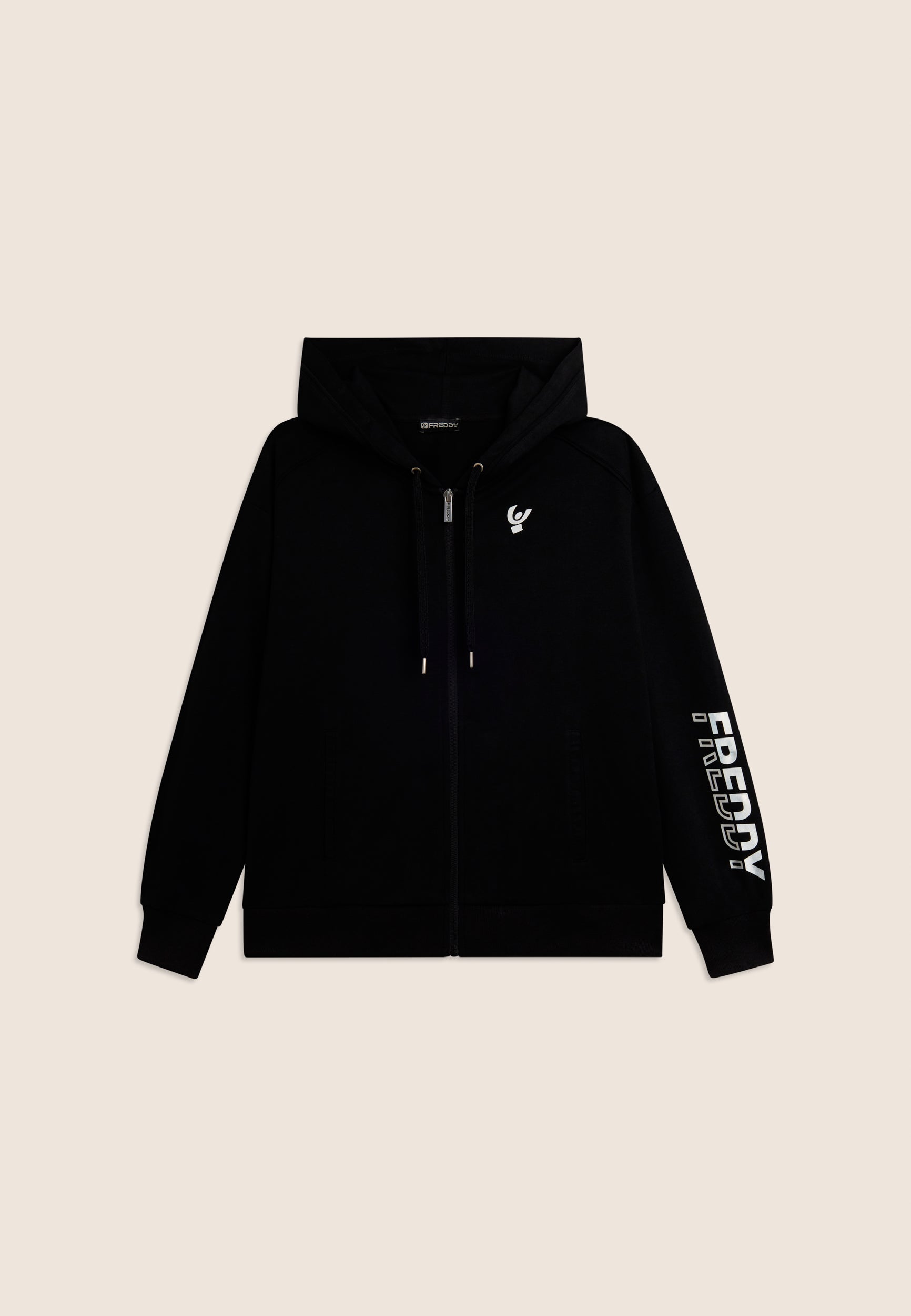 Dinamica e funzionale, questa felpa con zip e cappuccio è l’alleata perfetta per muoverti in totale libertà. Il tessuto in heavy jersey stretch di cotone garantisce comfort e flessibilità, mentre la vestibilità comfort e la lunghezza regular la rendono ideale per ogni momento della giornata. Il cappuccio foderato in jersey con coulisse ti protegge con stile, le maniche lunghe hanno polsini in costina per un fit stabile. Completano il capo il logo FREDDY con finish perlato sul fondo manica sinistro, il logo "omino" sul petto e le pratiche tasche interne. Design curato nei dettagli, pronto a seguirti ovunque.