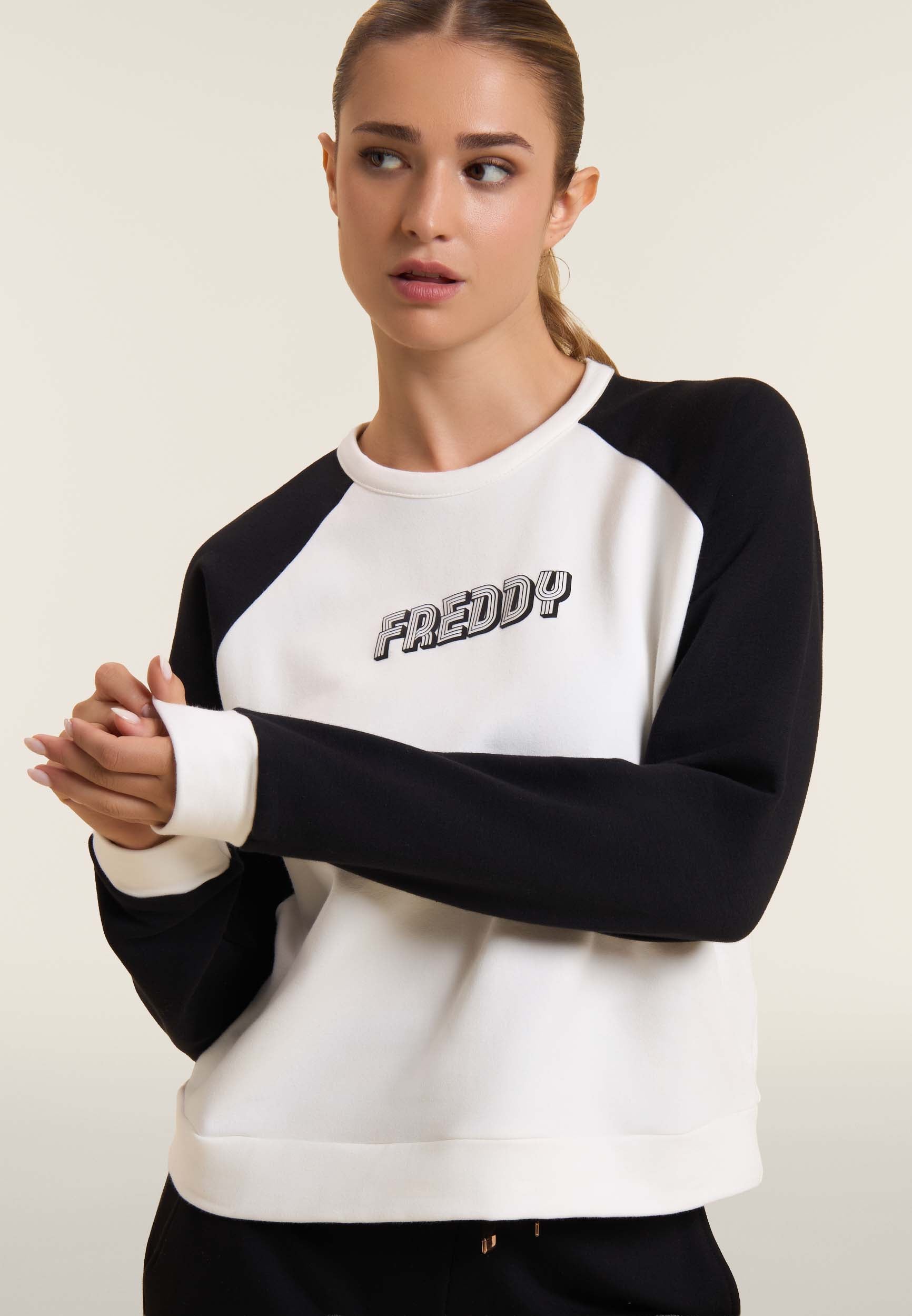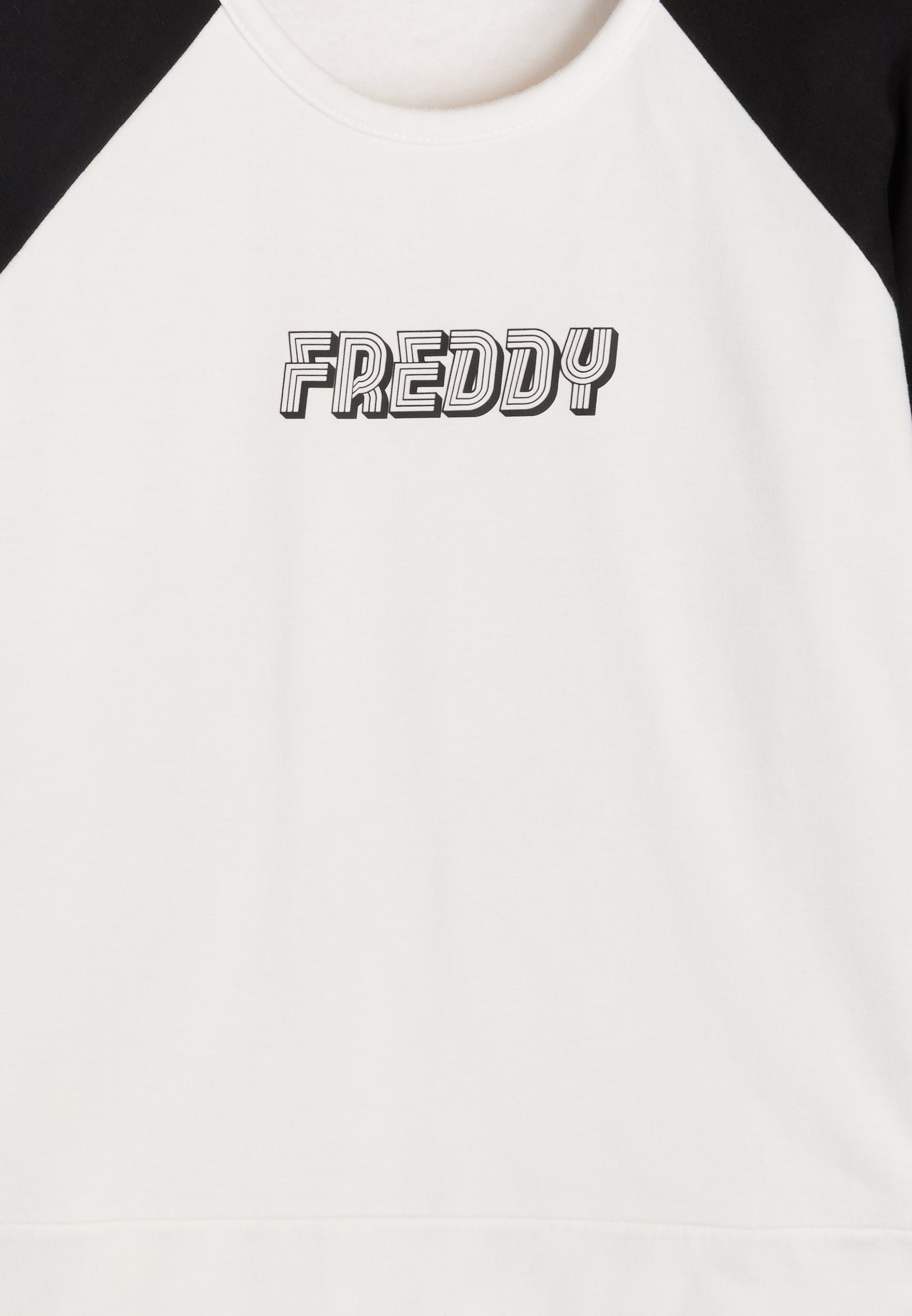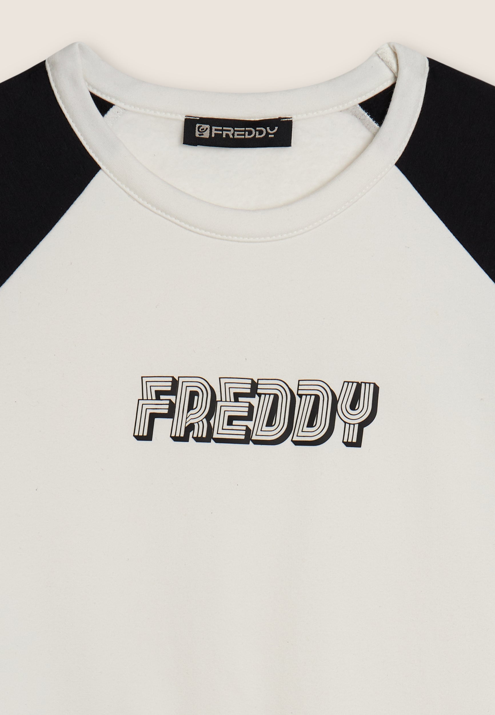 Questa felpa cropped mixa bianco e nero per un look grafico e deciso. Le maniche raglan con polsini a contrasto e il logo FREDDY bicolore aggiungono un tocco street, mentre la felpa garzata elasticizzata mantiene il capo morbido e confortevole. Perfetta con pantaloni wide leg o slim fit per creare outfit sporty-cool.