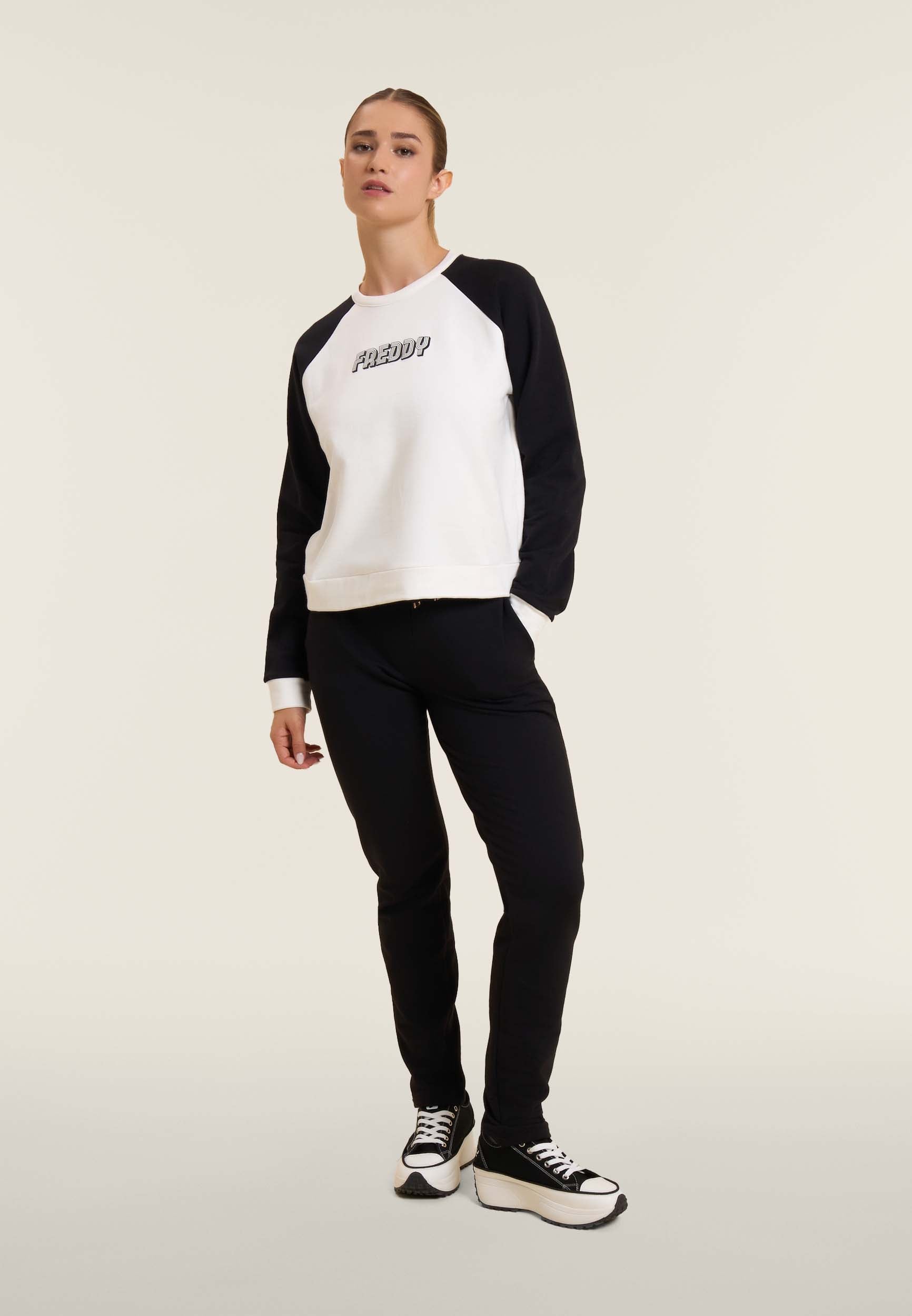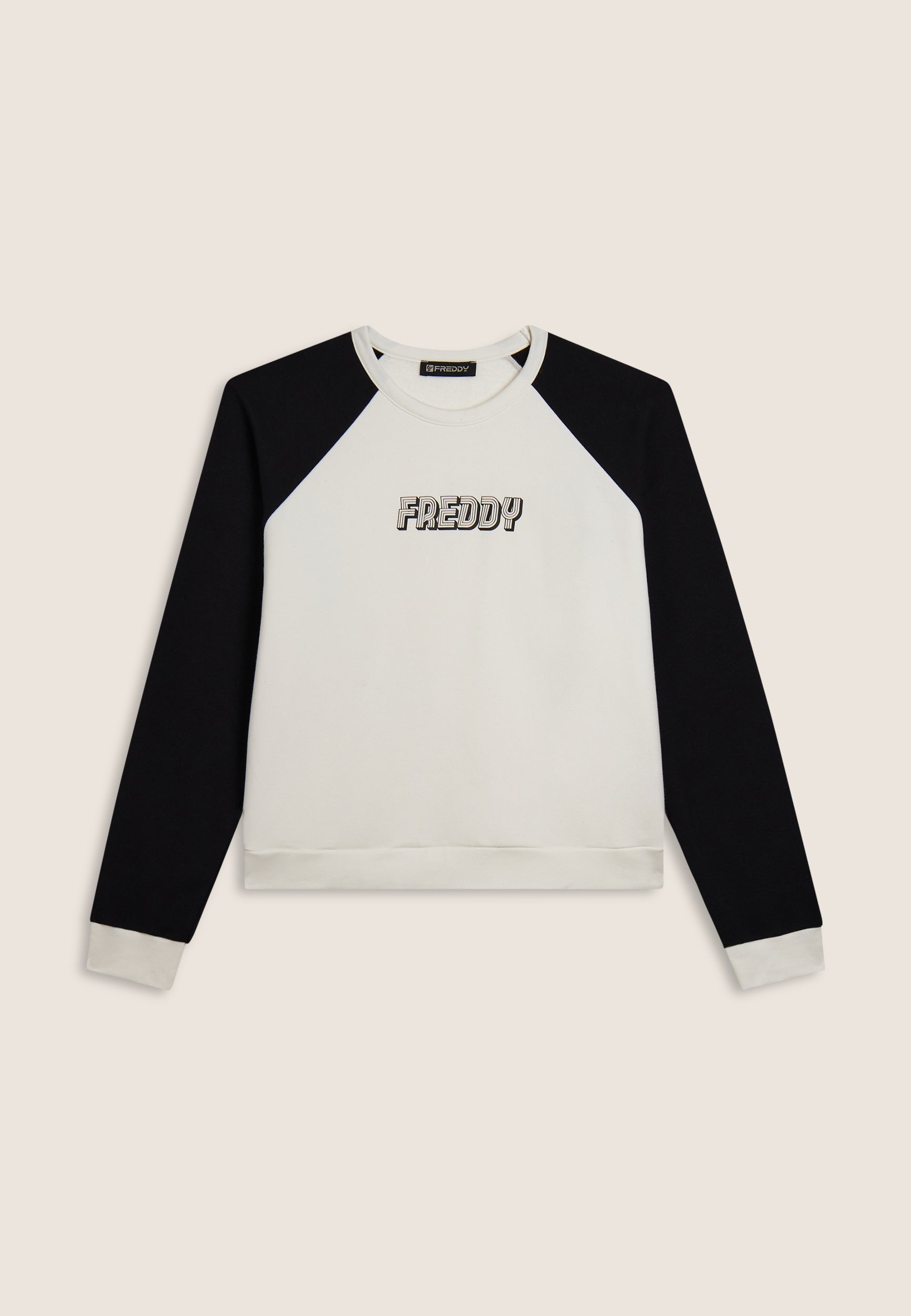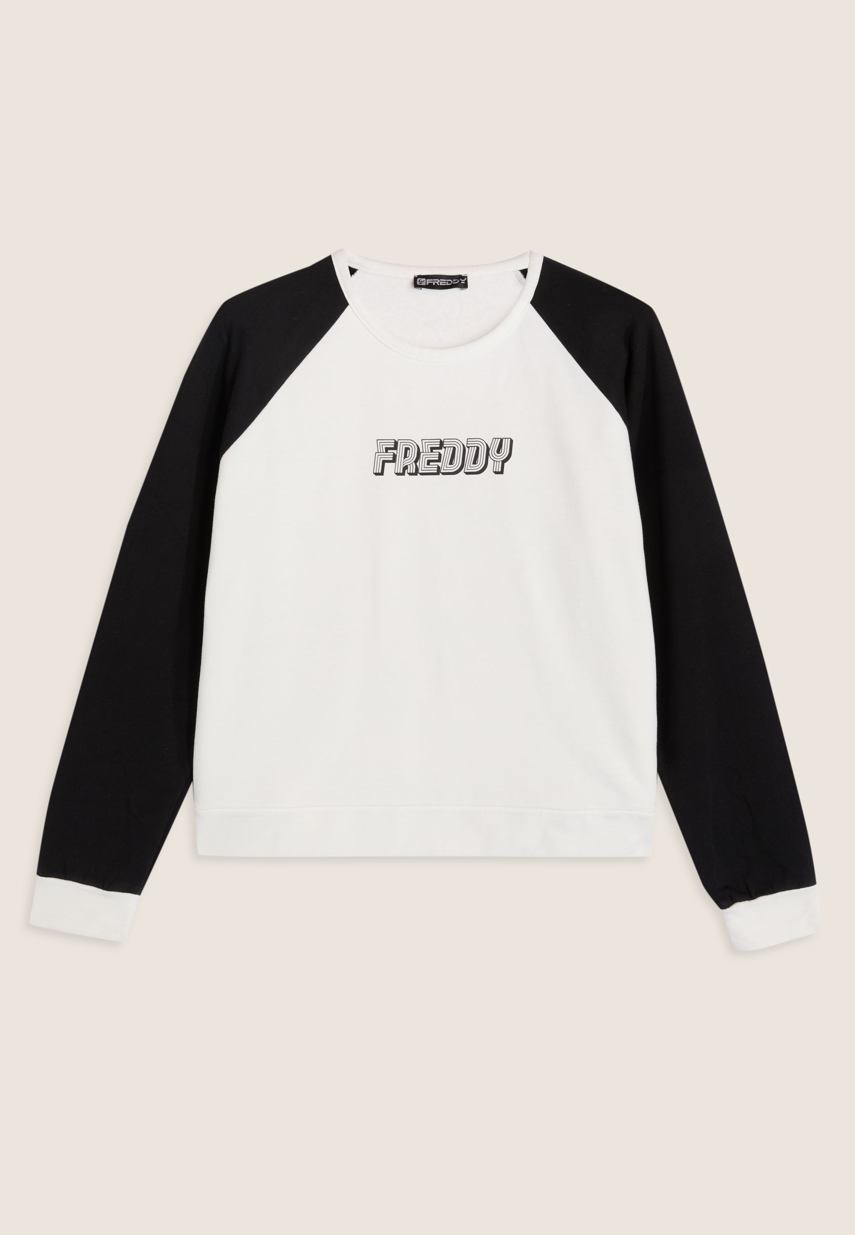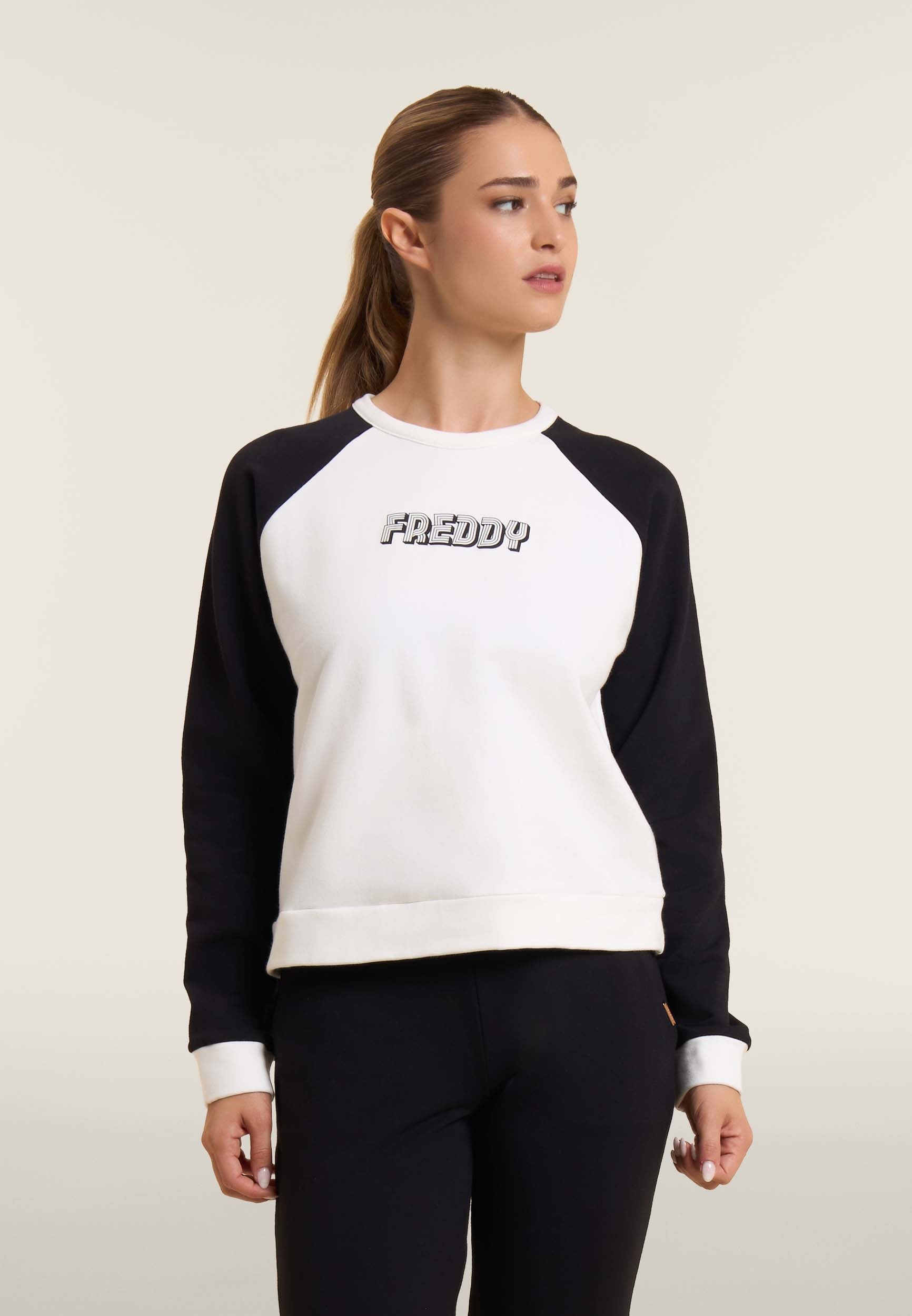 Questa felpa cropped mixa bianco e nero per un look grafico e deciso. Le maniche raglan con polsini a contrasto e il logo FREDDY bicolore aggiungono un tocco street, mentre la felpa garzata elasticizzata mantiene il capo morbido e confortevole. Perfetta con pantaloni wide leg o slim fit per creare outfit sporty-cool.
