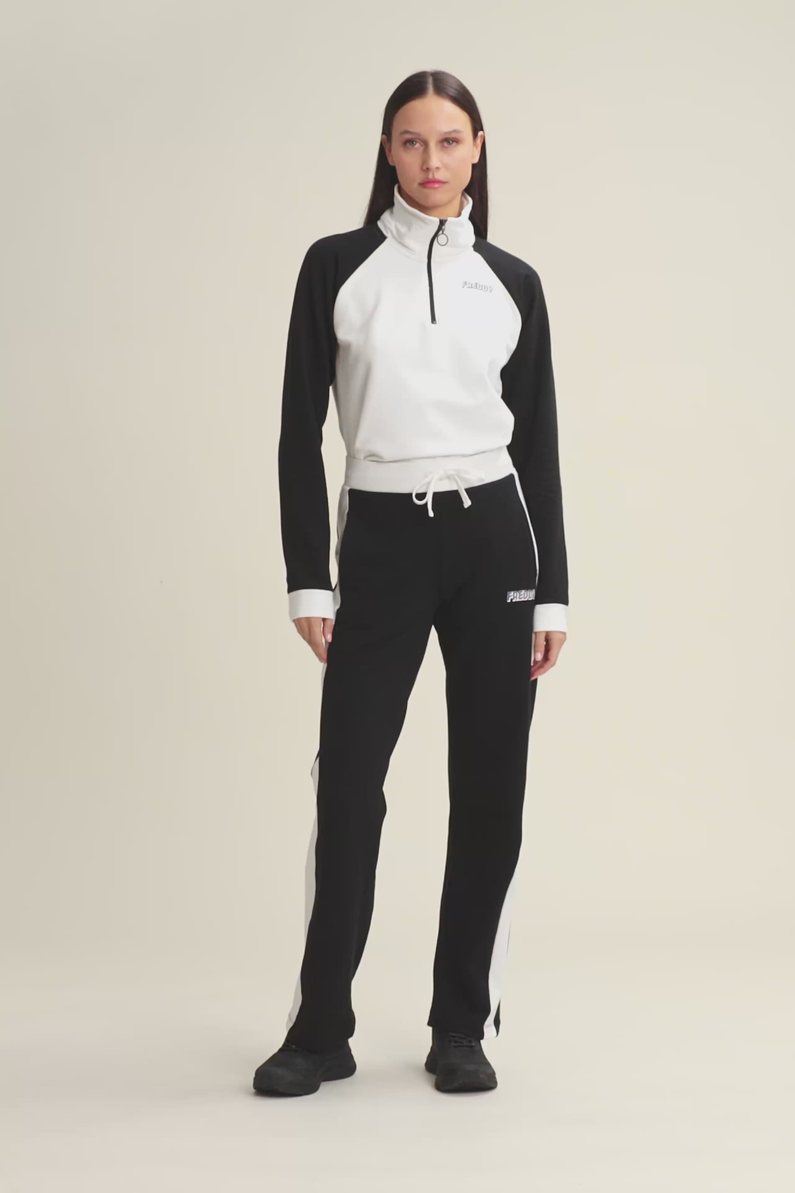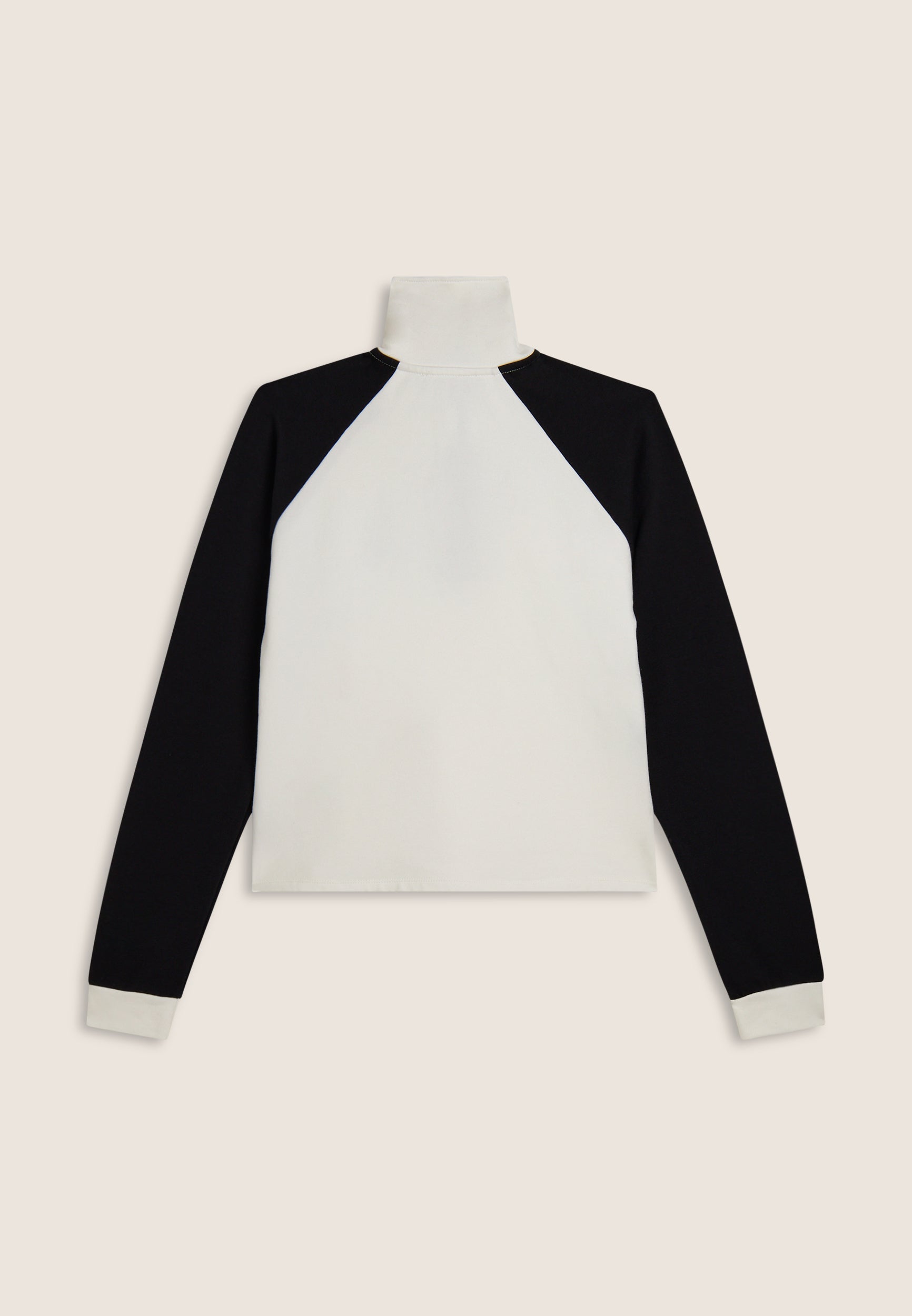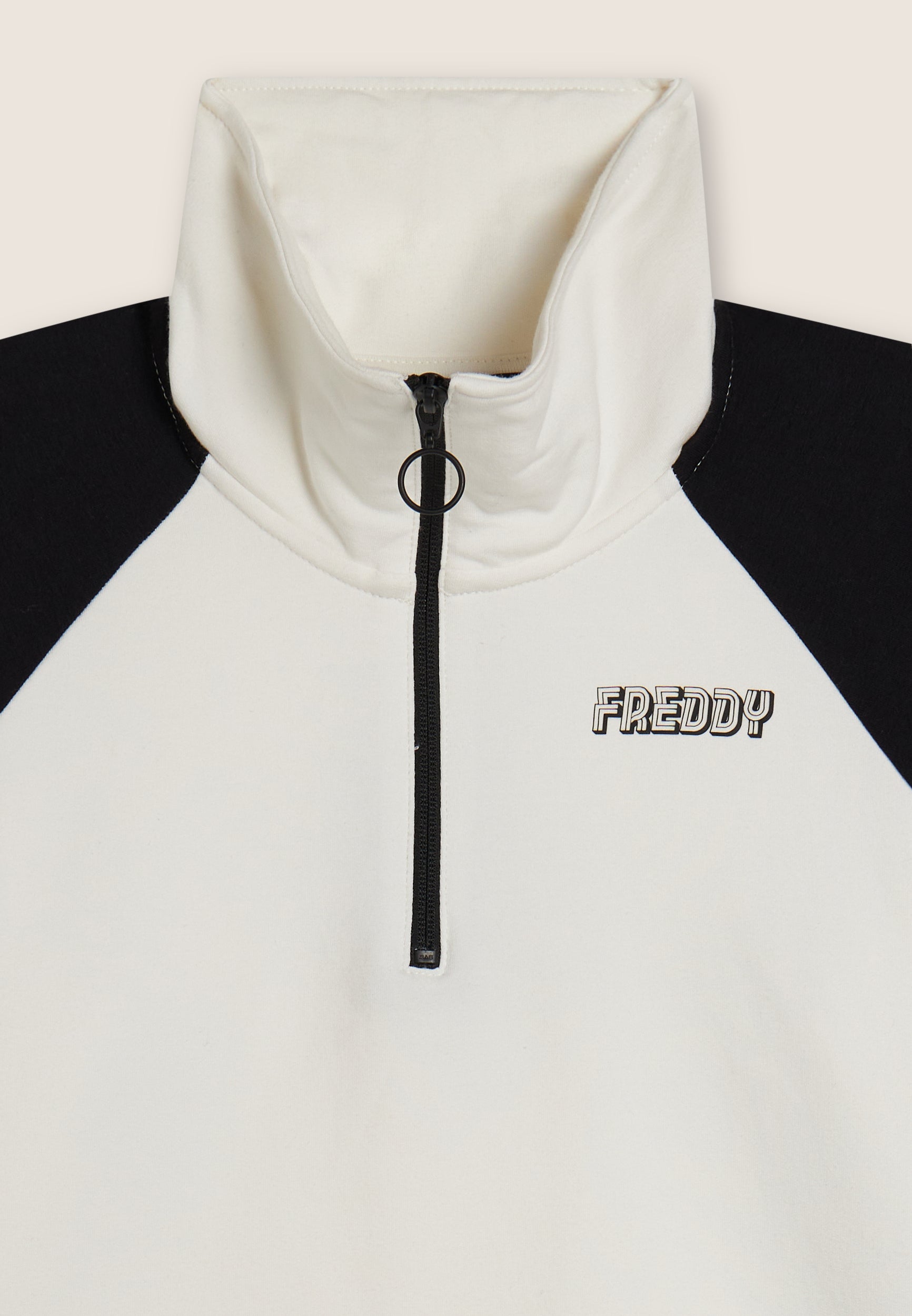 Minimal e d’impatto, questa felpa cropped gioca con i contrasti: bianca con maniche raglan nere e dettagli a contrasto su collo e polsini. La mezza zip e il logo FREDDY bicolore sul cuore completano un look sporty dal vibe urban. La felpa garzata elasticizzata garantisce comfort e morbidezza.