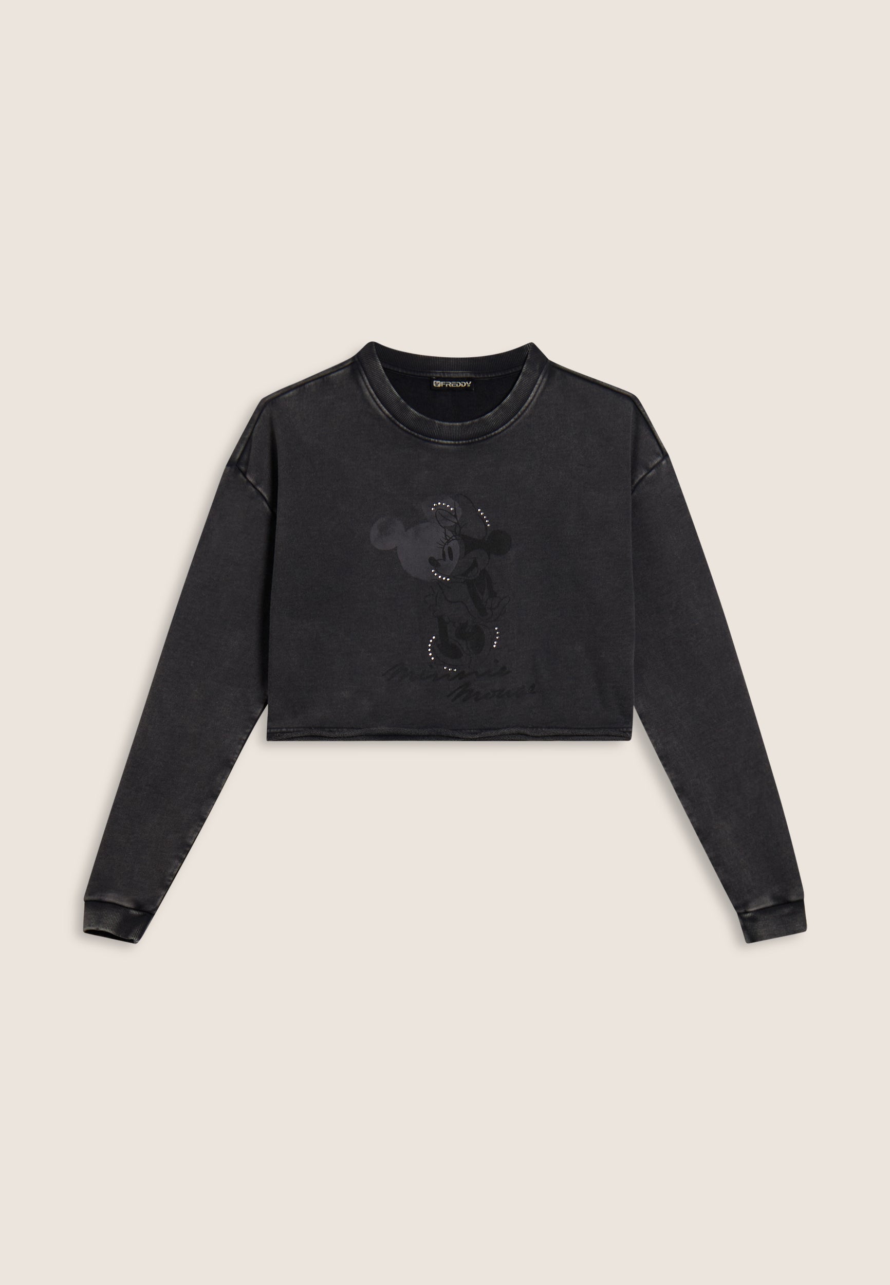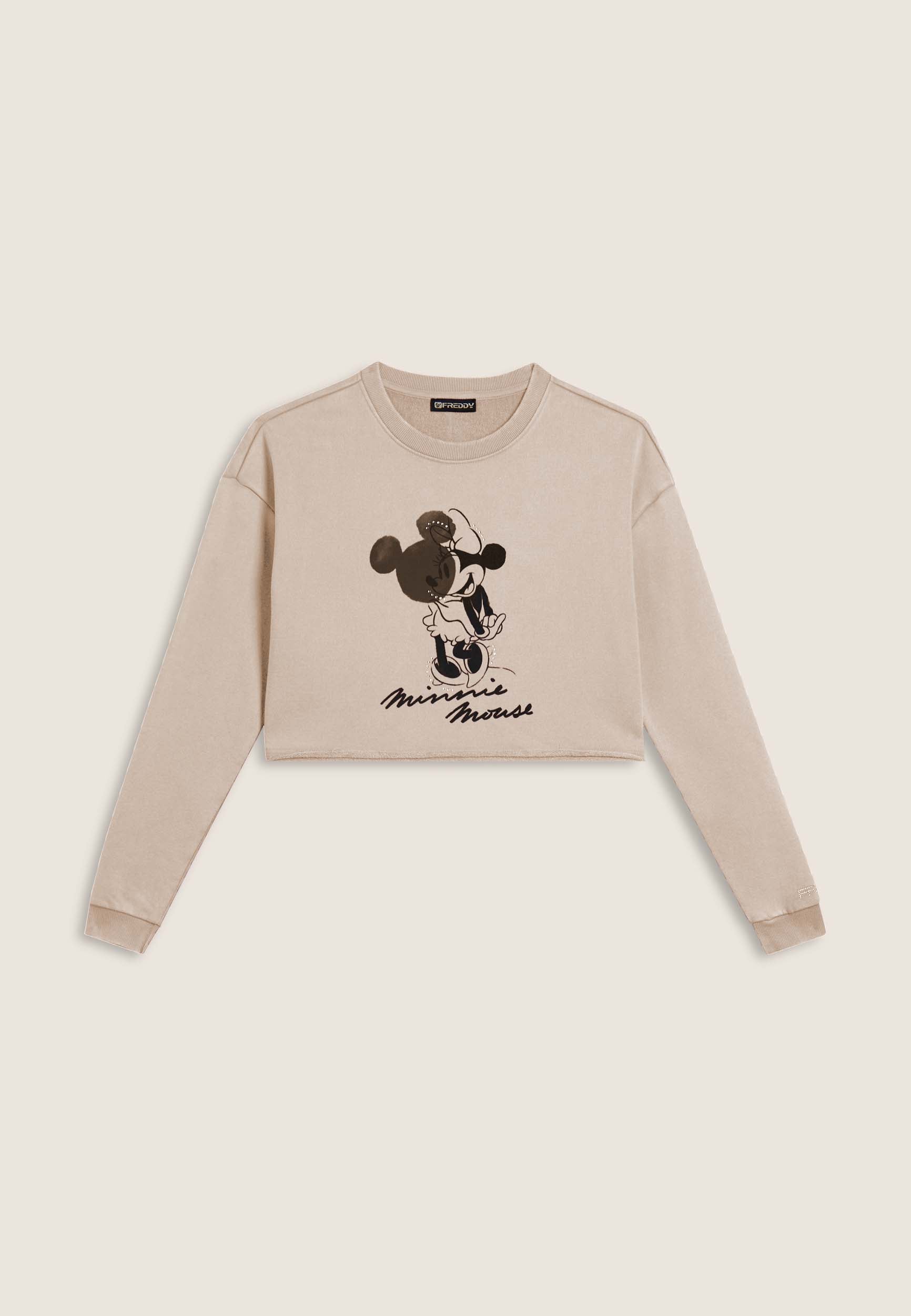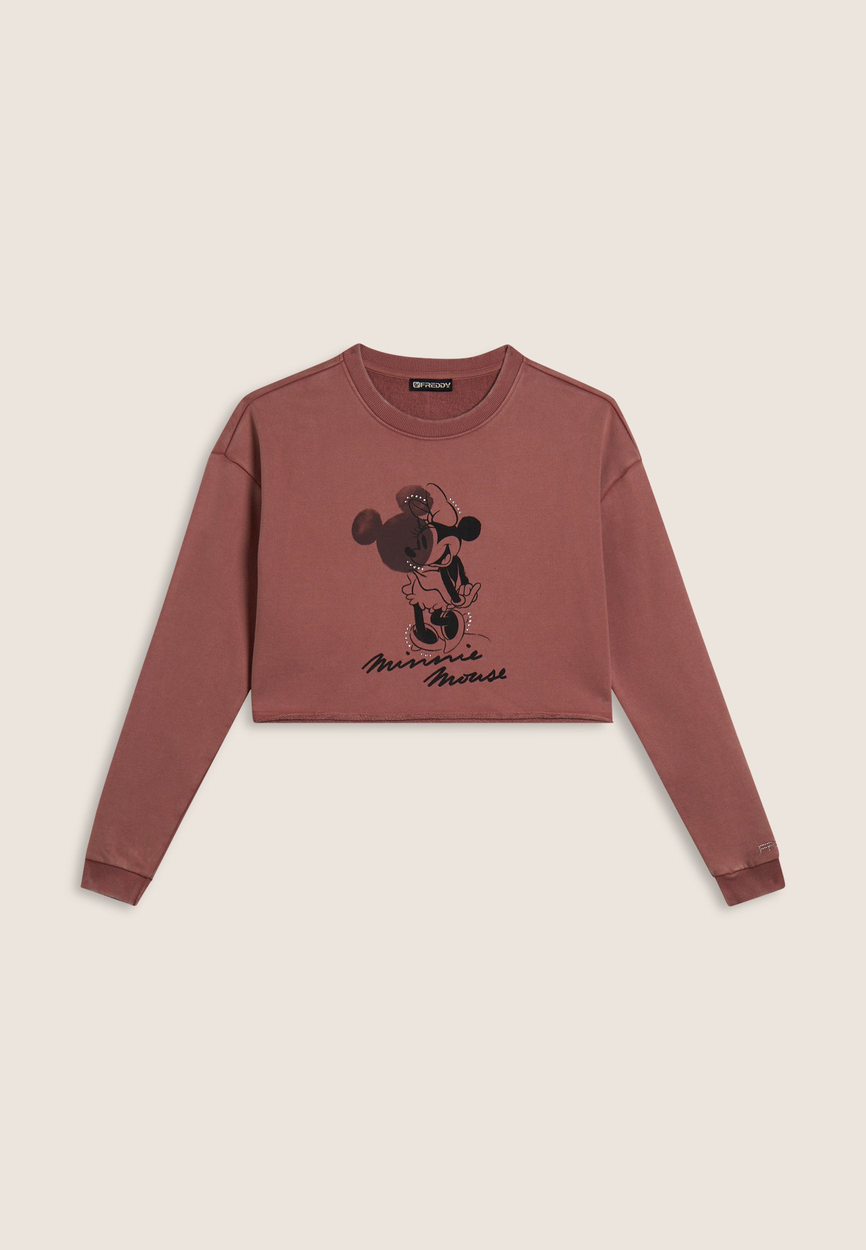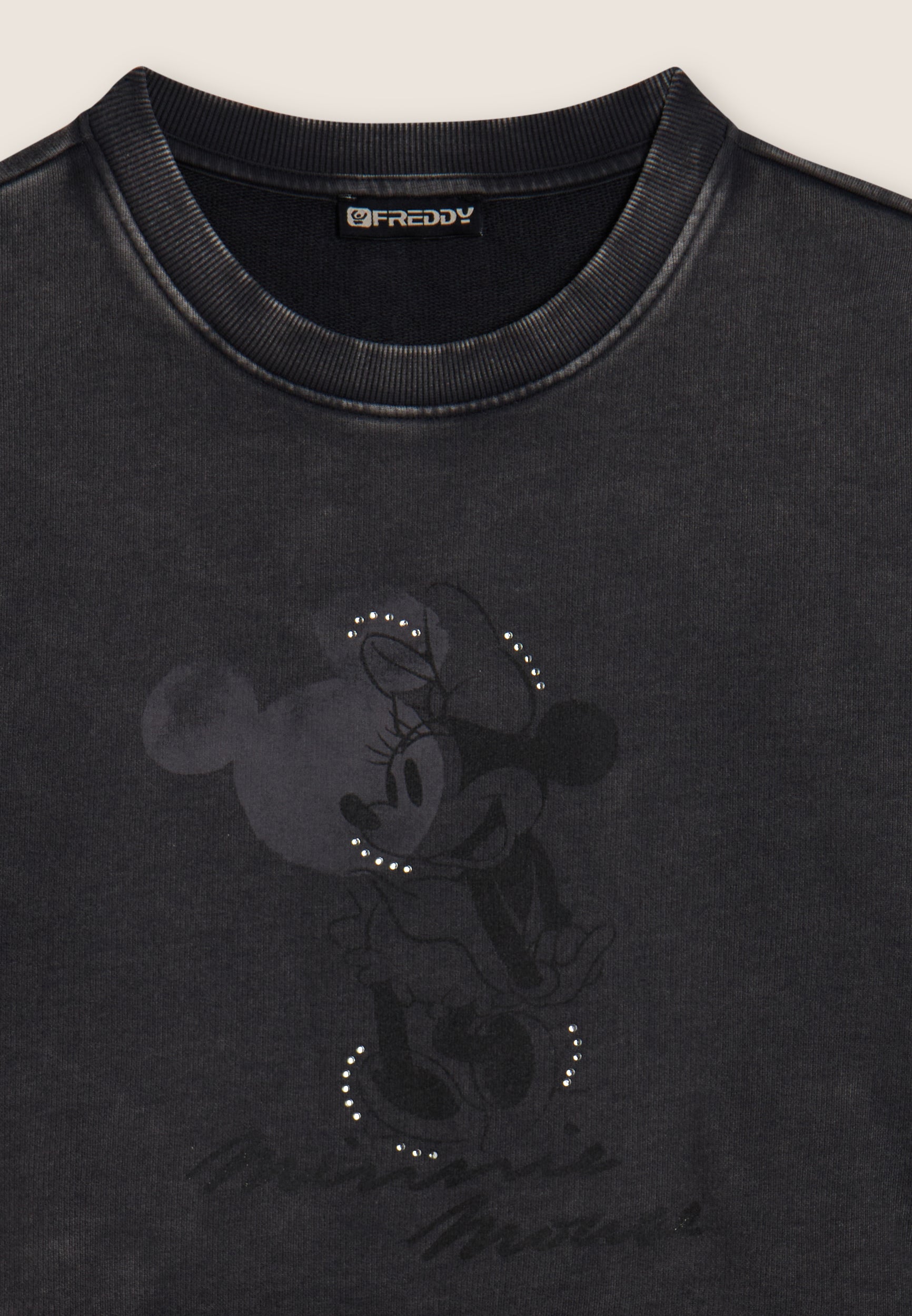 Felpa da donna in french terry con vestibilità comfort e lunghezza cropped. Il fondo dritto con rifiniture a taglio vivo conferisce un aspetto grintoso, mentre lo scollo girocollo e le maniche lunghe con polsini in costina assicurano comfort. Sul fronte spicca una grande grafica con Minnie e Mickey Mouse decorata da strass, con piccolo logo Disney sul retro e logo FREDDY sul fondo manica. Il capo è realizzato con trattamento acid wash effect, che dona un effetto vissuto e sfumature di colore uniche.