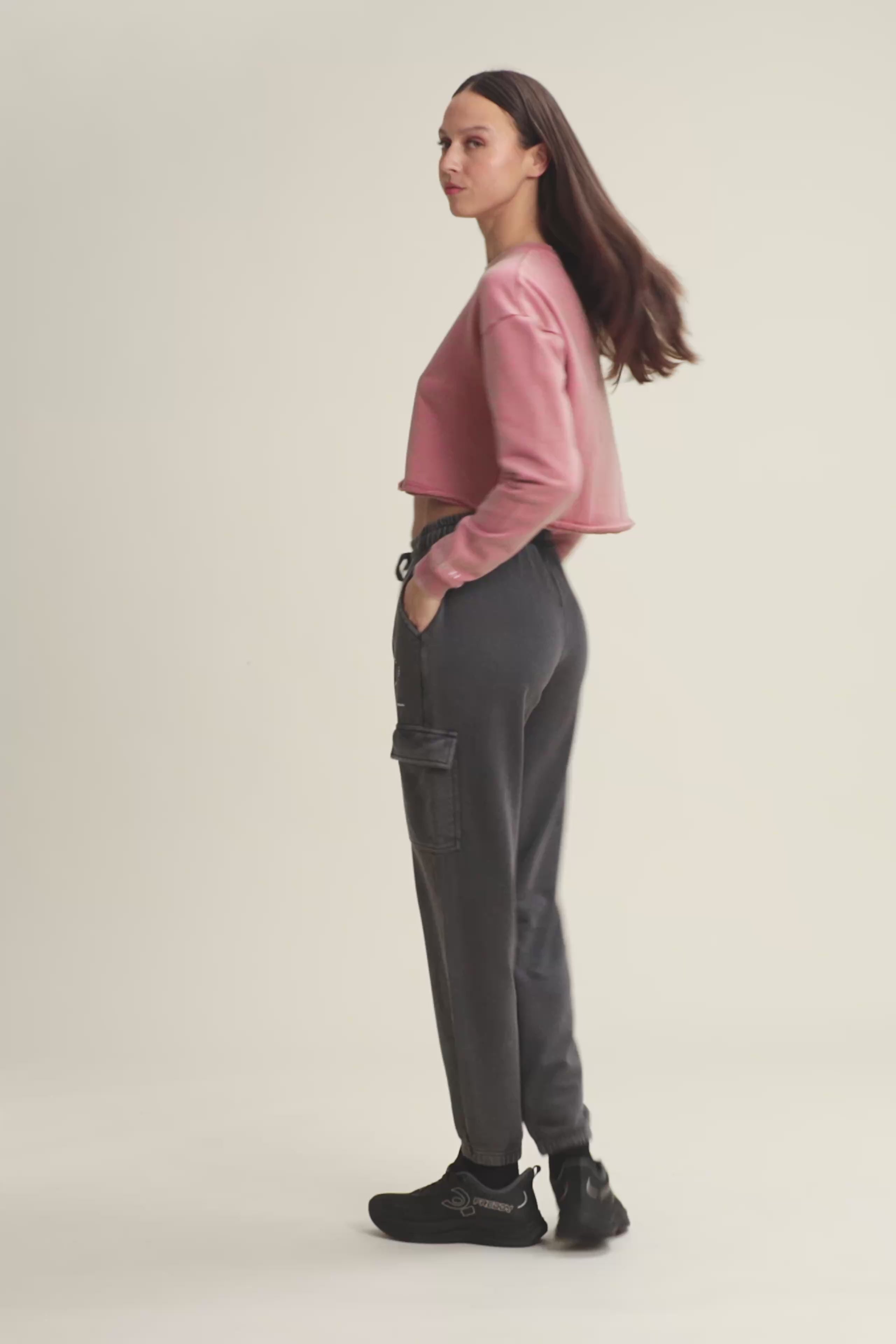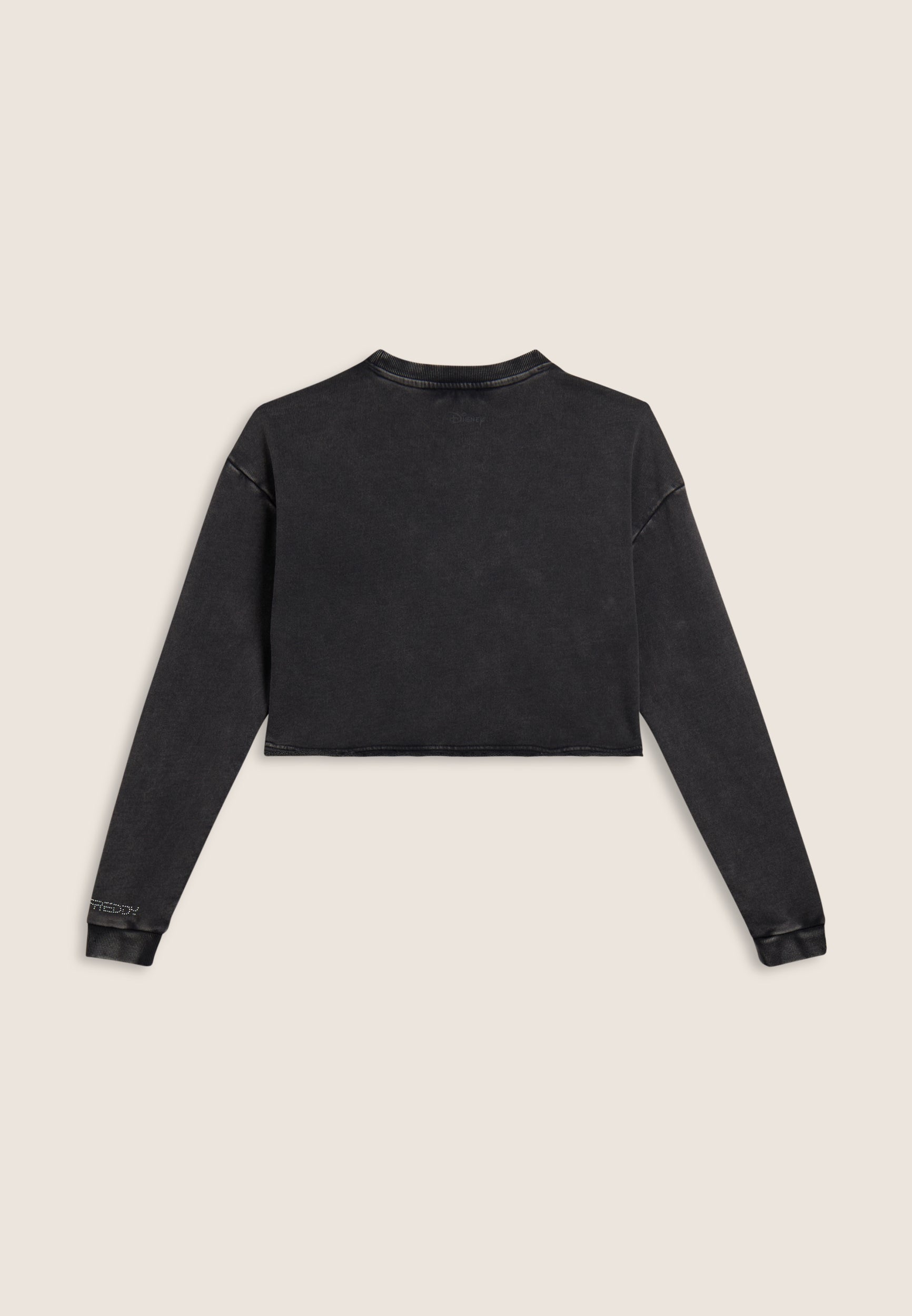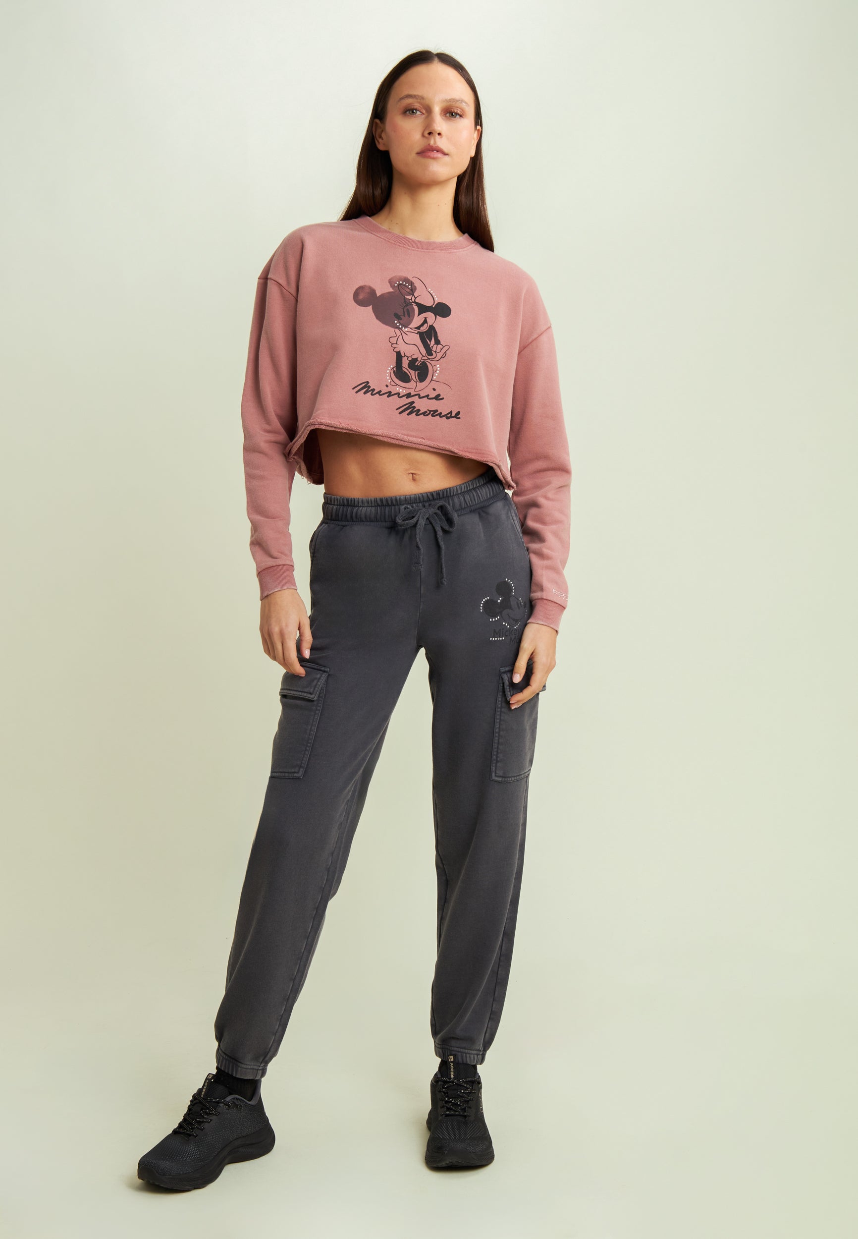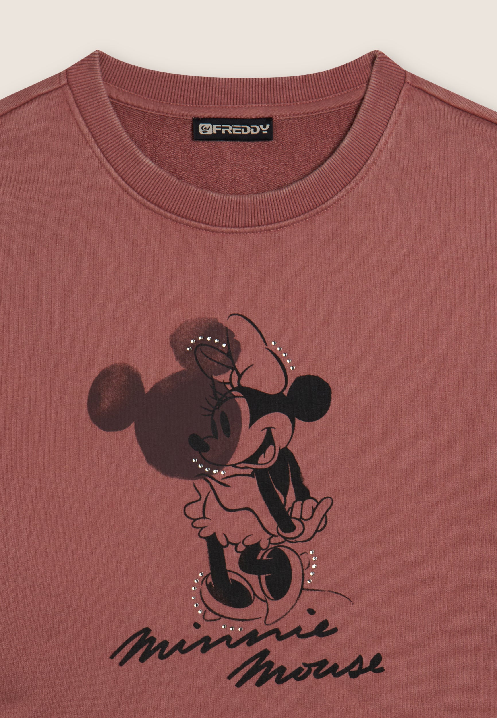 Felpa da donna in french terry con vestibilità comfort e lunghezza cropped. Il fondo dritto con rifiniture a taglio vivo conferisce un aspetto grintoso, mentre lo scollo girocollo e le maniche lunghe con polsini in costina assicurano comfort. Sul fronte spicca una grande grafica con Minnie e Mickey Mouse decorata da strass, con piccolo logo Disney sul retro e logo FREDDY sul fondo manica. Il capo è realizzato con trattamento acid wash effect, che dona un effetto vissuto e sfumature di colore uniche.