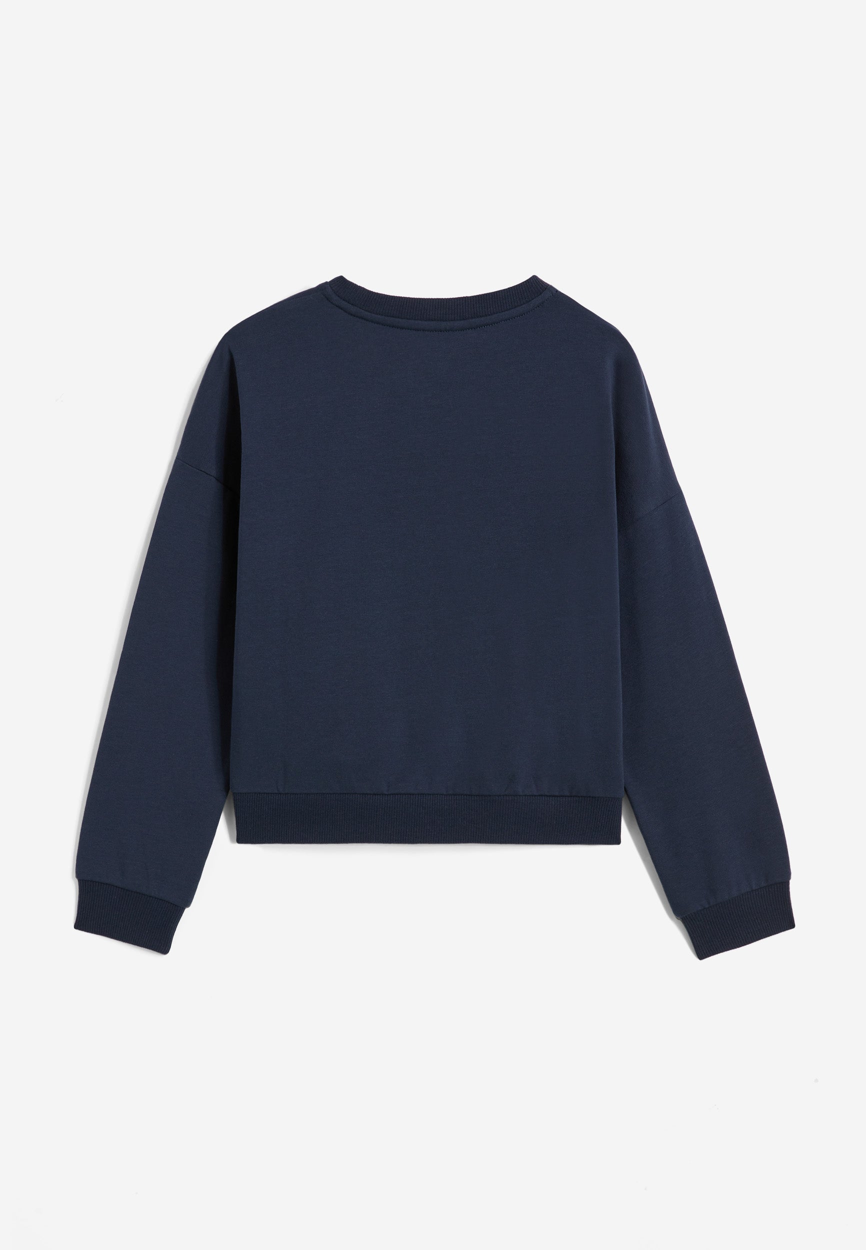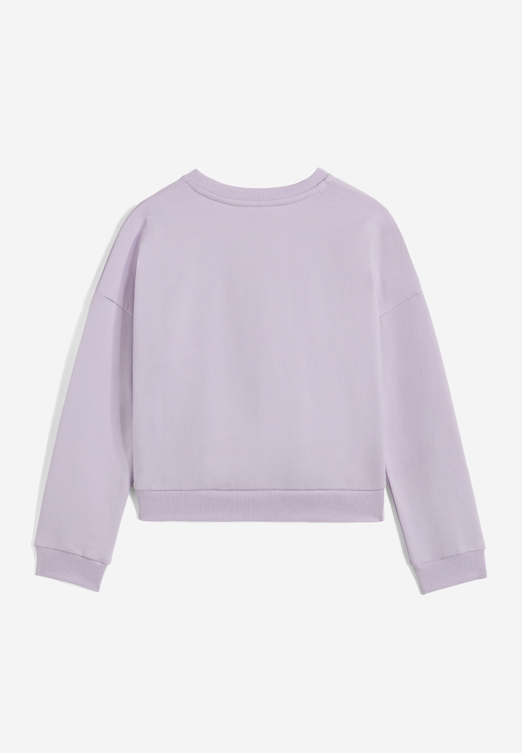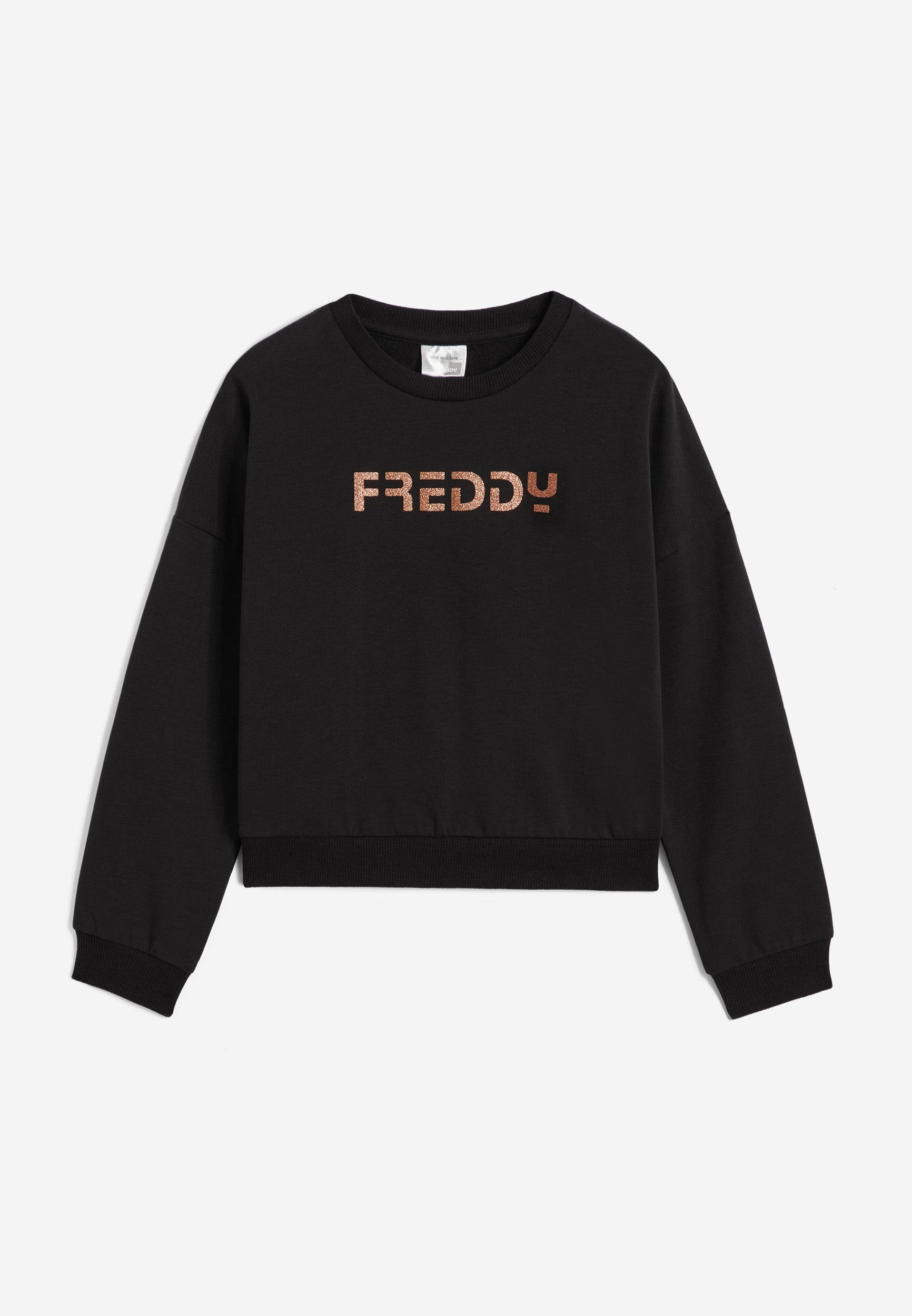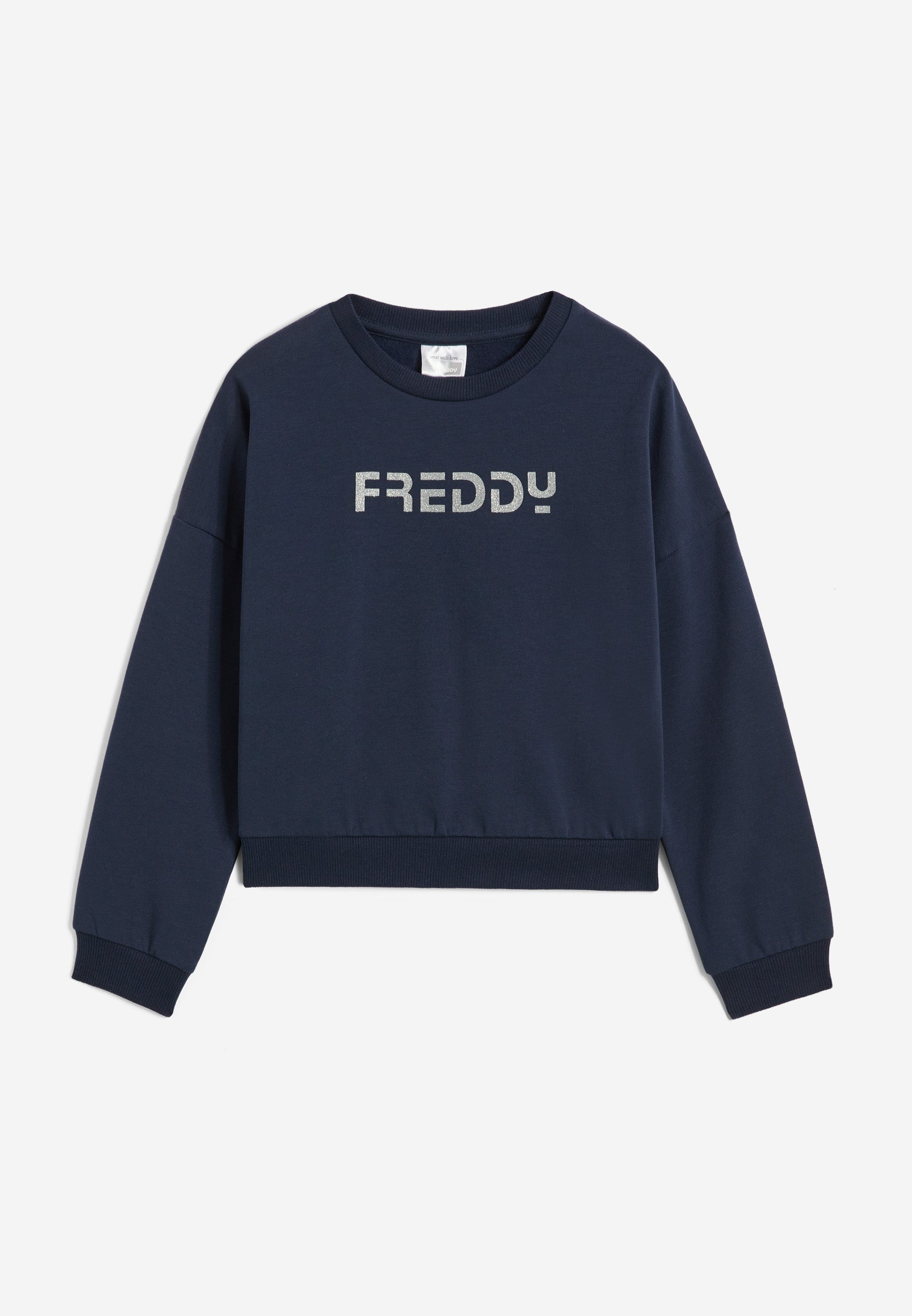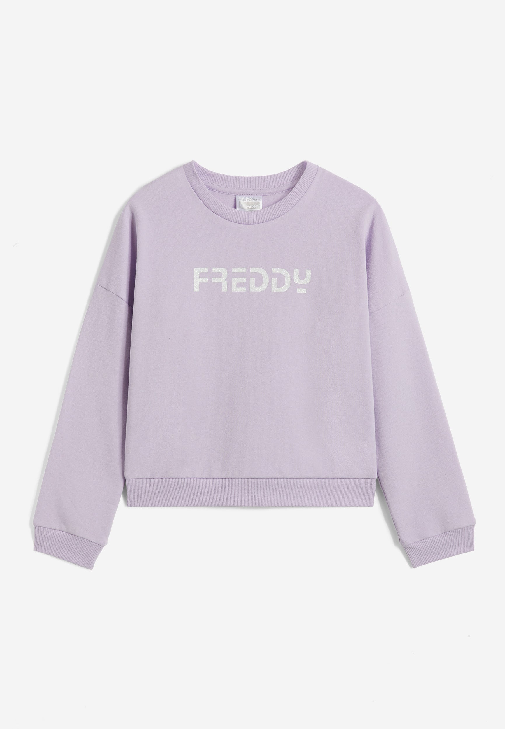 Felpa comfort fit da bambina e ragazza in cotone elasticizzato decorata sul fronte dal logo FREDDY stampato ad effetto glitter. Il modello ha scollo girocollo e maniche con spalla scesa, le finiture di scollo, polsini e fondo sono in costina.