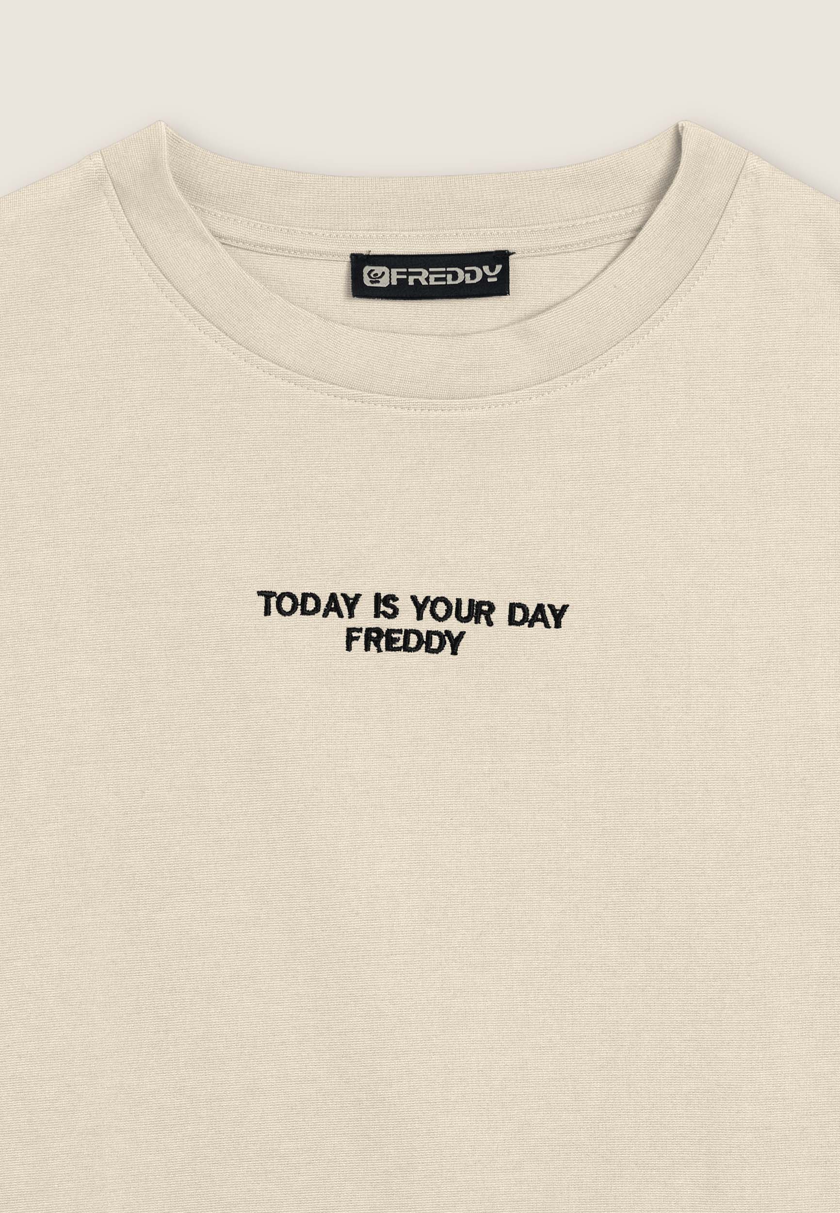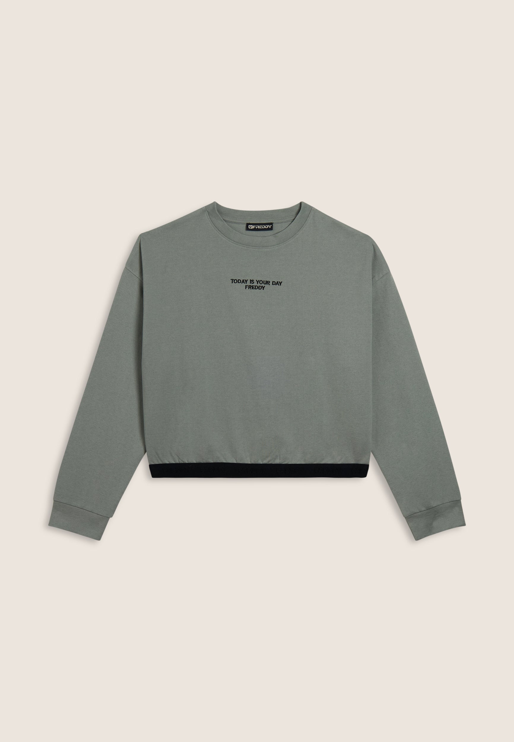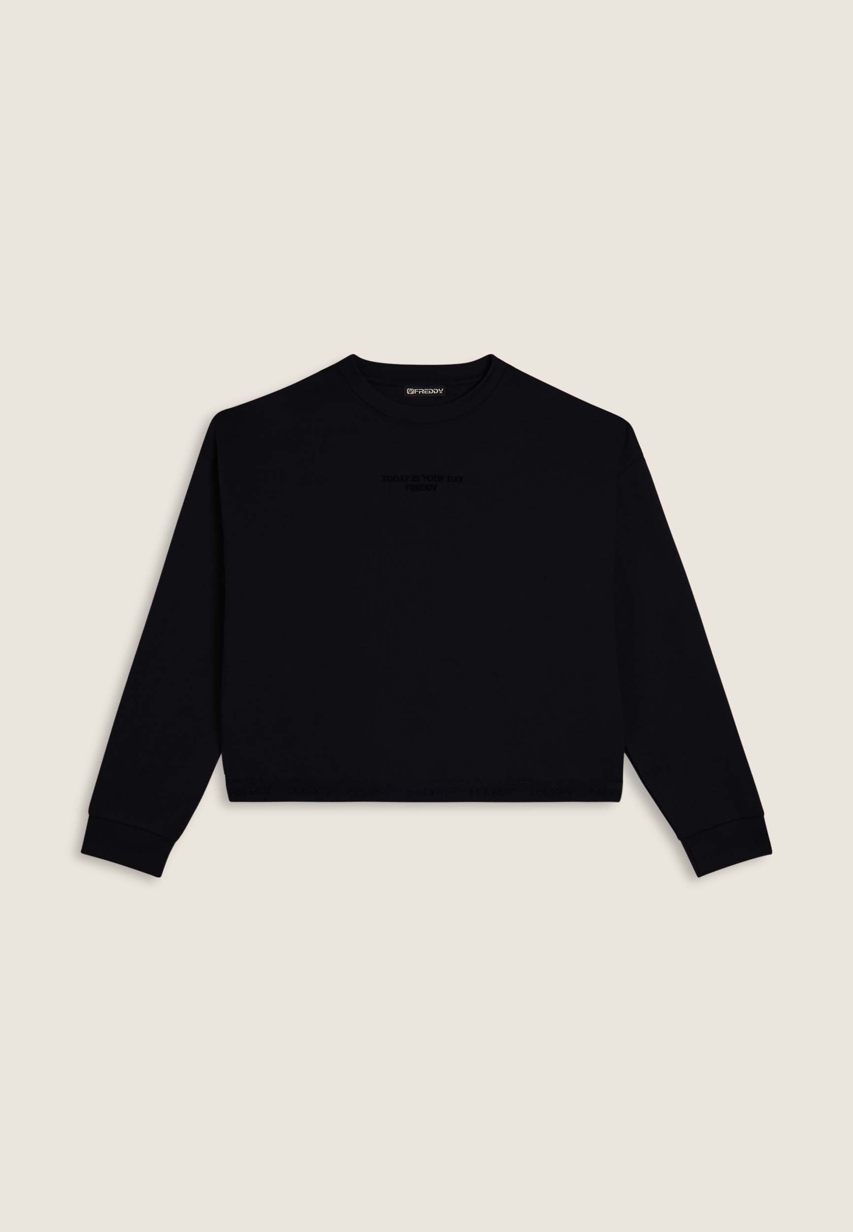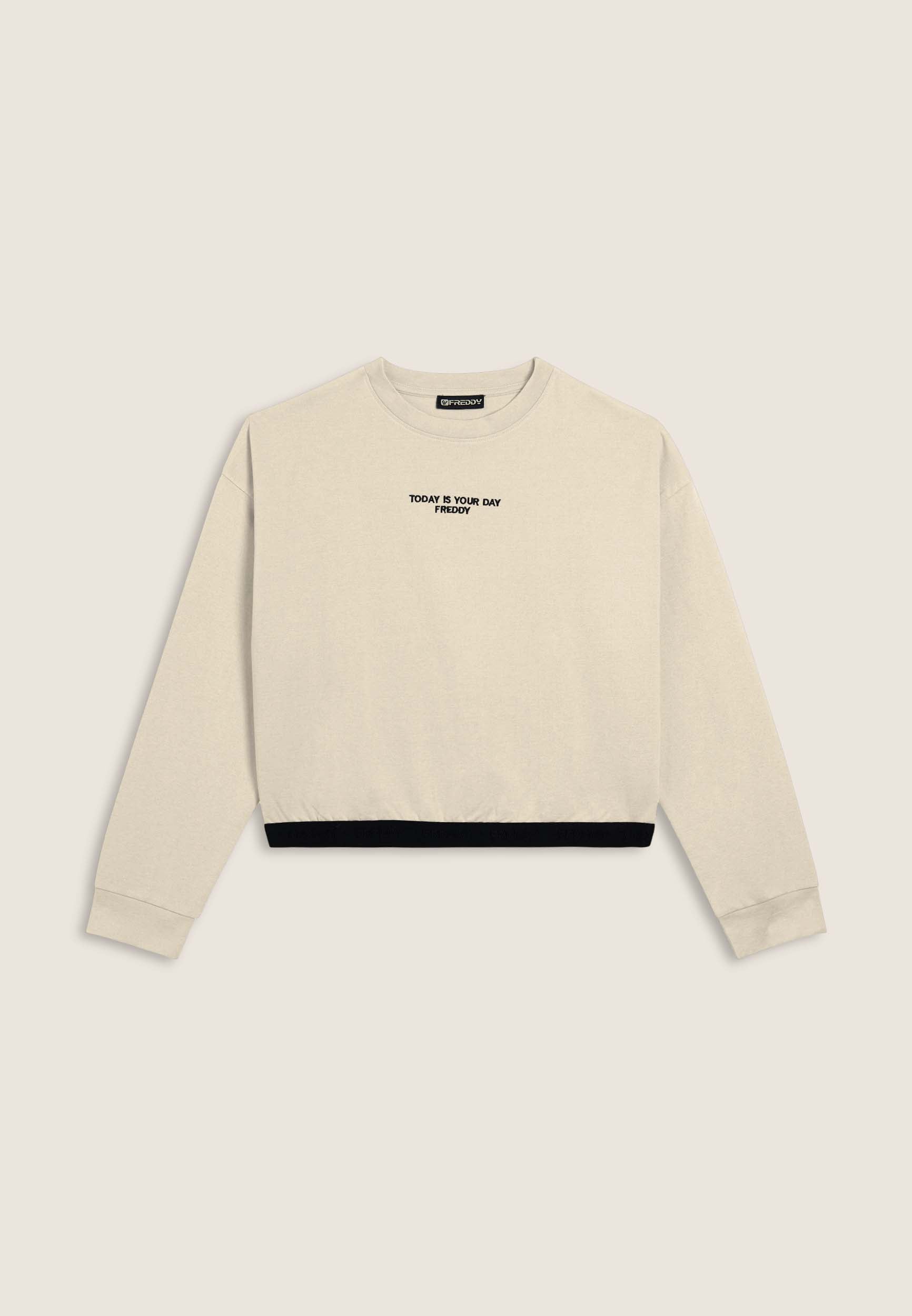 Felpa da donna in felpa garzata elasticizzata, vestibilità comfort e fondo con fascia jacquard logata. Il ricamo “TODAY IS YOUR DAY” con logo FREDDY decora il centro del petto.