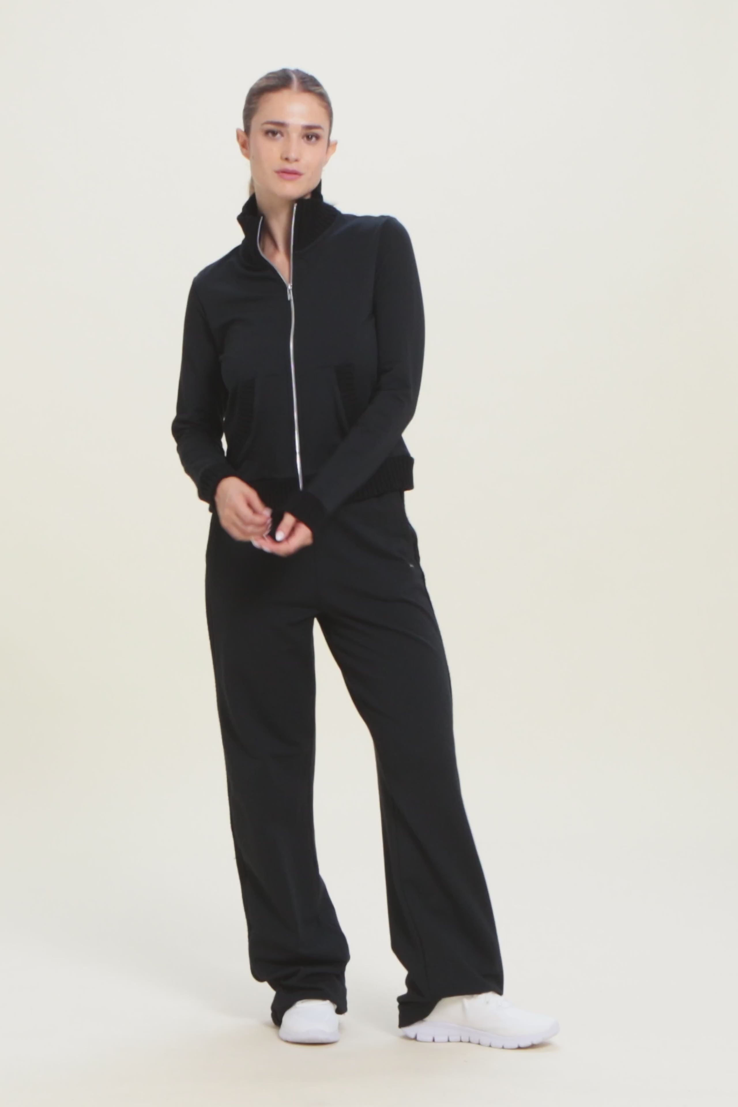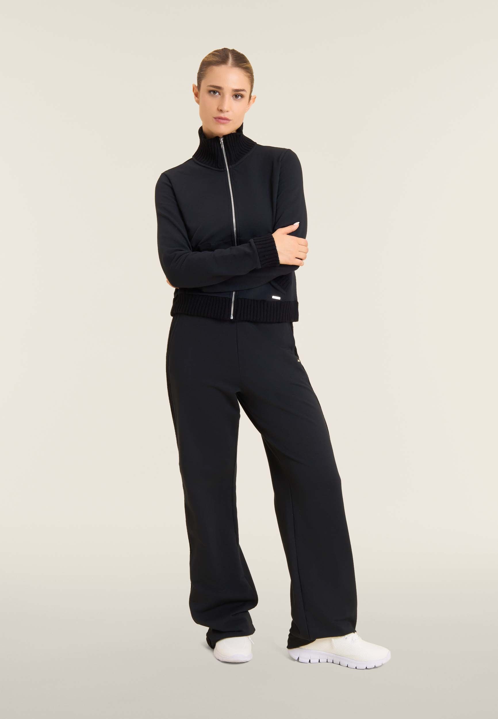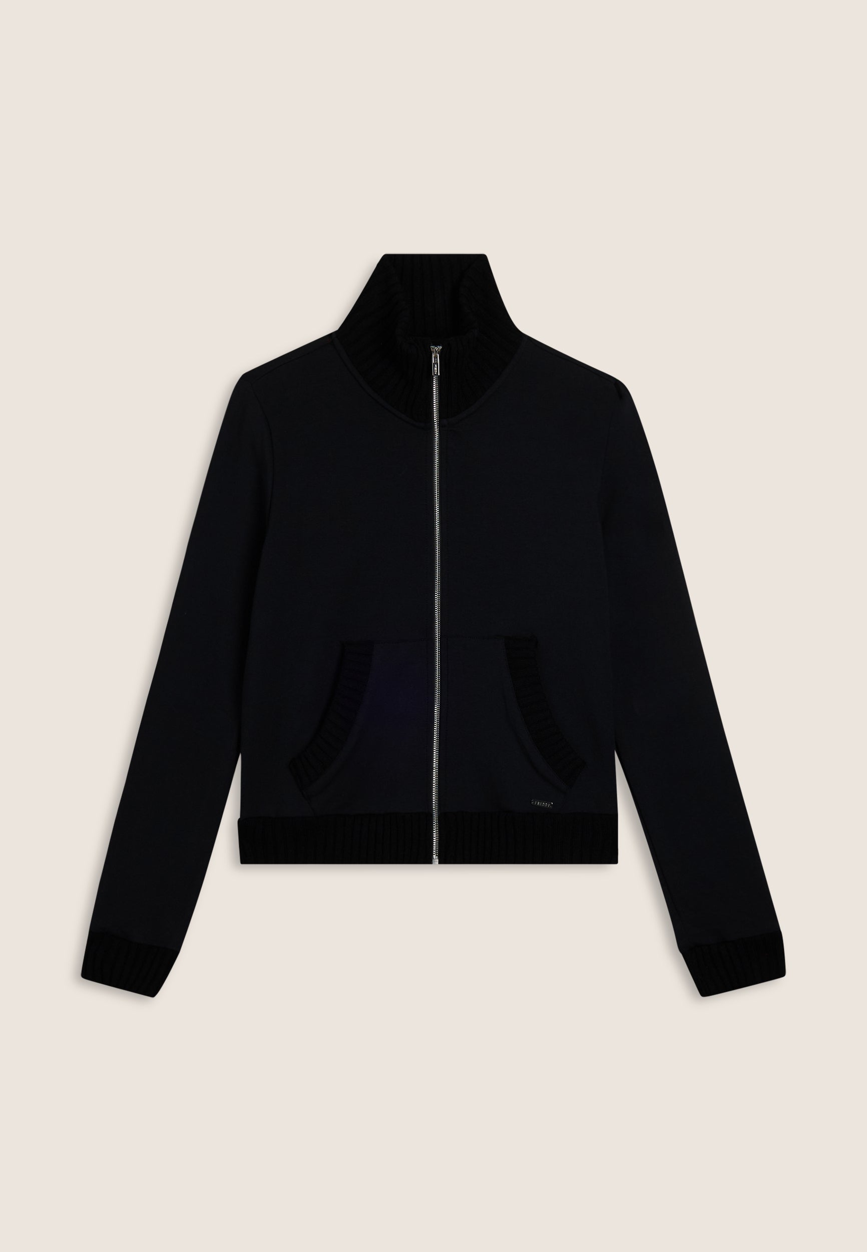 Felpa da donna in felpa modal garzata elasticizzata, morbida e calda, con zip frontale e collo alto in tessuto tricot a costine. Inserti in tessuto tricot impreziosiscono il fondo, i polsini e le aperture delle tasche a marsupio. Completata dalla placchetta con logo FREDDY.