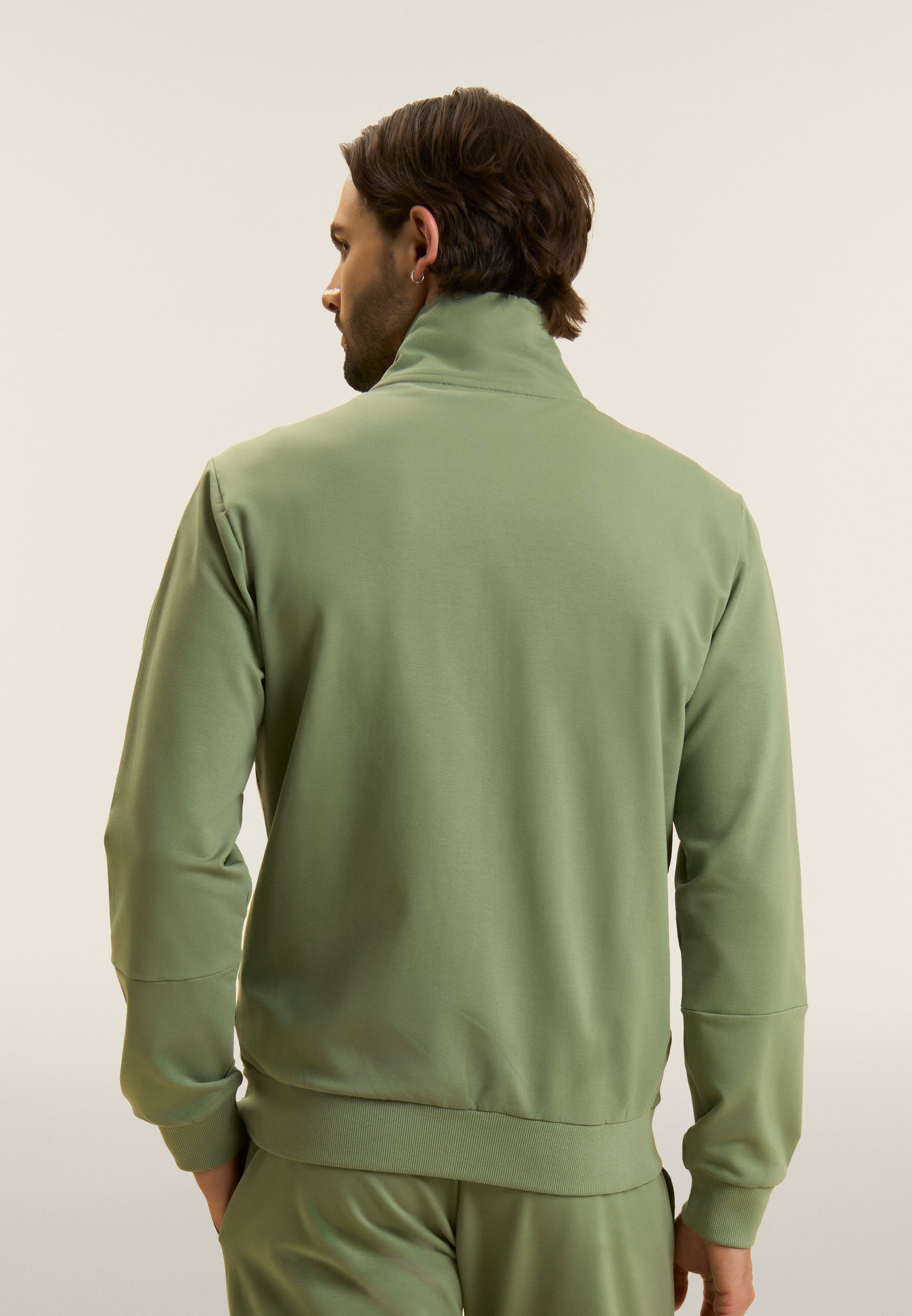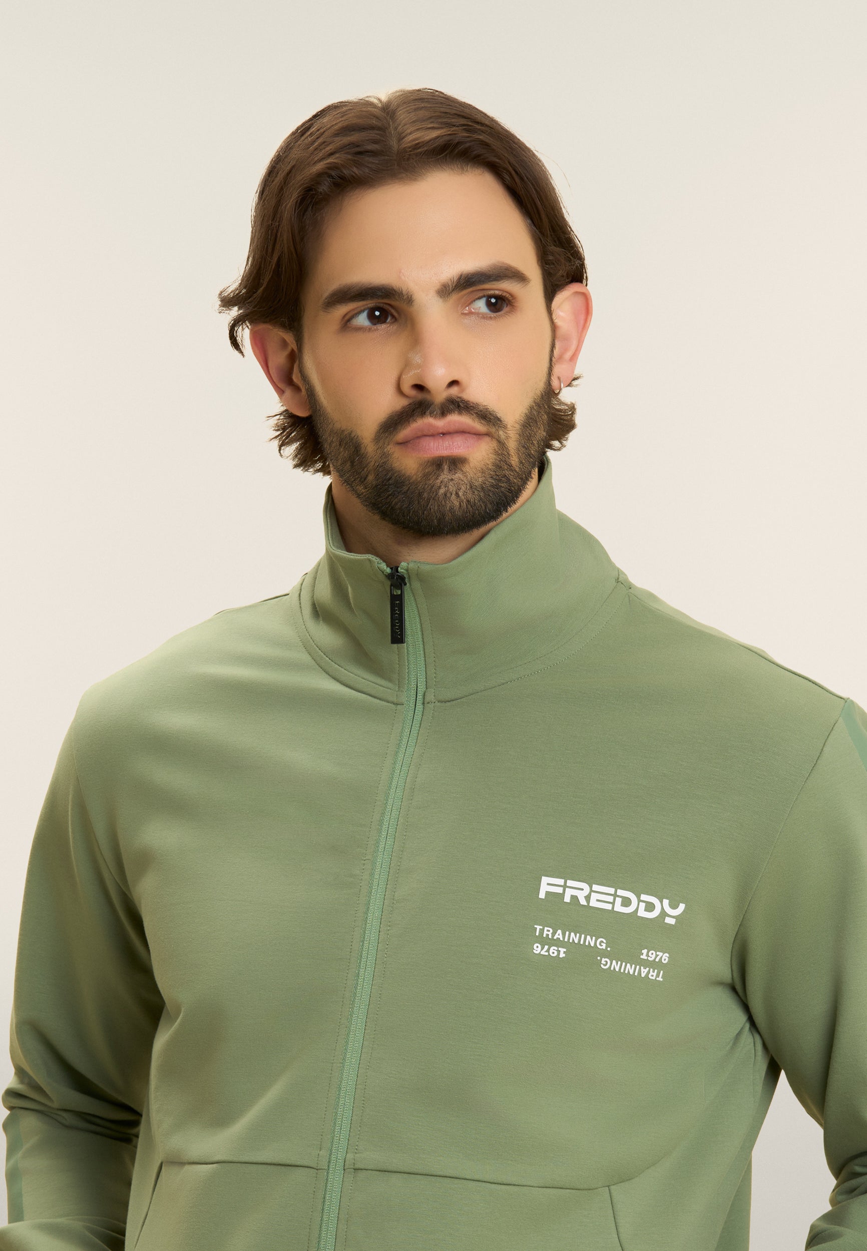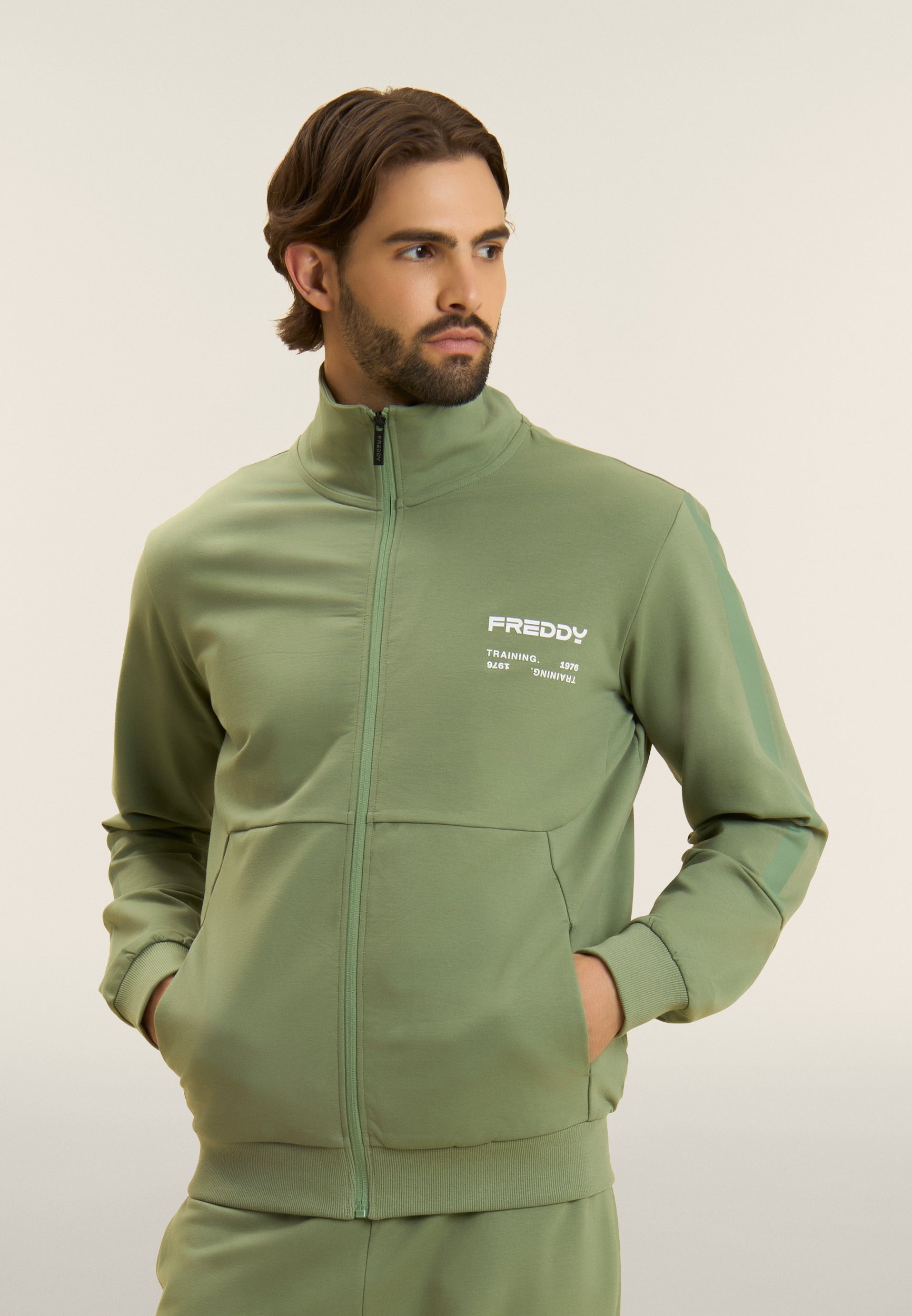 Felpa da uomo con chiusura full-zip, dal taglio regular e lunghezza regolare. Il design sportivo è arricchito da un collo alto, maniche lunghe con cuciture a blocchi e polsini in costina per una vestibilità confortevole. La fascia in costina sul fondo mantiene la forma del capo anche con l’uso quotidiano. Le bande laterali stampate tono su tono lungo le maniche e il logo effetto gommato stampato sul cuore completano lo stile con dettagli curati. Le tasche anteriori interne aggiungono praticità. Realizzata in Baby French Terry, un tessuto in cotone morbido ed elastico, con superficie esterna liscia e interno leggermente spugnoso, perfetto per il comfort durante l’attività e nel tempo libero.