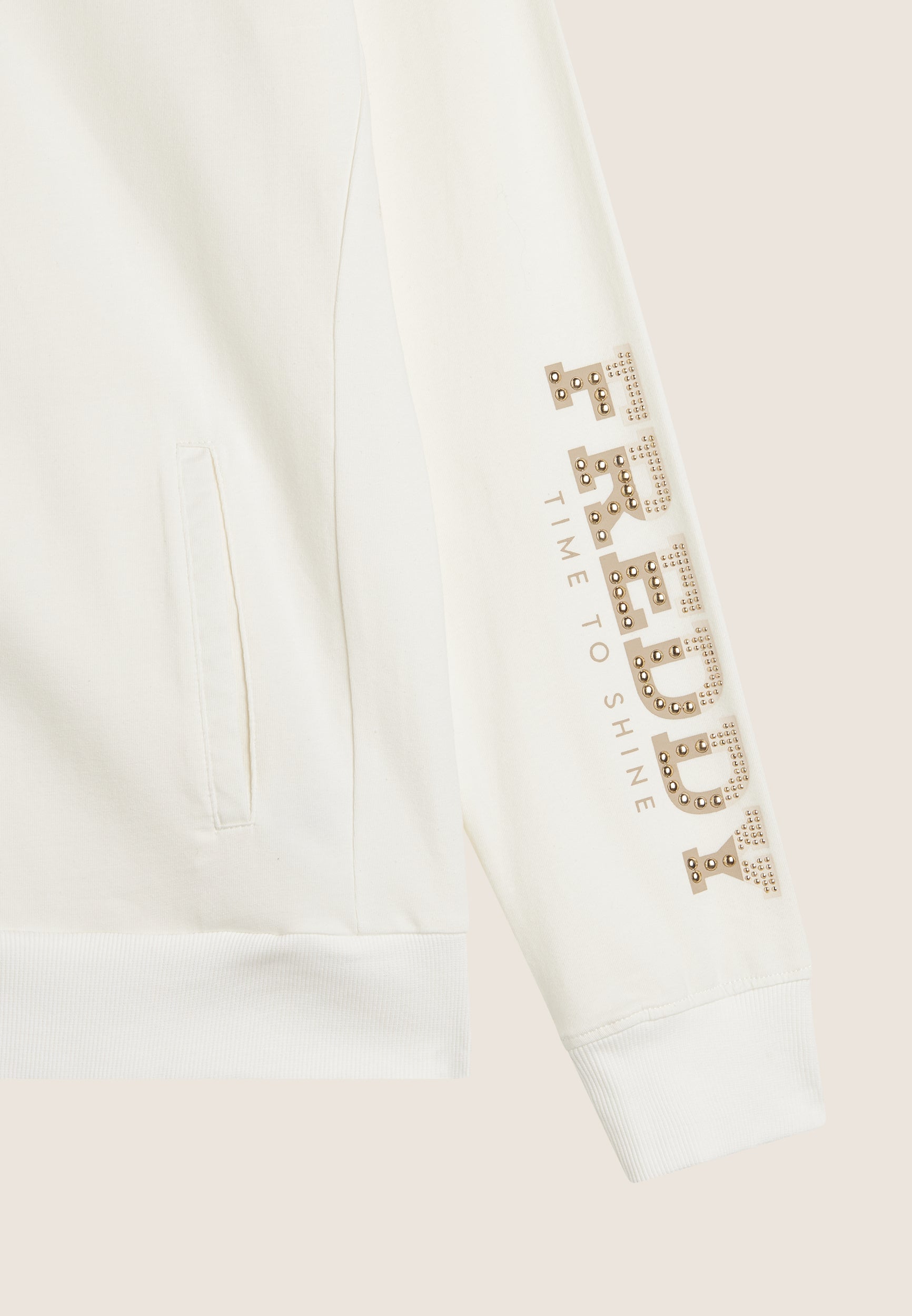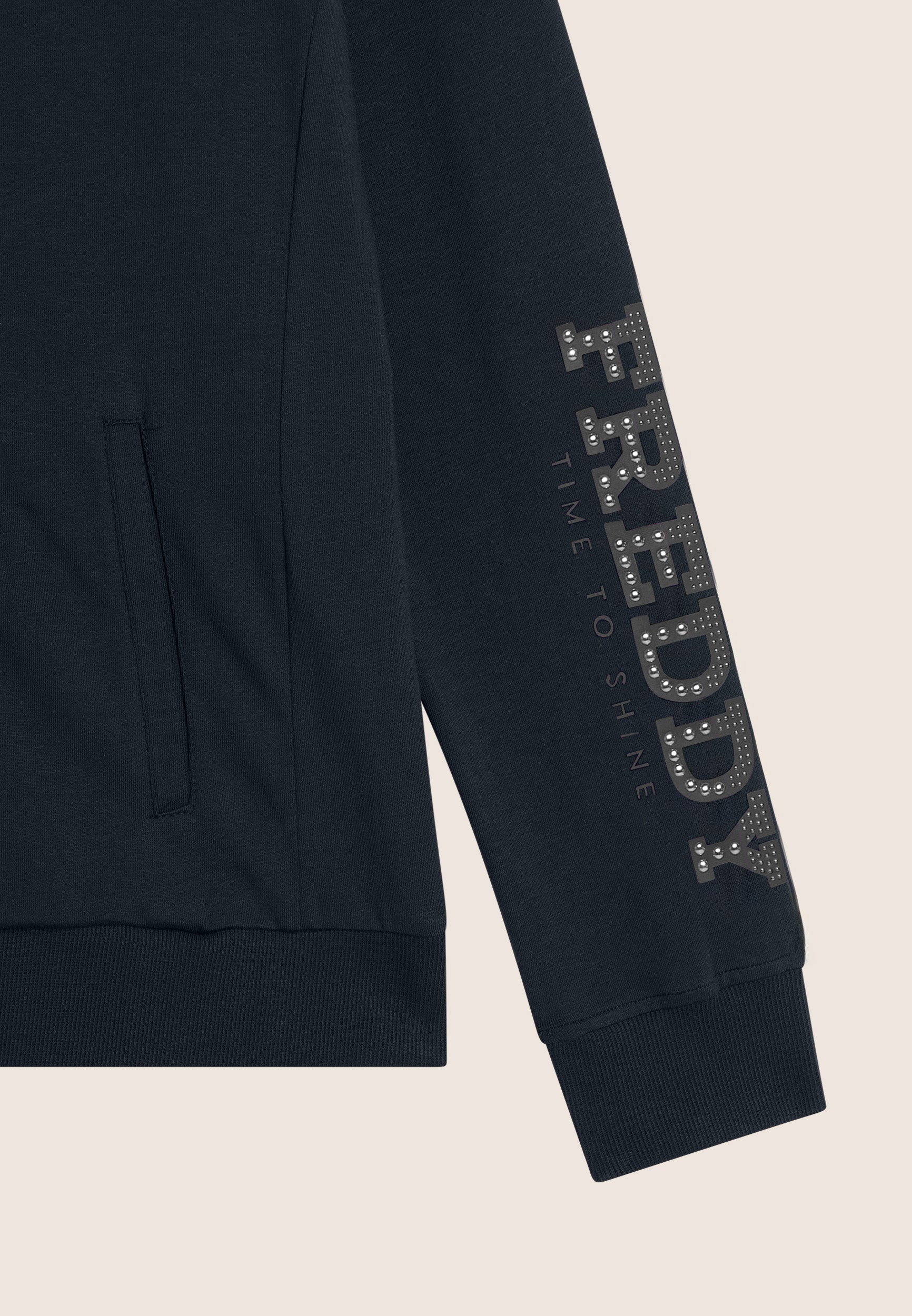 Felpa in Heavy Jersey Stretch con chiusura a zip, collo alto e fascia sul fondo. Le maniche lunghe con polsini in costina e la grafica con logo FREDDY decorata da perline dorate sul fondo della manica sinistra aggiungono un tocco raffinato a un capo versatile.