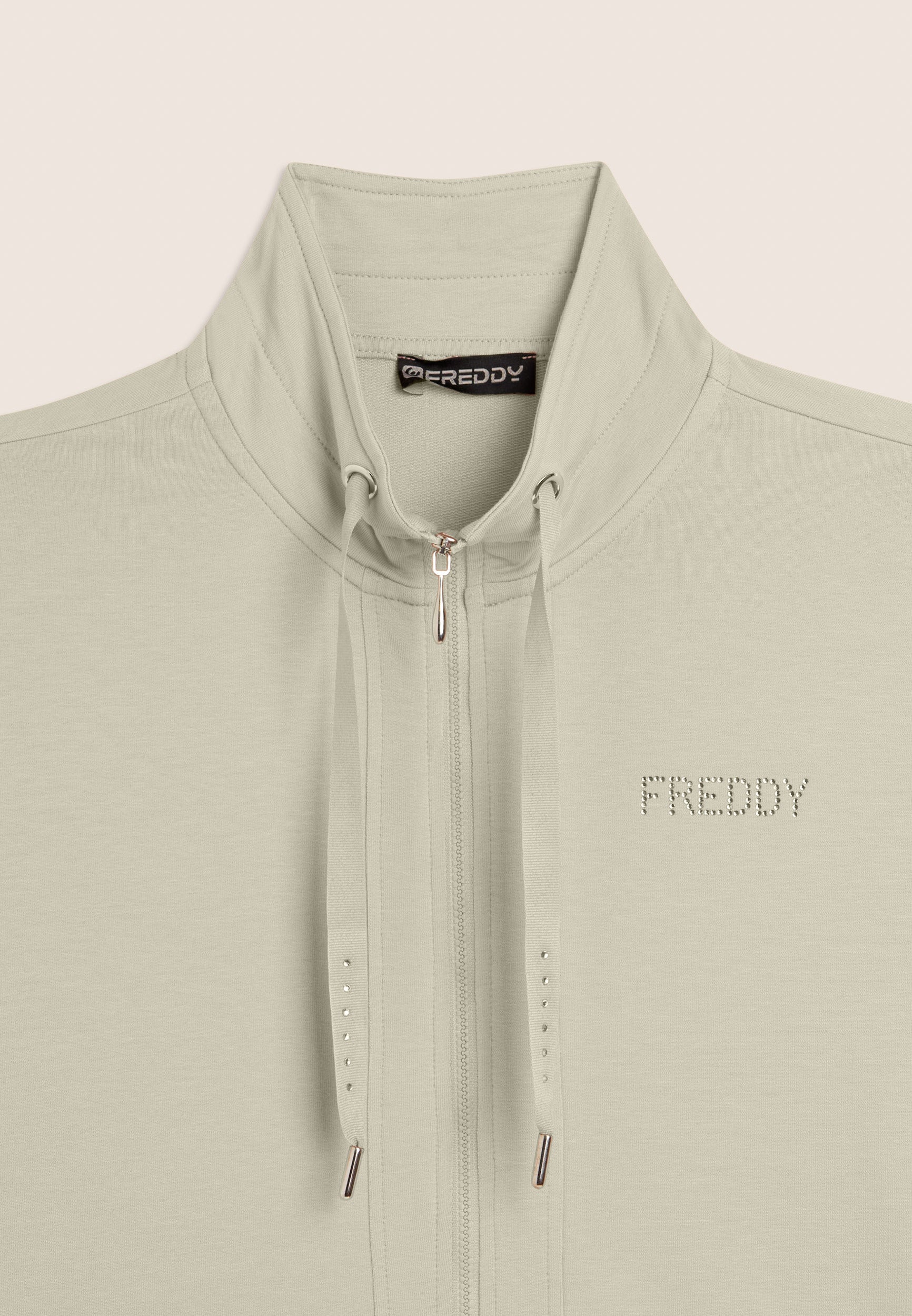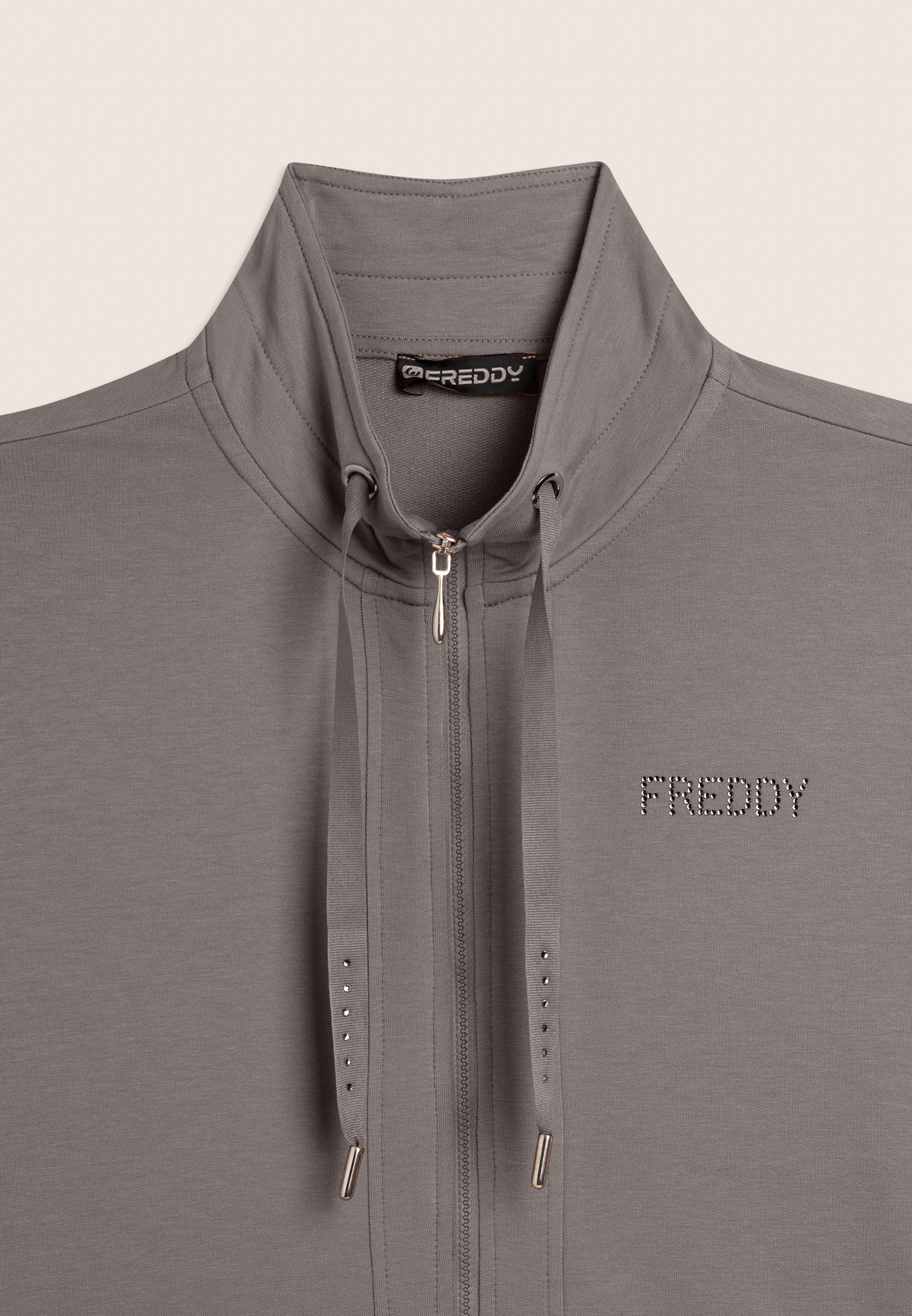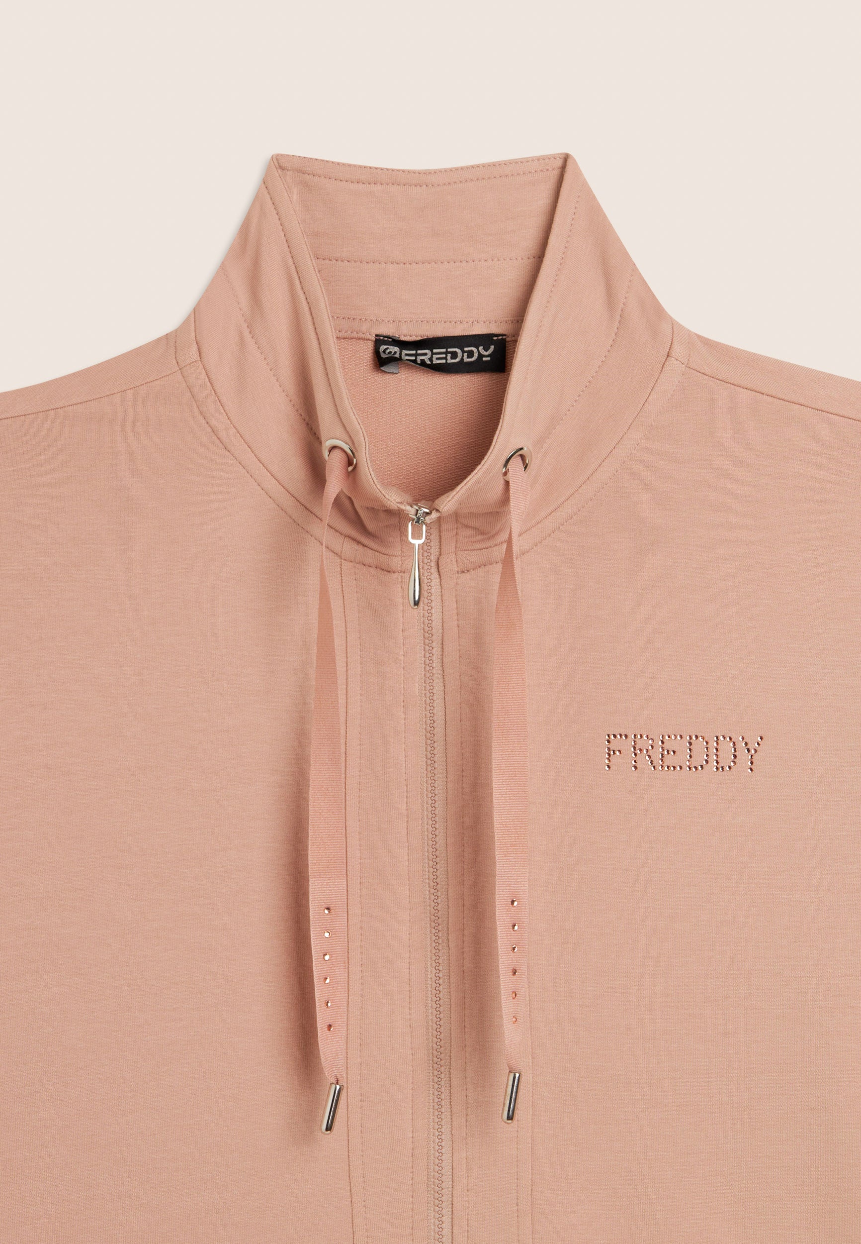 Felpa zip con vestibilità e lunghezza regular, caratterizzata dalla chiusura con zip e dal fondo con spacchi laterali. Il collo alto, dotato di coulisse, e le maniche lunghe con polsini in costina aggiungono dettagli pratici e stilosi. Il logo FREDDY sul cuore è realizzato con strass in tono colore, conferendo luminosità al capo. Tasche interne per una maggiore funzionalità. Il tessuto French Terry offre comfort, morbidezza e una vestibilità che si adatta perfettamente al corpo.