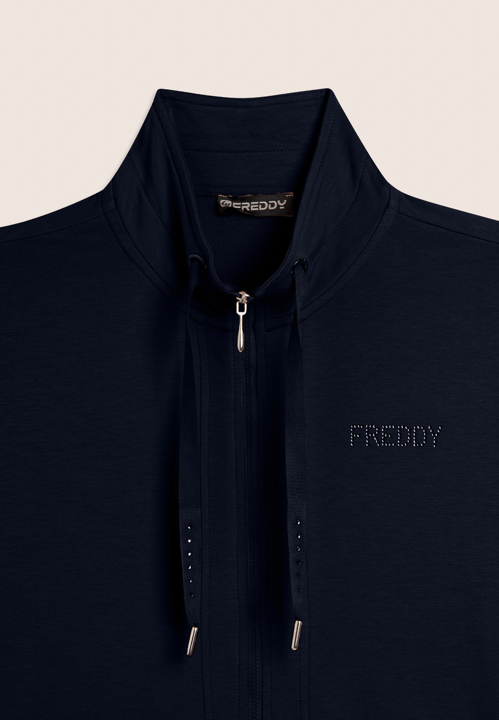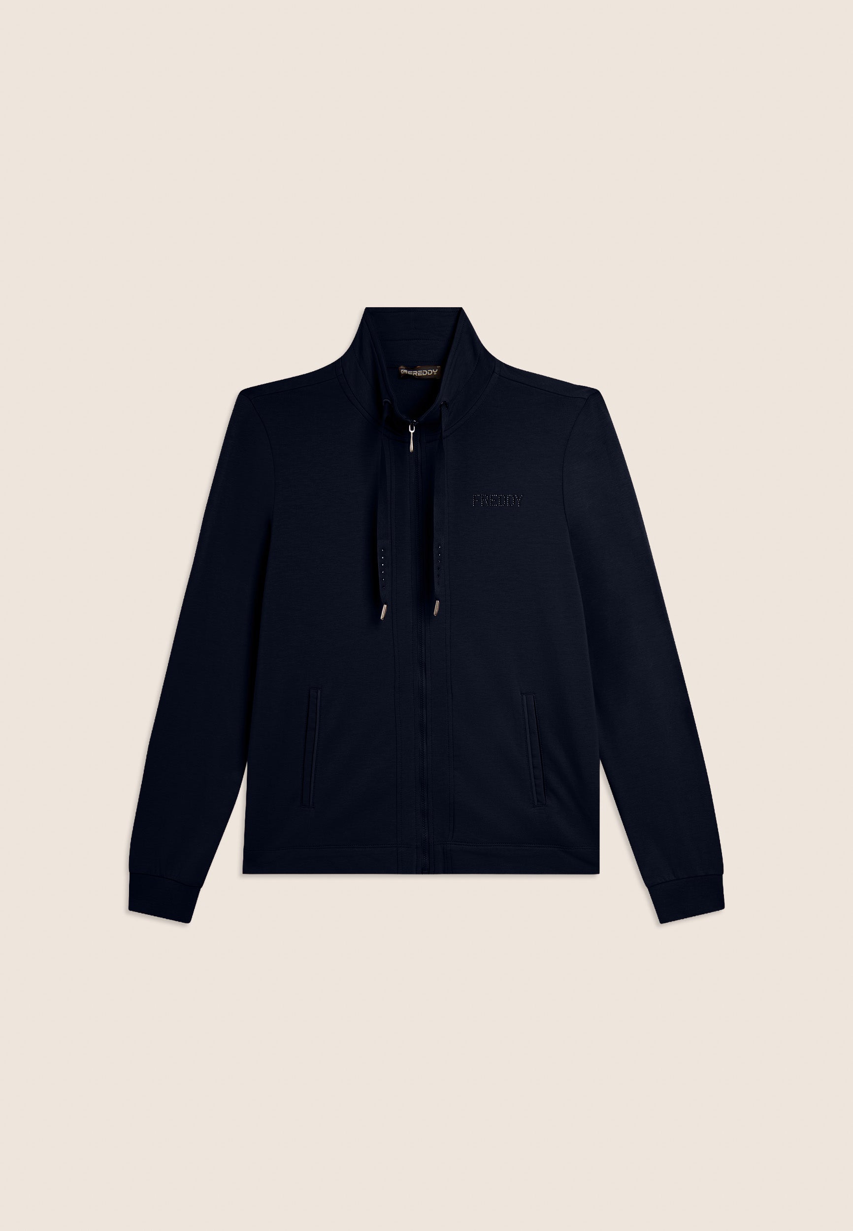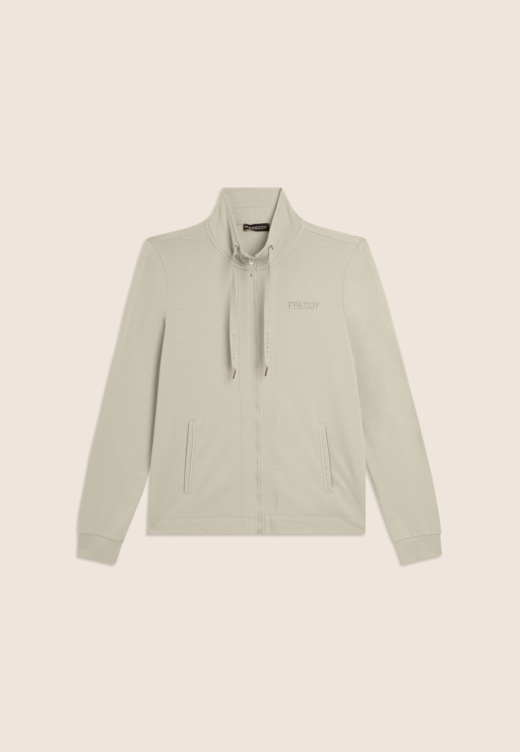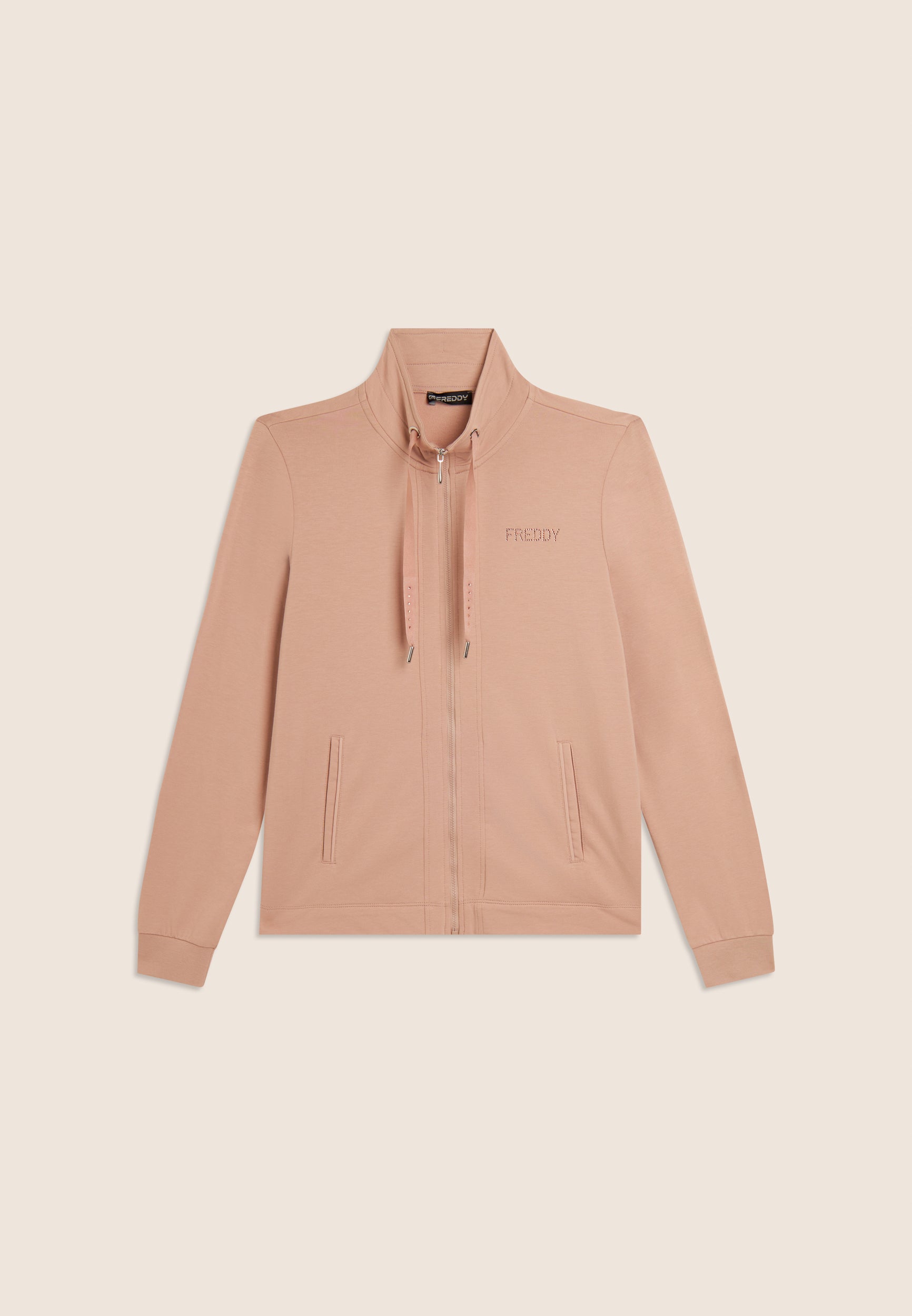 Felpa zip con vestibilità e lunghezza regular, caratterizzata dalla chiusura con zip e dal fondo con spacchi laterali. Il collo alto, dotato di coulisse, e le maniche lunghe con polsini in costina aggiungono dettagli pratici e stilosi. Il logo FREDDY sul cuore è realizzato con strass in tono colore, conferendo luminosità al capo. Tasche interne per una maggiore funzionalità. Il tessuto French Terry offre comfort, morbidezza e una vestibilità che si adatta perfettamente al corpo.
