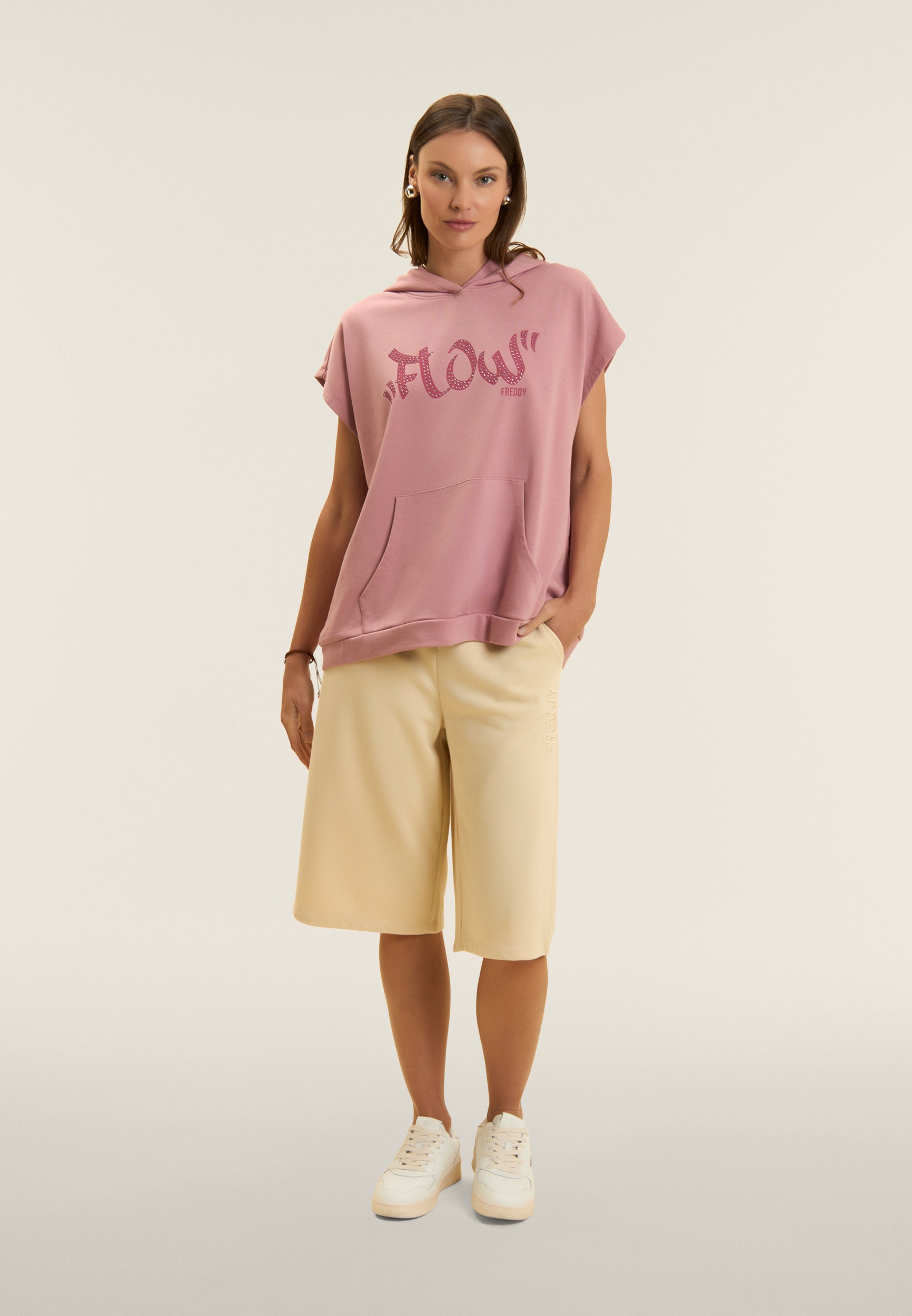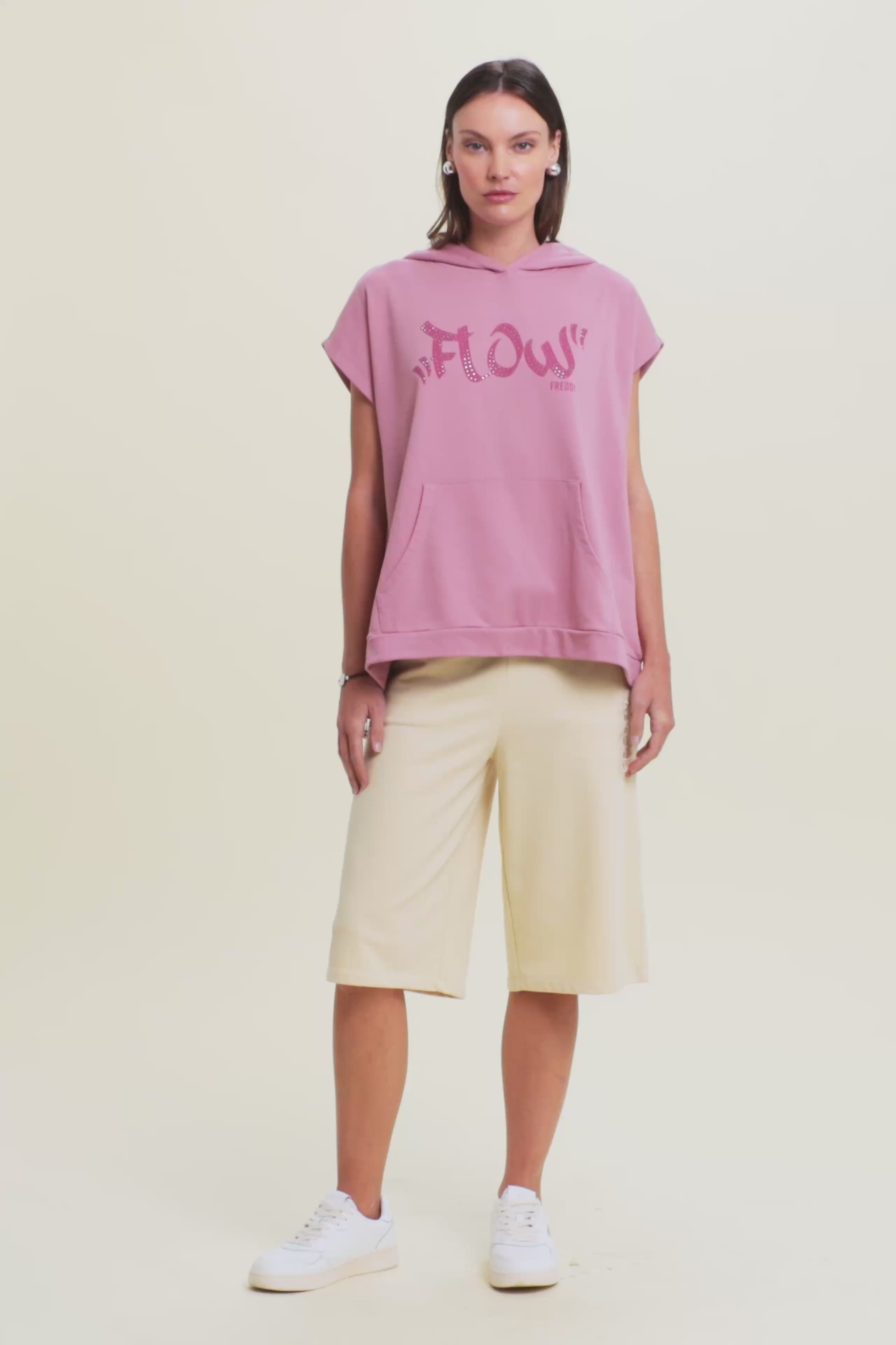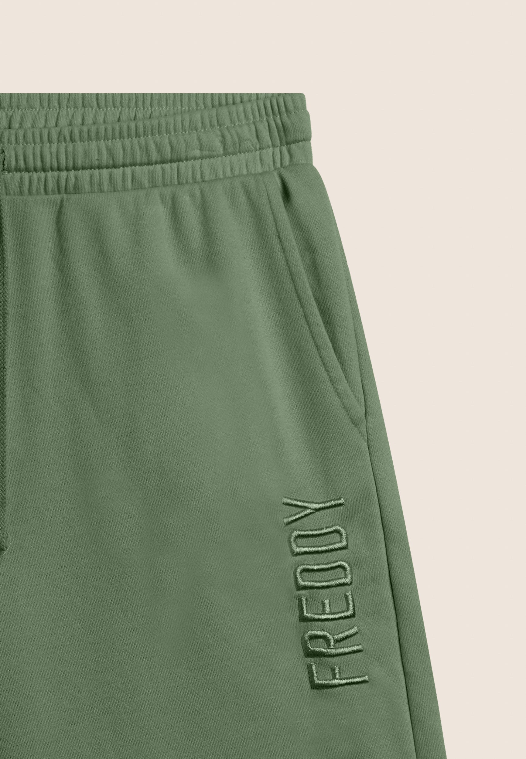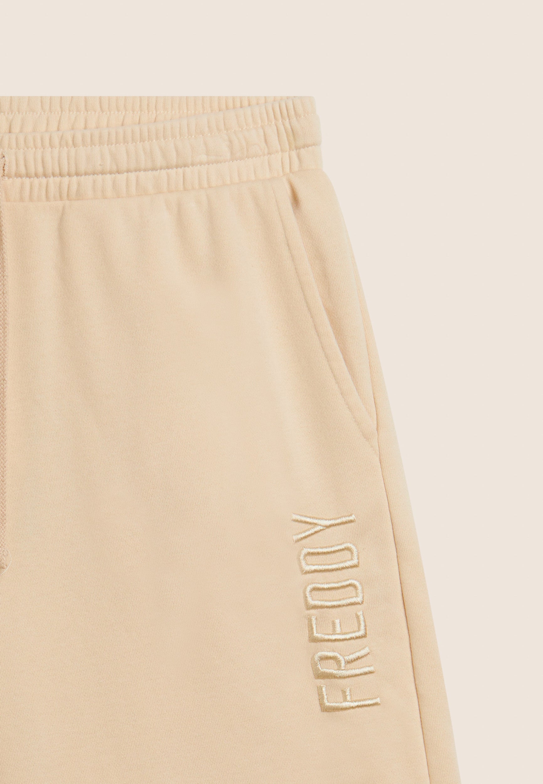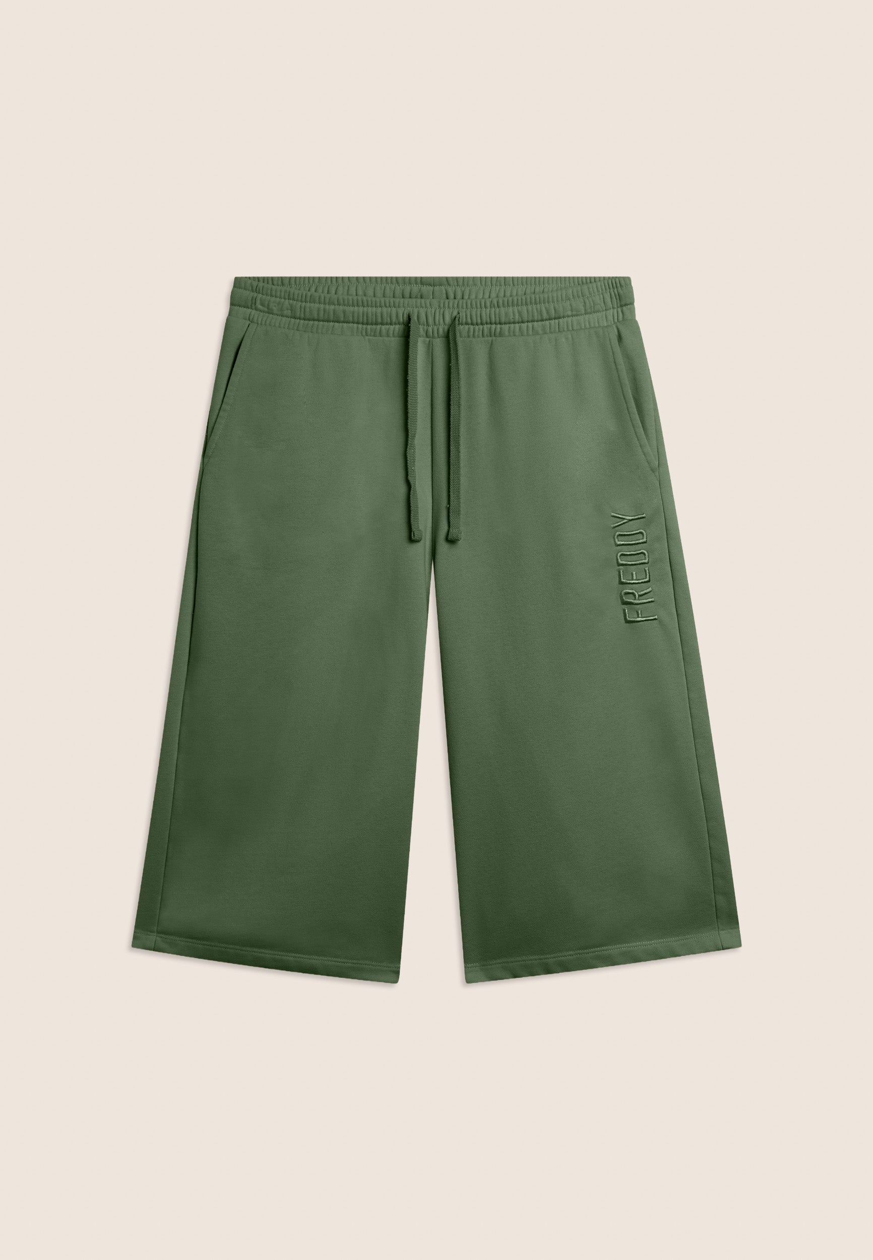 Bermuda in French Terry trattato con enzimi, caratterizzati da una vestibilità larga e lunghezza sotto al ginocchio con gamba wide leg. La vita regular con elastico interno e coulisse assicura una vestibilità perfetta, mentre il ricamo "FREDDY" sul fianco sinistro aggiunge un dettaglio distintivo. Morbidi e resistenti, questi pantaloni bermuda offrono un comfort ottimale, ideali per un look street e dinamico durante la stagione calda.