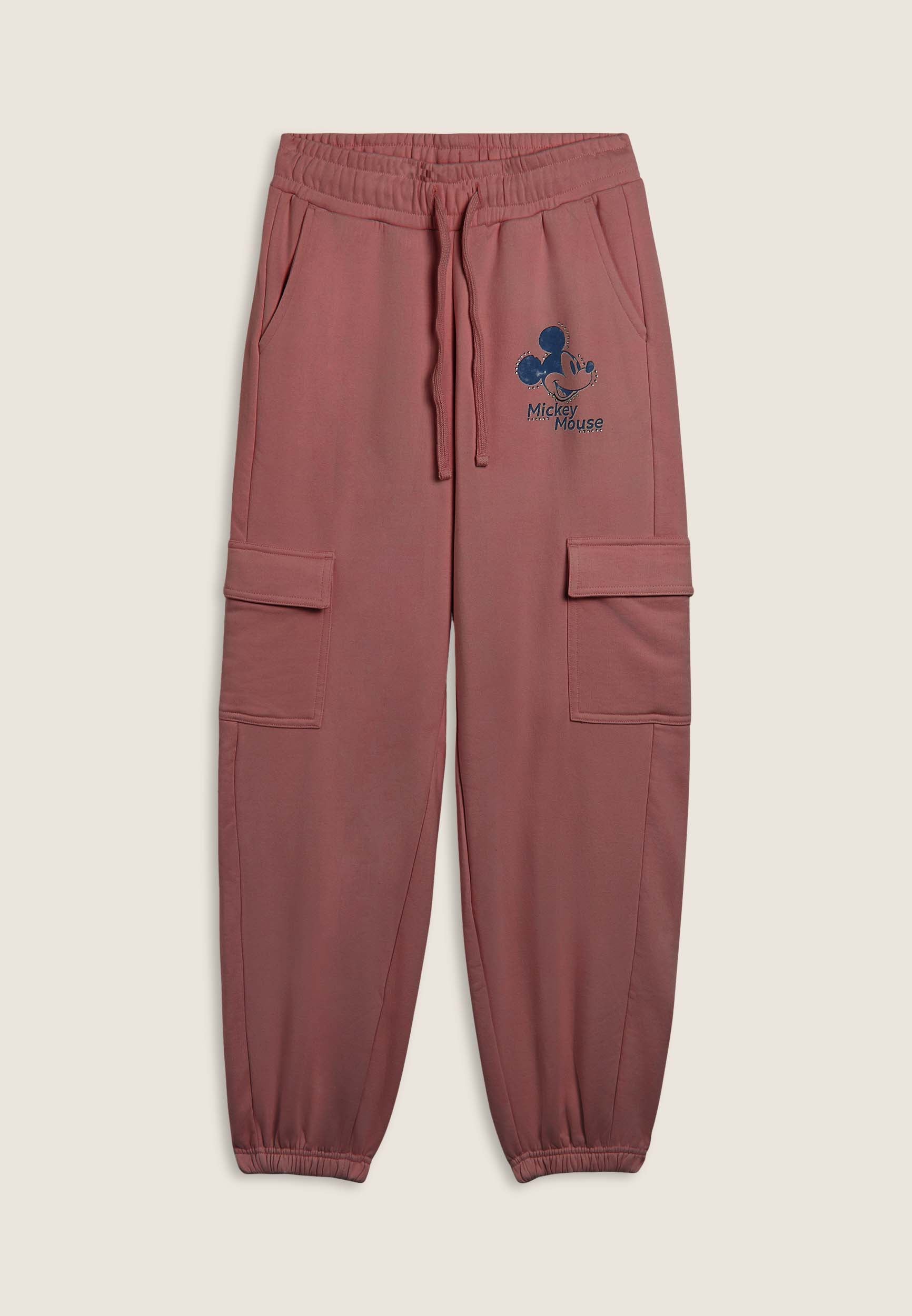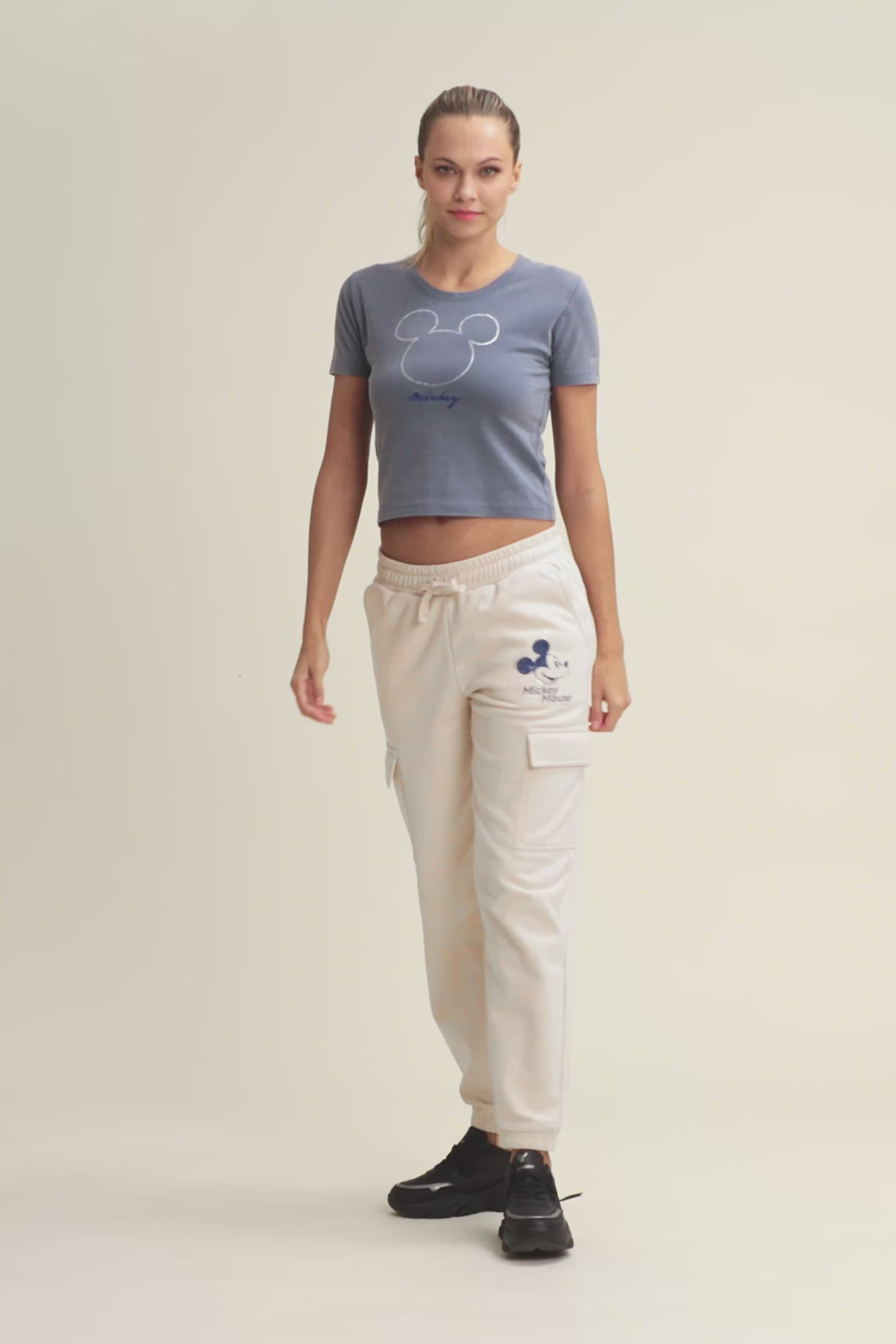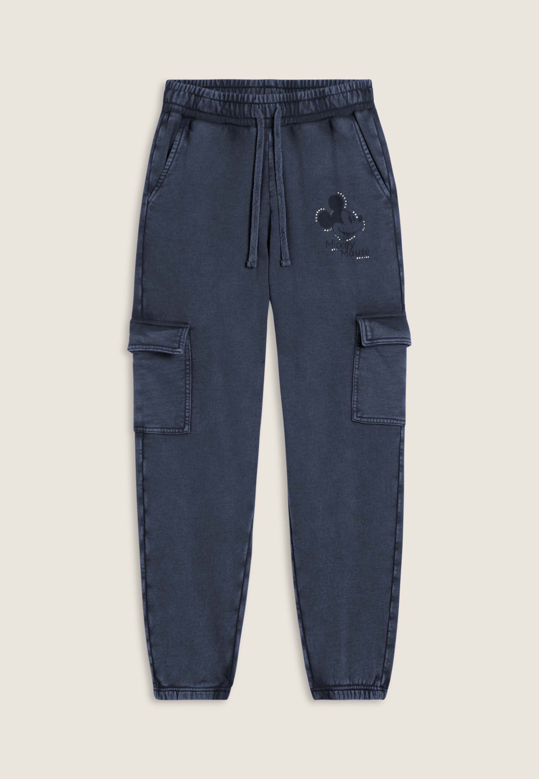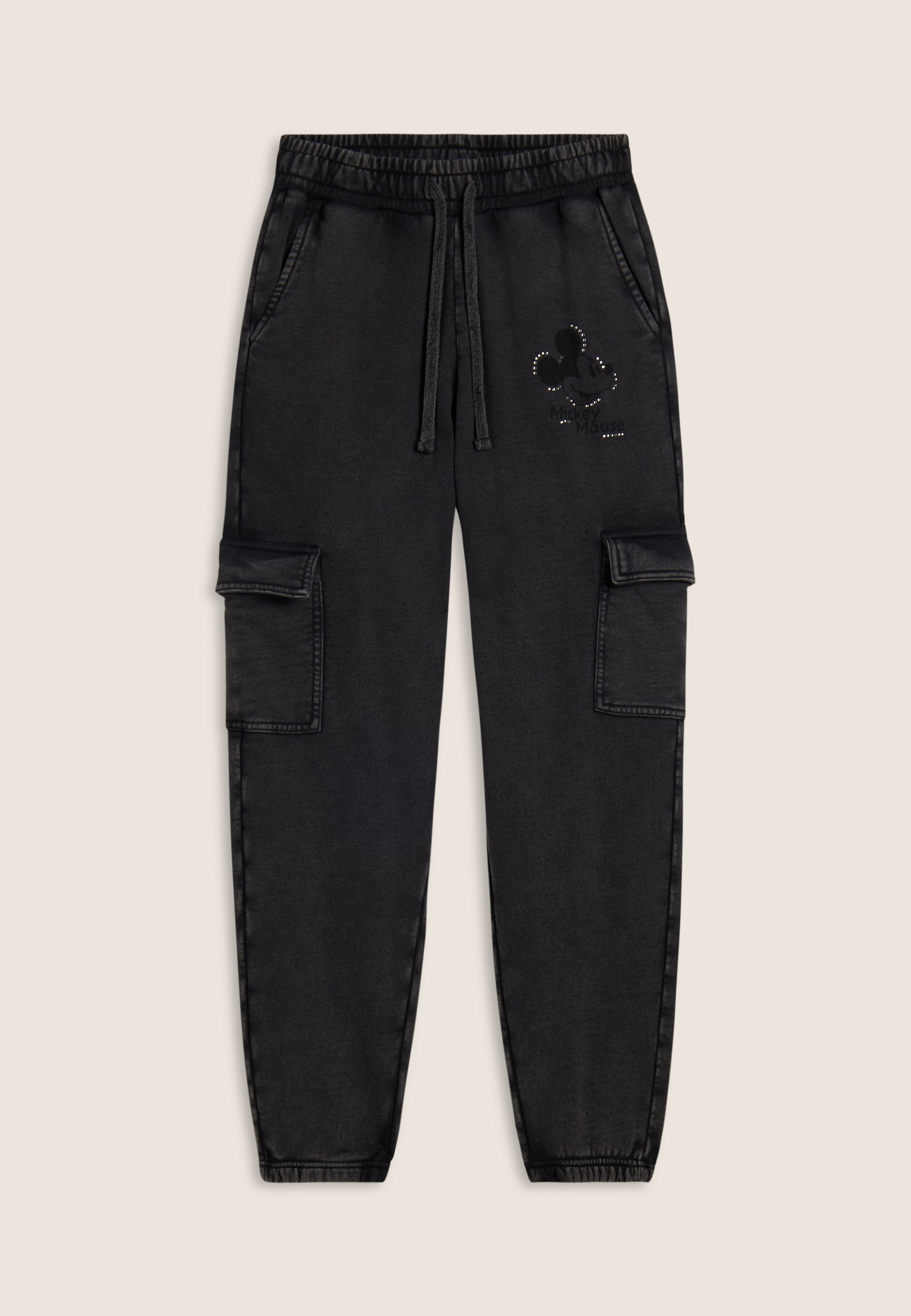 Pantaloni da donna in stile cargo con trattamento acid wash effect su French terry, che conferisce al capo un carattere autentico e sfumato. Hanno vestibilità regolare, gamba regular con fondo elasticizzato e vita regular con coulisse. Pratici e funzionali, grazie alle tasche alla francese e ai tasconi laterali. La grafica con Mickey Mouse e strass si abbina al logo Disney sul fianco e al logo FREDDY in strass sul retro.