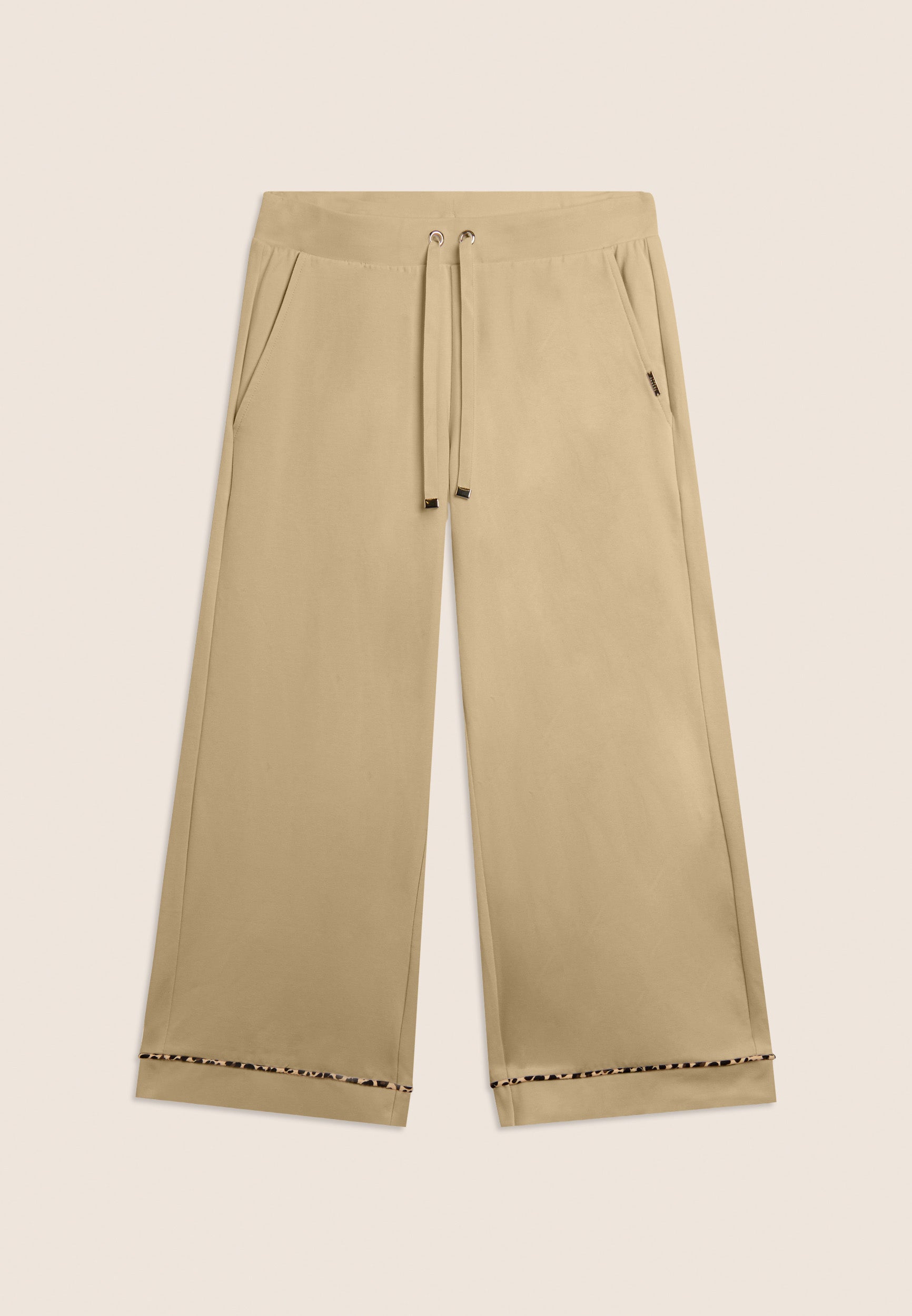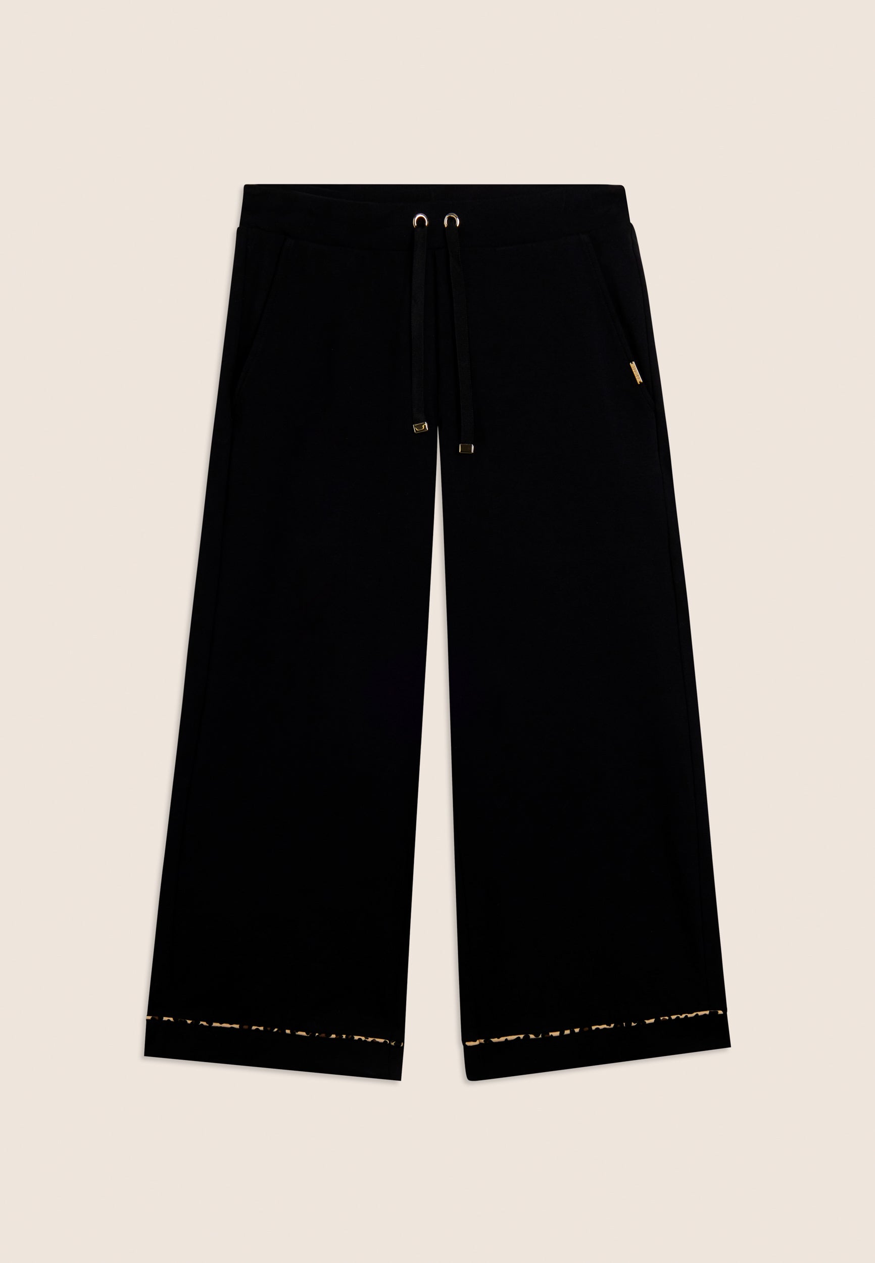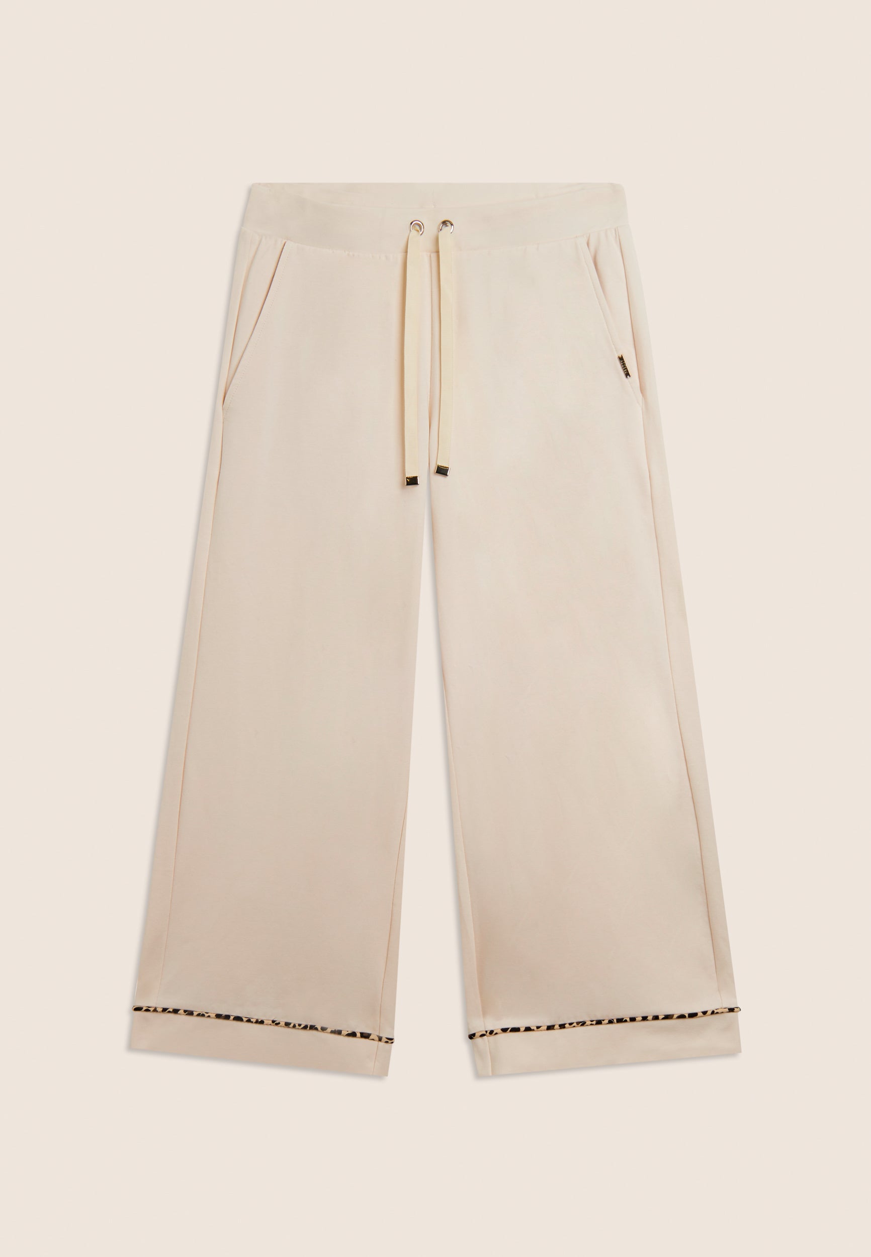 Con la loro linea ampia e la lunghezza cropped, questi pantaloni sono la scelta perfetta per un look comodo ma distintivo. Realizzati in heavy jersey stretch di cotone, presentano vita regular con coulisse e pratiche tasche interne. Il fondo gamba è valorizzato da un inserto piping in tessuto animalier che dona personalità al capo. Placchetta dorata FREDDY sulla tasca sinistra.