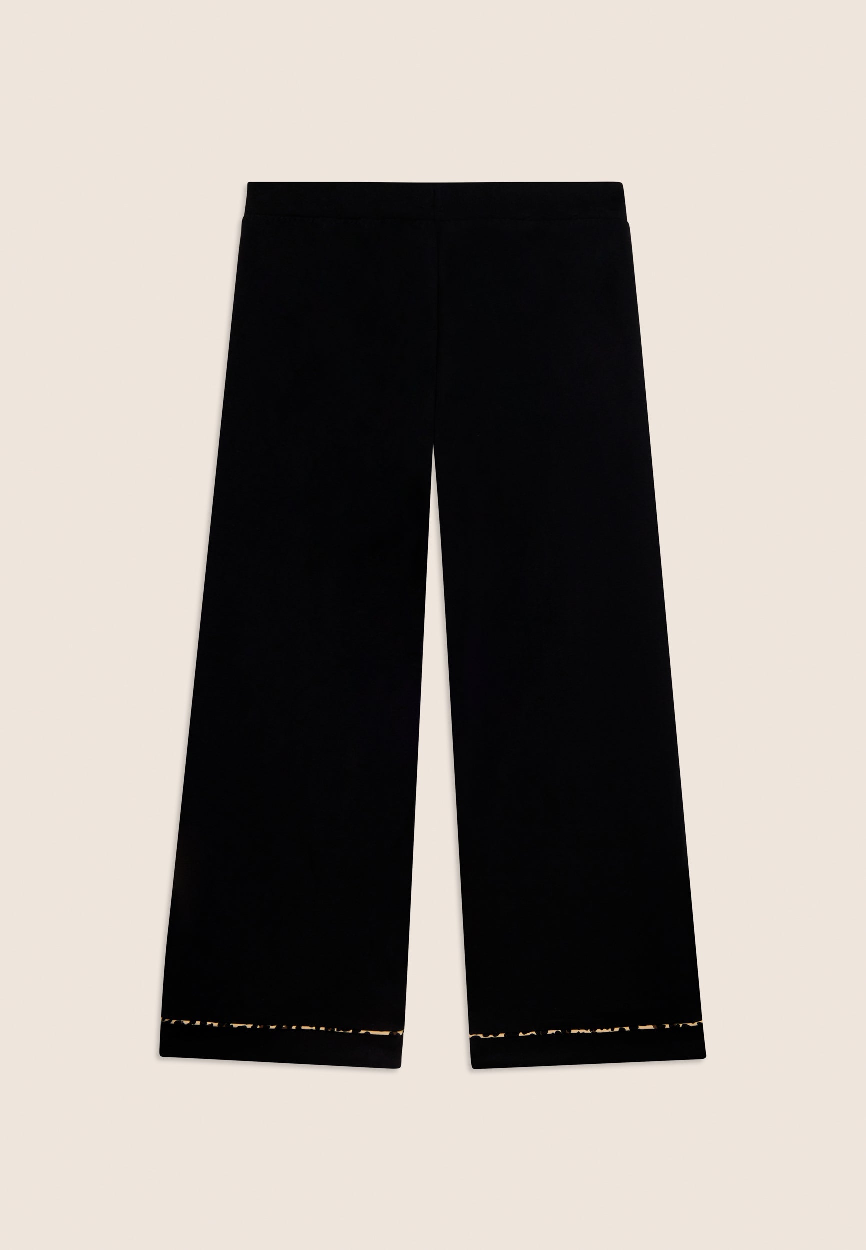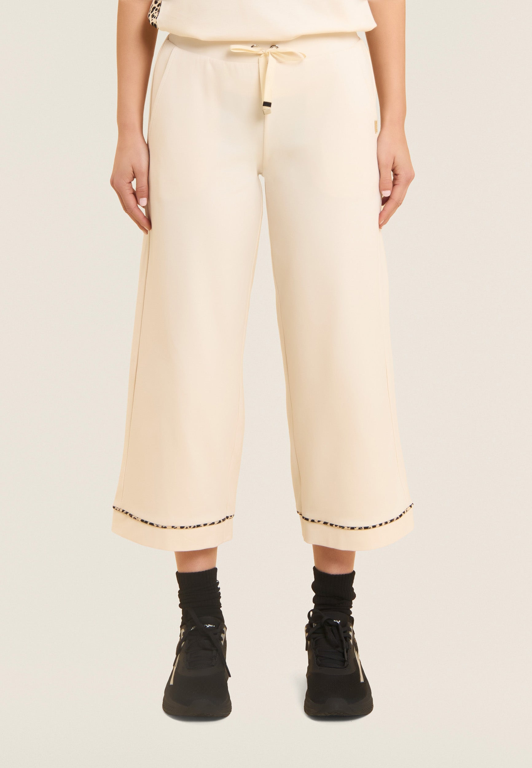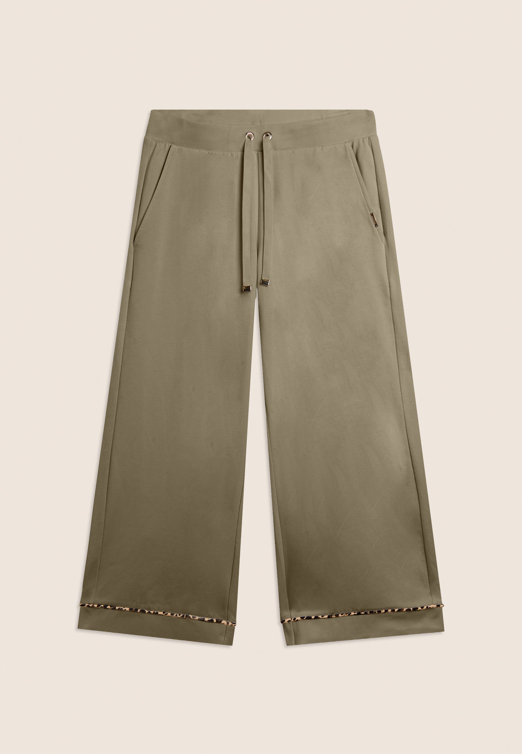 Con la loro linea ampia e la lunghezza cropped, questi pantaloni sono la scelta perfetta per un look comodo ma distintivo. Realizzati in heavy jersey stretch di cotone, presentano vita regular con coulisse e pratiche tasche interne. Il fondo gamba è valorizzato da un inserto piping in tessuto animalier che dona personalità al capo. Placchetta dorata FREDDY sulla tasca sinistra.