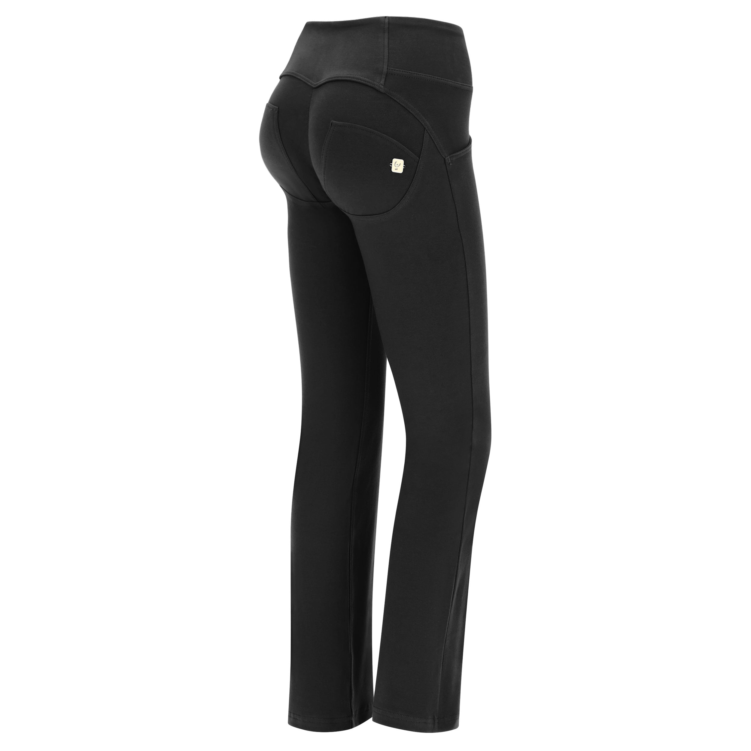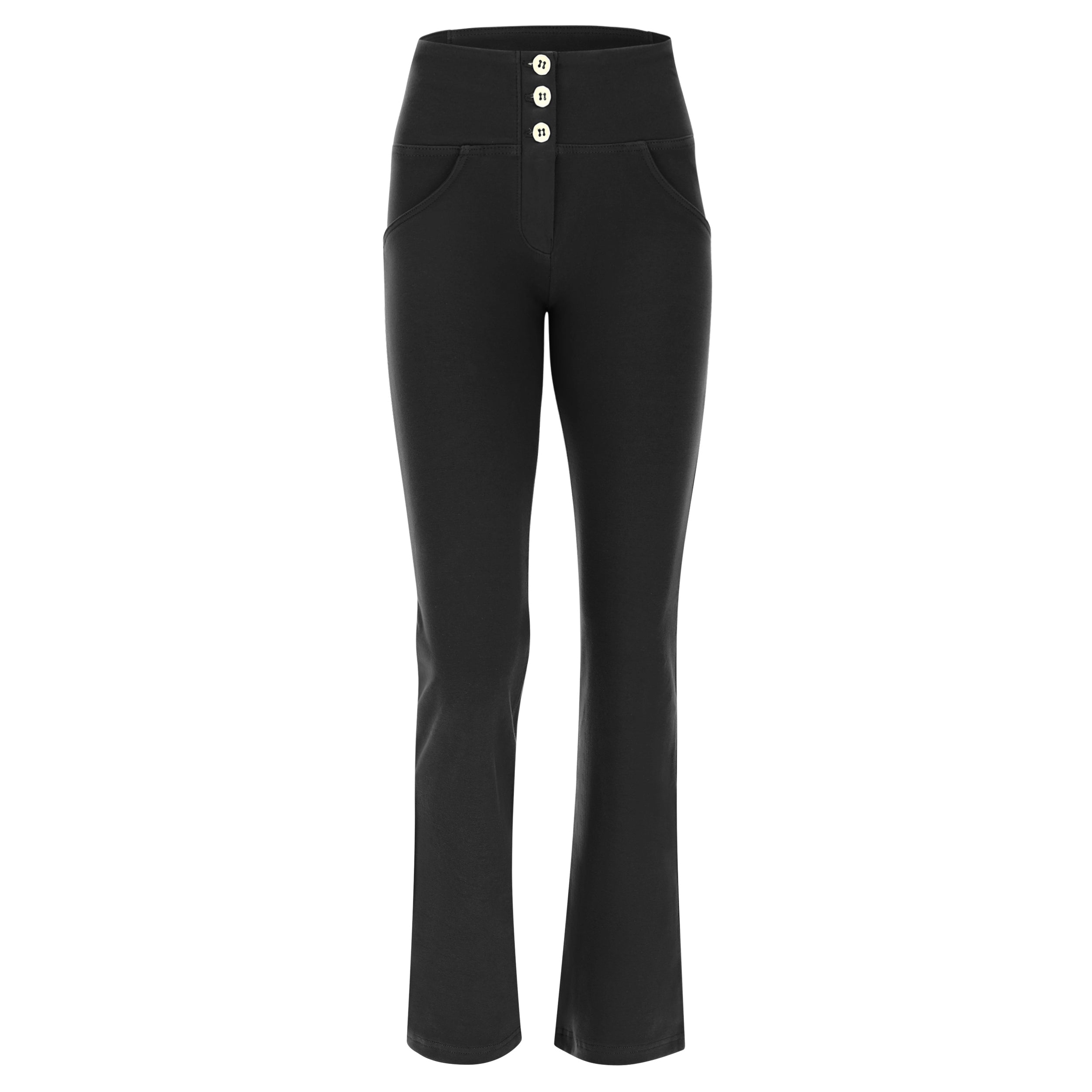 Pantaloni push up WR.UP® in cotone organico elasticizzato, caratterizzati dalla vita media con bottoni e fondo ampio corto, votati alla celebrazione della tua bellezza. Il design a wide bottom cropped che segue le linee dei fianchi e si apre sul fondo mette in luce la tua femminilità, ulteriormente valorizzata dallo speciale effetto modellante e sollevante dell’innovativa tecnologia WR.UP® brevettata da Freddy che aiuta ad esaltare la silhouette per mezzo di un particolare sistema di inserti e cuciture.