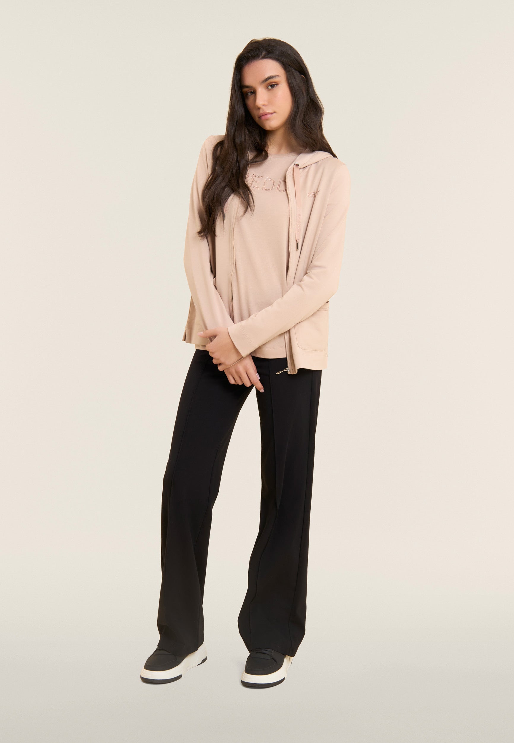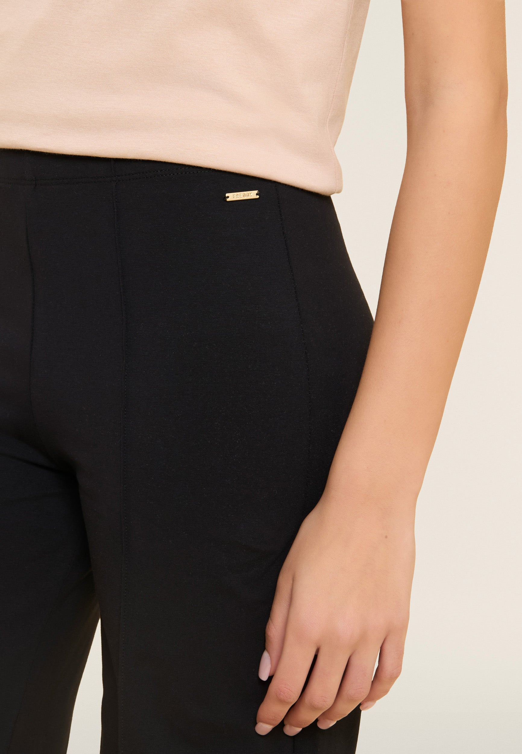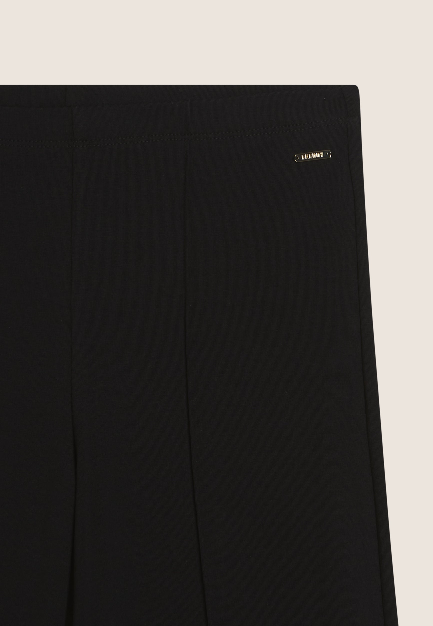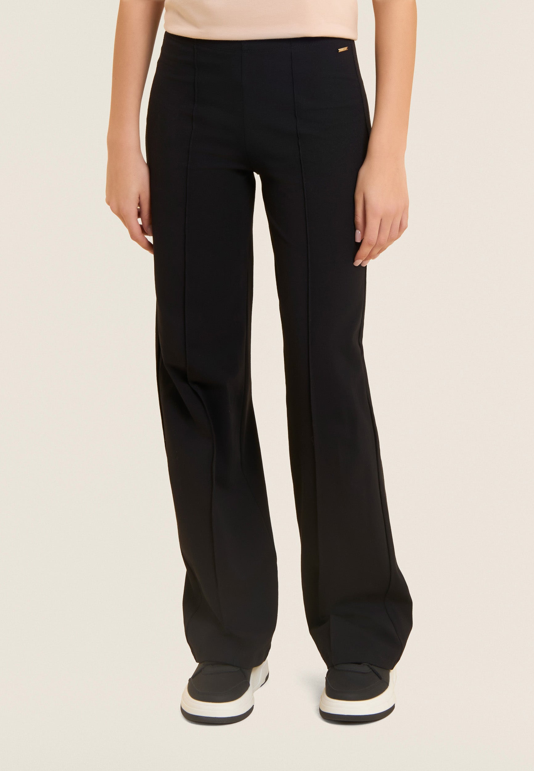 Pantaloni sportivi dalla vestibilità slim con gamba ampia, per un look femminile ma dinamico. Realizzati in confortevole jersey di cotone elasticizzato, presentano fondo dritto e una vita regular. Il dettaglio piping verticale al centro della gamba slancia la figura, mentre la placchetta dorata con logo FREDDY illumina il fianco anteriore. Senza tasche per un’estetica pulita ed essenziale.