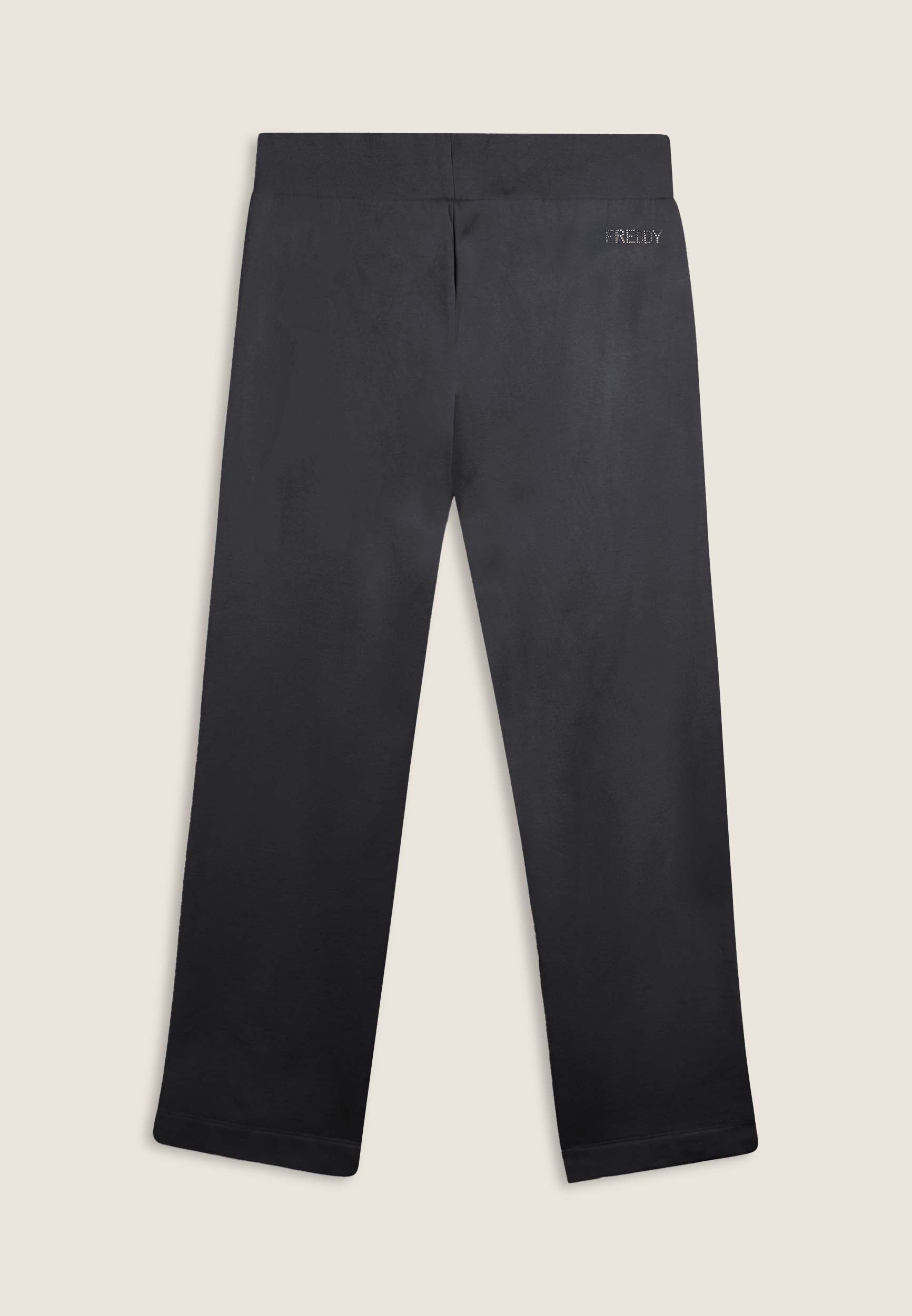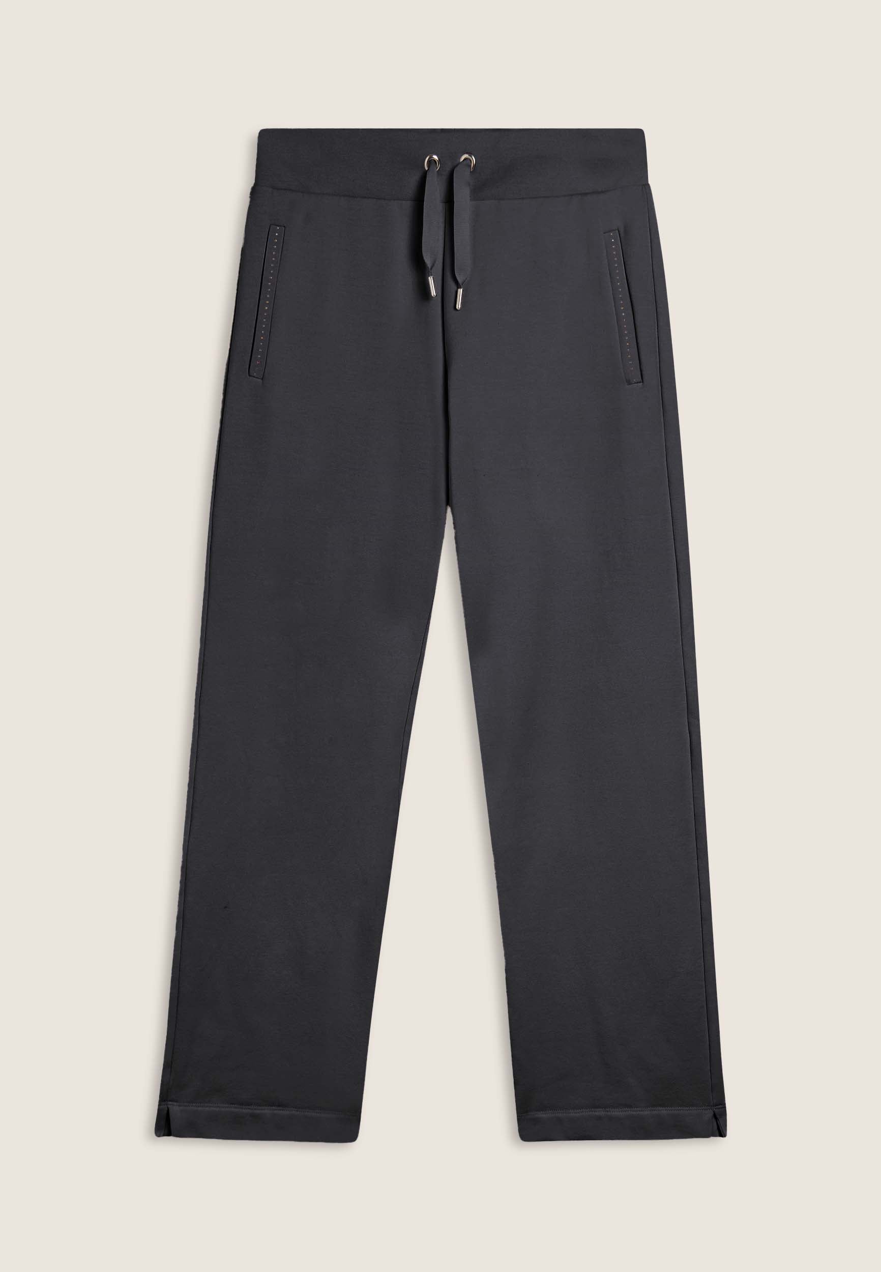 Questi pantaloni sportivi da donna combinano funzionalità e stile, grazie al tessuto in felpa modal garzata elasticizzata, caldo e delicato sulla pelle. La gamba dritta con piccoli spacchi sull’orlo dona movimento al look. Vita in costina con coulisse, tasche alla francese e strass bicolori sia sul bordo tasca sia sul fianco posteriore.