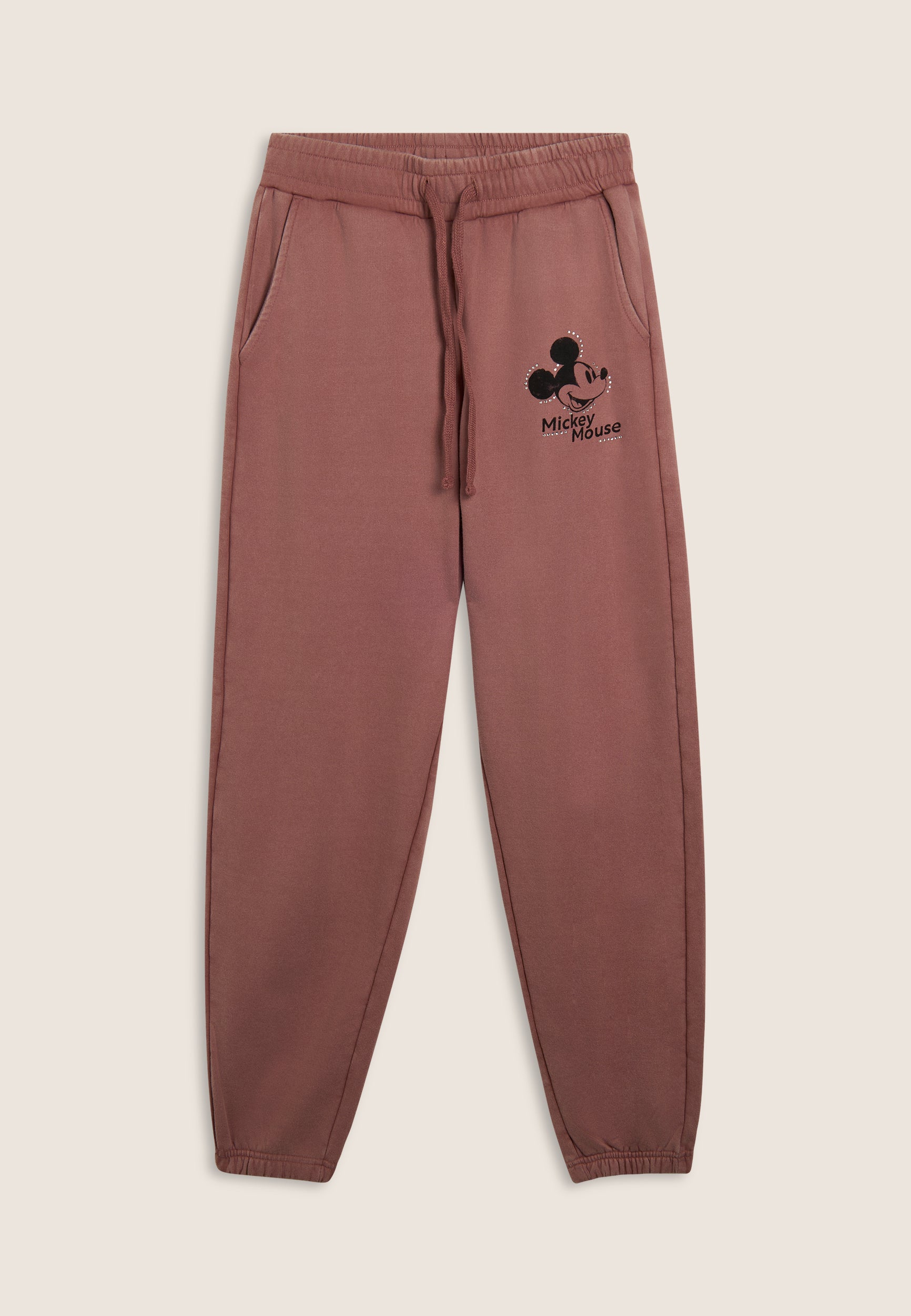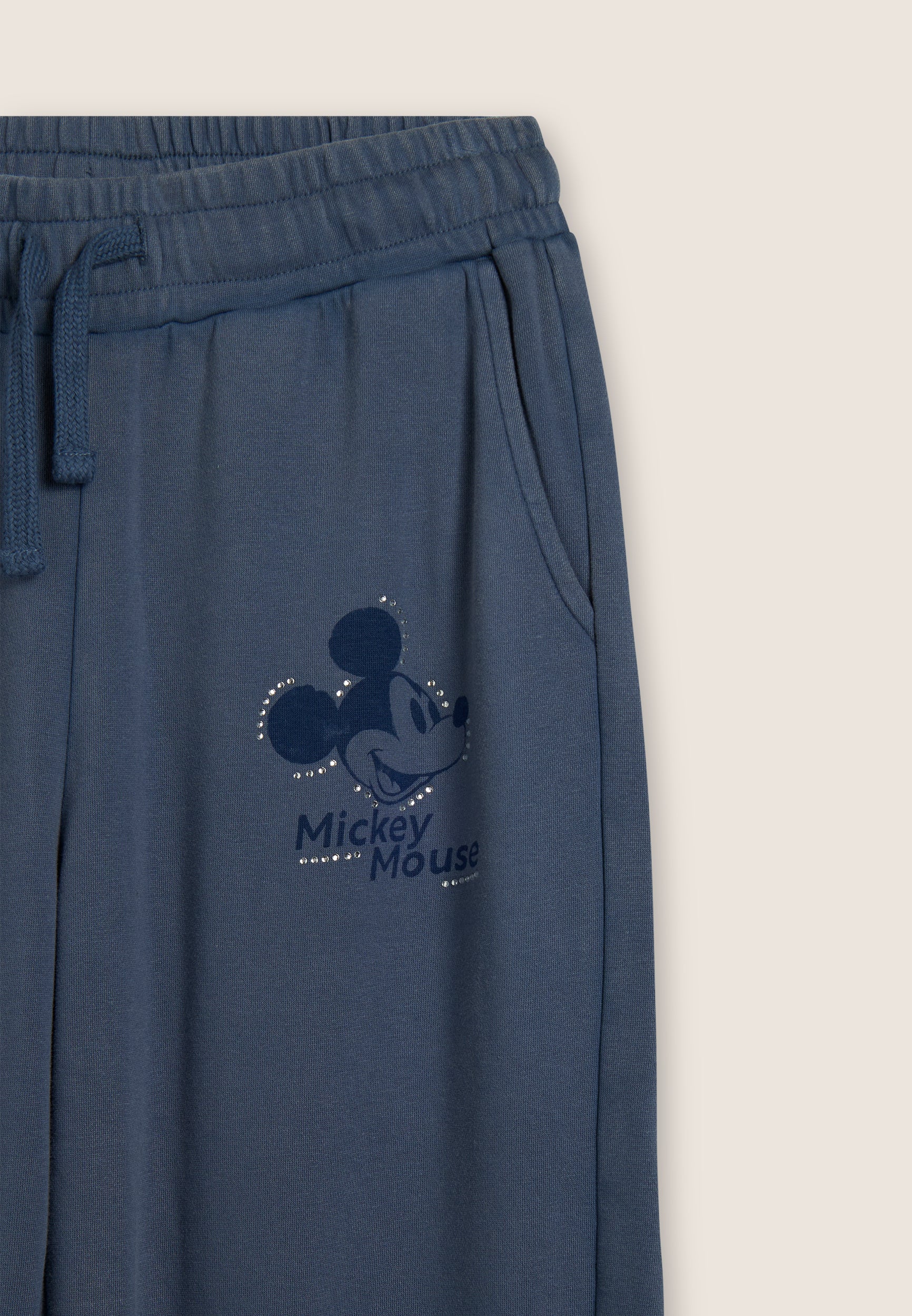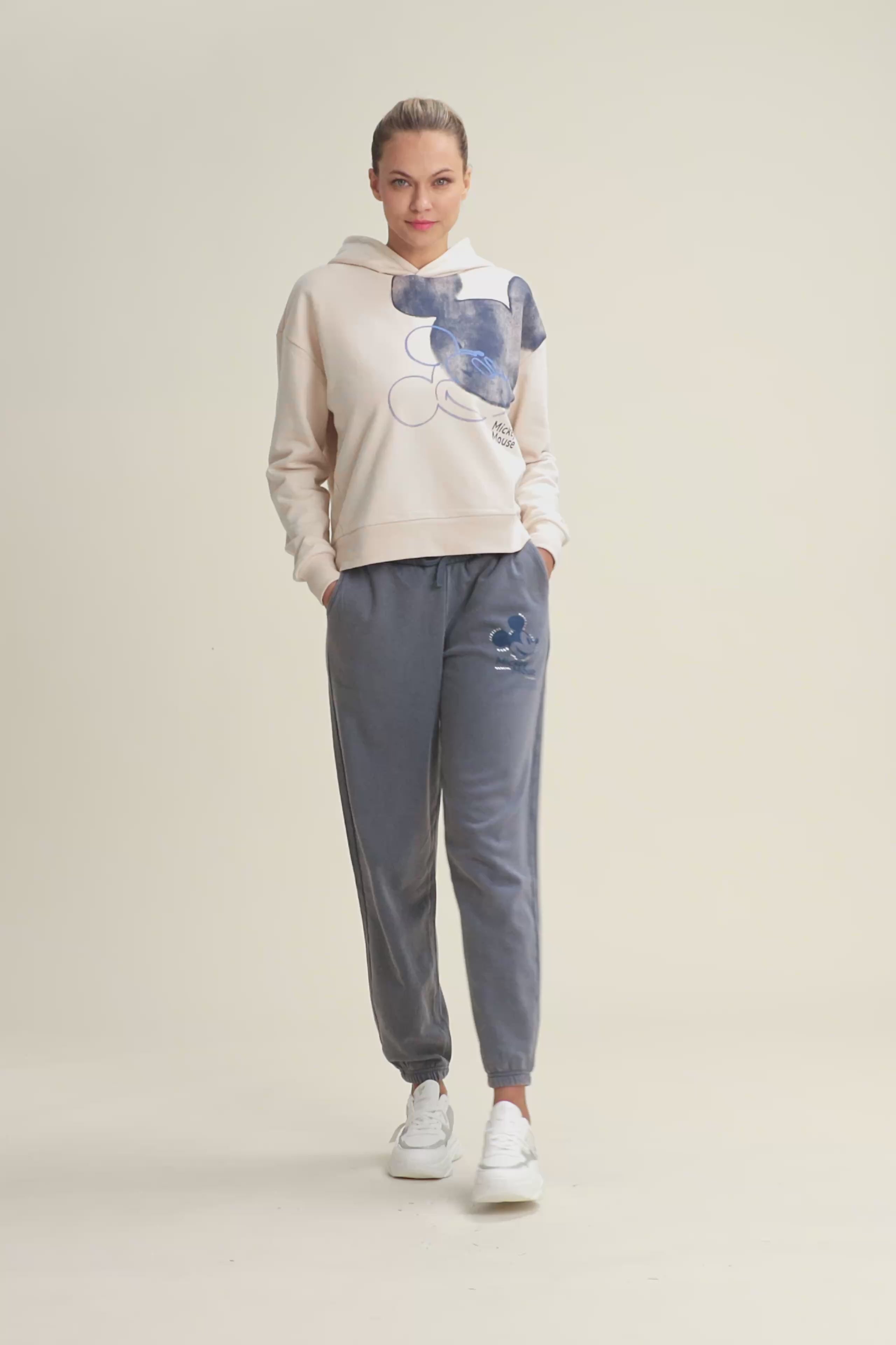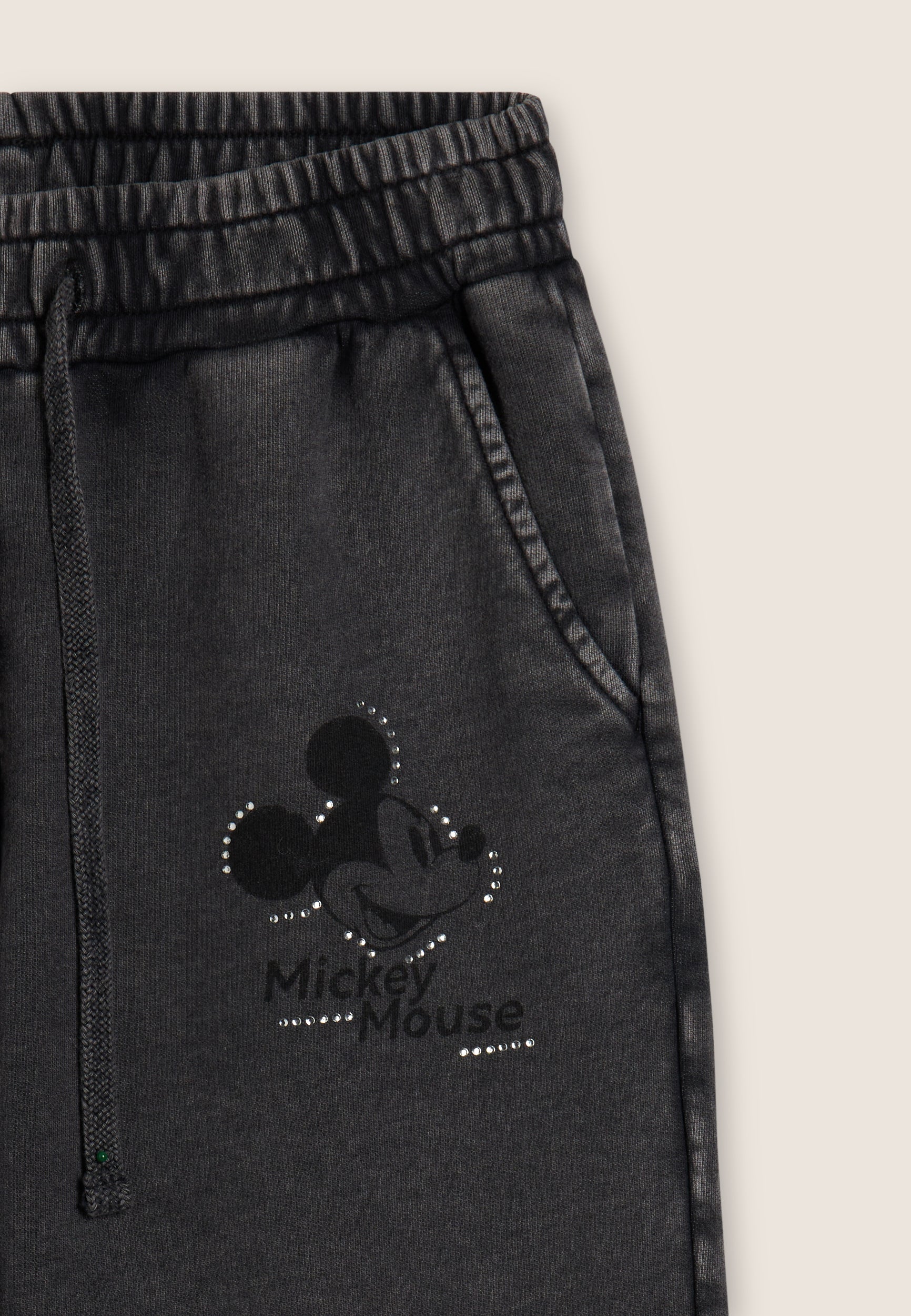Pantaloni sportivi da donna in French terry con trattamento acid wash effect, che regala al capo un aspetto vissuto e sfumature di colore uniche. La vestibilità è regolare, con gamba dritta e fondo elasticizzato. La vita è regular, con coulisse regolabile in tono colore. Completano il design le tasche alla francese e una grafica sul fianco con Mickey Mouse, logo Disney e dettagli in strass. Il logo FREDDY sul fianco posteriore è composto da strass.