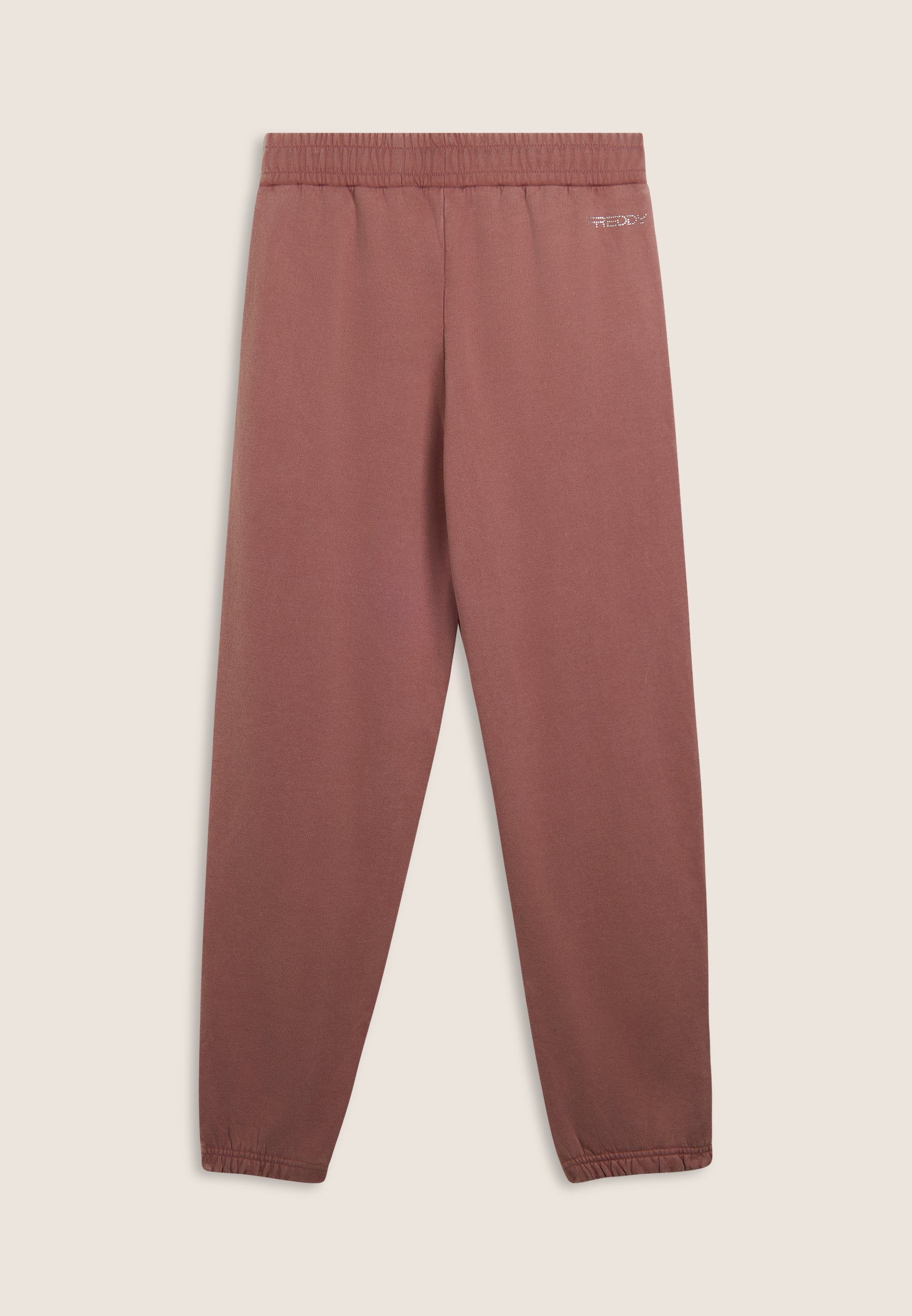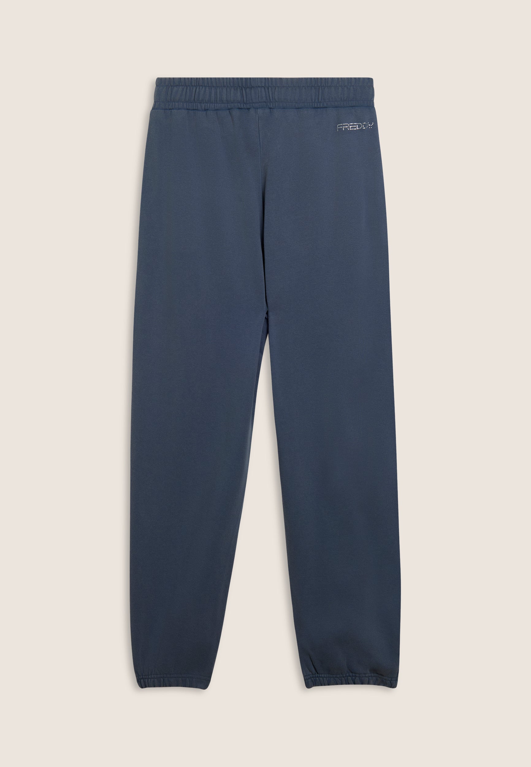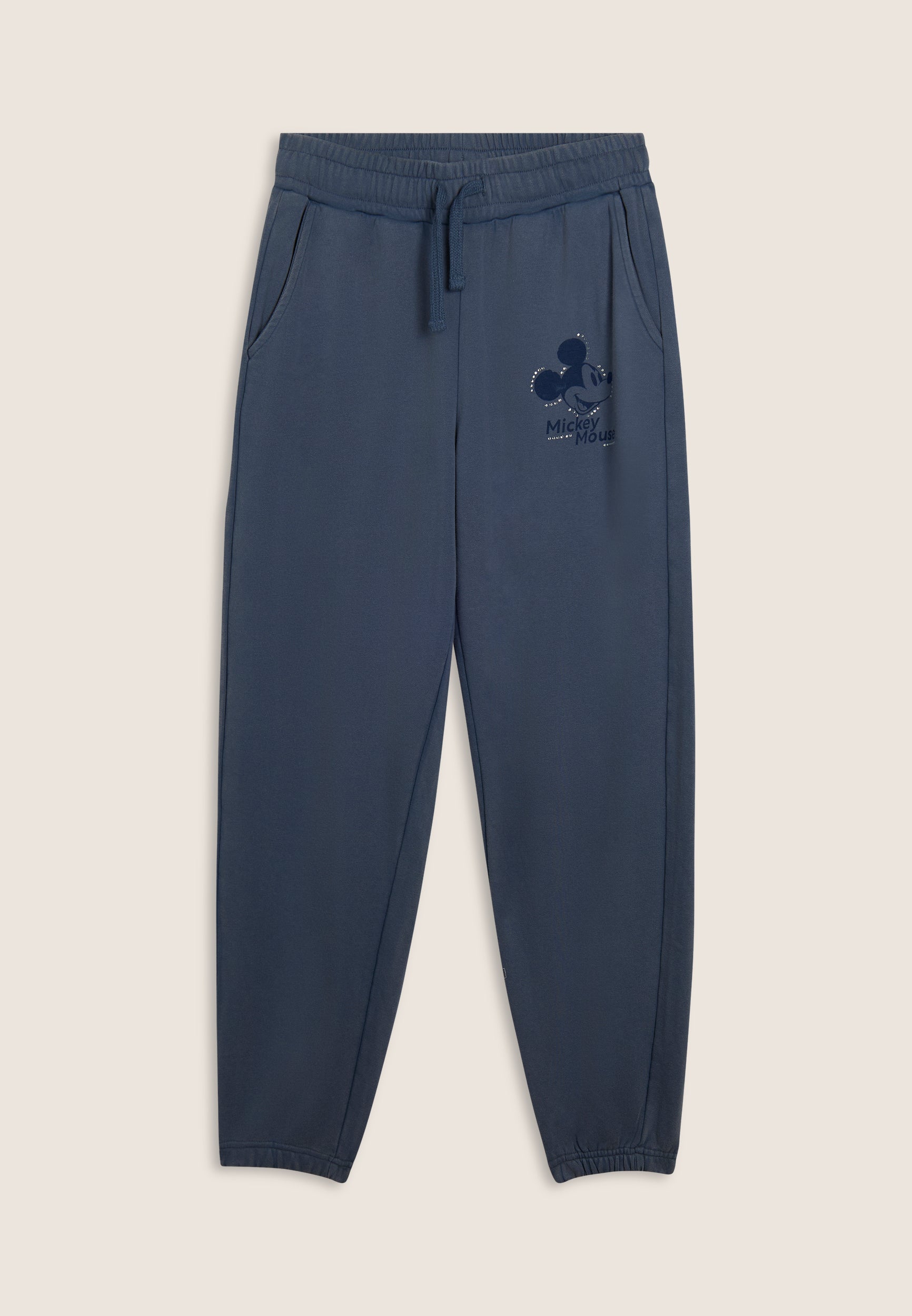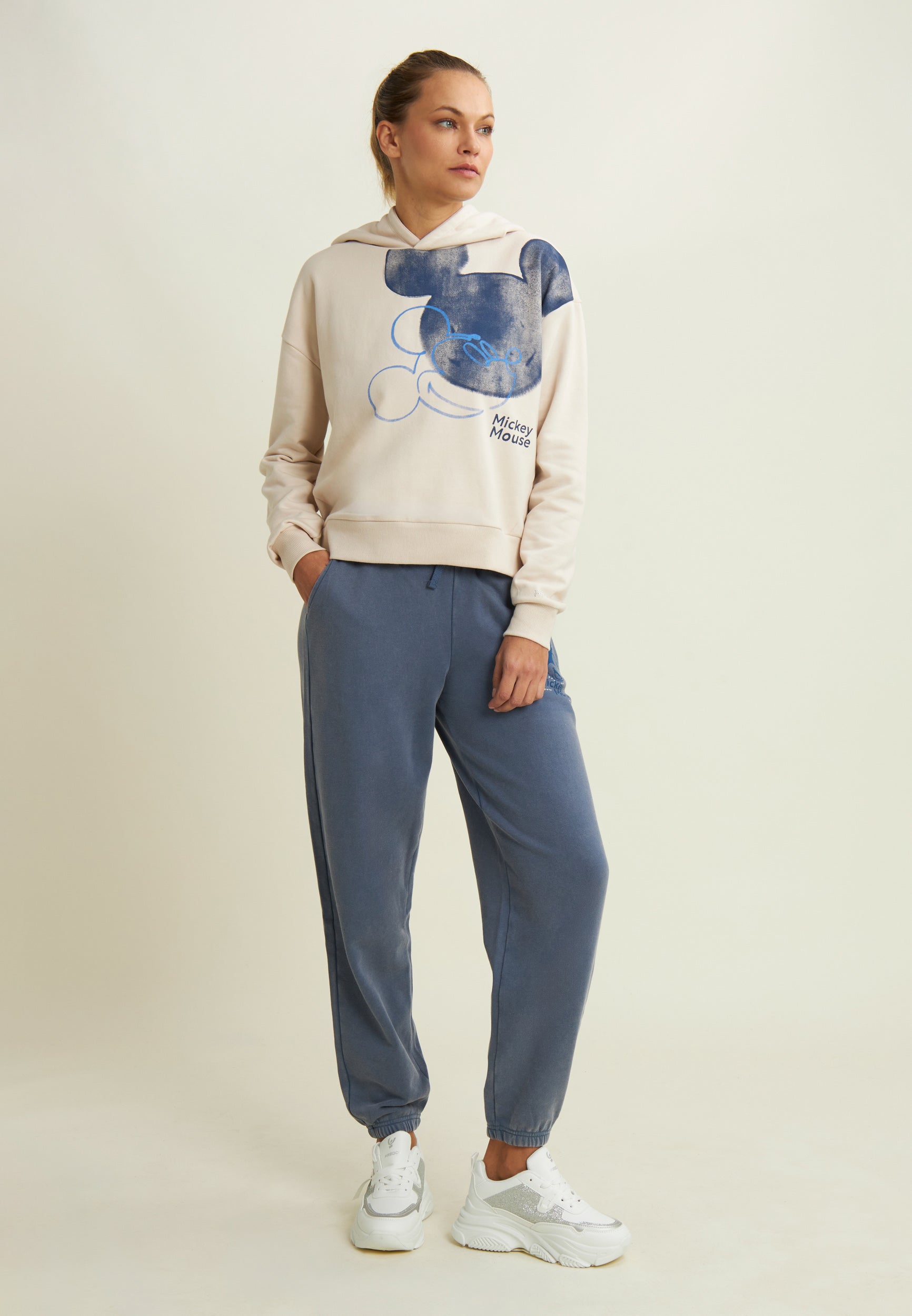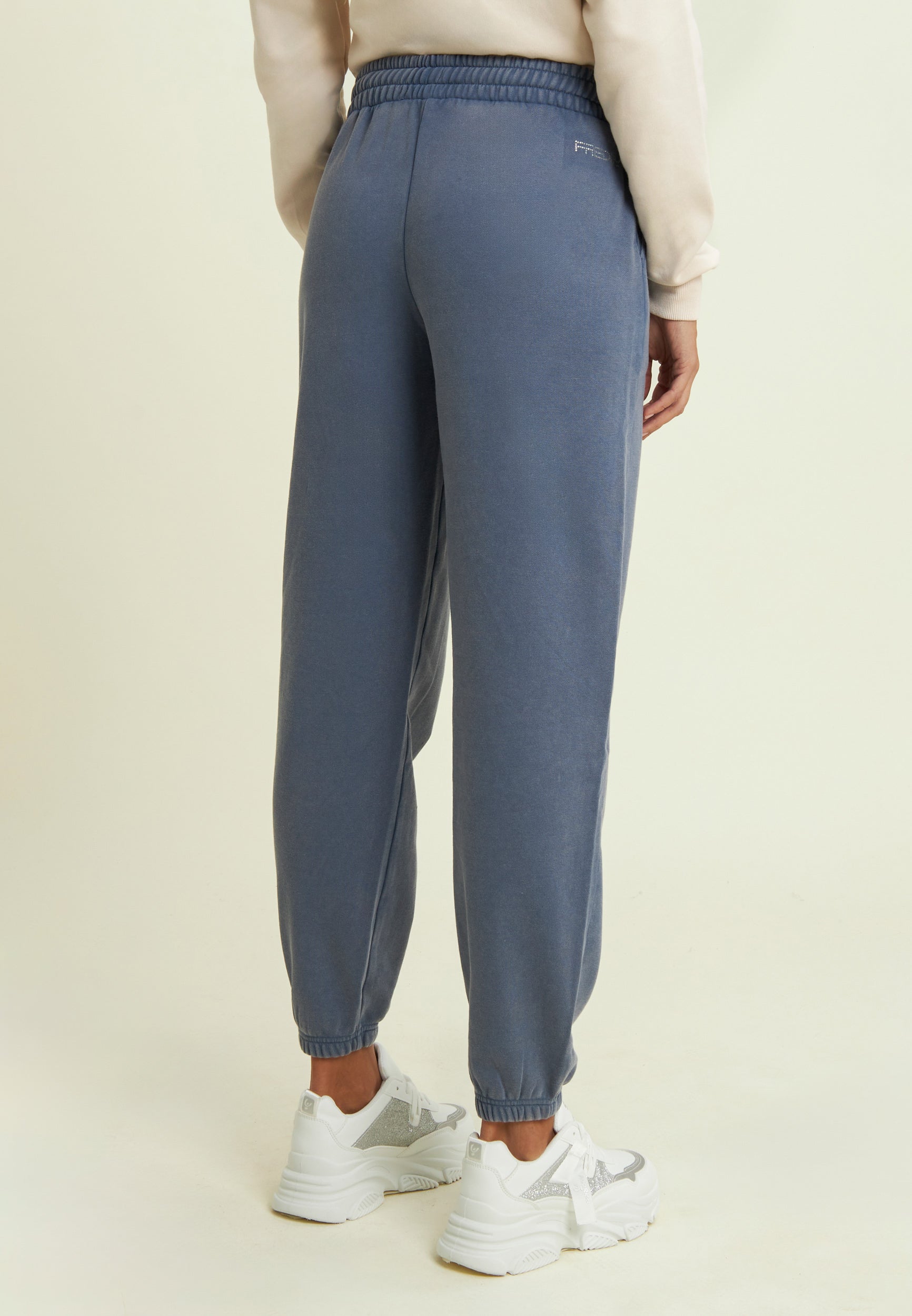 Pantaloni sportivi da donna in French terry con trattamento acid wash effect, che regala al capo un aspetto vissuto e sfumature di colore uniche. La vestibilità è regolare, con gamba dritta e fondo elasticizzato. La vita è regular, con coulisse regolabile in tono colore. Completano il design le tasche alla francese e una grafica sul fianco con Mickey Mouse, logo Disney e dettagli in strass. Il logo FREDDY sul fianco posteriore è composto da strass.