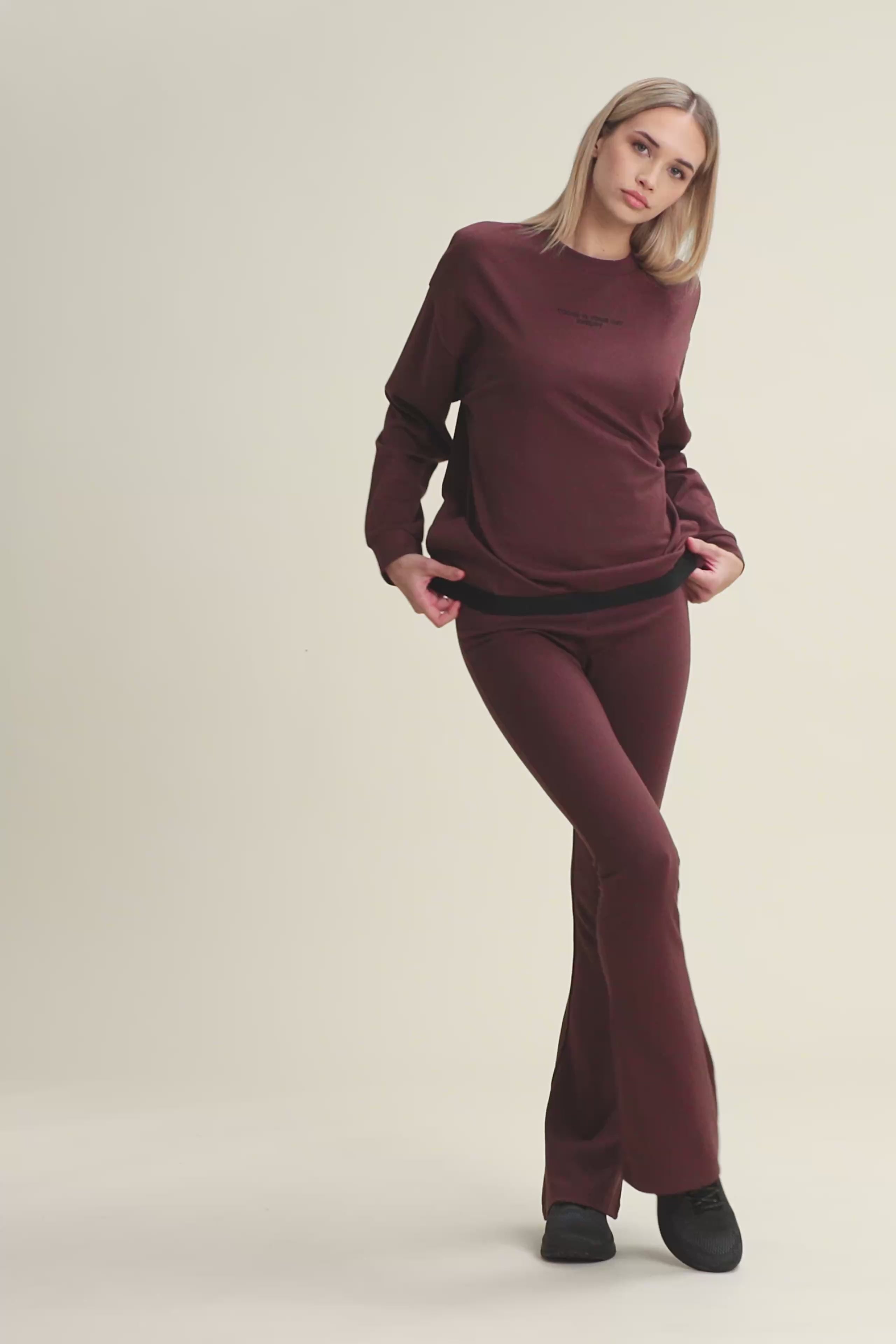 Pantaloni da donna in felpa garzata elasticizzata con gamba superflare ed extra lunghezza. La vita alta è avvolgente grazie alla fascia elastica jacquard logata. Uno stile comodo e d’impatto per distinguersi.