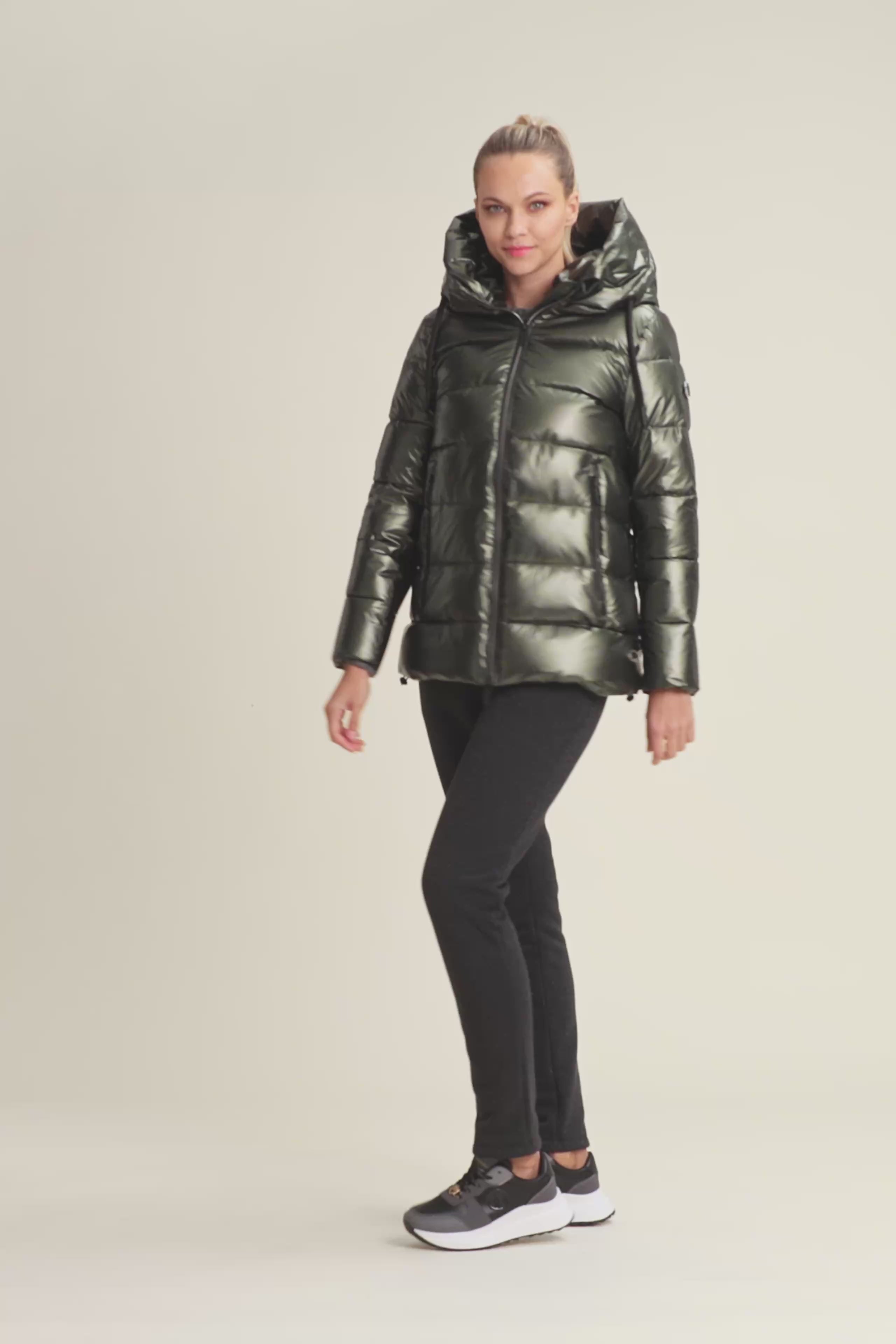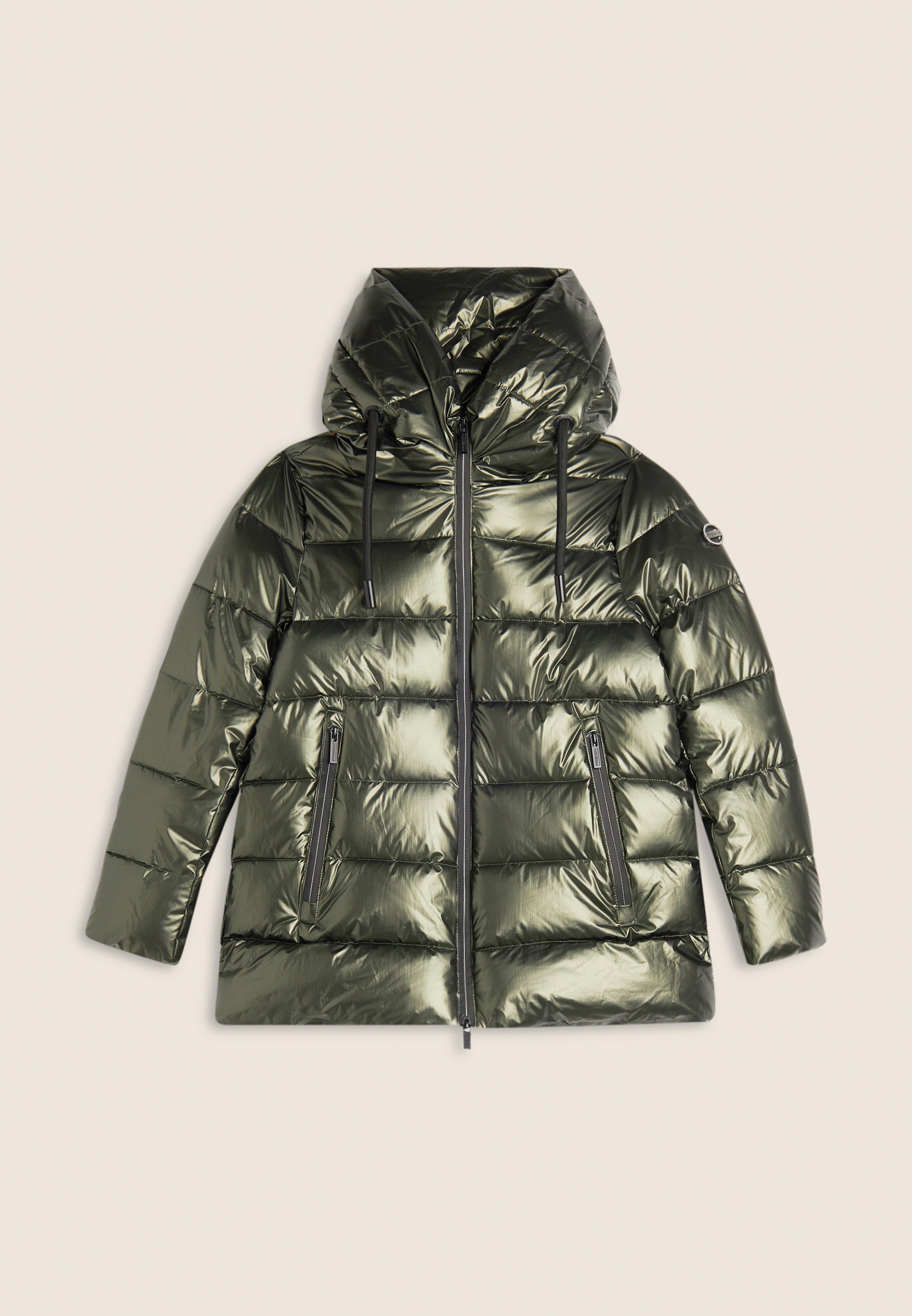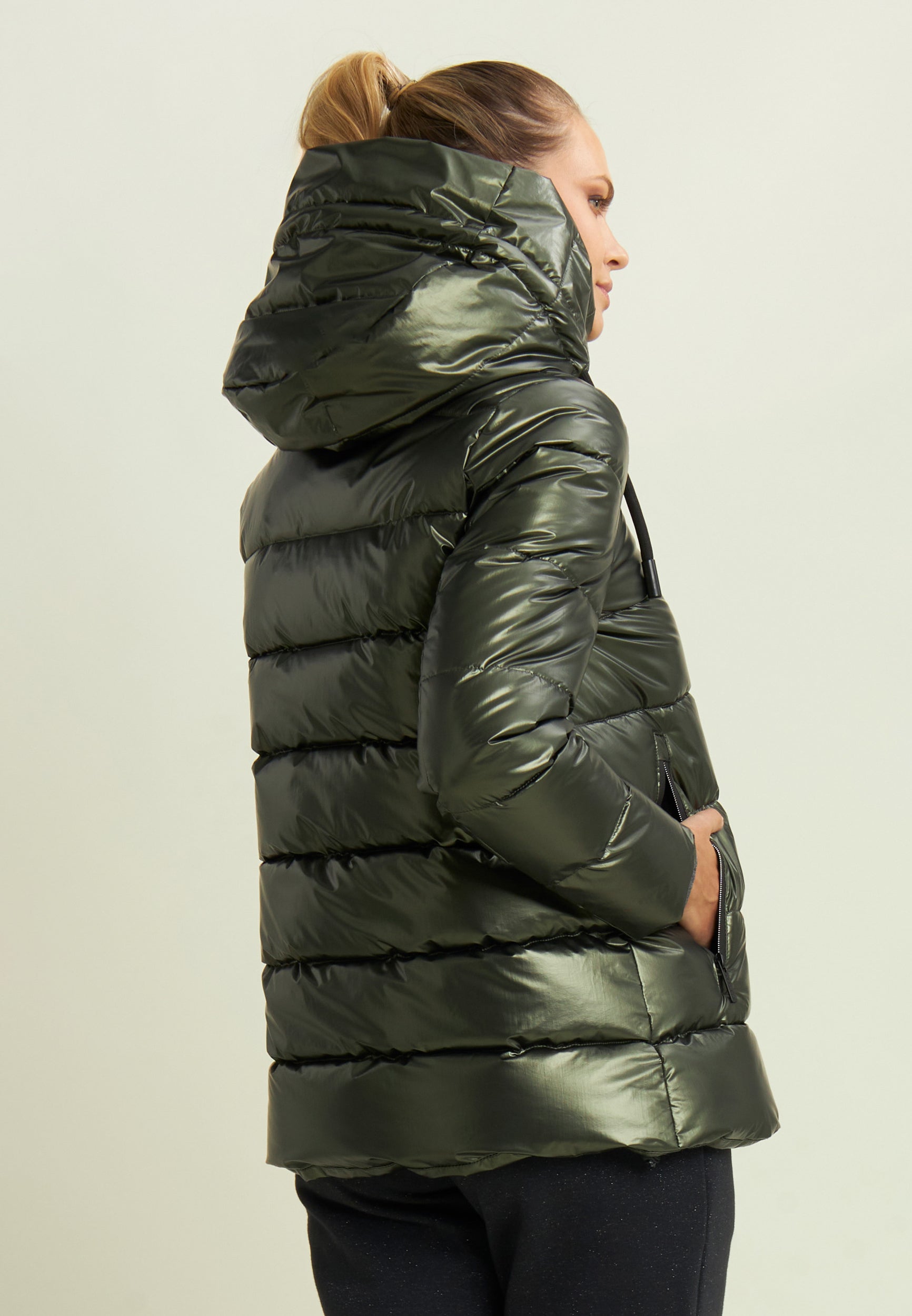 Piumino donna lucido con cappuccio protettivo e coulisse