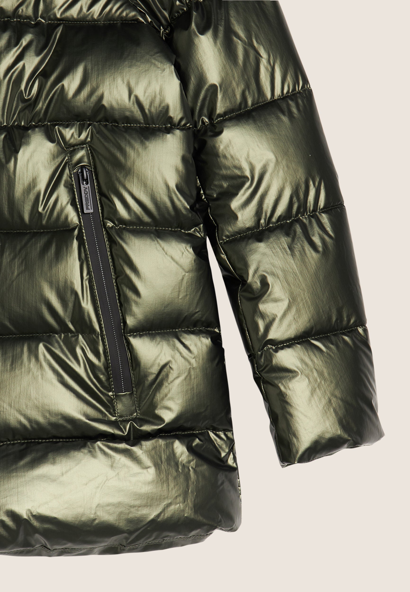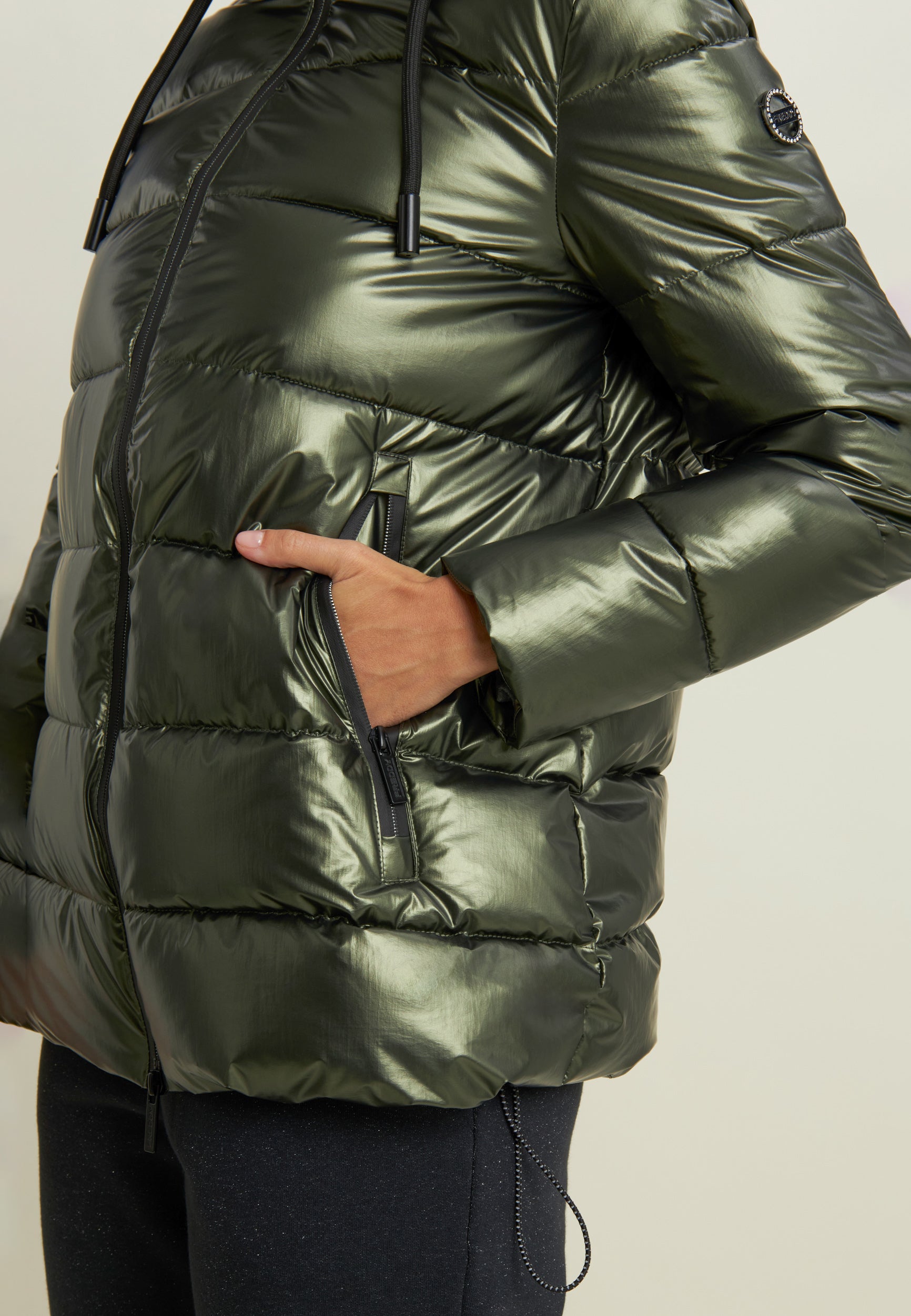 Piumino trapuntato a bande orizzontali, vestibilità regular e lunghezza ai fianchi. Il cappuccio dal bordo alto e il collo alto proteggono efficacemente dal freddo, anche quando il cappuccio è abbassato. Esterno coated dall'effetto lucido e imbottitura in fake-down animal-friendly che assicura isolamento termico anche in condizioni umide. Il fondo regolabile con coulisse e la chiusura full zip a doppio cursore completano un capo pratico e versatile, con logo strass e tasche frontali con zip.