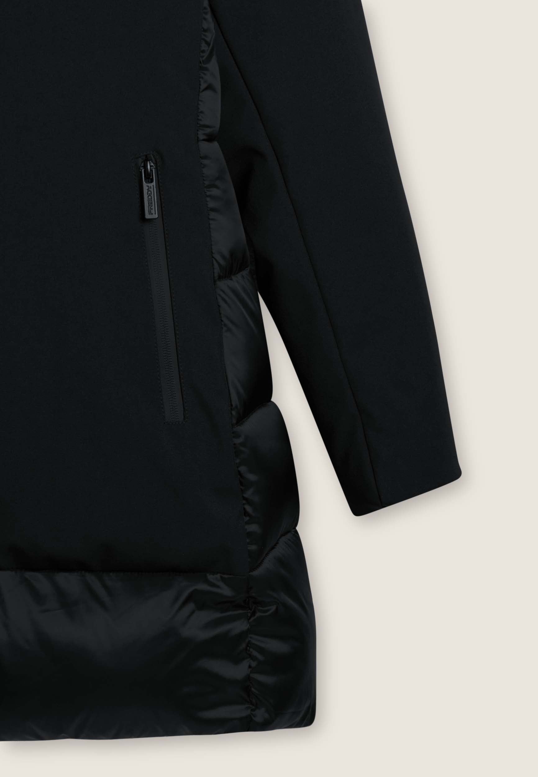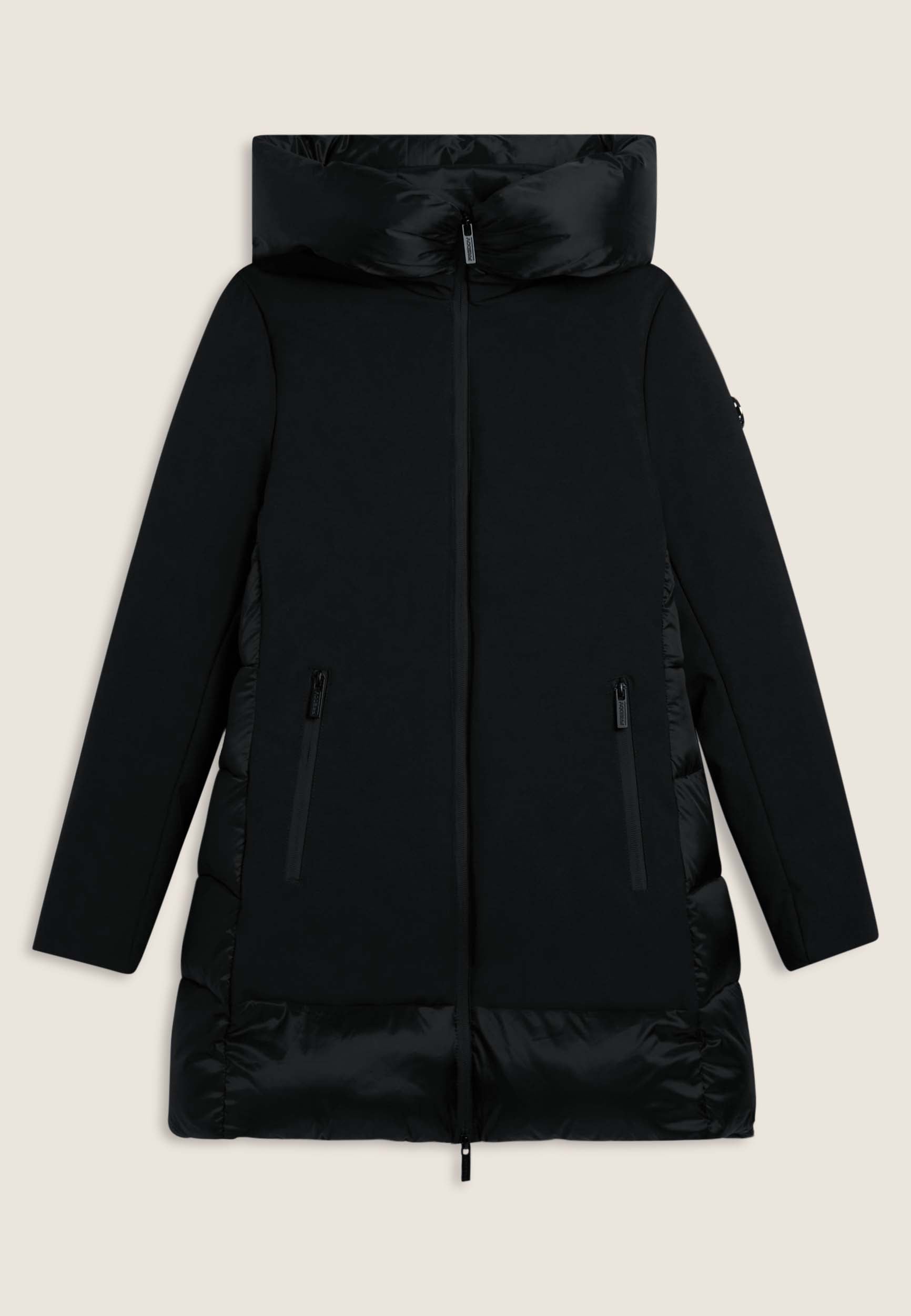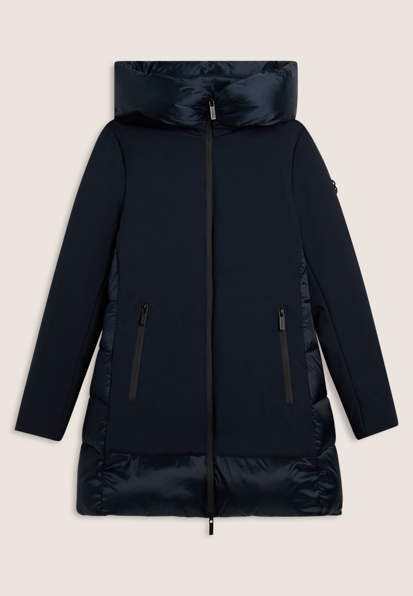 Protezione e stile si incontrano in questo piumino lungo da donna, vestibilità regular e lunghezza a metà coscia. L’esterno mixa superfici opache e trapuntature lucide a bande orizzontali su cappuccio e retro. Imbottito in fake-down animal-friendly, mantiene calore e leggerezza anche in presenza di umidità. Il collo alto e il cappuccio offrono comfort extra, mentre la chiusura full zip e le tasche con zip aggiungono funzionalità.