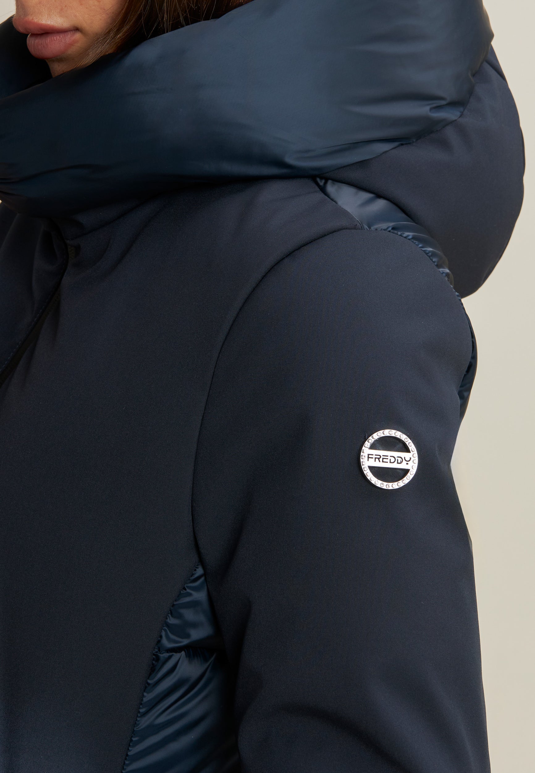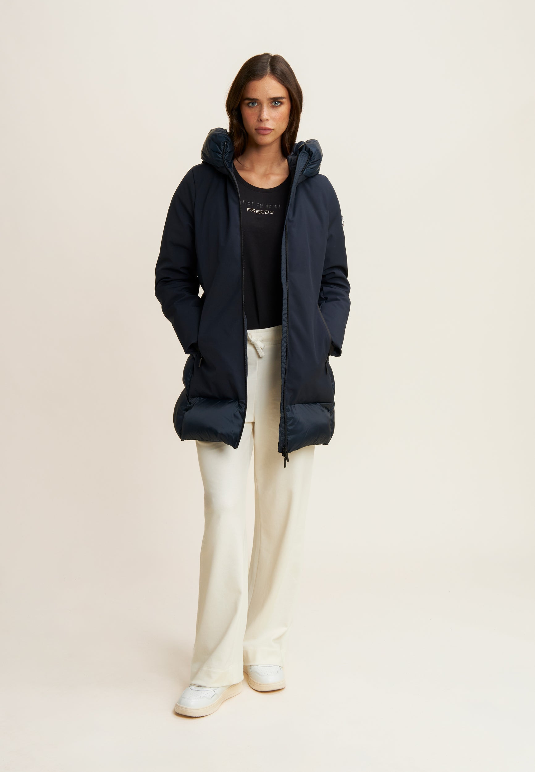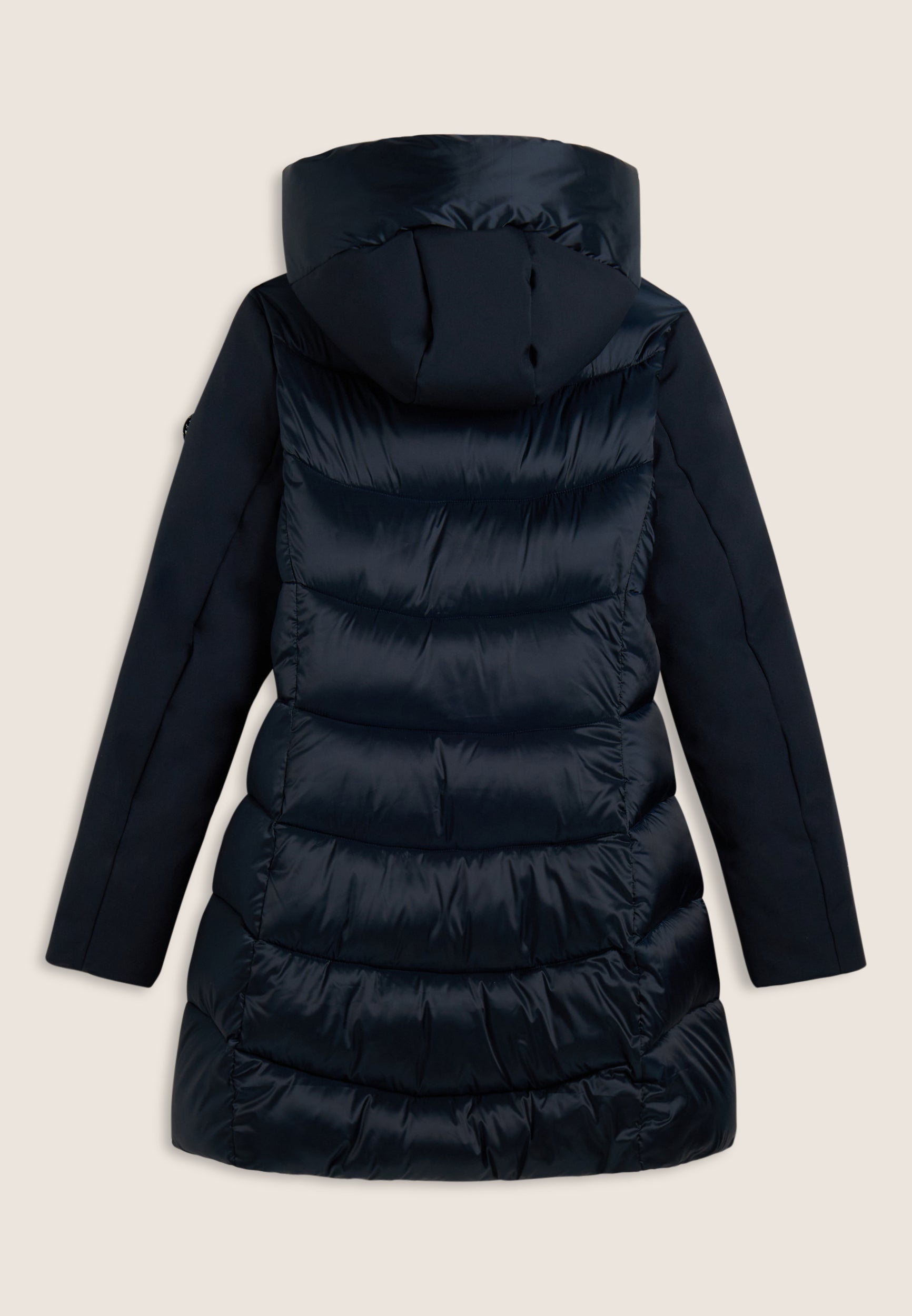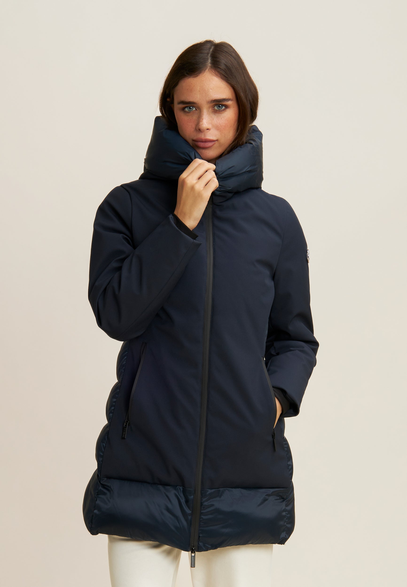 Protezione e stile si incontrano in questo piumino lungo da donna, vestibilità regular e lunghezza a metà coscia. L’esterno mixa superfici opache e trapuntature lucide a bande orizzontali su cappuccio e retro. Imbottito in fake-down animal-friendly, mantiene calore e leggerezza anche in presenza di umidità. Il collo alto e il cappuccio offrono comfort extra, mentre la chiusura full zip e le tasche con zip aggiungono funzionalità.