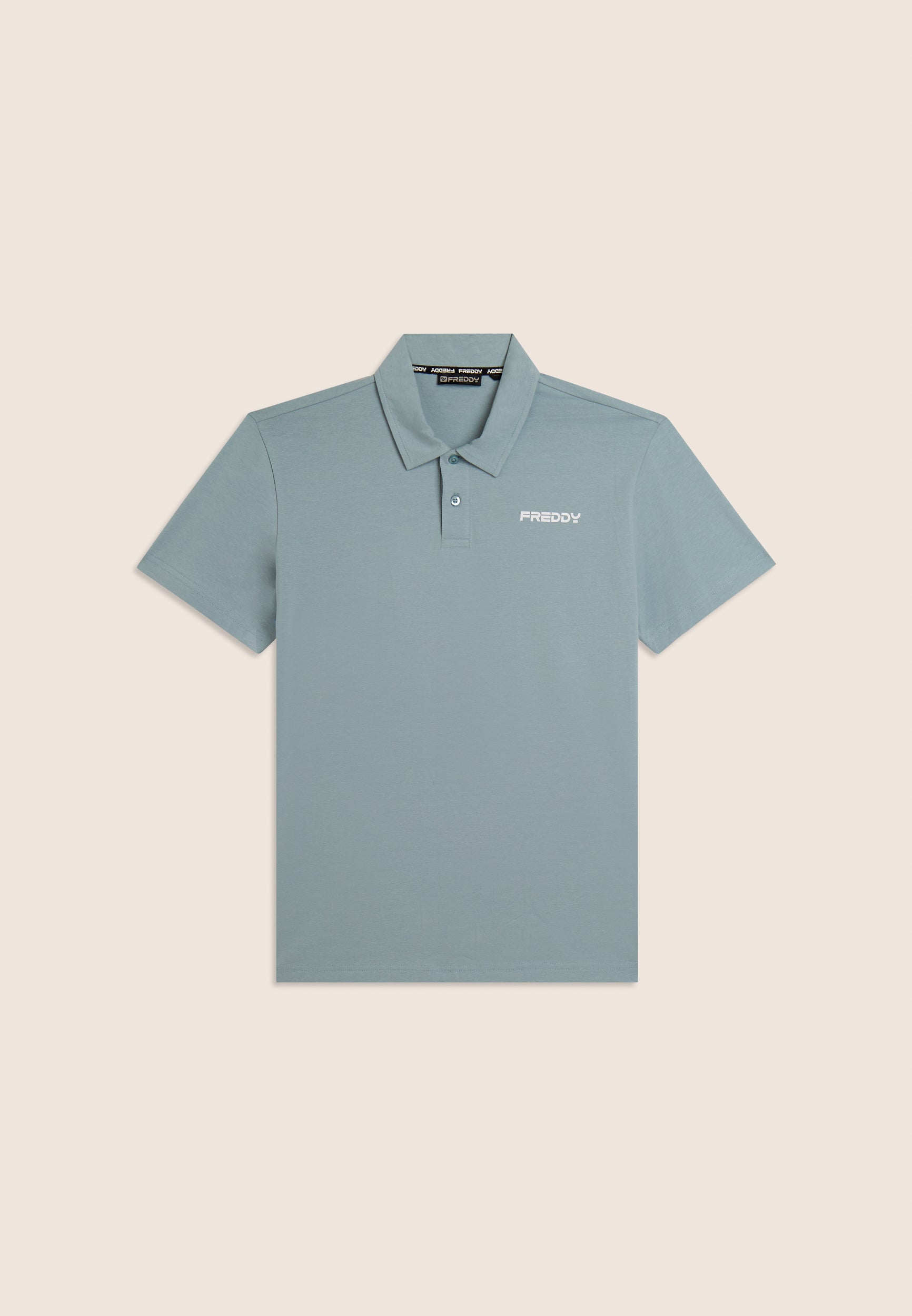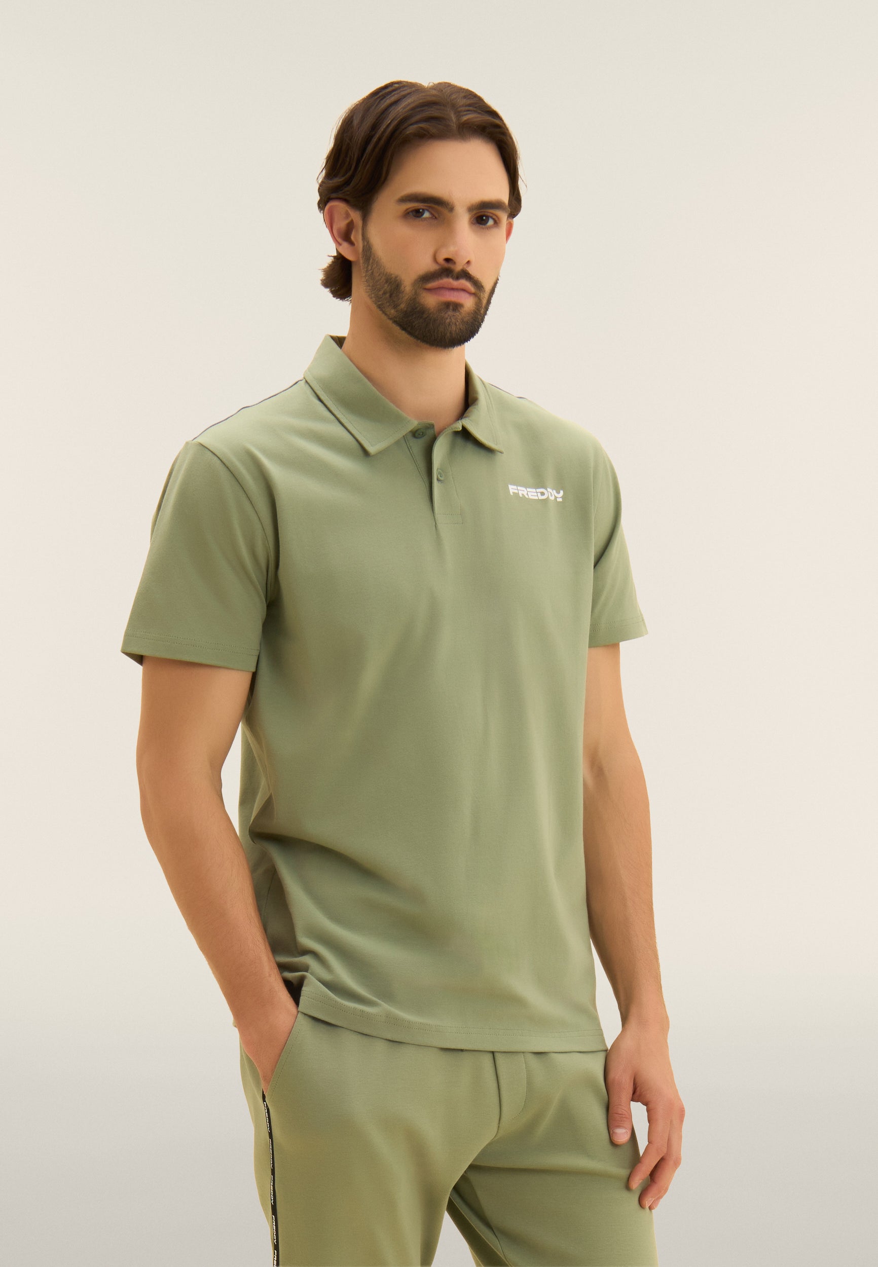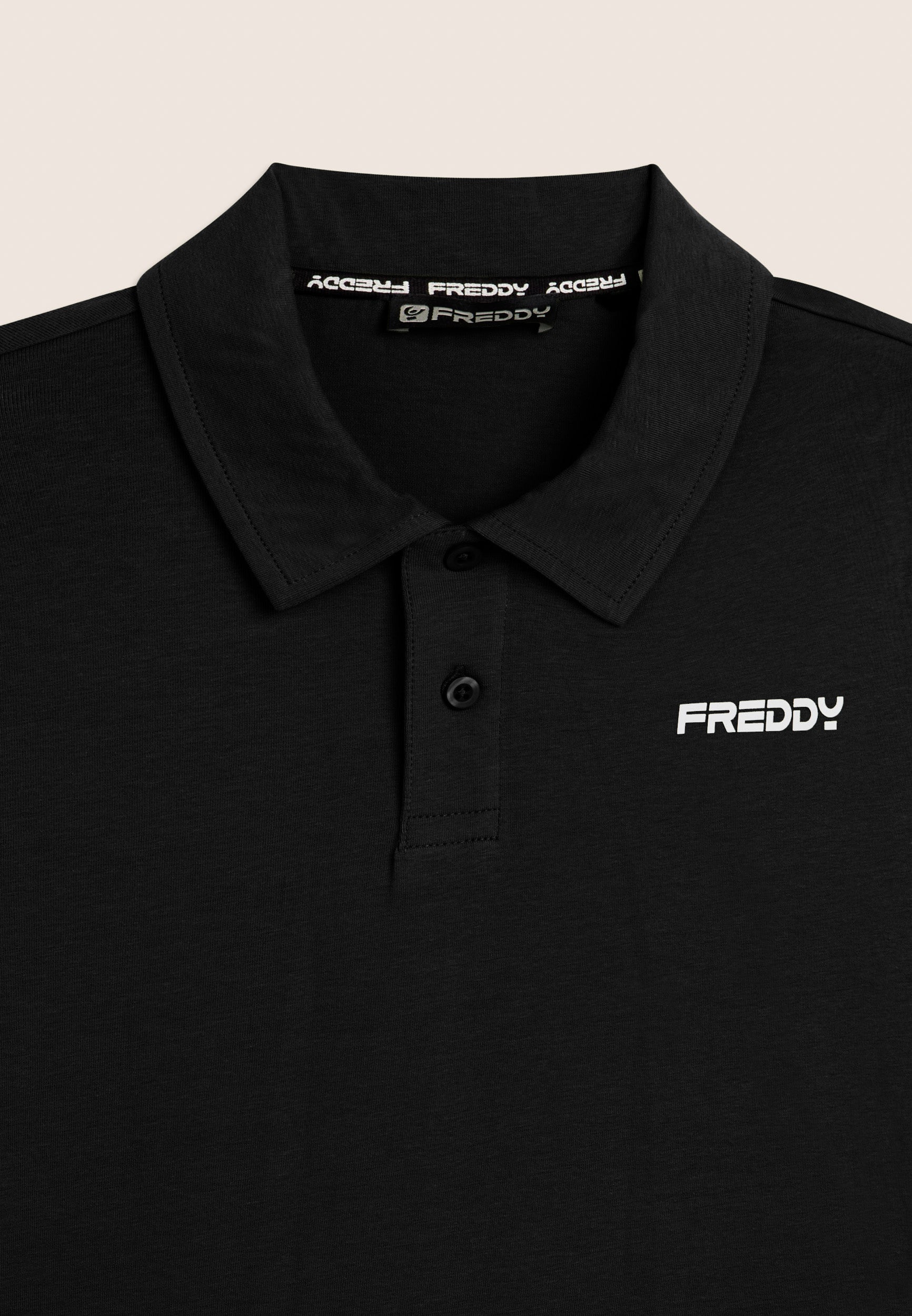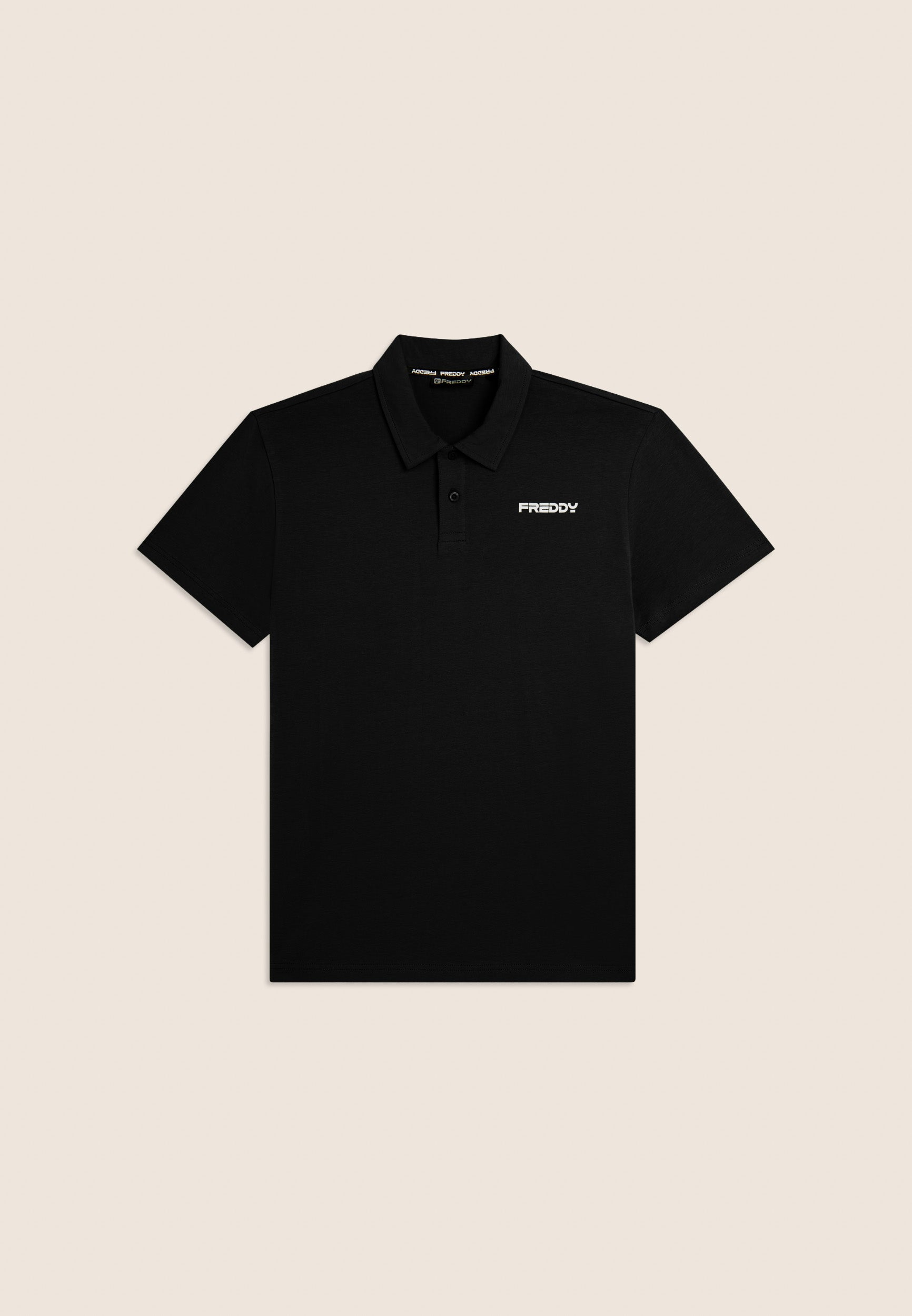 Polo a manica corta in heavy jersey stretch, pensata per un look casual ma curato. Vestibilità e lunghezza regular, fondo dritto, scollo polo con colletto a camicia e chiusura a due bottoni a occhiello. Sul cuore è presente una piccola stampa del logo FREDDY effetto gommato opaco. Essenziale e raffinata, perfetta anche fuori dalla palestra.