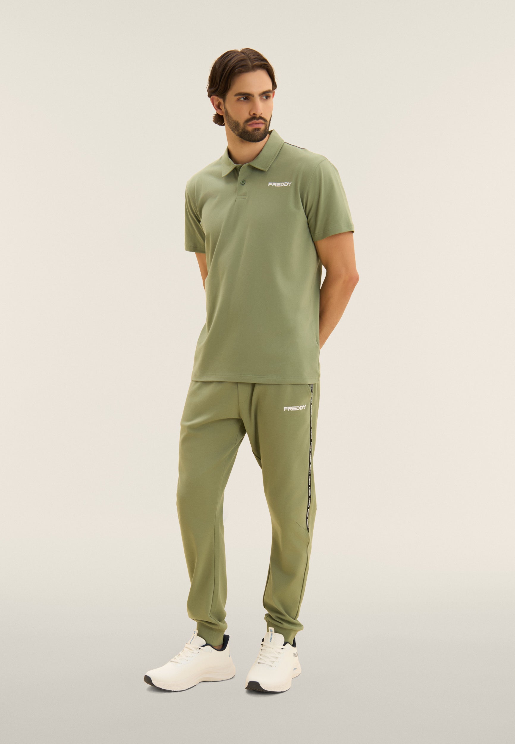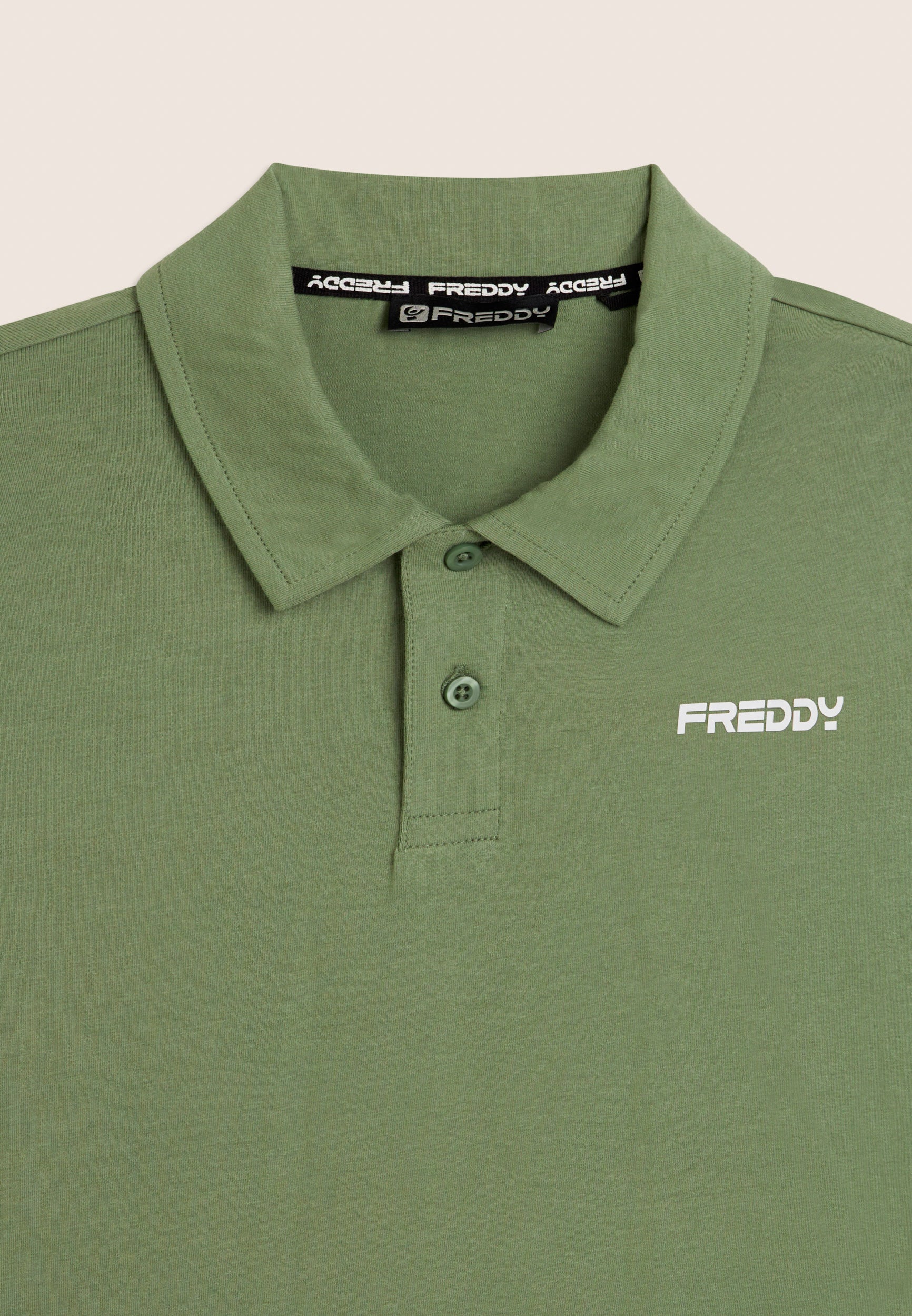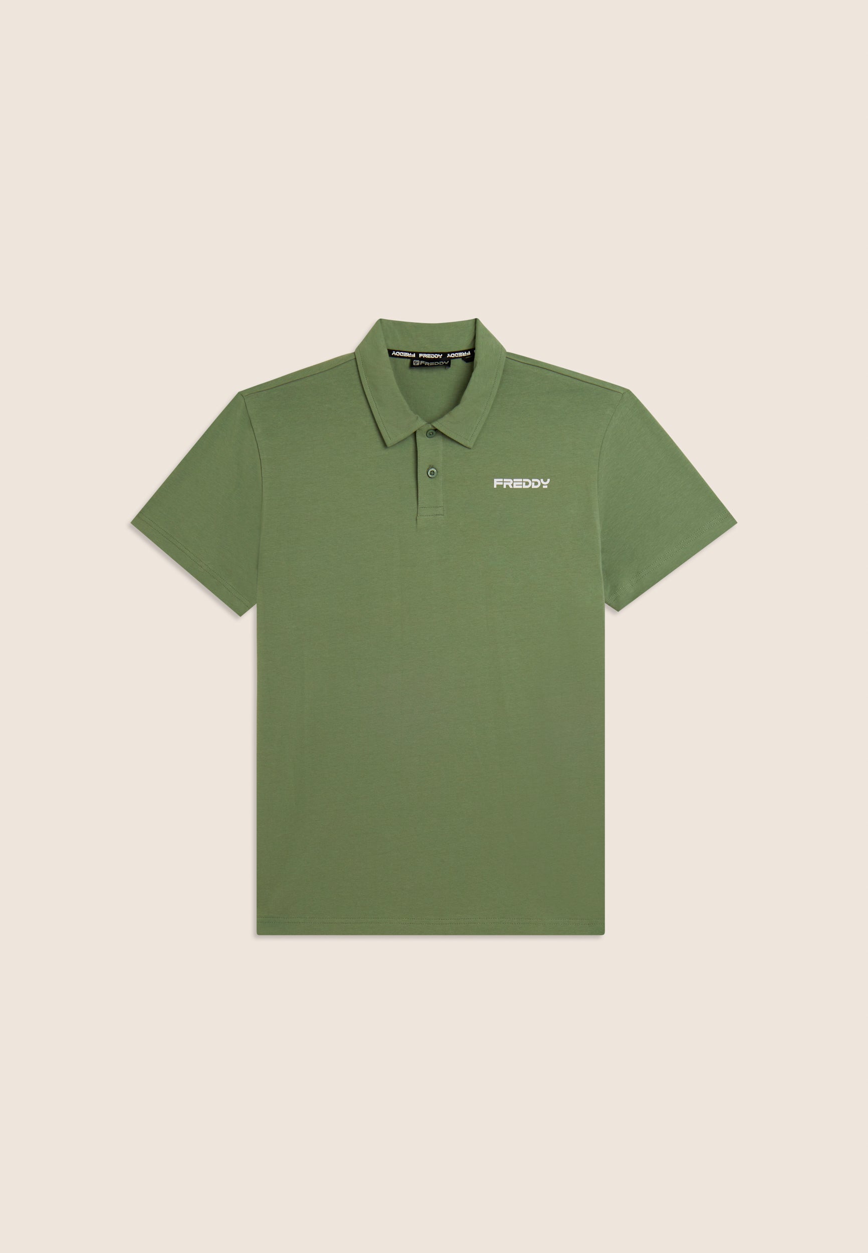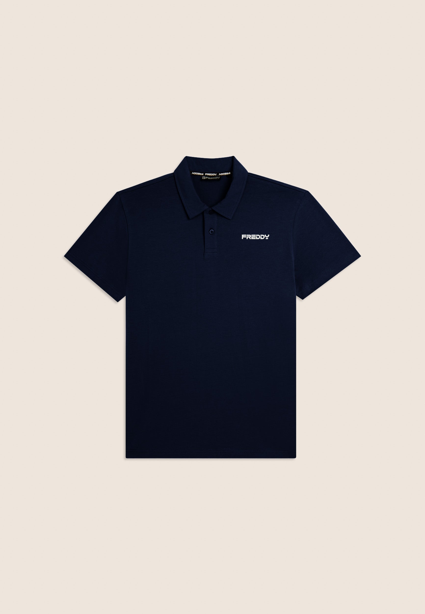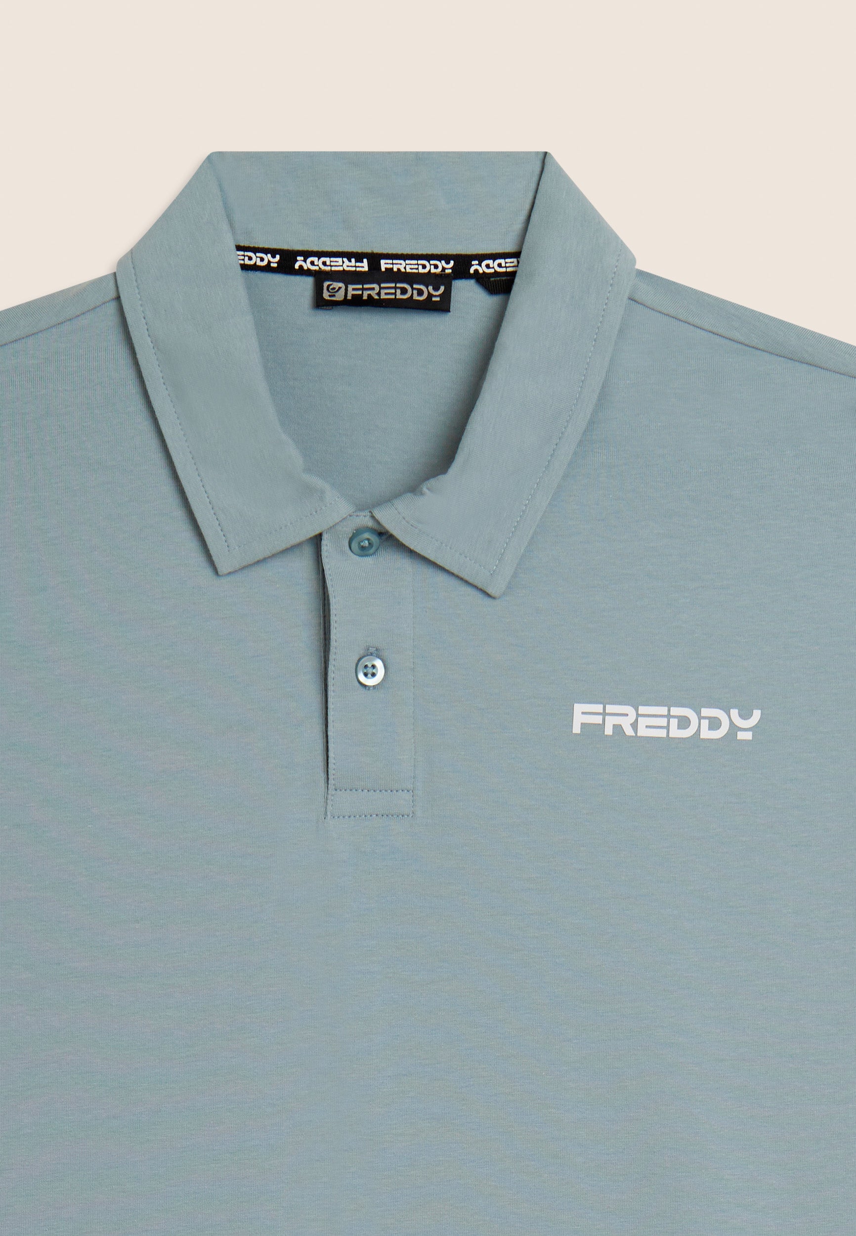 Polo a manica corta in heavy jersey stretch, pensata per un look casual ma curato. Vestibilità e lunghezza regular, fondo dritto, scollo polo con colletto a camicia e chiusura a due bottoni a occhiello. Sul cuore è presente una piccola stampa del logo FREDDY effetto gommato opaco. Essenziale e raffinata, perfetta anche fuori dalla palestra.