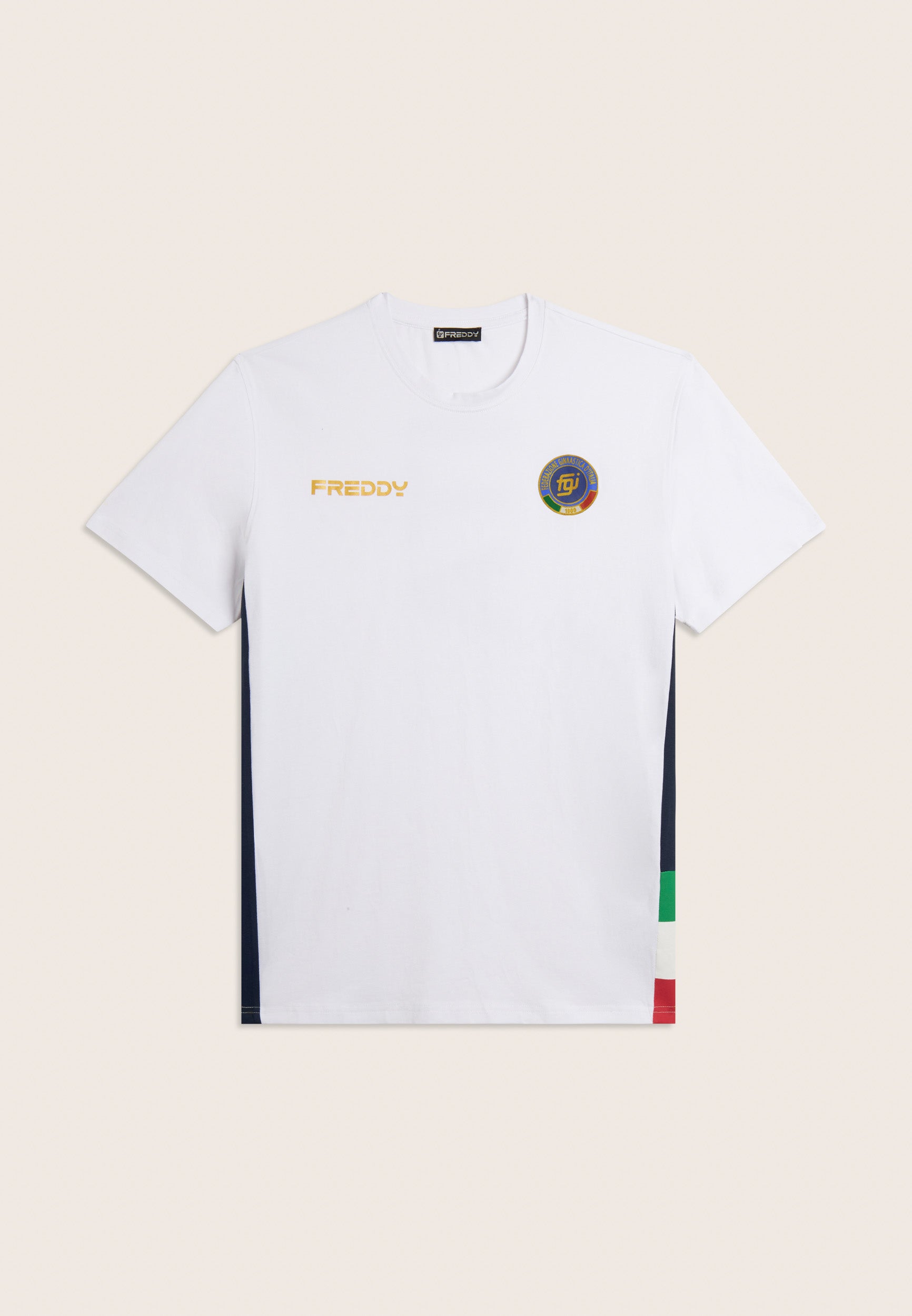 Un'esplosione di energia azzurra per questa t-shirt bianca replica ufficiale della Federazione Ginnastica d’Italia.