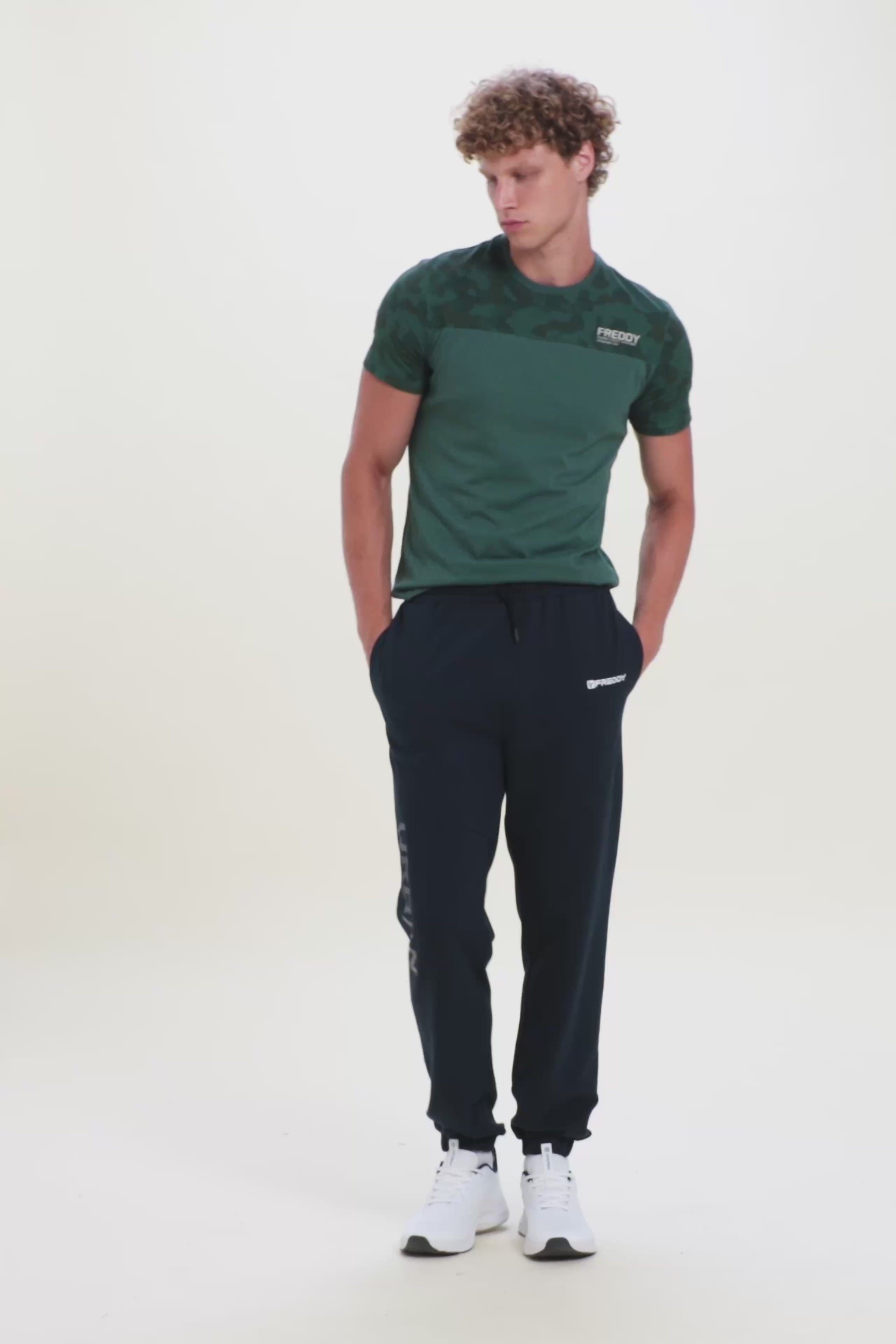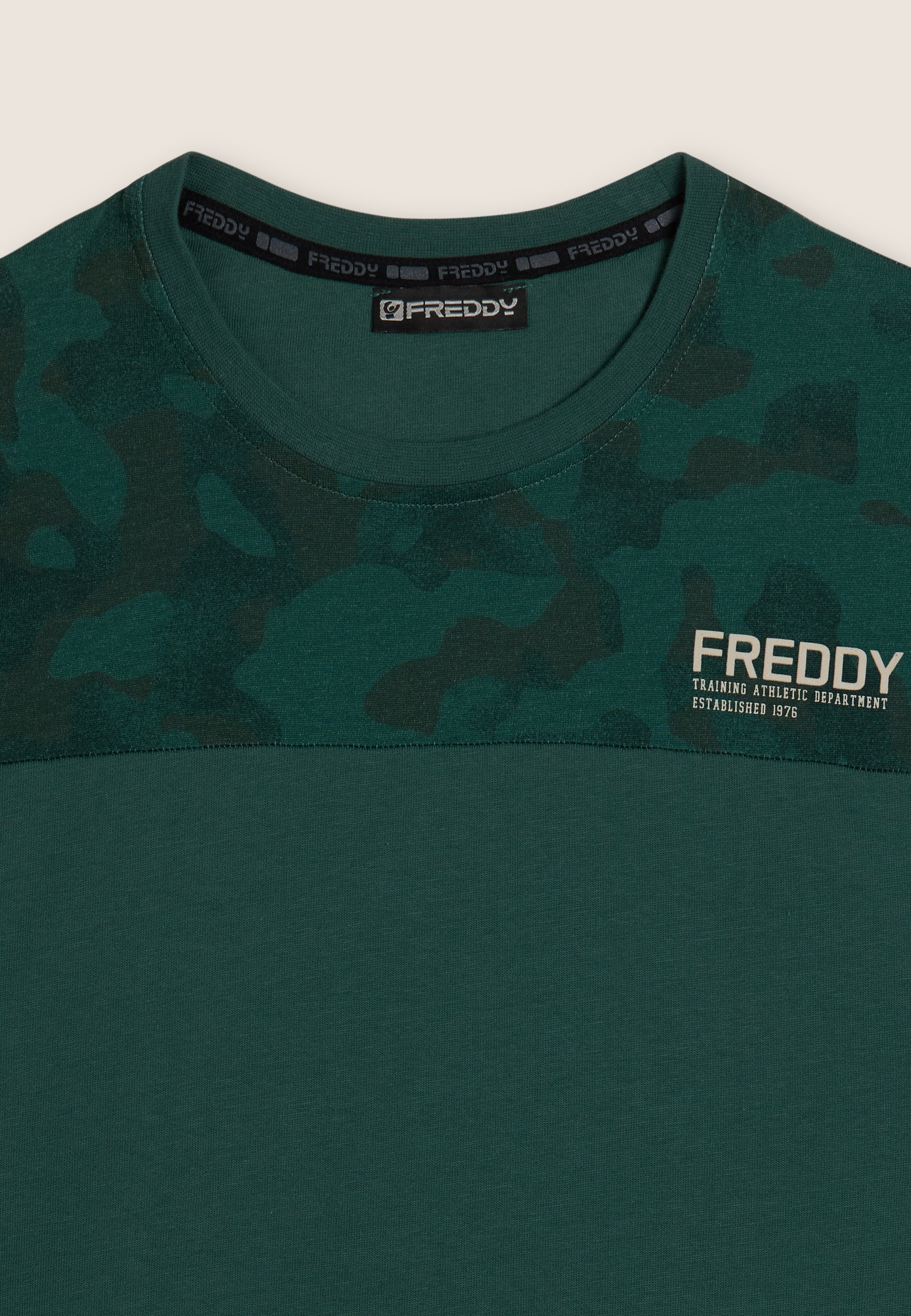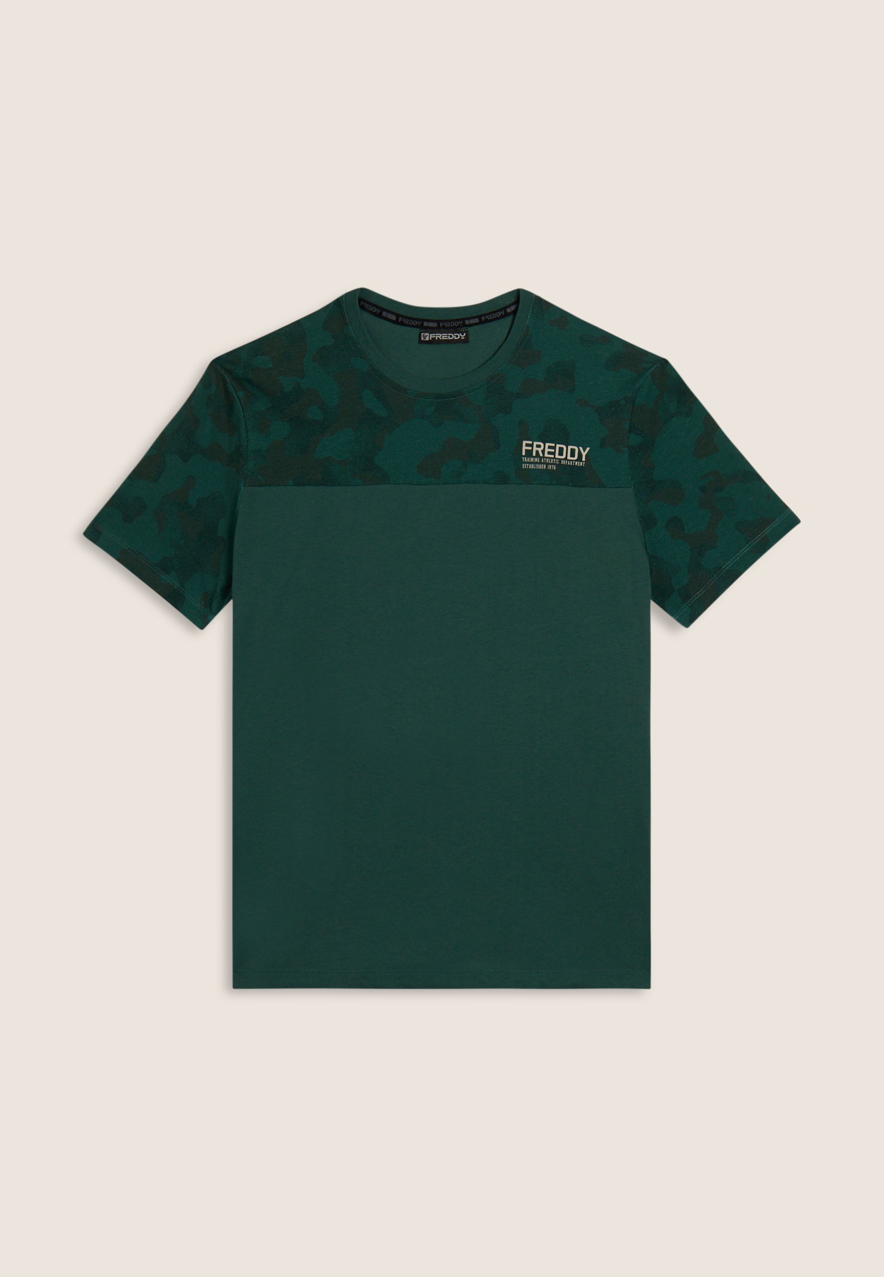 T-shirt in jersey 100% cotone con fantasia camouflage e vestibilità regular. Il fondo dritto e le maniche corte si uniscono a uno scollo girocollo per un comfort quotidiano. Il logo FREDDY è stampato sul cuore, mentre la parte bassa del busto è in tessuto monocolore per un effetto grafico a contrasto.