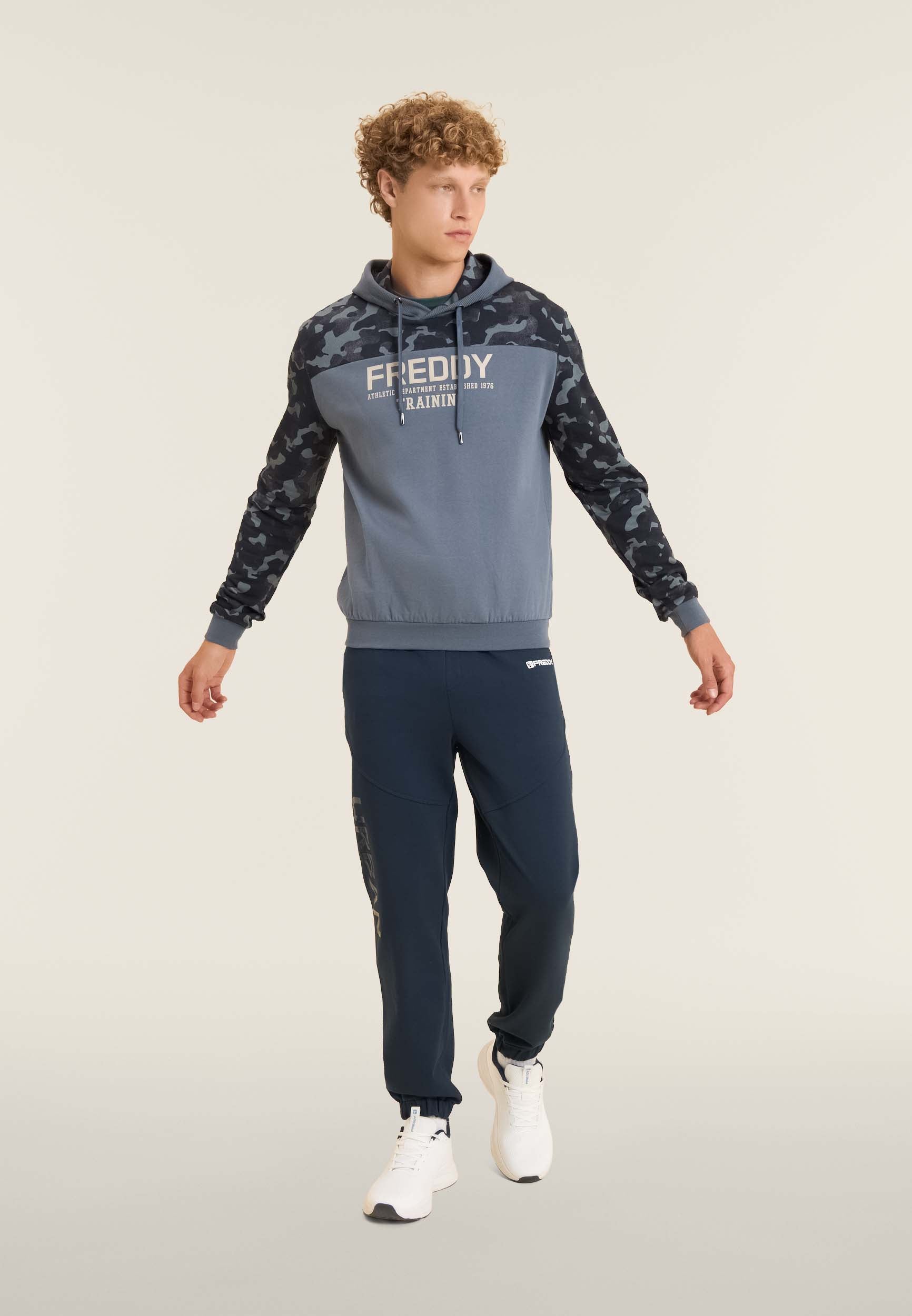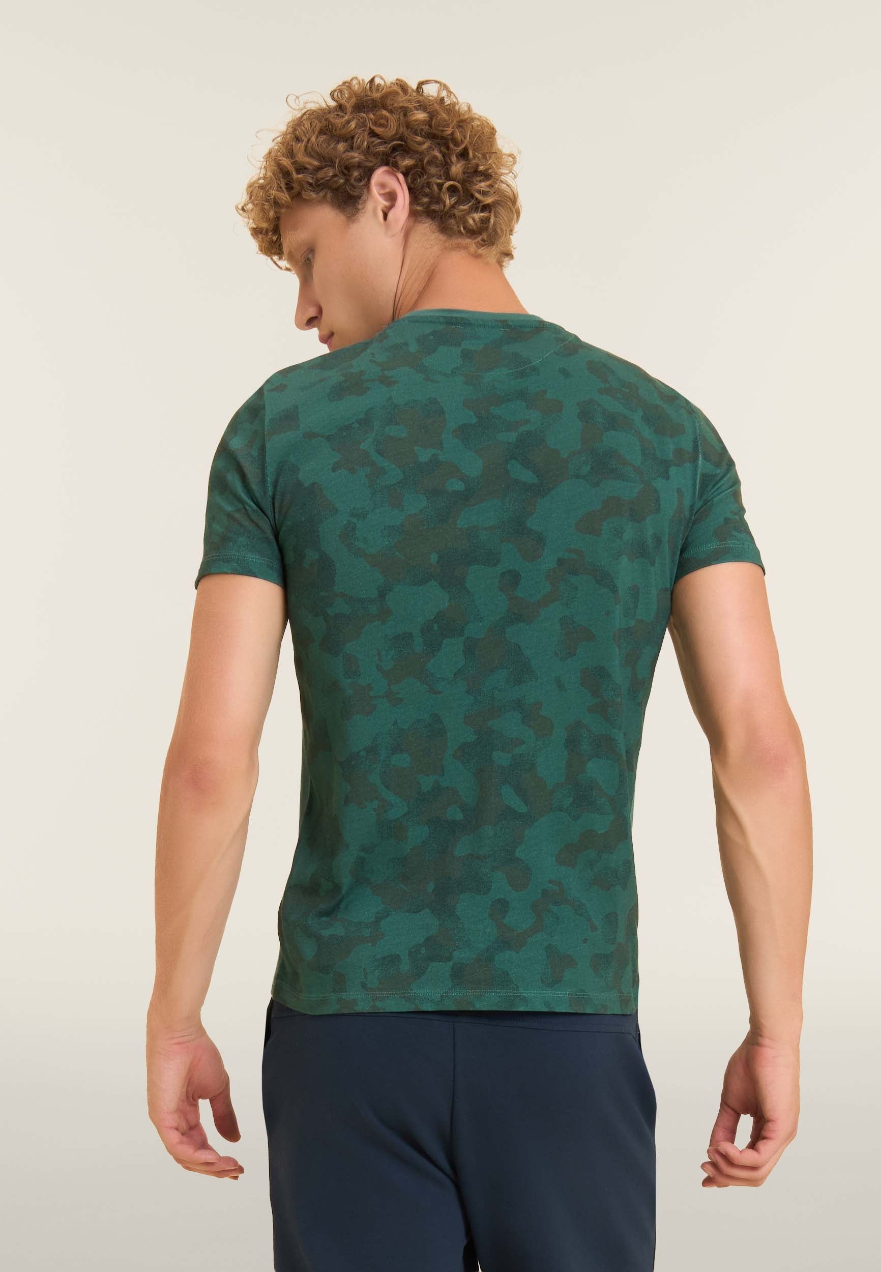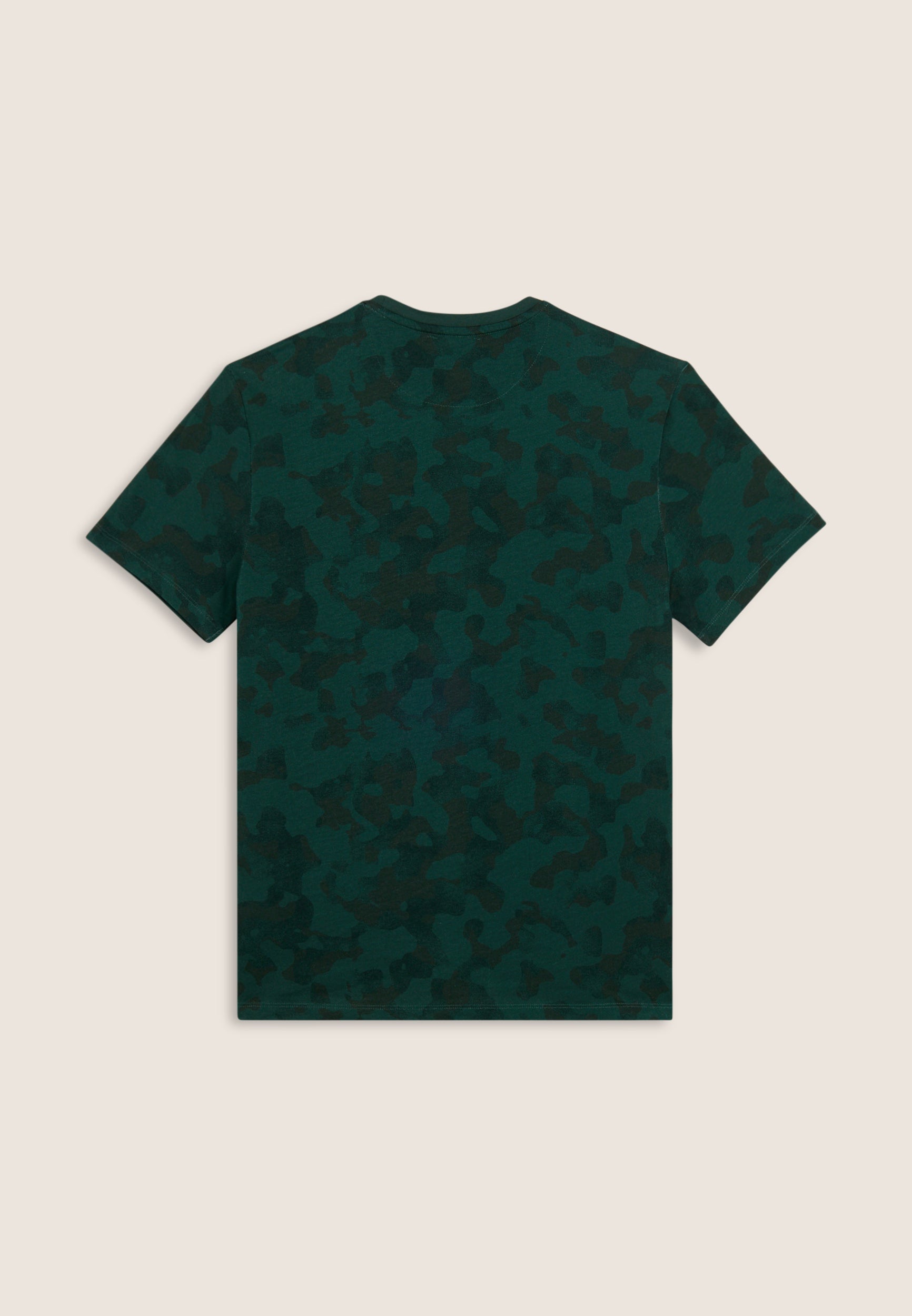 T-shirt in jersey 100% cotone con fantasia camouflage e vestibilità regular. Il fondo dritto e le maniche corte si uniscono a uno scollo girocollo per un comfort quotidiano. Il logo FREDDY è stampato sul cuore, mentre la parte bassa del busto è in tessuto monocolore per un effetto grafico a contrasto.