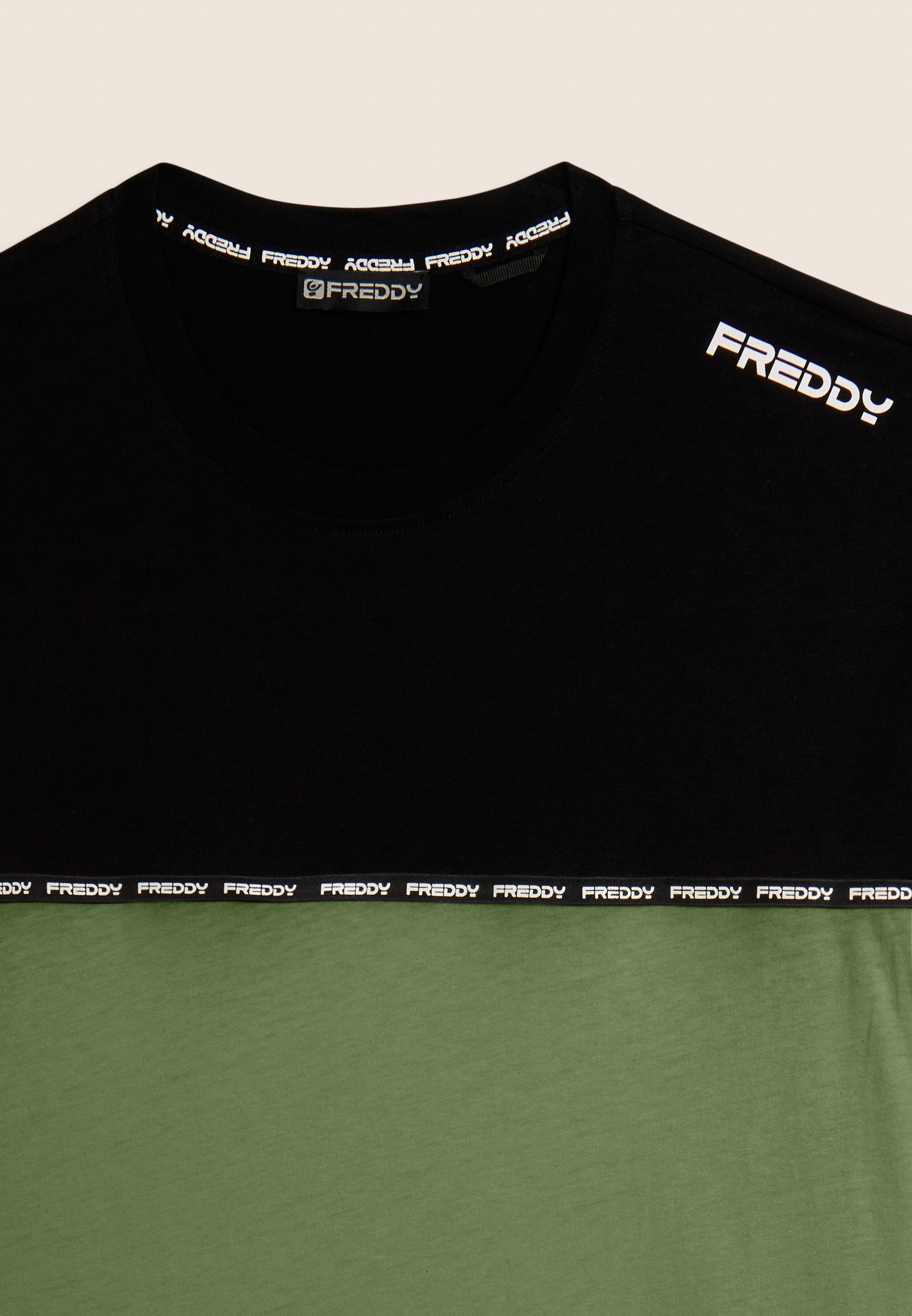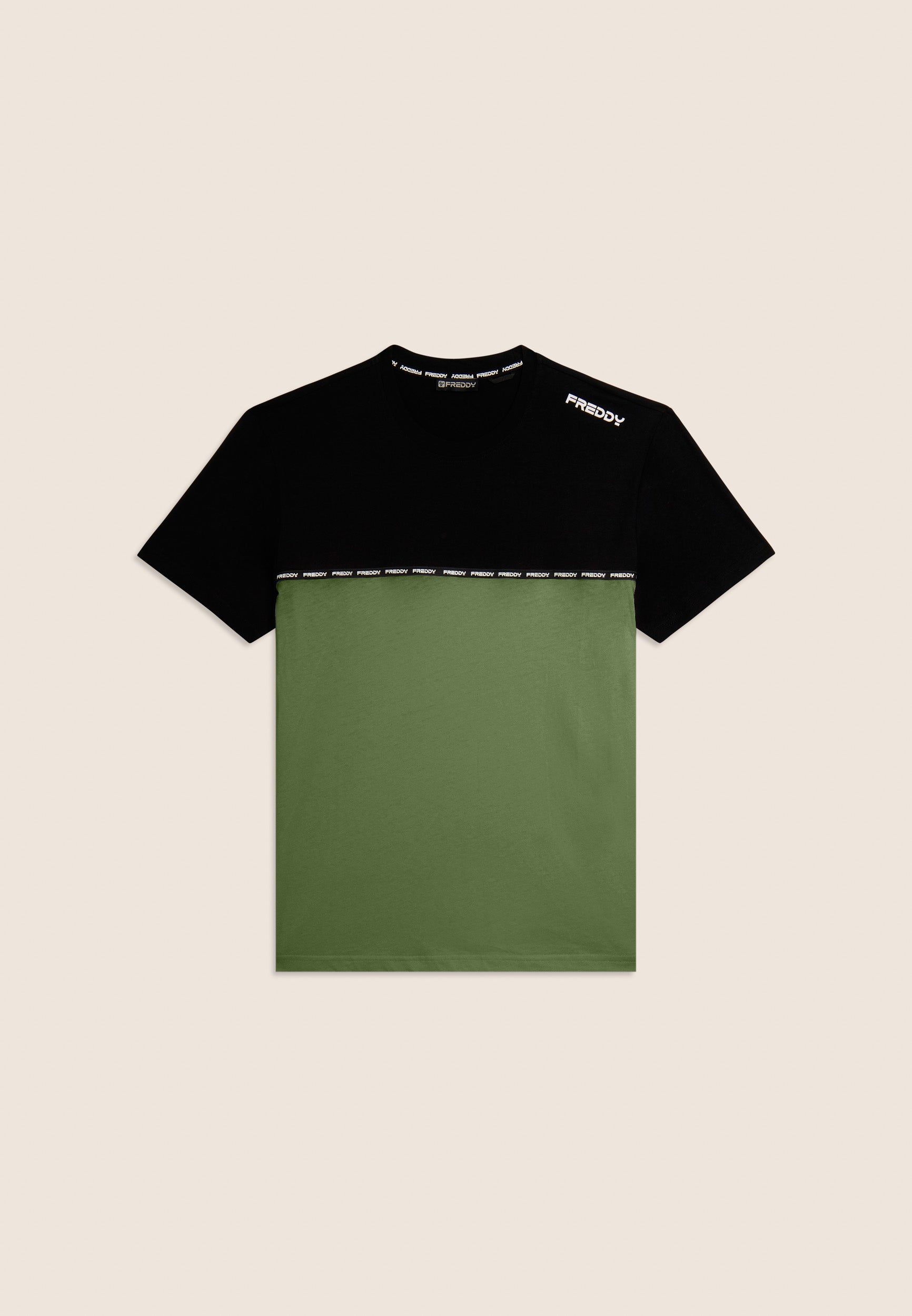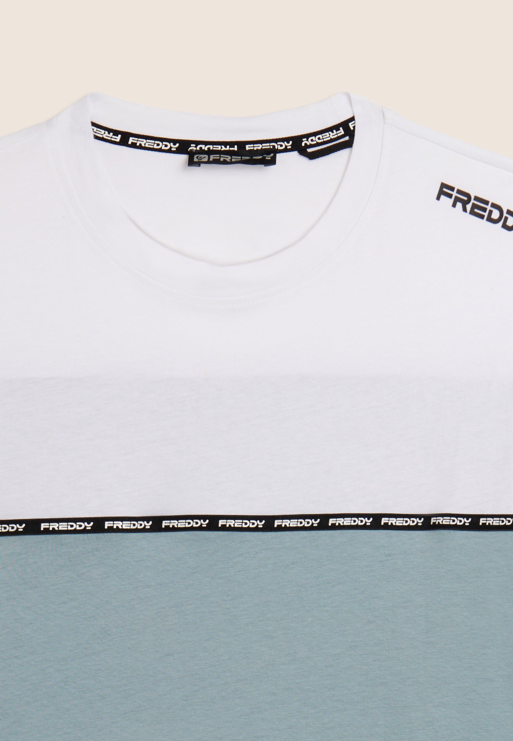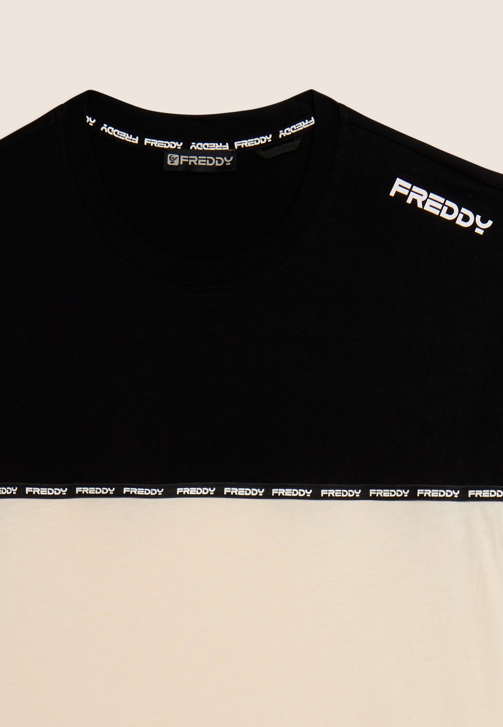 T-shirt a manica corta in jersey 100% cotone con design colour block. La parte superiore è separata da quella inferiore tramite un inserto elastico nero decorato dal logo FREDDY bianco ripetuto. Vestibilità e lunghezza regular, fondo dritto, maniche corte e scollo girocollo. Una stampa del logo FREDDY effetto gommato opaco è posizionata sulla spalla sinistra. Un mix equilibrato tra stile e semplicità.