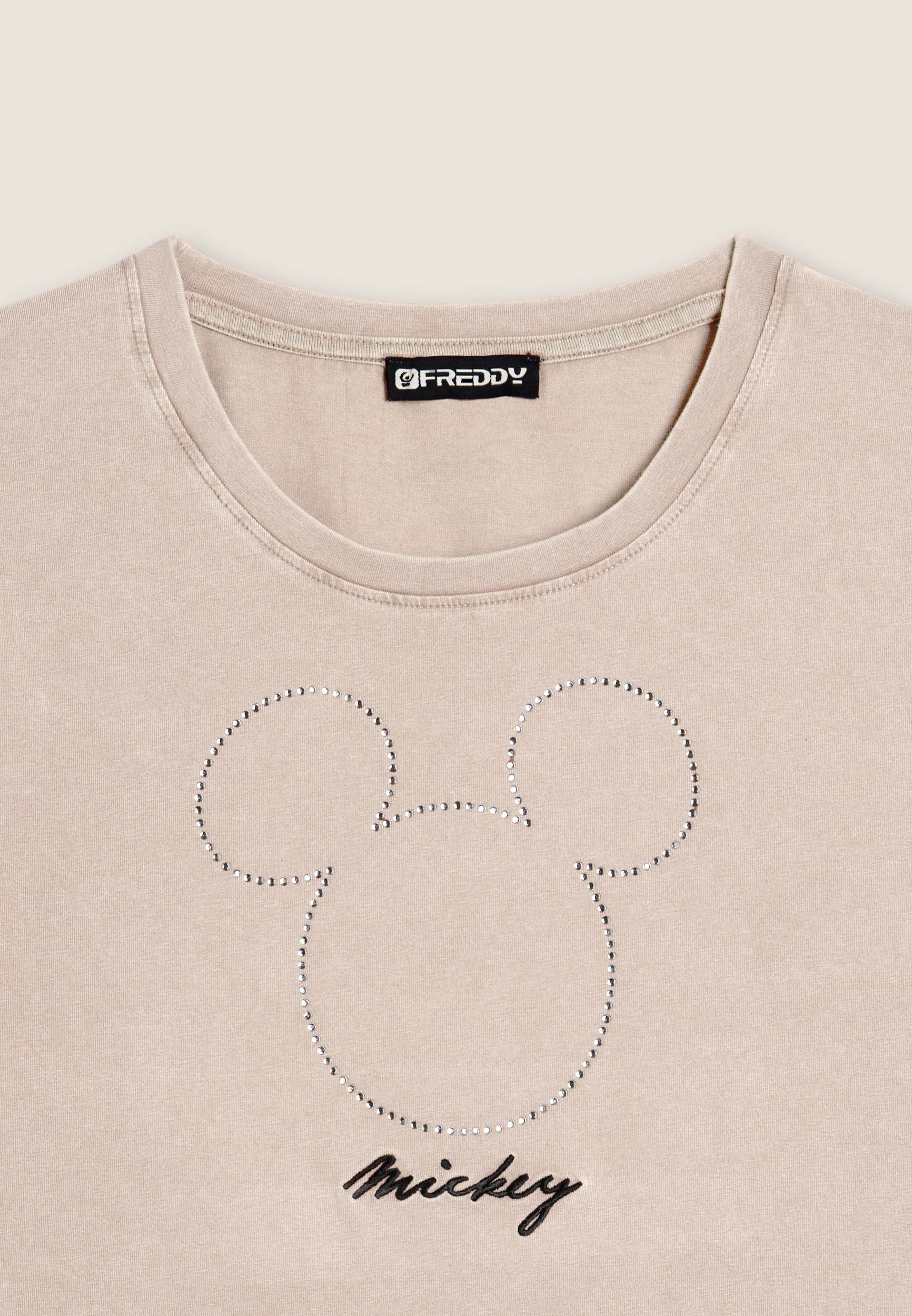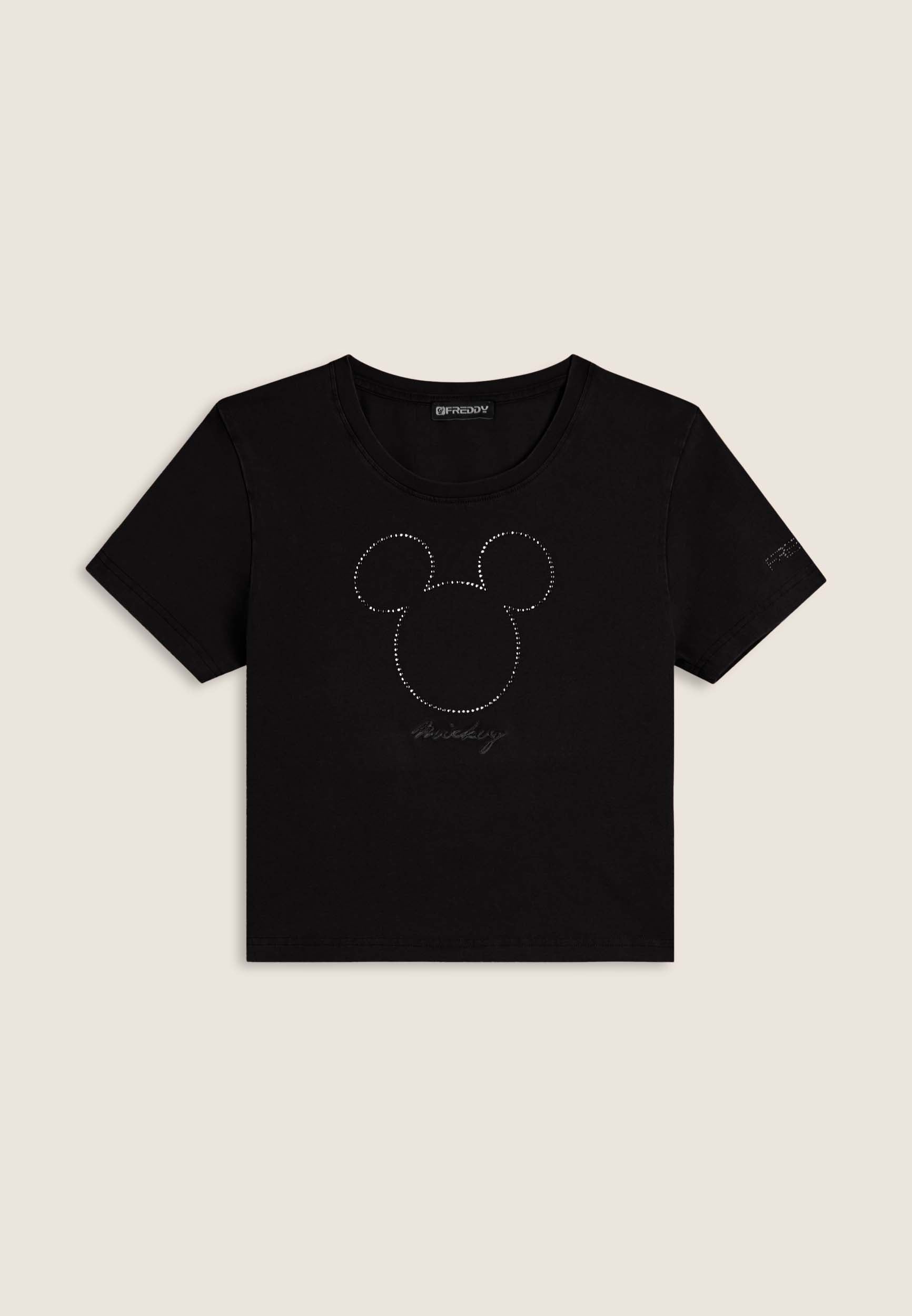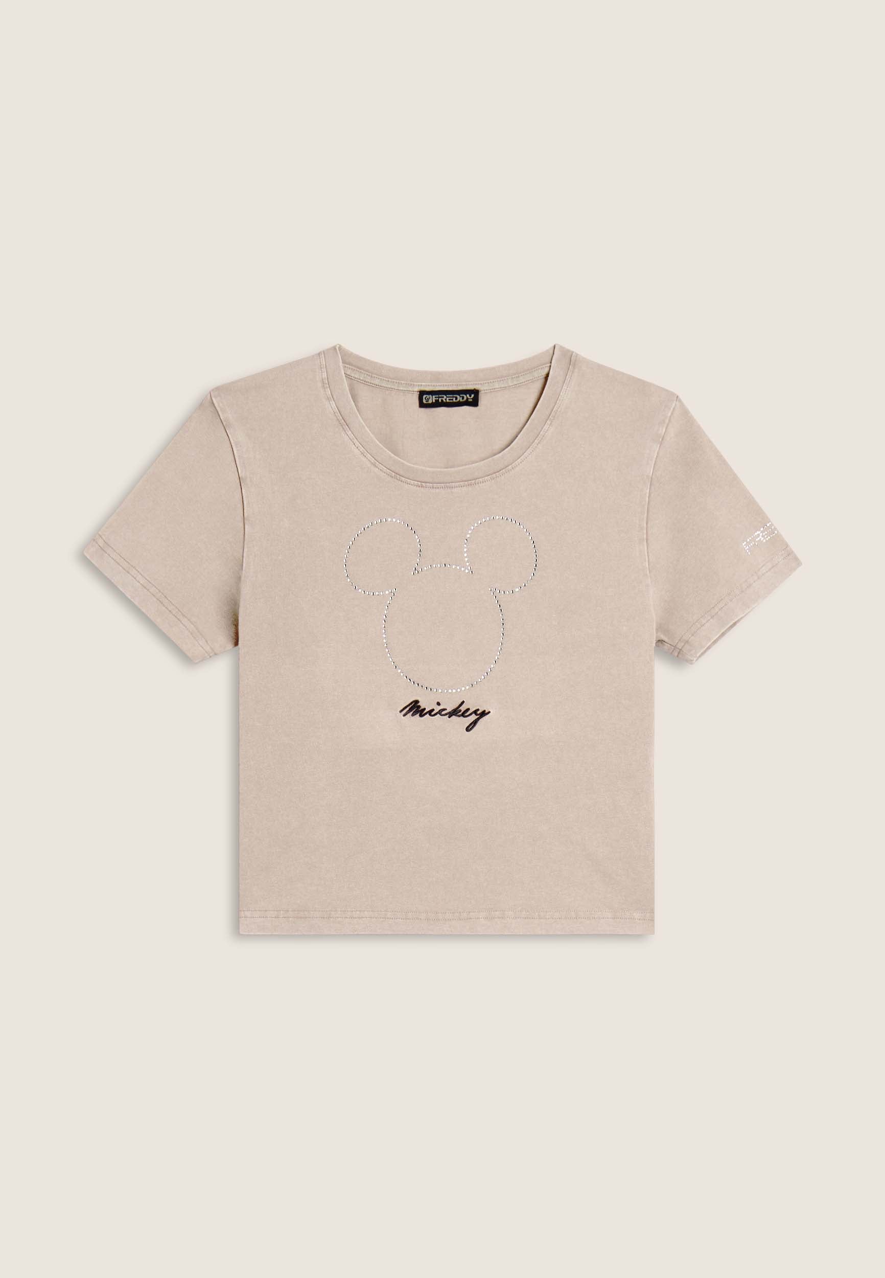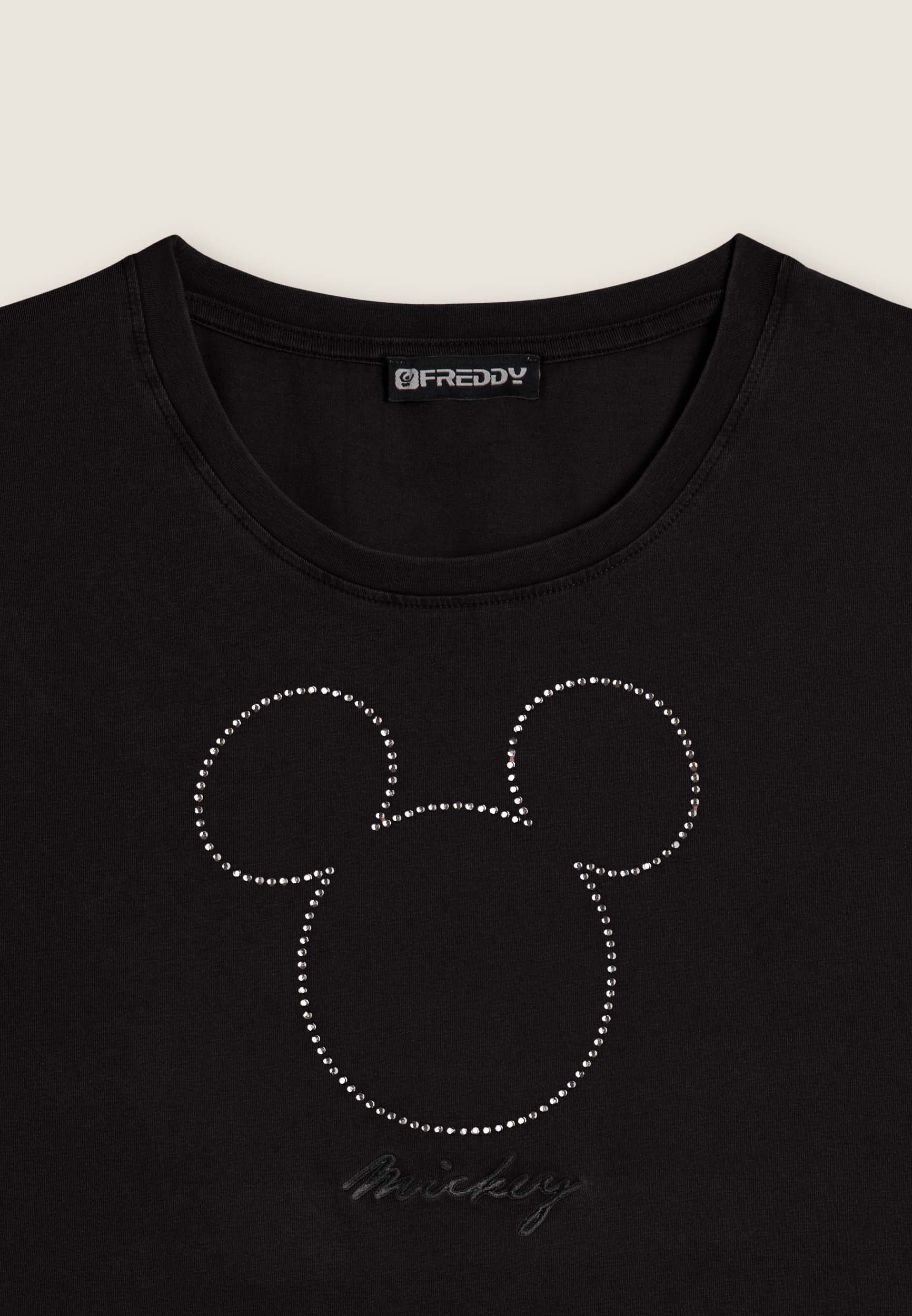 T-shirt da donna cropped, realizzata in jersey di cotone elasticizzato con trattamento acid wash effect, che dona un aspetto vissuto e sfumature di colore uniche. Il taglio è slim, con fondo dritto, scollo tondo e maniche corte. La grande grafica frontale composta da strass raffigura Mickey Mouse, mentre il retro è firmato da un piccolo logo Disney e il logo FREDDY compare sul fondo manica.