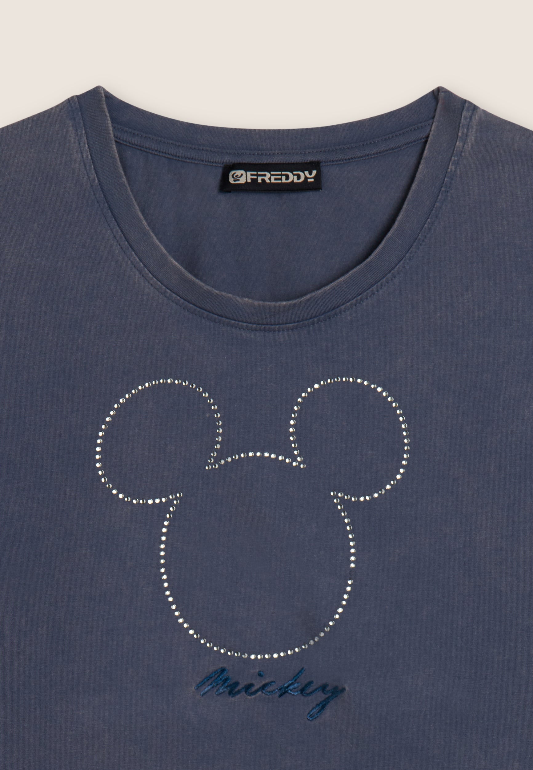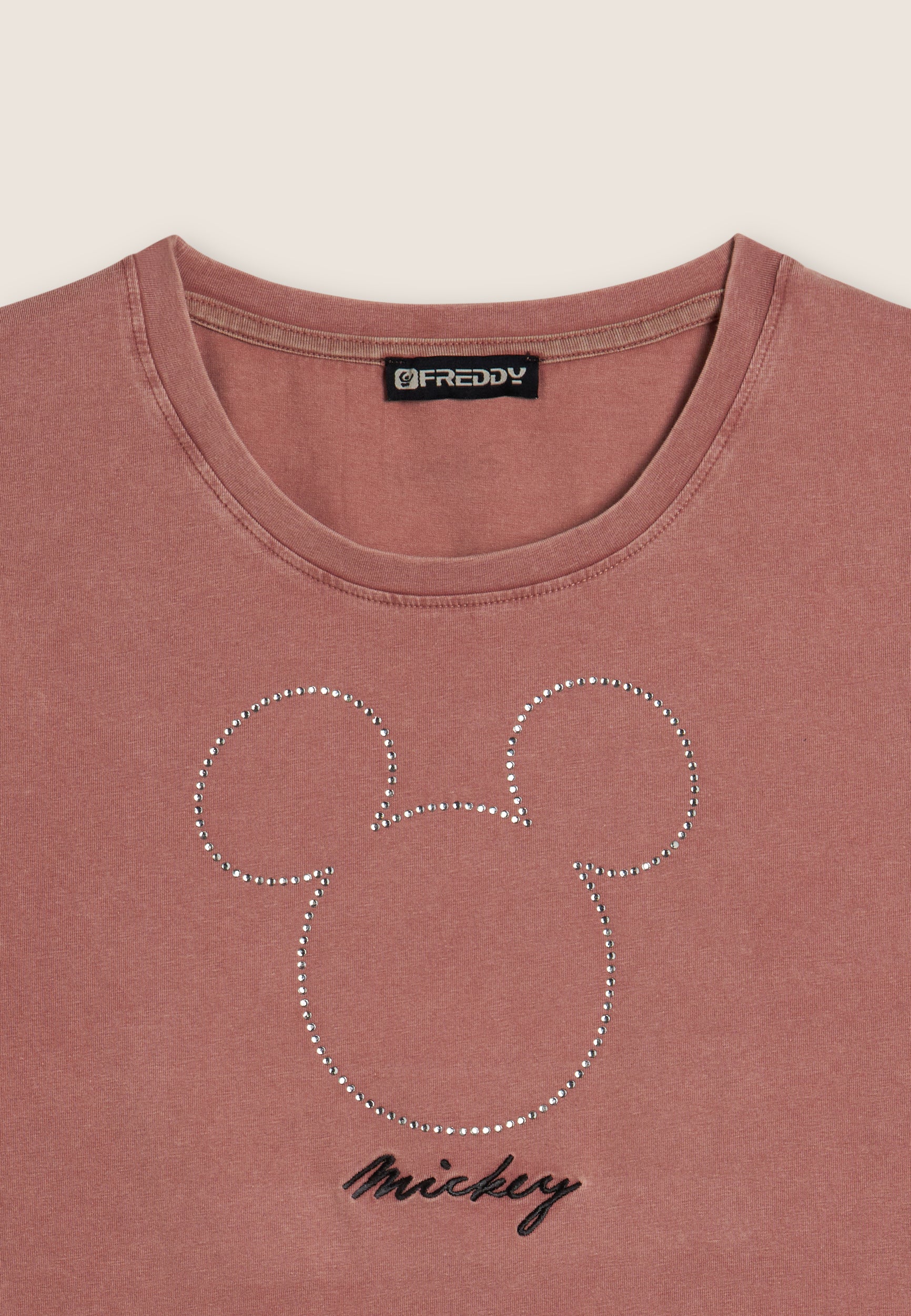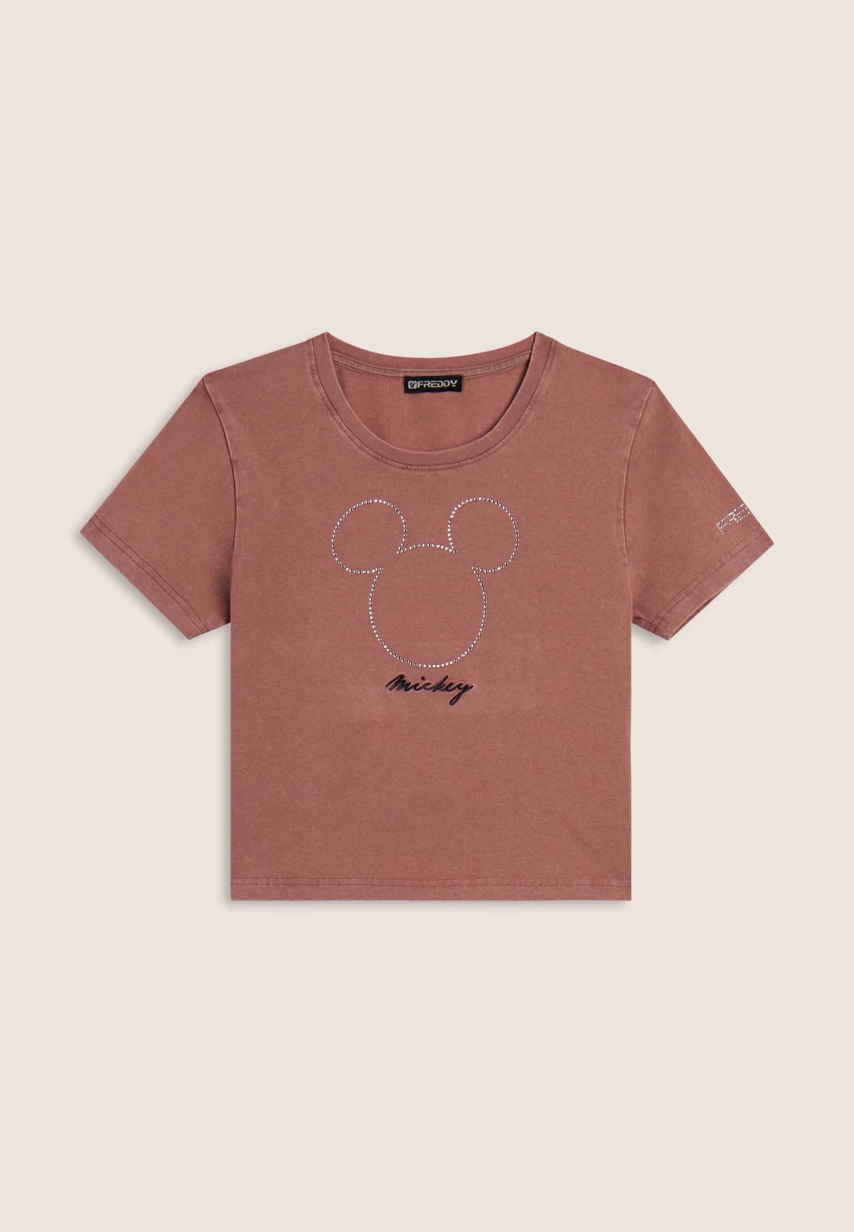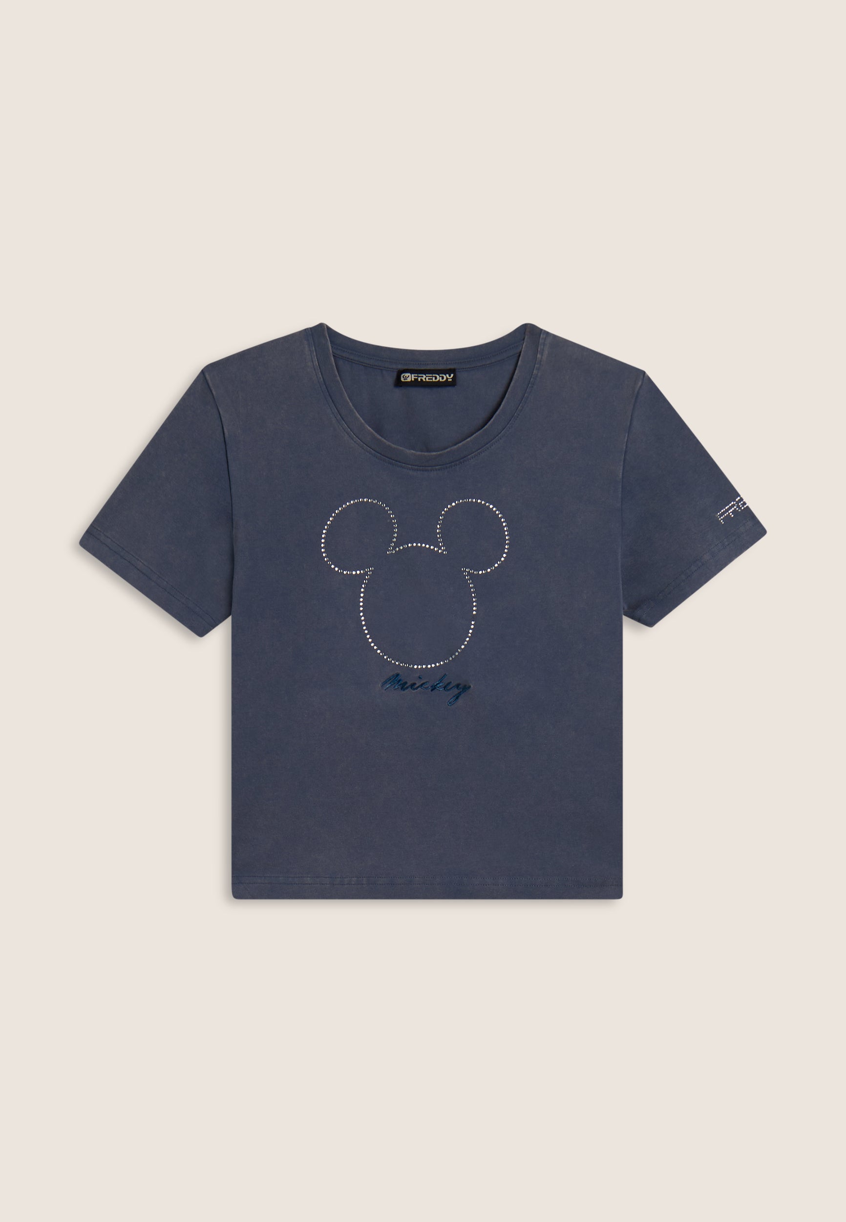 T-shirt da donna cropped, realizzata in jersey di cotone elasticizzato con trattamento acid wash effect, che dona un aspetto vissuto e sfumature di colore uniche. Il taglio è slim, con fondo dritto, scollo tondo e maniche corte. La grande grafica frontale composta da strass raffigura Mickey Mouse, mentre il retro è firmato da un piccolo logo Disney e il logo FREDDY compare sul fondo manica.