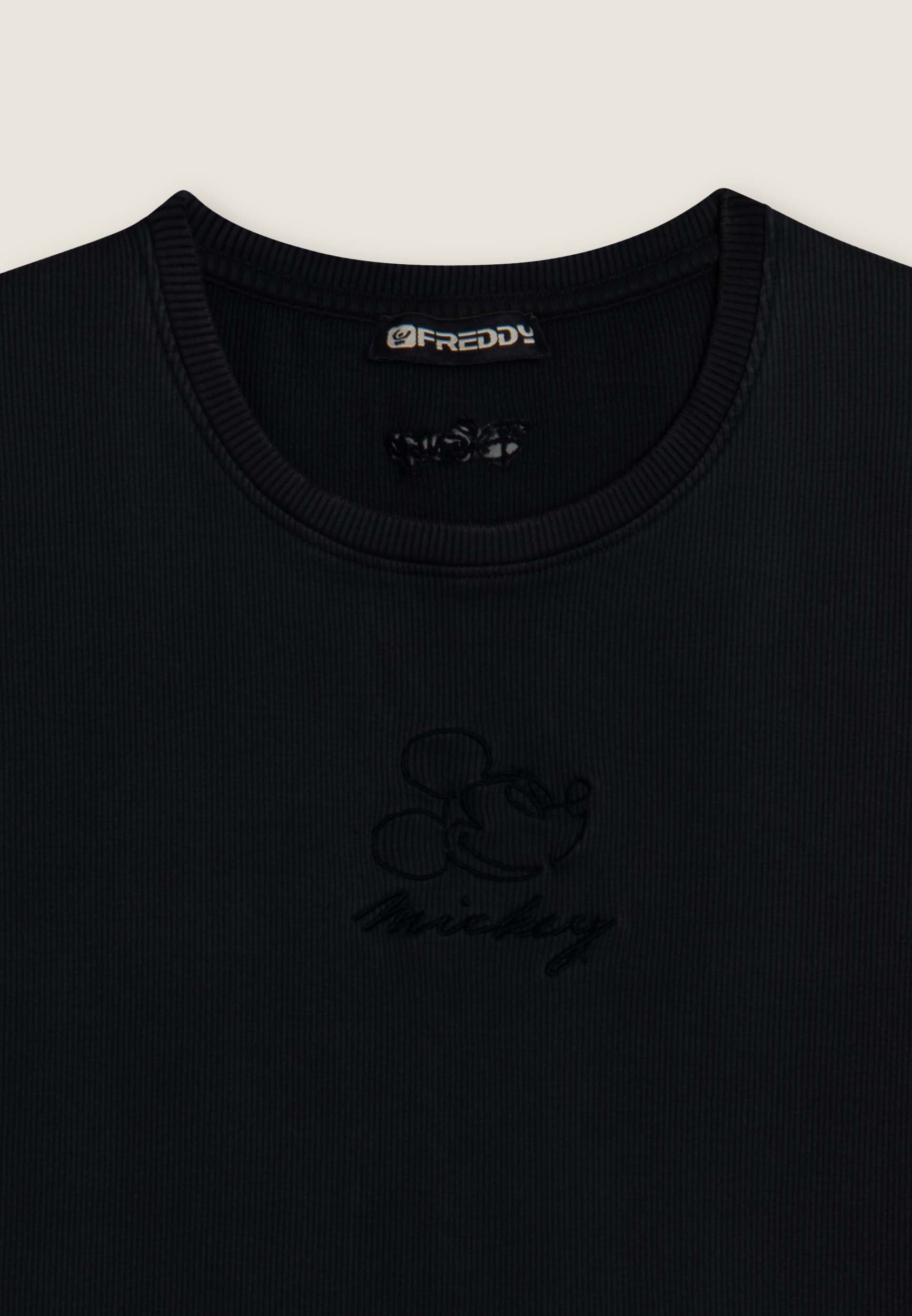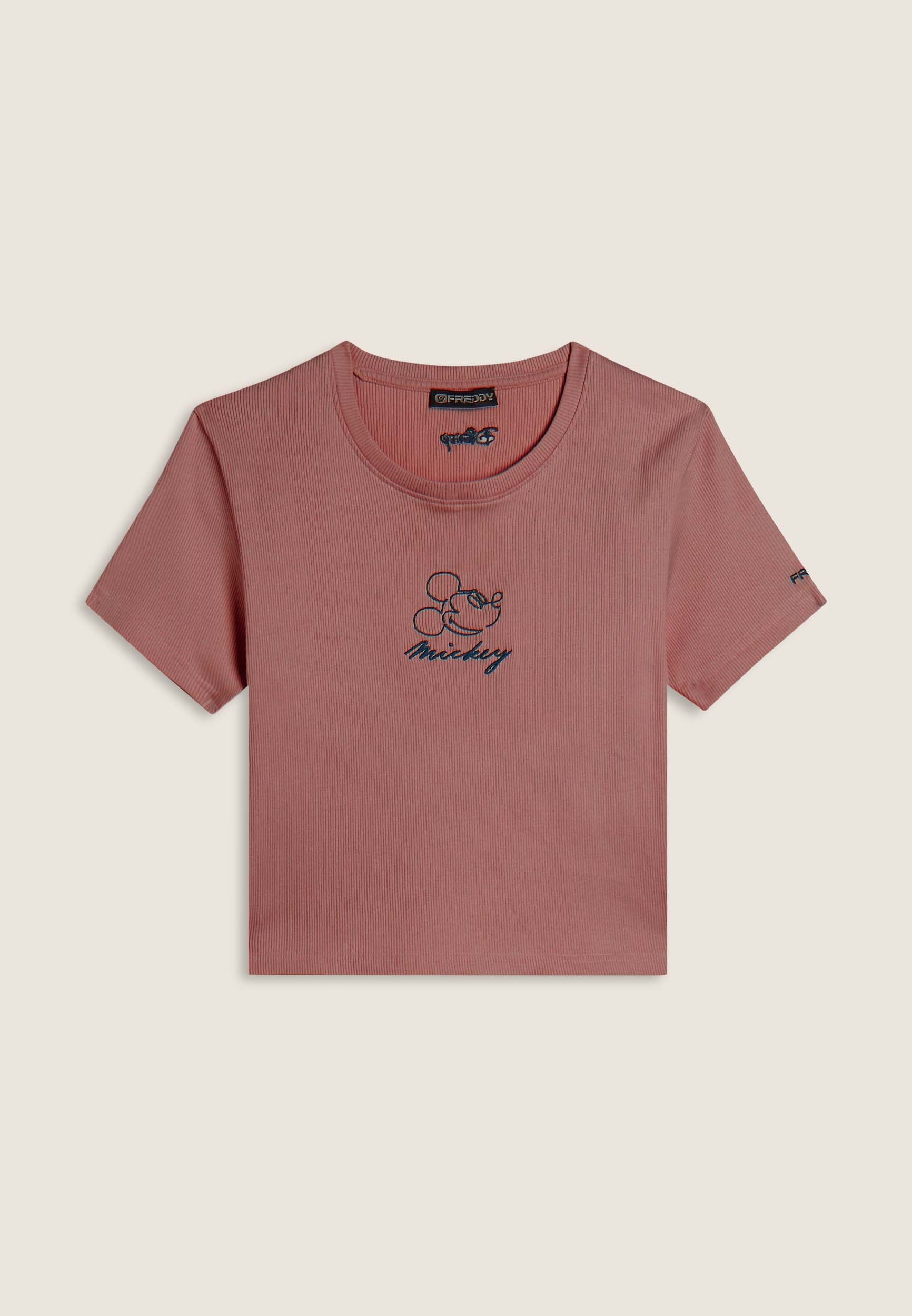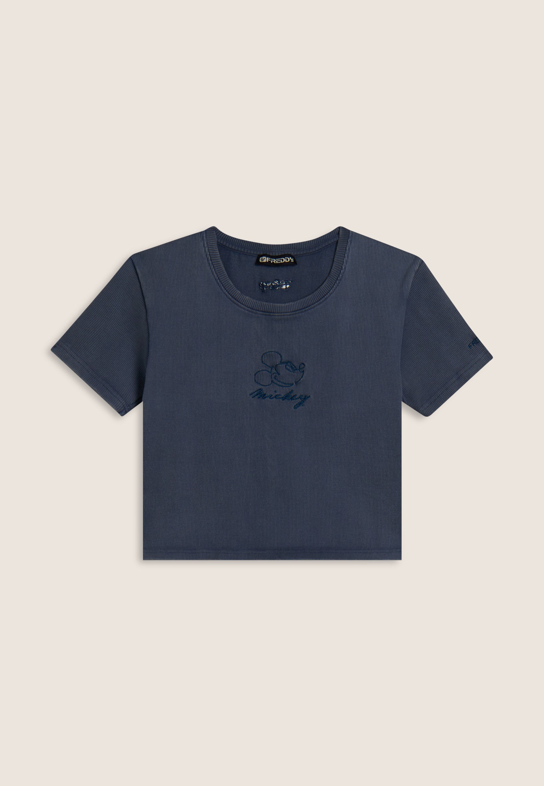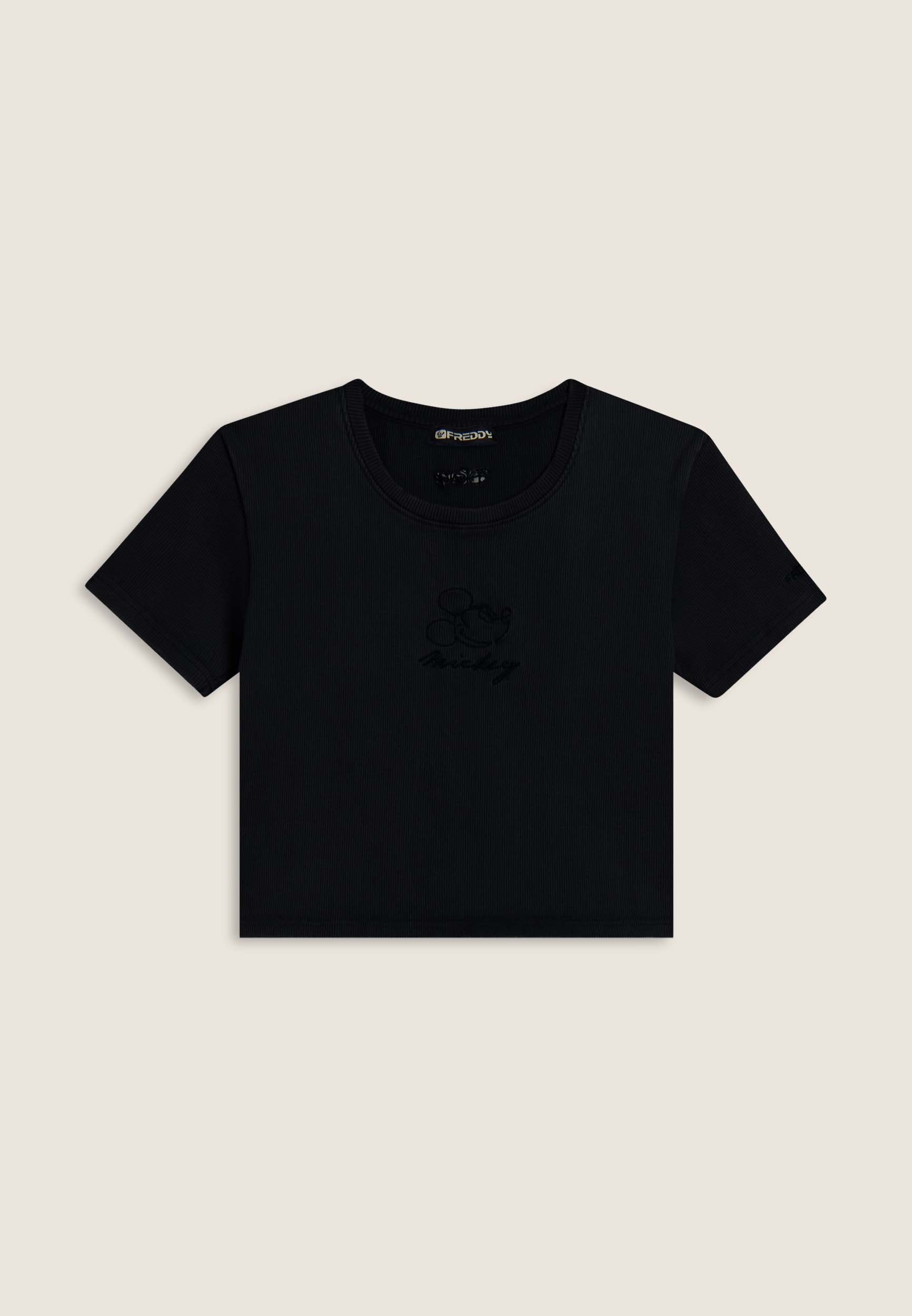 T-shirt cropped a manica corta da donna, in cotone a costine con trattamento acid wash effect, che dona carattere vissuto e sfumature originali. Ha una vestibilità slim, fondo dritto e scollo tondo. Il fronte è decorato con Mickey Mouse ricamato in tono colore, mentre sul fondo e sulla manica compaiono i loghi Disney e FREDDY, anch’essi ricamati.