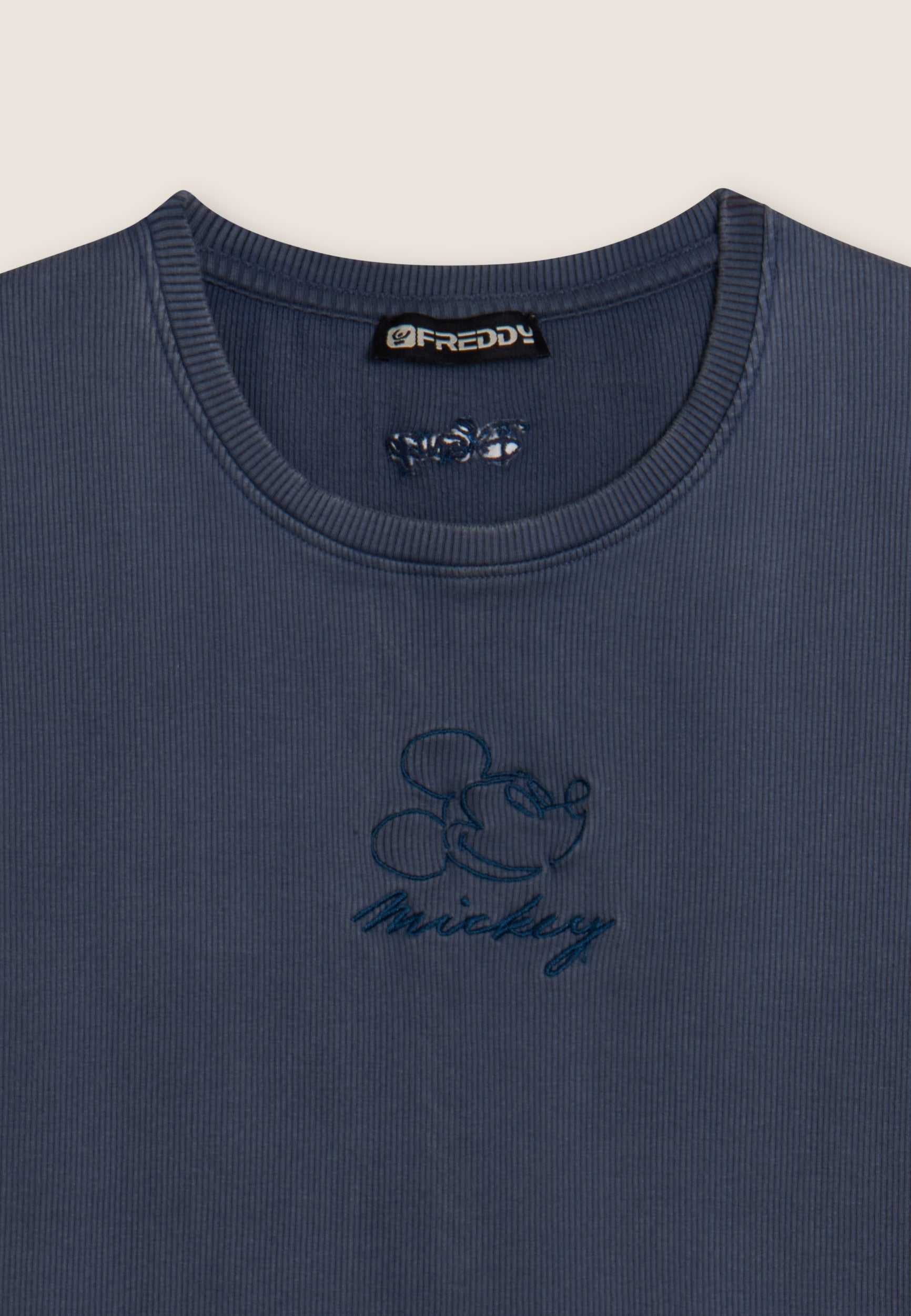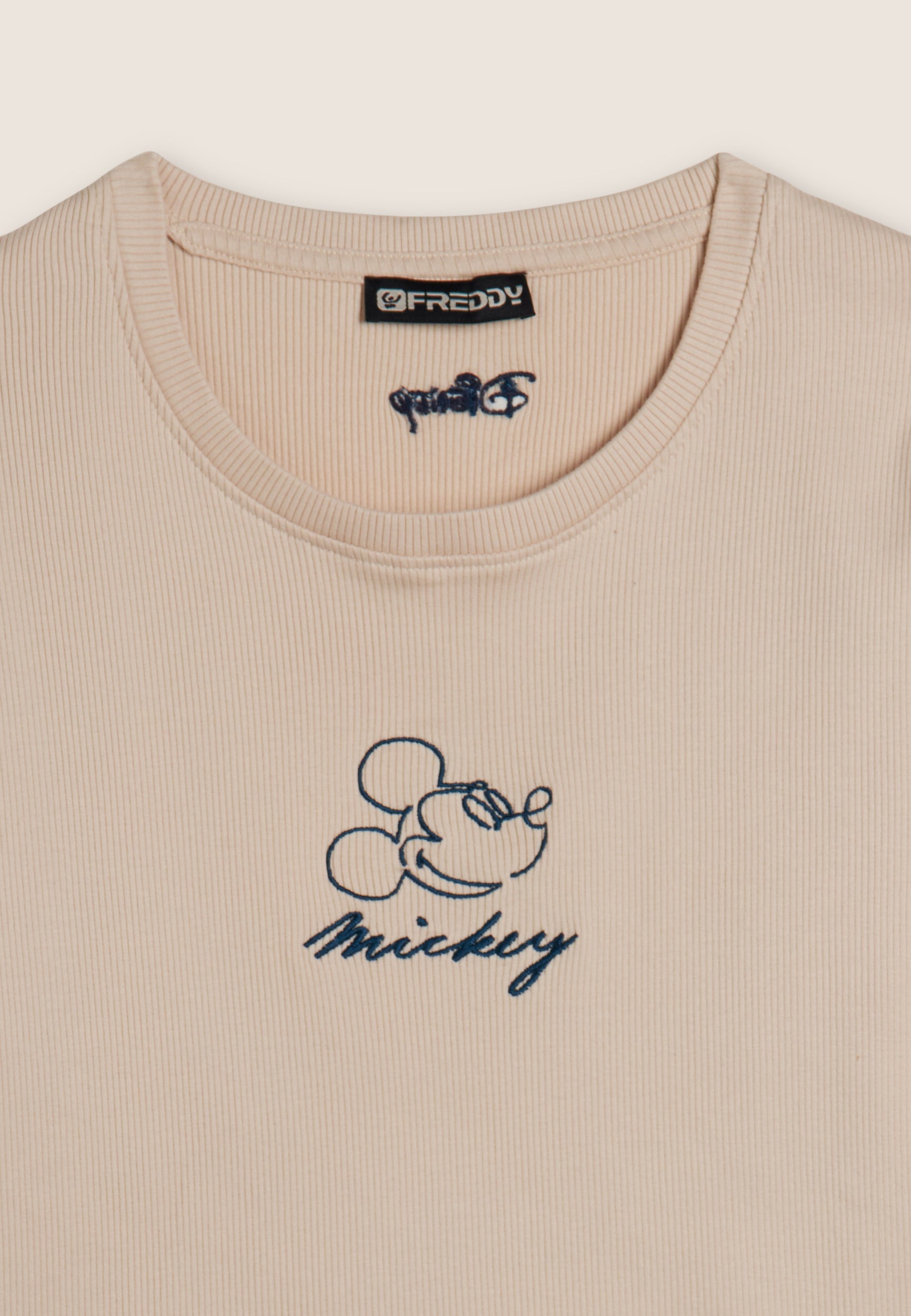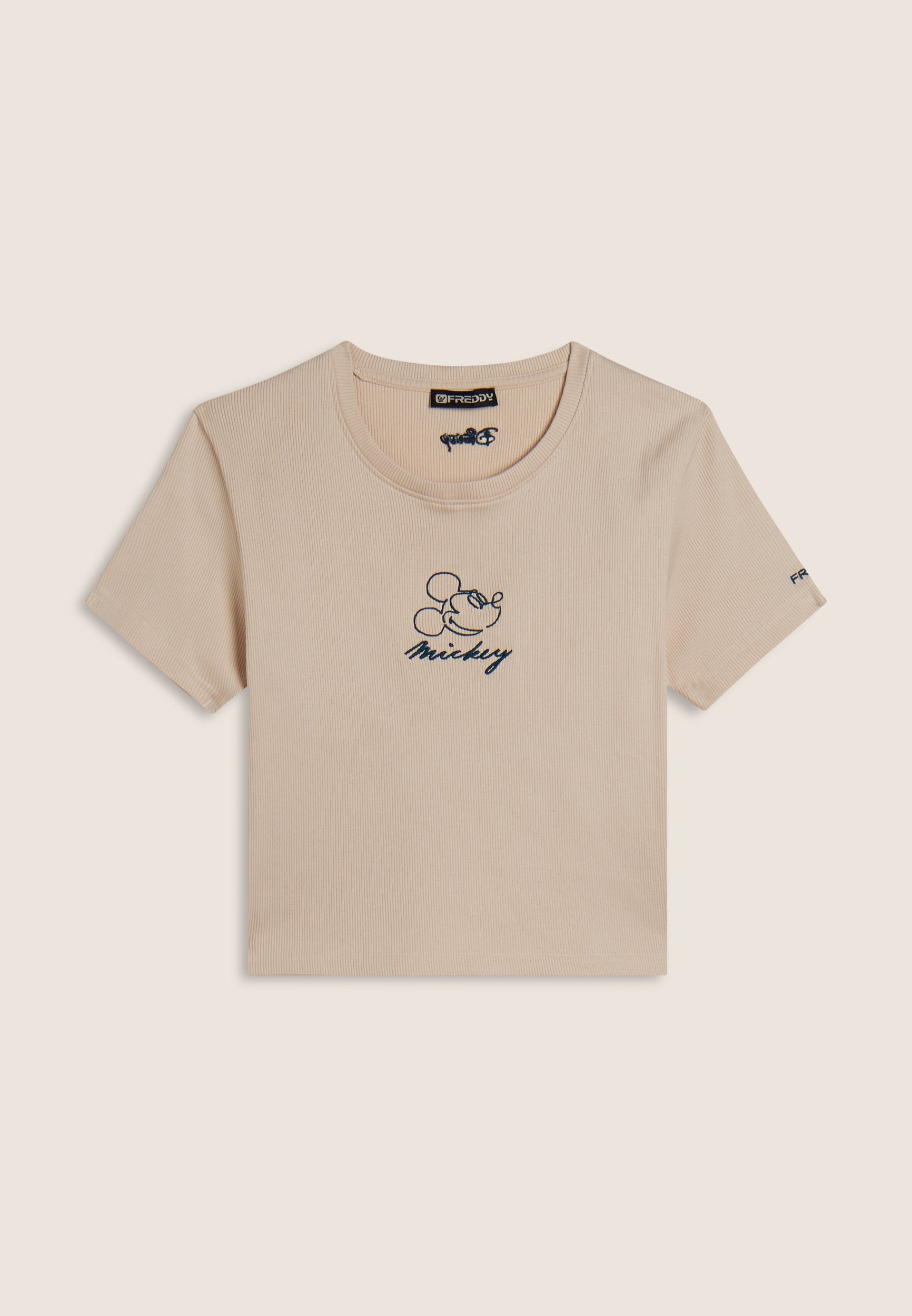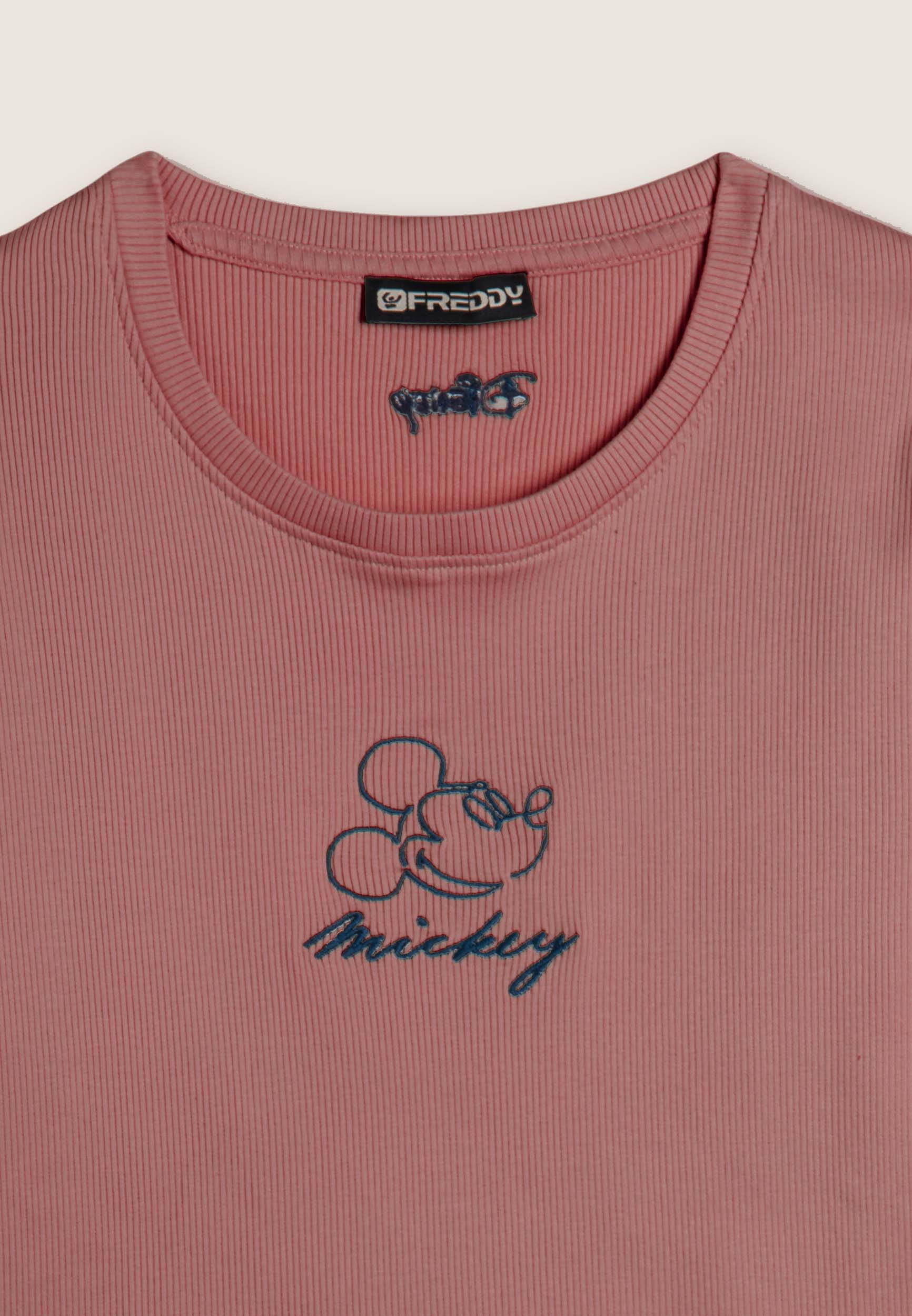 T-shirt cropped a manica corta da donna, in cotone a costine con trattamento acid wash effect, che dona carattere vissuto e sfumature originali. Ha una vestibilità slim, fondo dritto e scollo tondo. Il fronte è decorato con Mickey Mouse ricamato in tono colore, mentre sul fondo e sulla manica compaiono i loghi Disney e FREDDY, anch’essi ricamati.