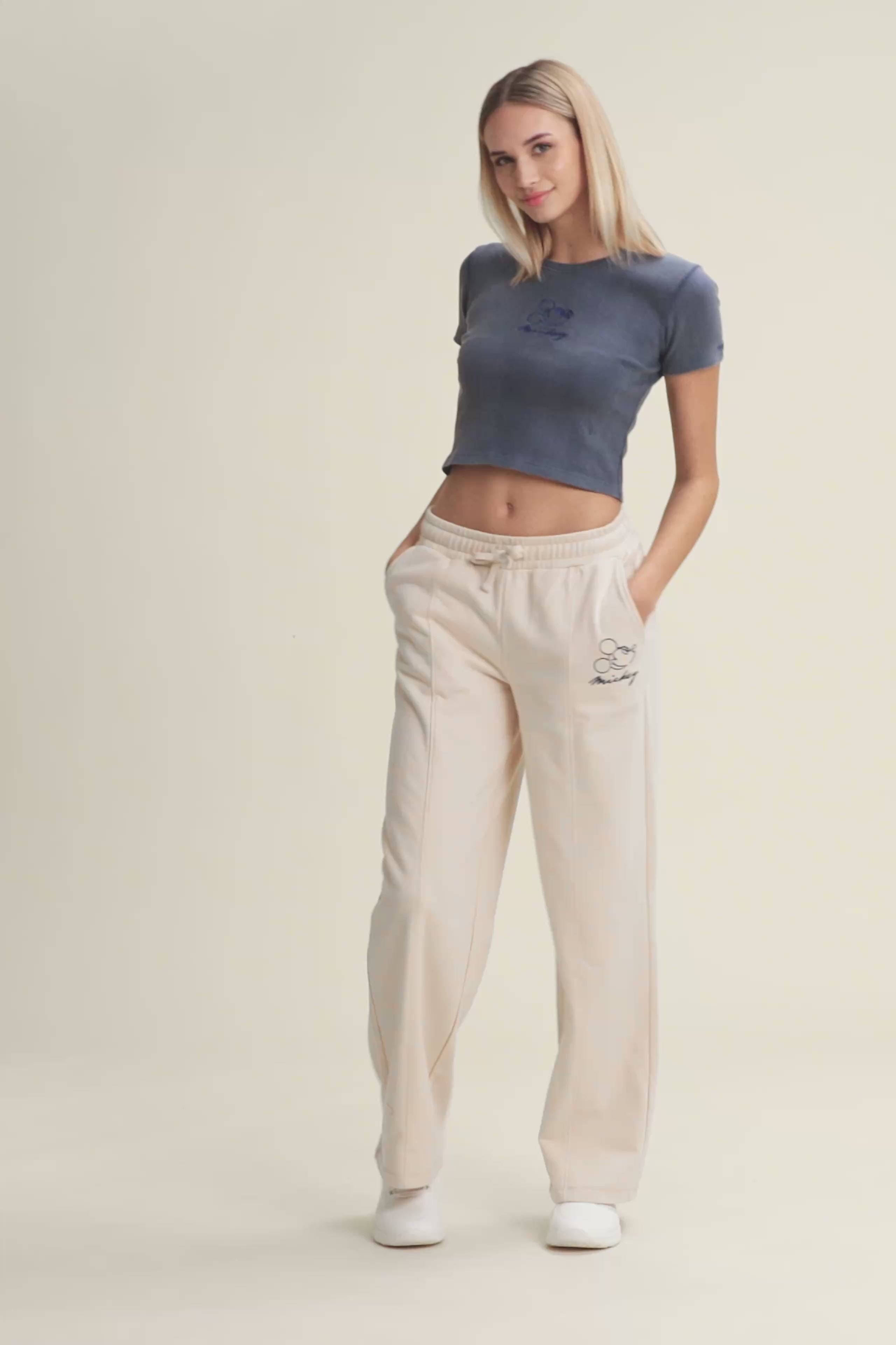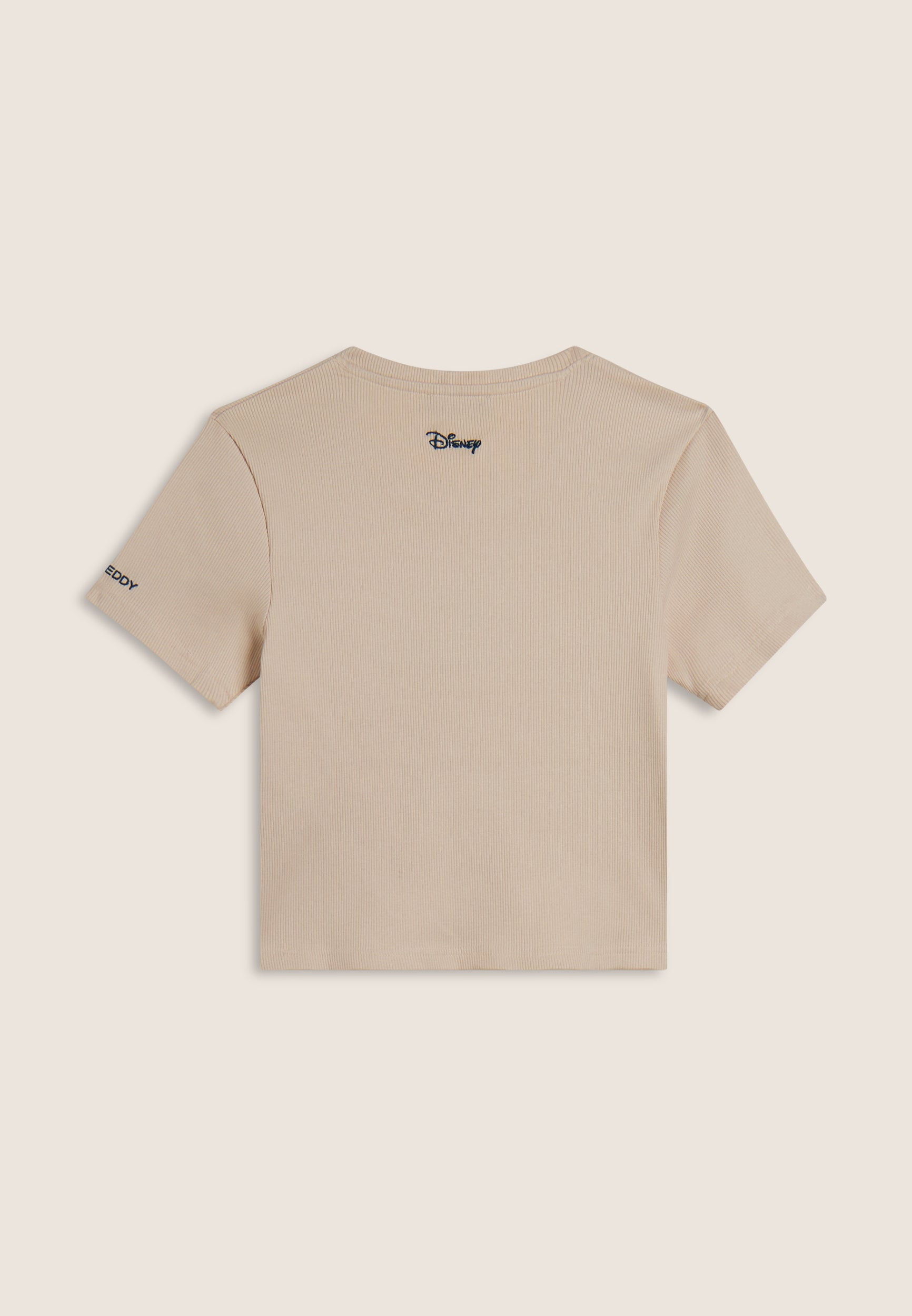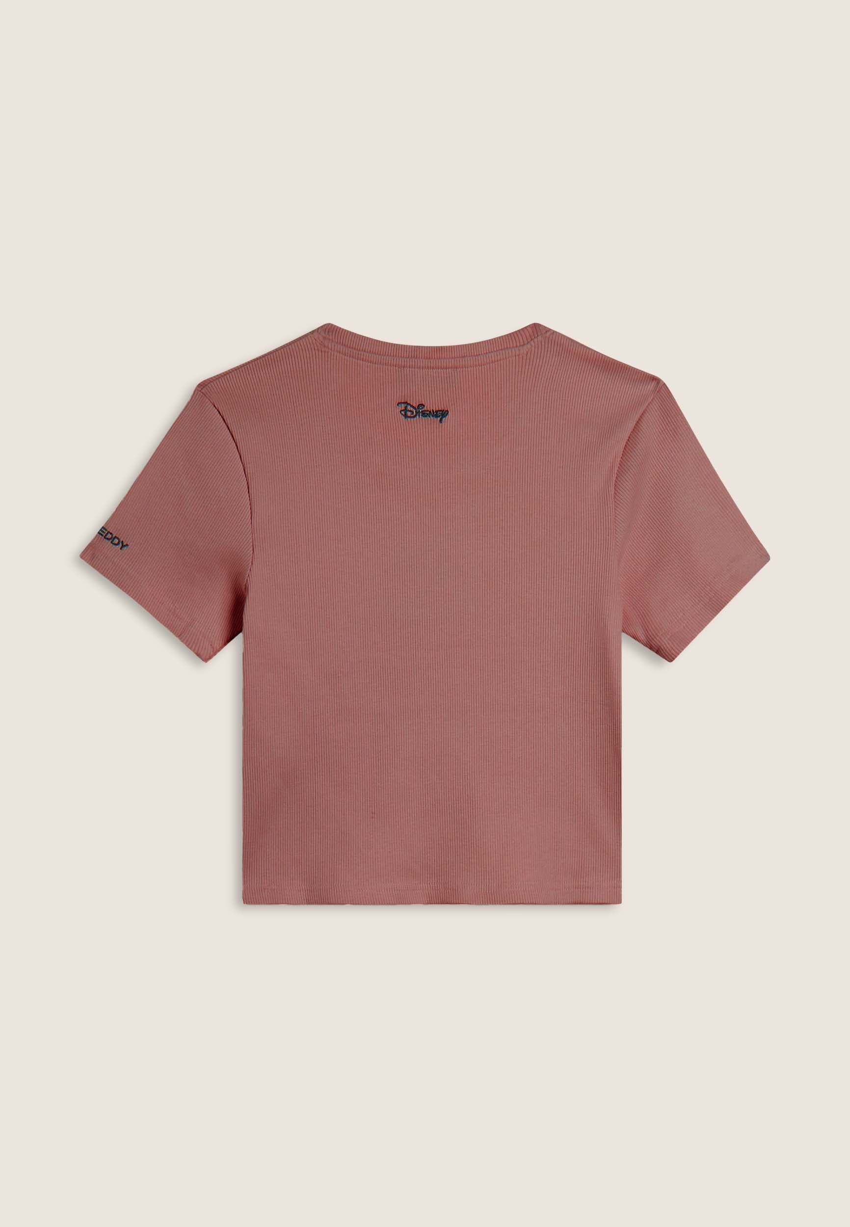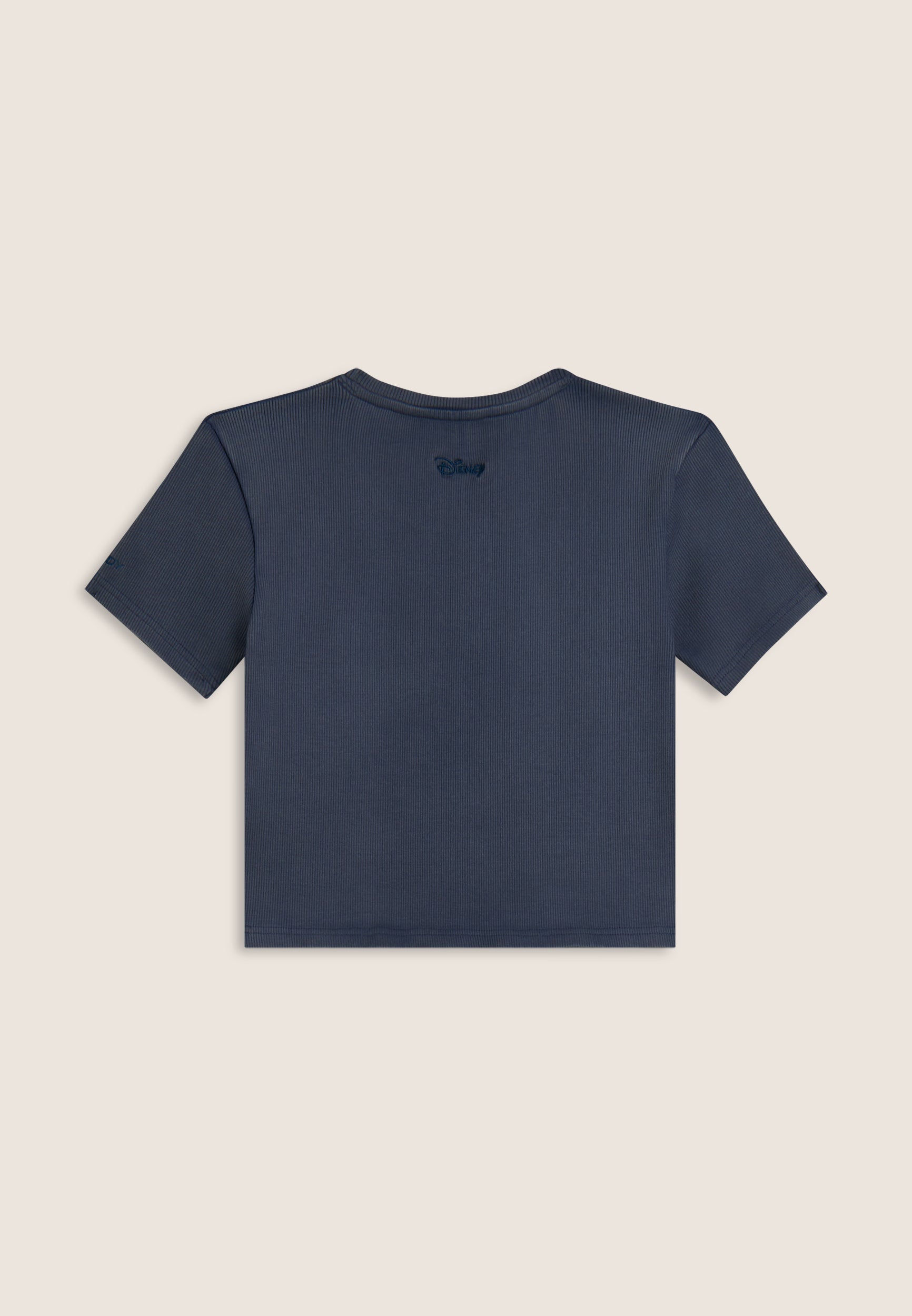 T-shirt cropped a manica corta da donna, in cotone a costine con trattamento acid wash effect, che dona carattere vissuto e sfumature originali. Ha una vestibilità slim, fondo dritto e scollo tondo. Il fronte è decorato con Mickey Mouse ricamato in tono colore, mentre sul fondo e sulla manica compaiono i loghi Disney e FREDDY, anch’essi ricamati.