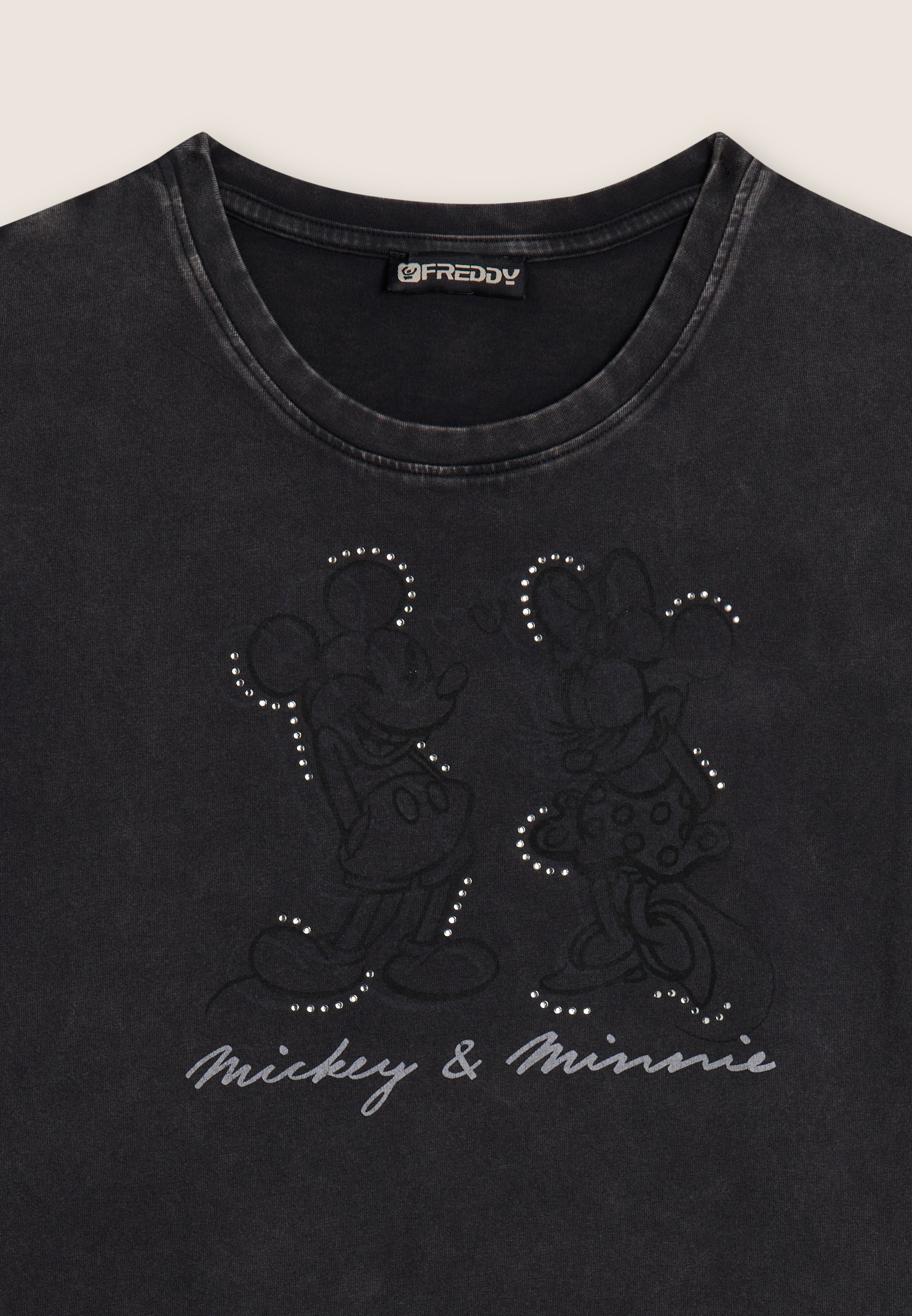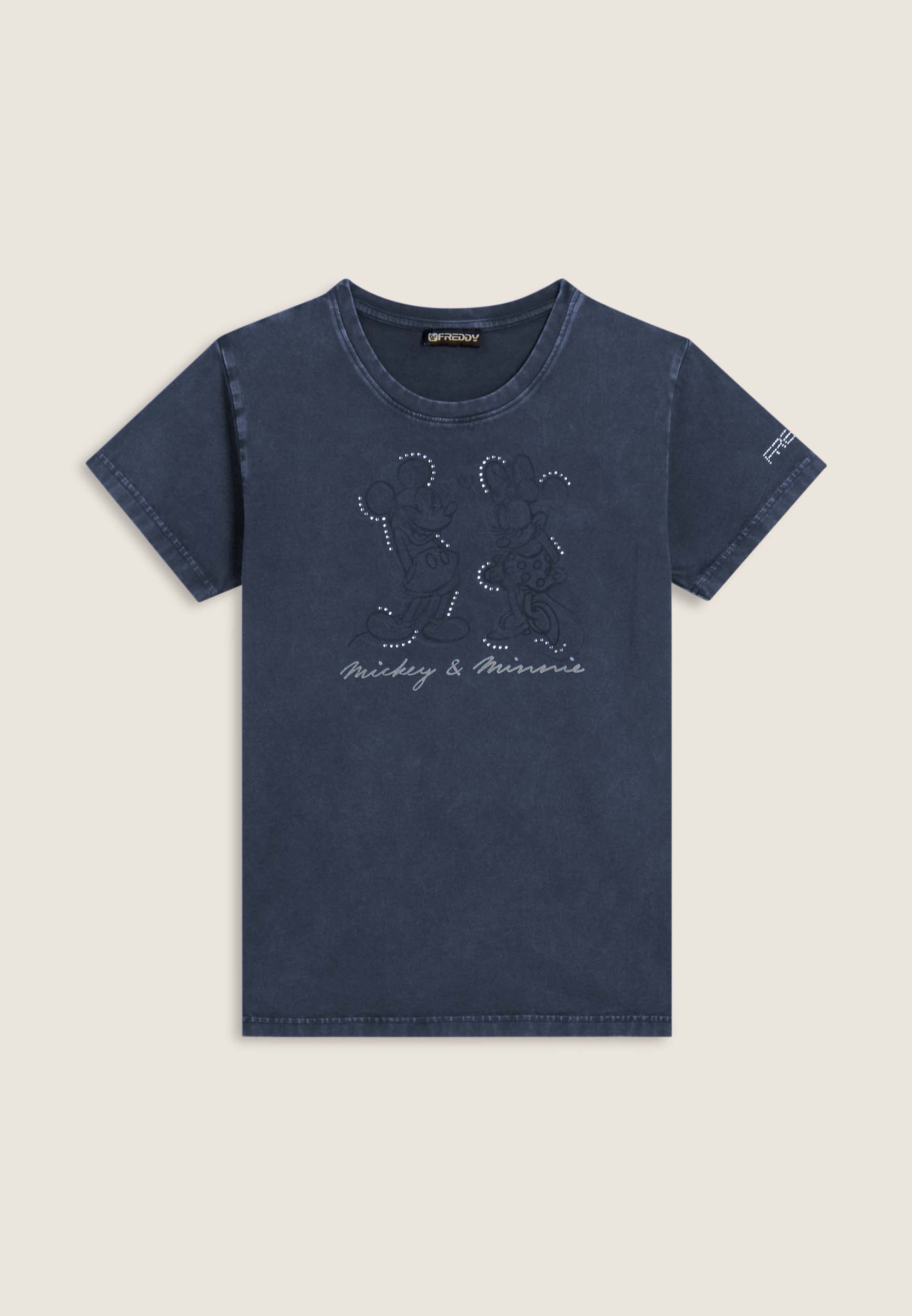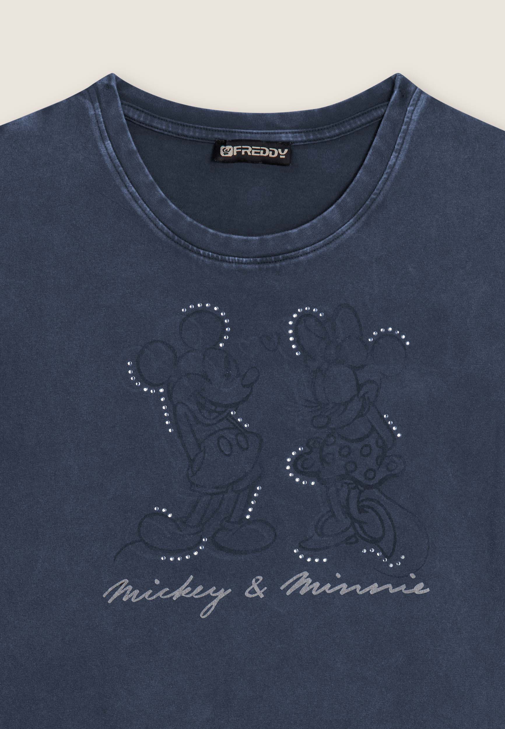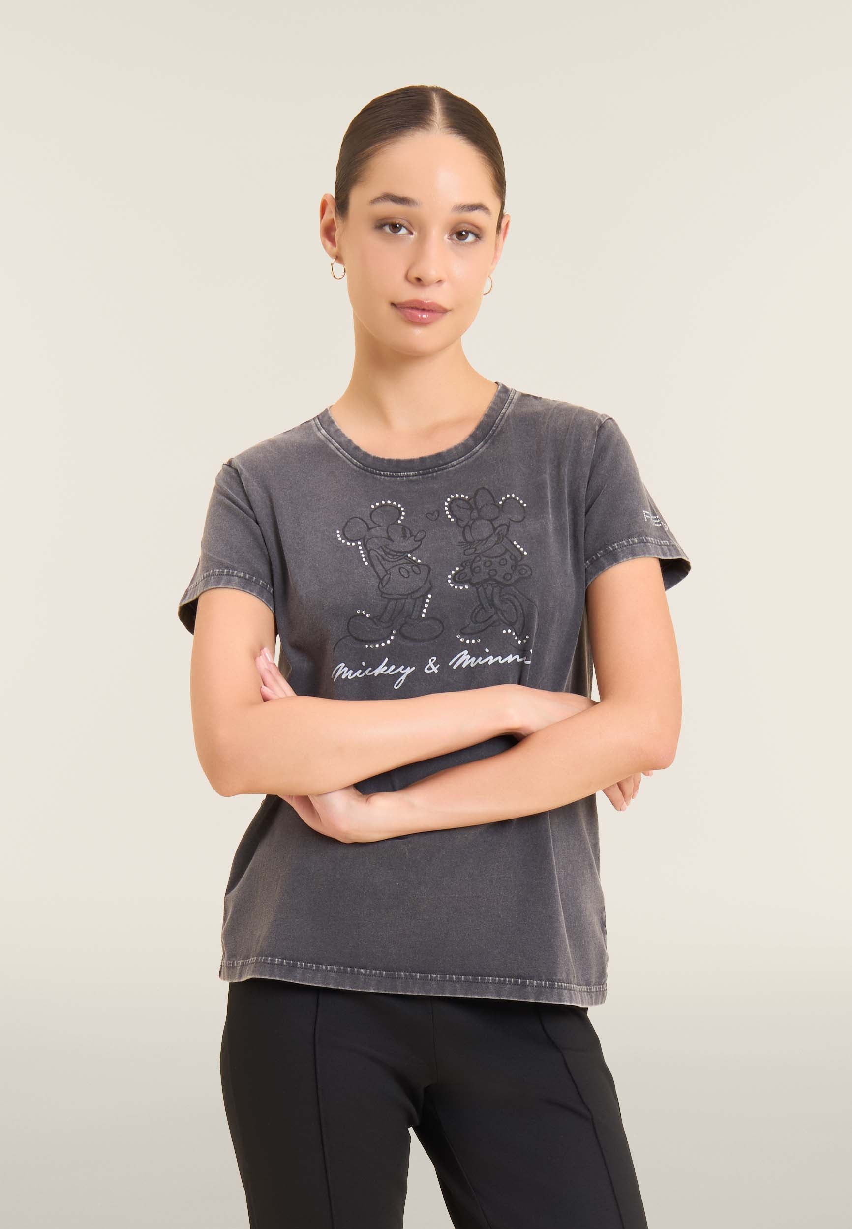 Con vestibilità regular e taglio classico, questa T-shirt da donna è in jersey di cotone elasticizzato con trattamento acid wash effect per un look leggermente scolorito e urban. Lo scollo è tondo, le maniche corte. Sul fronte spicca una grande grafica di Minnie e Mickey Mouse decorata da strass, mentre il retro ospita un logo Disney discreto. Logo FREDDY sul fondo manica.