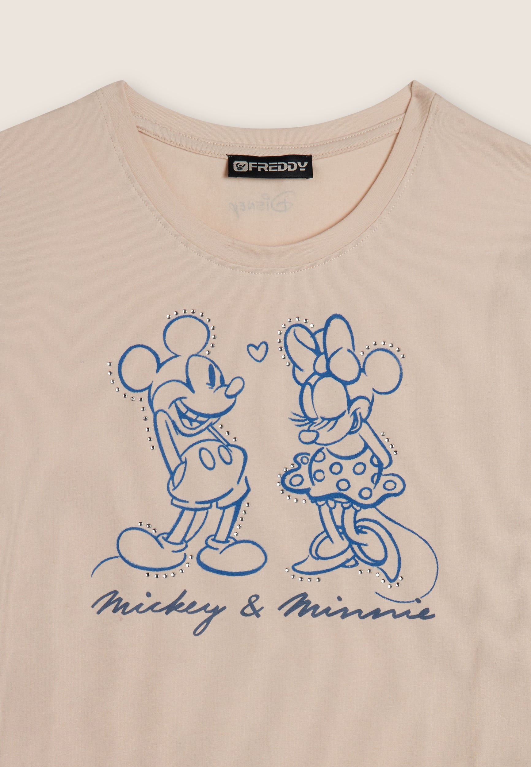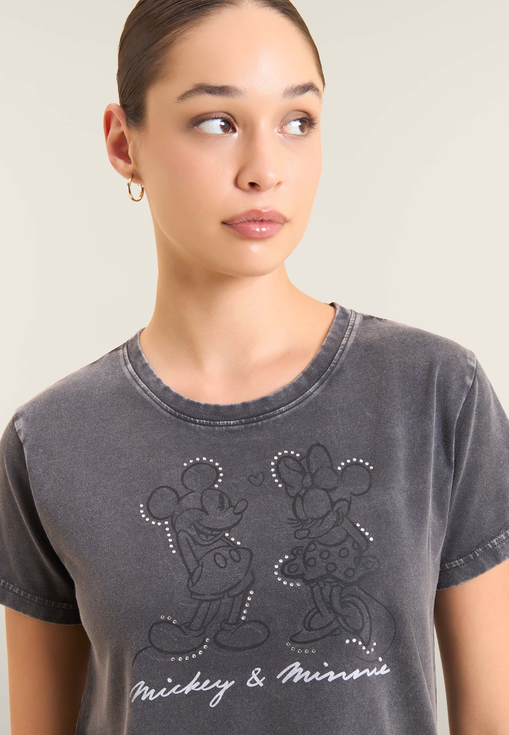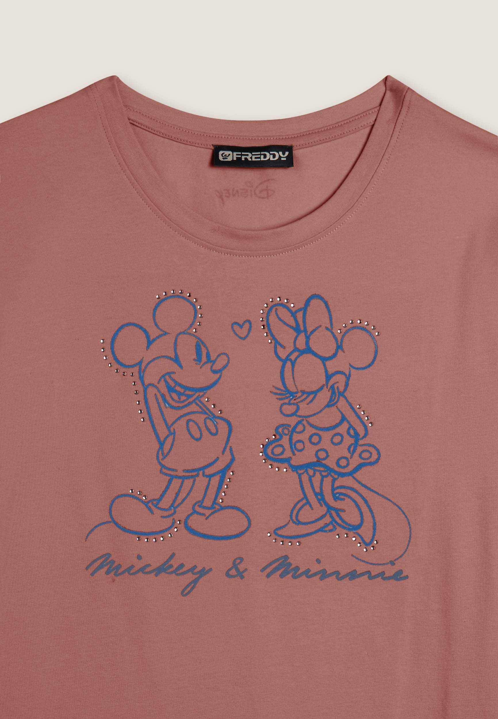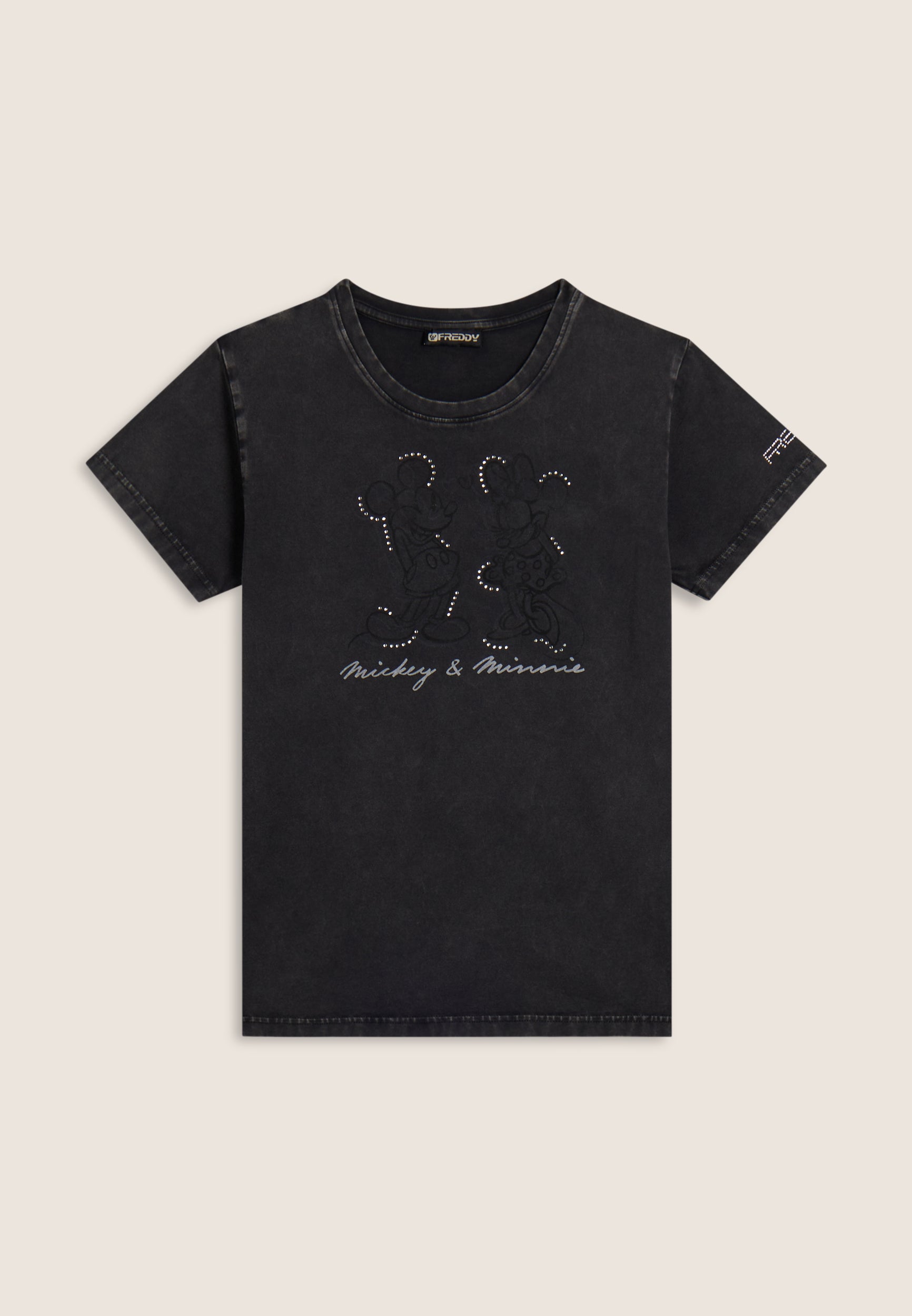 Con vestibilità regular e taglio classico, questa T-shirt da donna è in jersey di cotone elasticizzato con trattamento acid wash effect per un look leggermente scolorito e urban. Lo scollo è tondo, le maniche corte. Sul fronte spicca una grande grafica di Minnie e Mickey Mouse decorata da strass, mentre il retro ospita un logo Disney discreto. Logo FREDDY sul fondo manica.