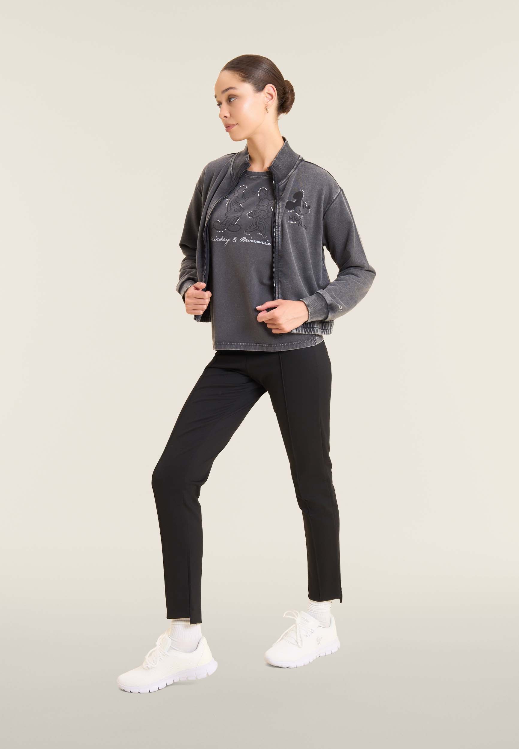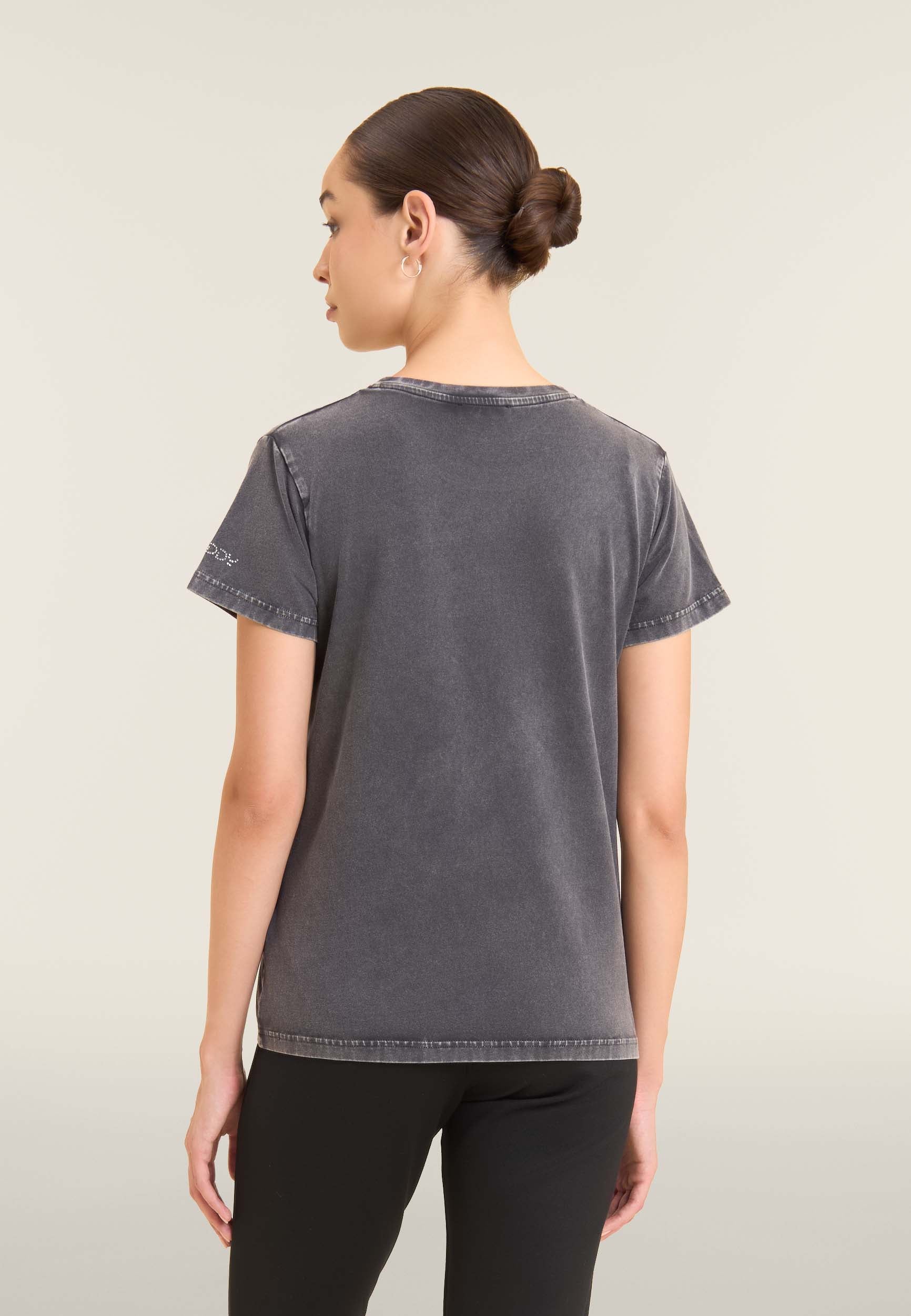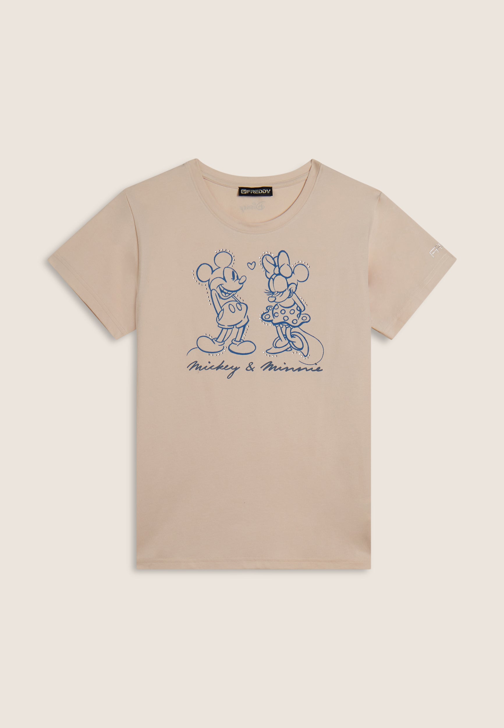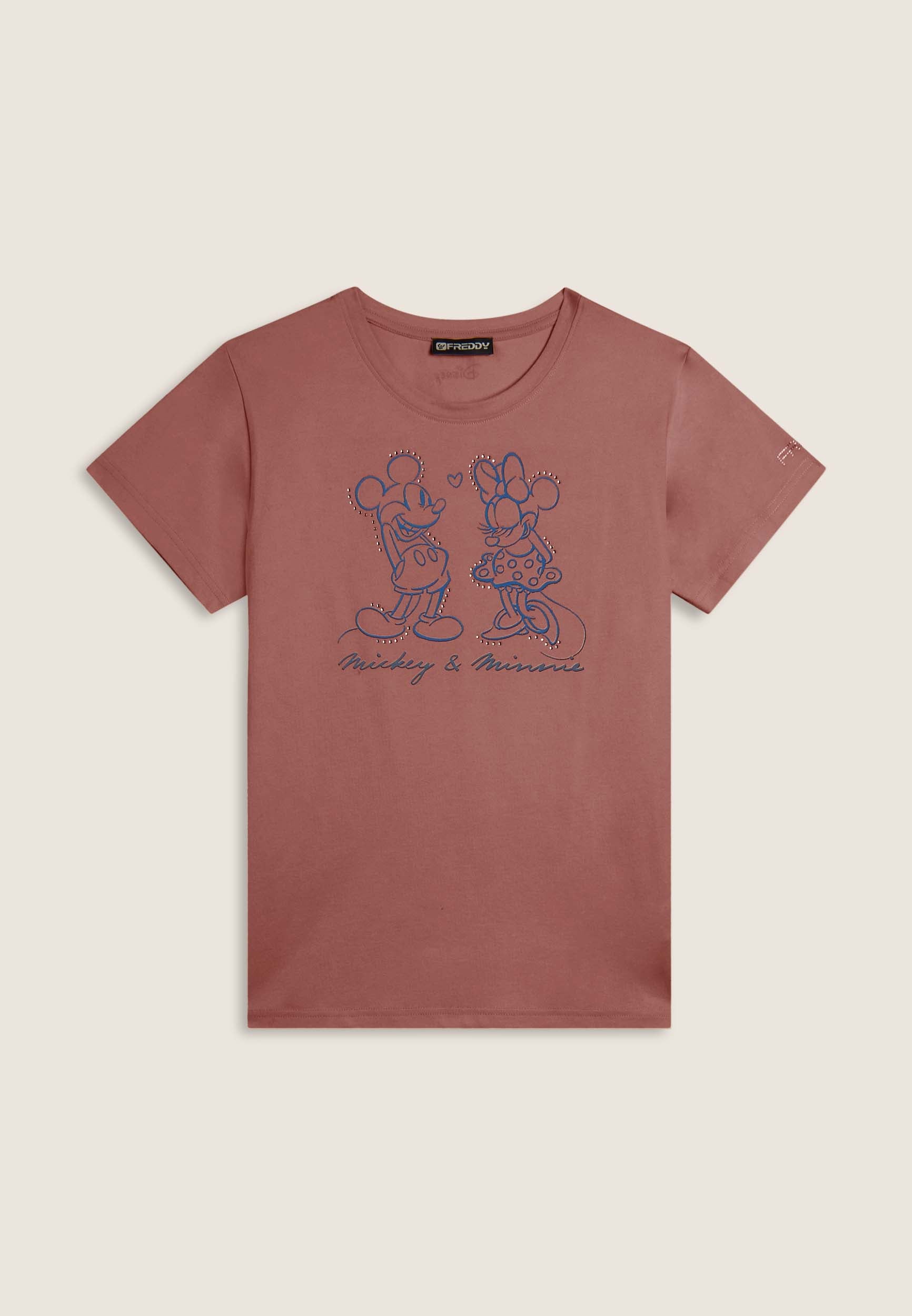 Con vestibilità regular e taglio classico, questa T-shirt da donna è in jersey di cotone elasticizzato con trattamento acid wash effect per un look leggermente scolorito e urban. Lo scollo è tondo, le maniche corte. Sul fronte spicca una grande grafica di Minnie e Mickey Mouse decorata da strass, mentre il retro ospita un logo Disney discreto. Logo FREDDY sul fondo manica.