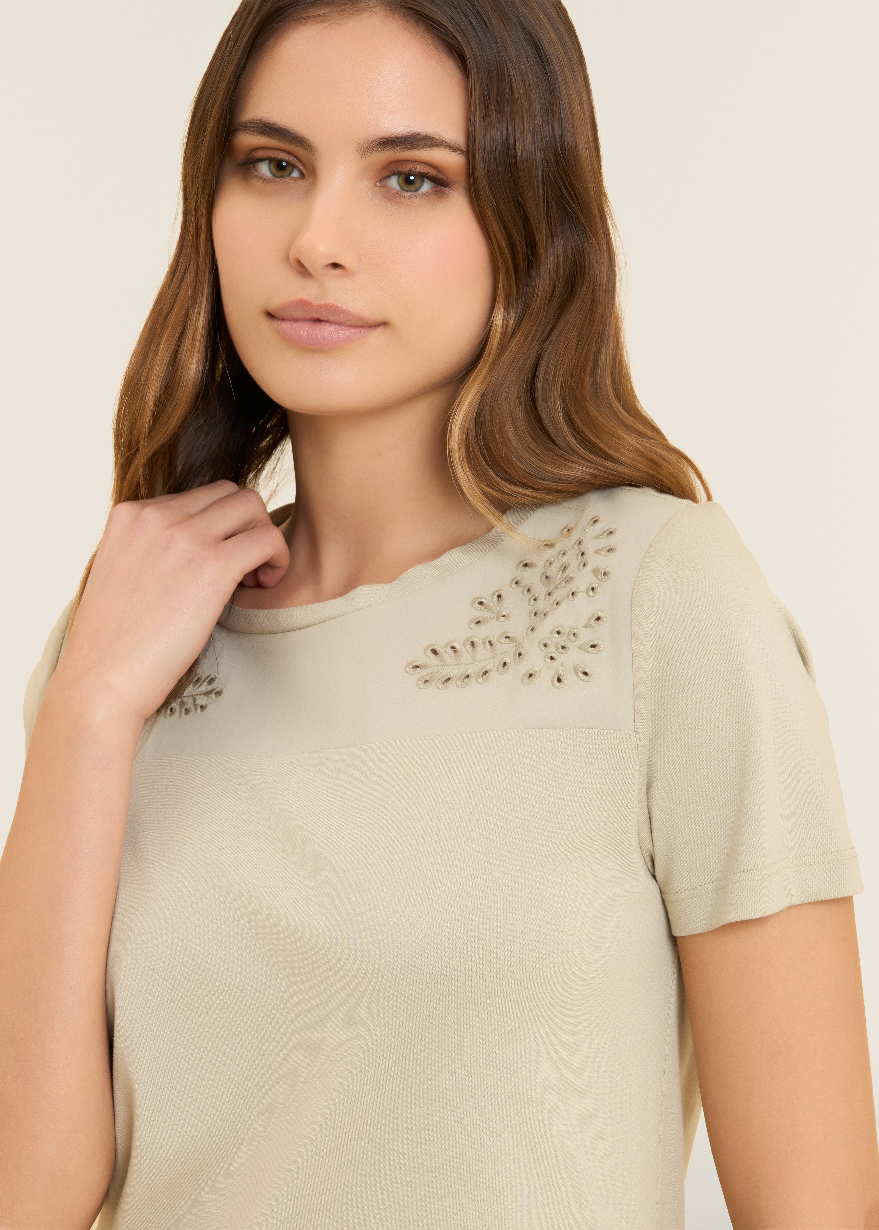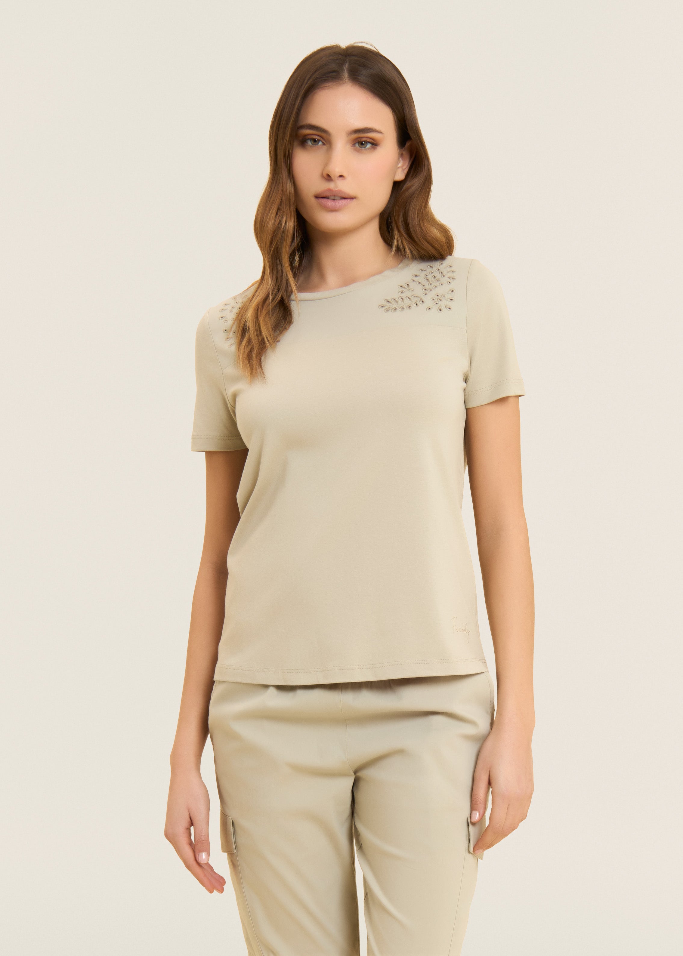 T-shirt dalla vestibilità regular, con fondo stondato più lungo sul retro e scollo girocollo. Le maniche corte sono arricchite da un inserto sulle spalle in tessuto Popeline elasticizzato decorato da ricami floreali stile sangallo, che aggiungono un tocco delicato e sofisticato. Il piccolo logo Freddy, composto da borchie, è posizionato sul fondo sinistro. Realizzata in jersey di cotone e modal, questa t-shirt è ideale per chi cerca morbidezza, traspirabilità e comfort.