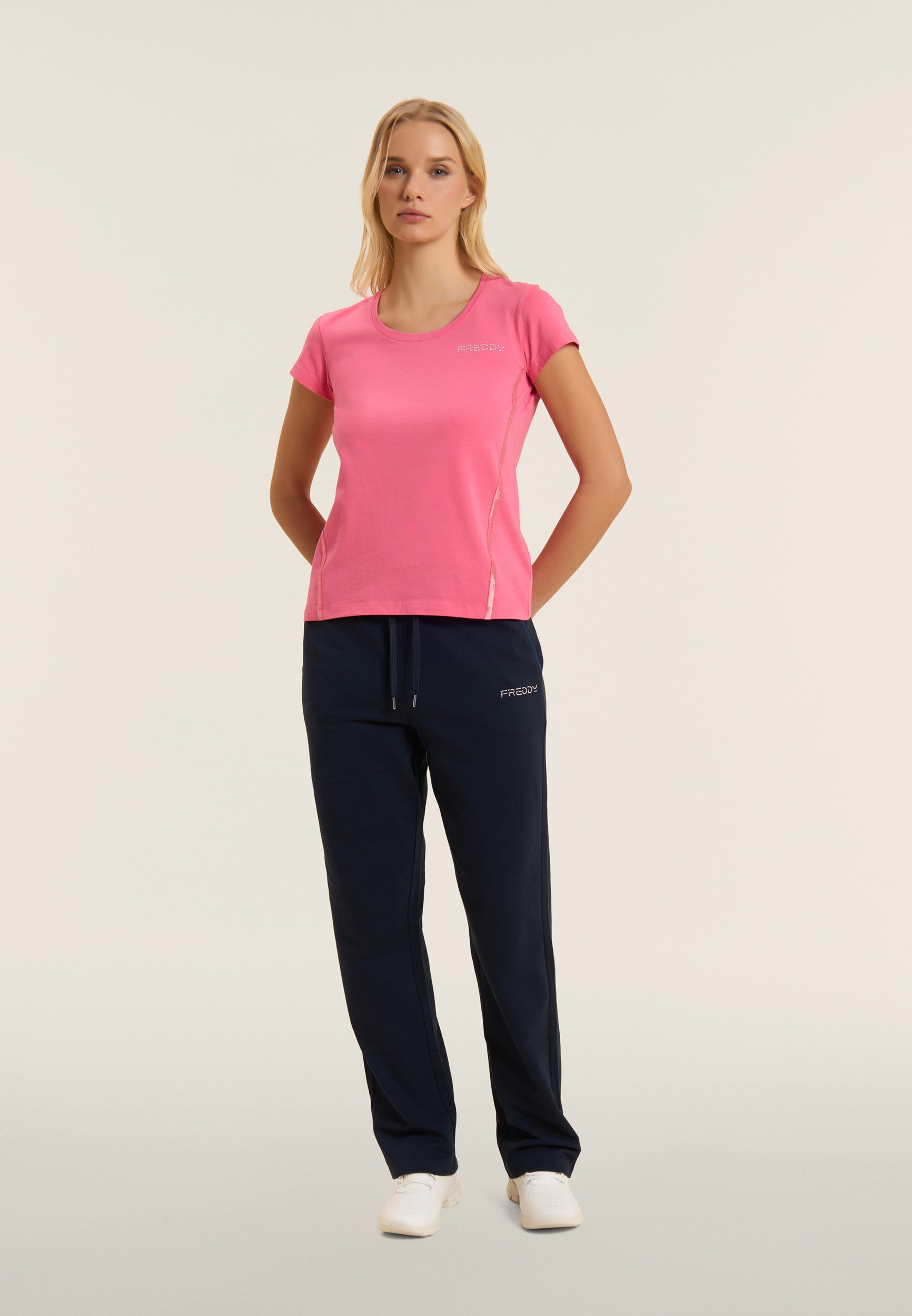 T-shirt manica corta con scollo girocollo e maniche molto corte, dal design essenziale ma raffinato. Il logo FREDDY in perline rosa chiaro sul cuore e gli inserti elastici laterali dal finish lucido decorano con eleganza. La vestibilità regular e il fondo dritto la rendono comoda e versatile, adatta per le attività quotidiane. Realizzata in jersey leggero stretch di cotone, offre un comfort duraturo.
